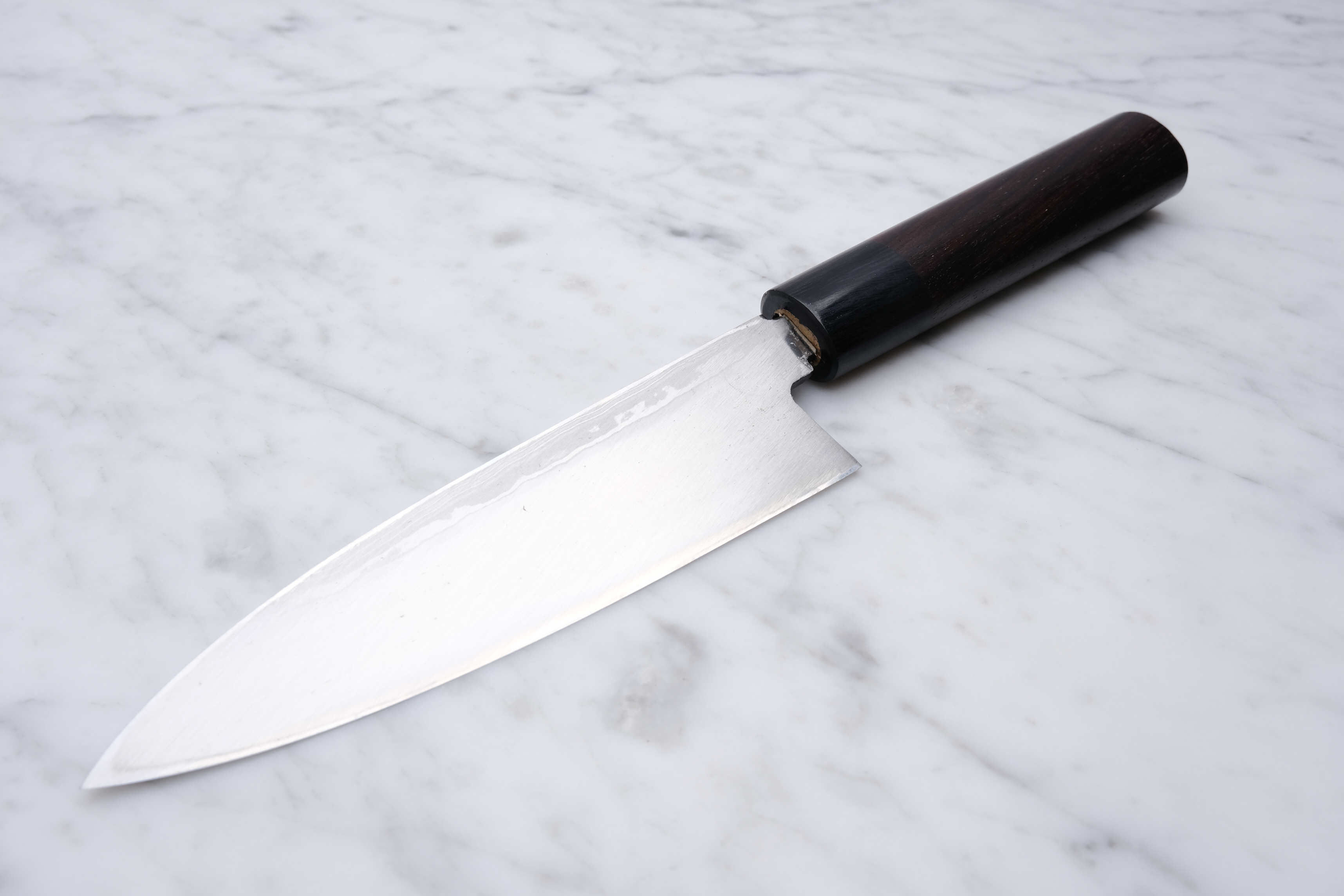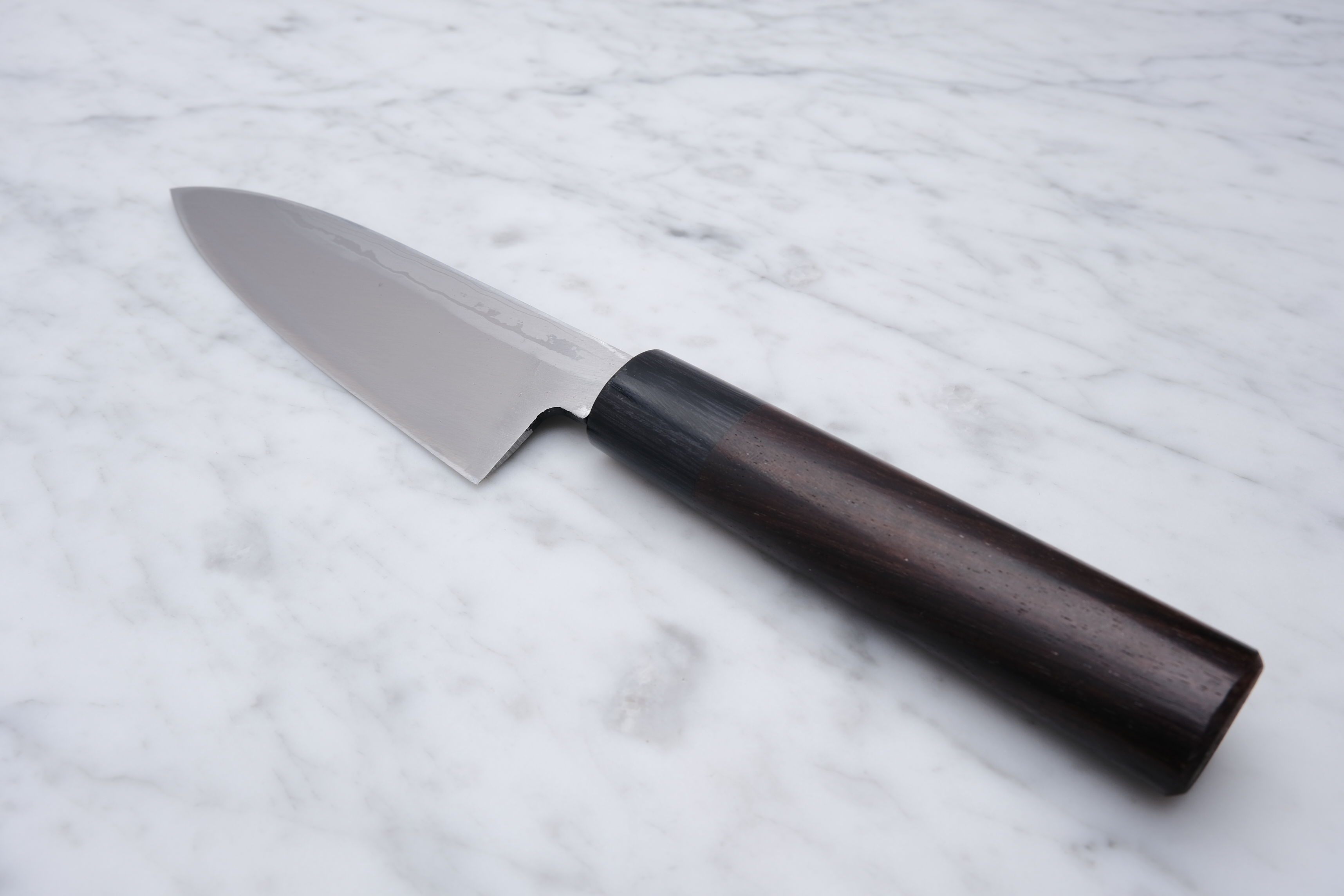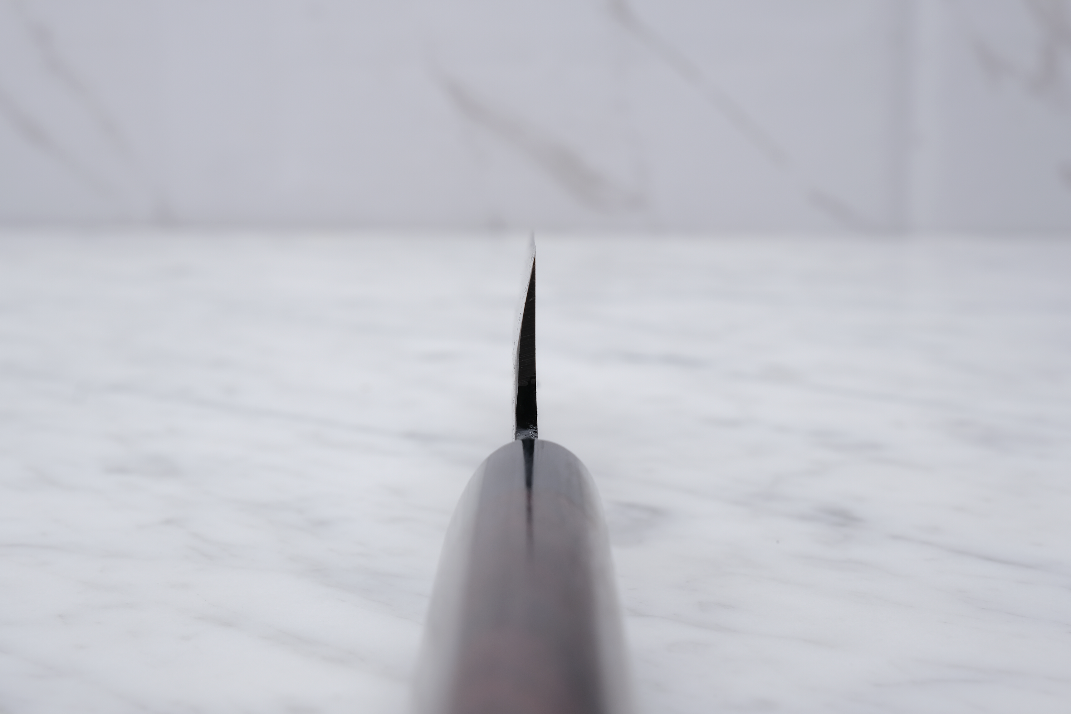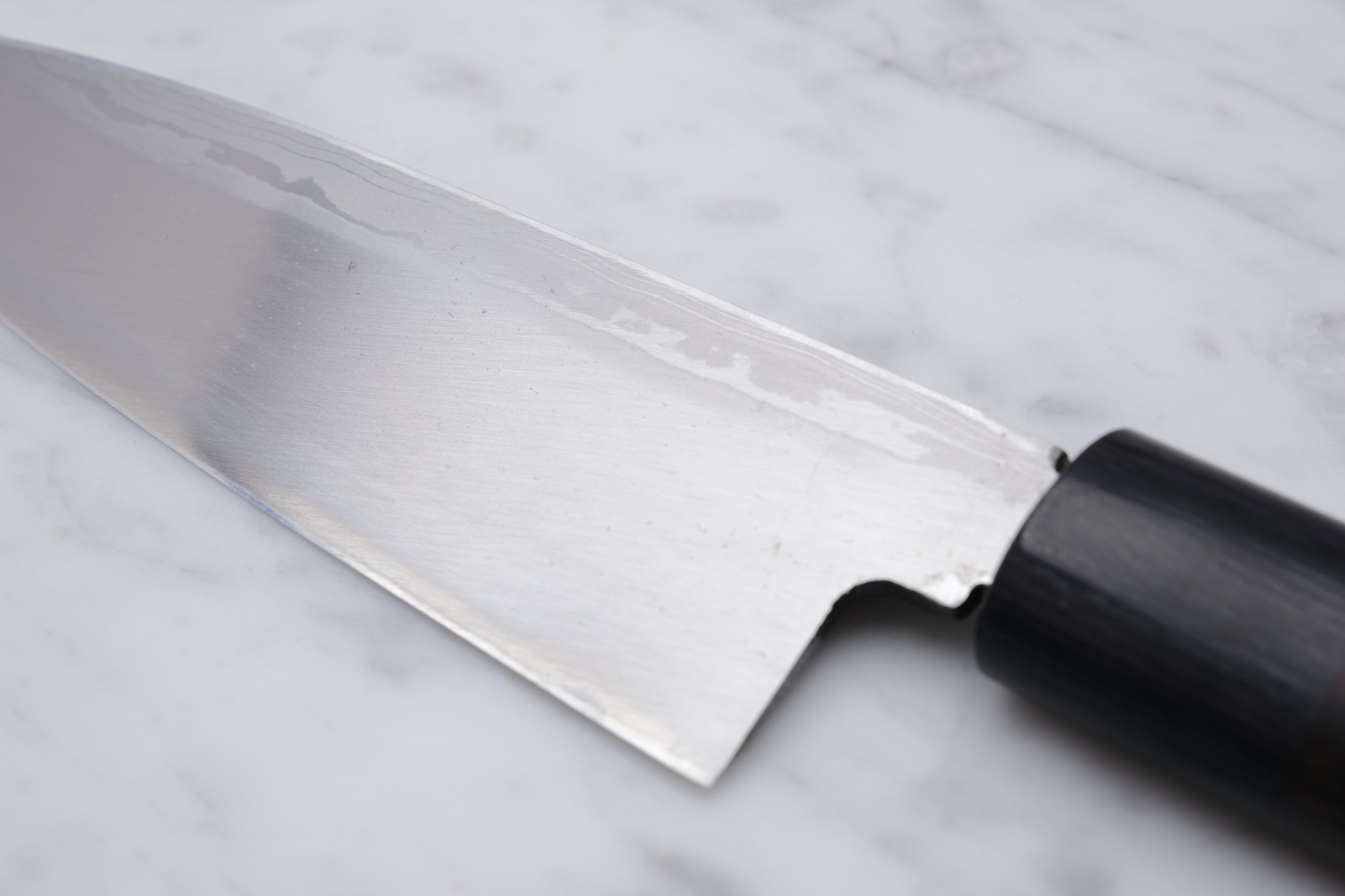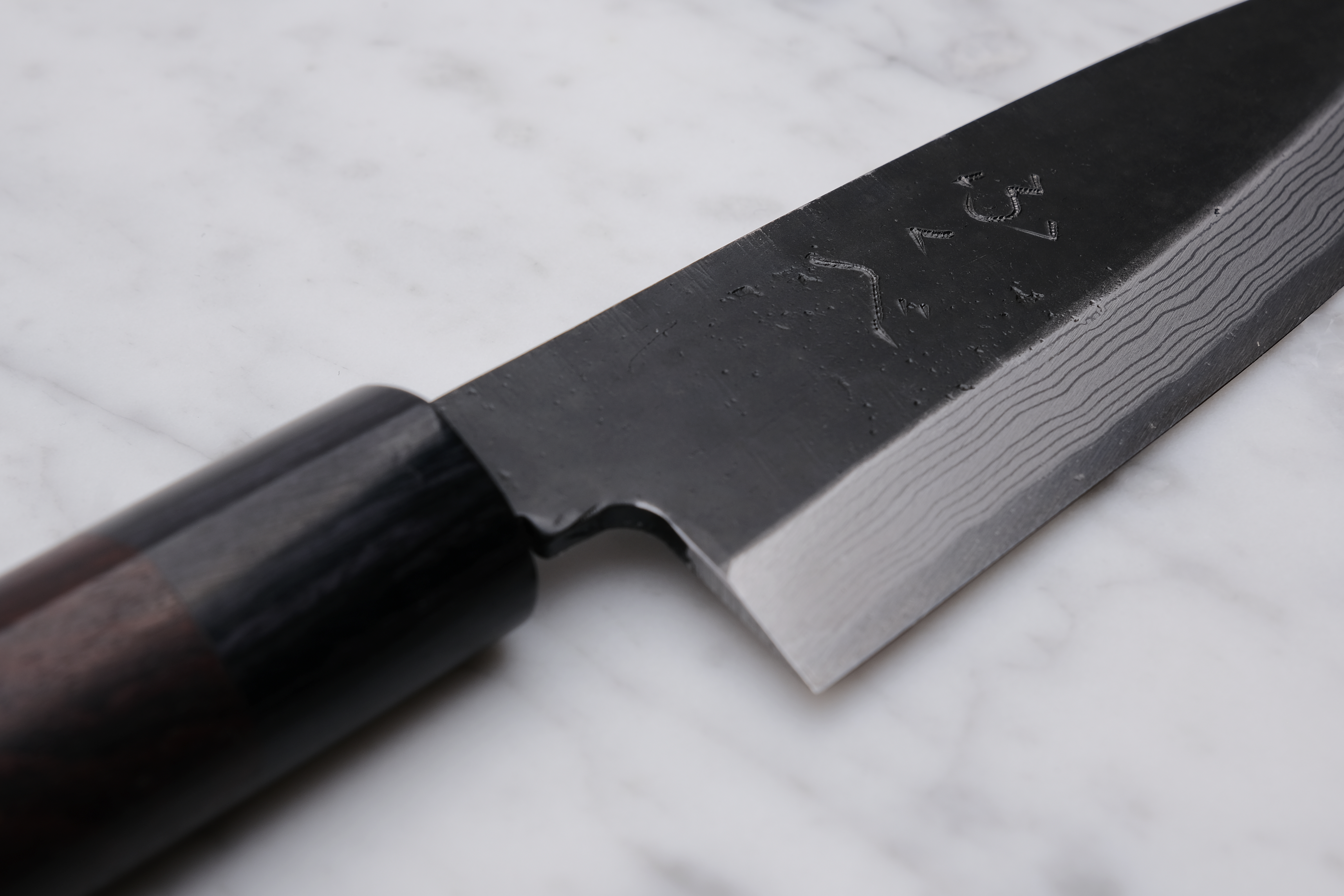Die Messer sind mit einem rustikalen Kurouchi-Finish und einer Damastverkleidung weiter zur Schneide hin versehen. Der Griff ist ein D-förmiger (Shinogi) Griff für die rechte Hand aus Sandelholz mit einer Zwinge aus dunklem Pakkaholz.