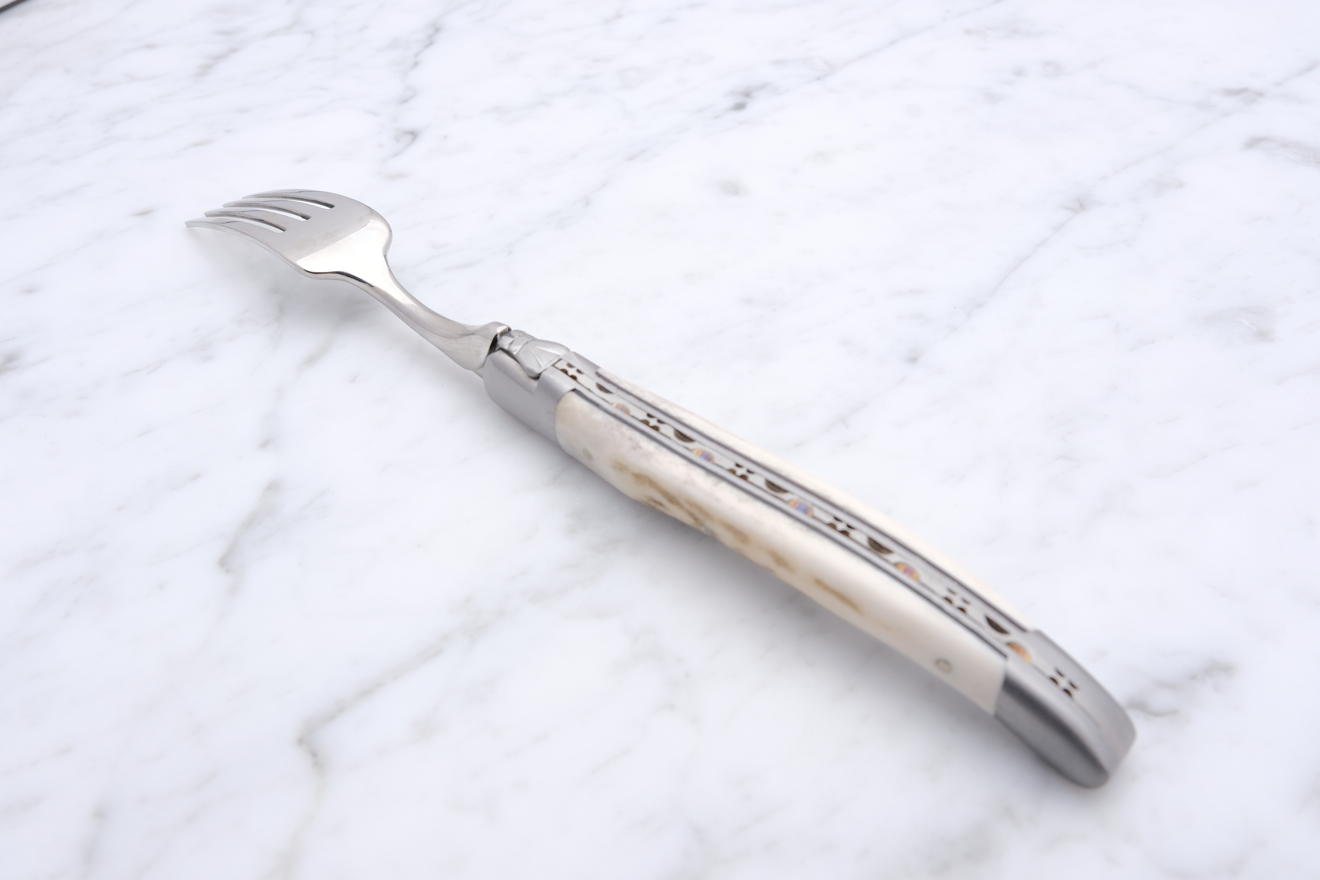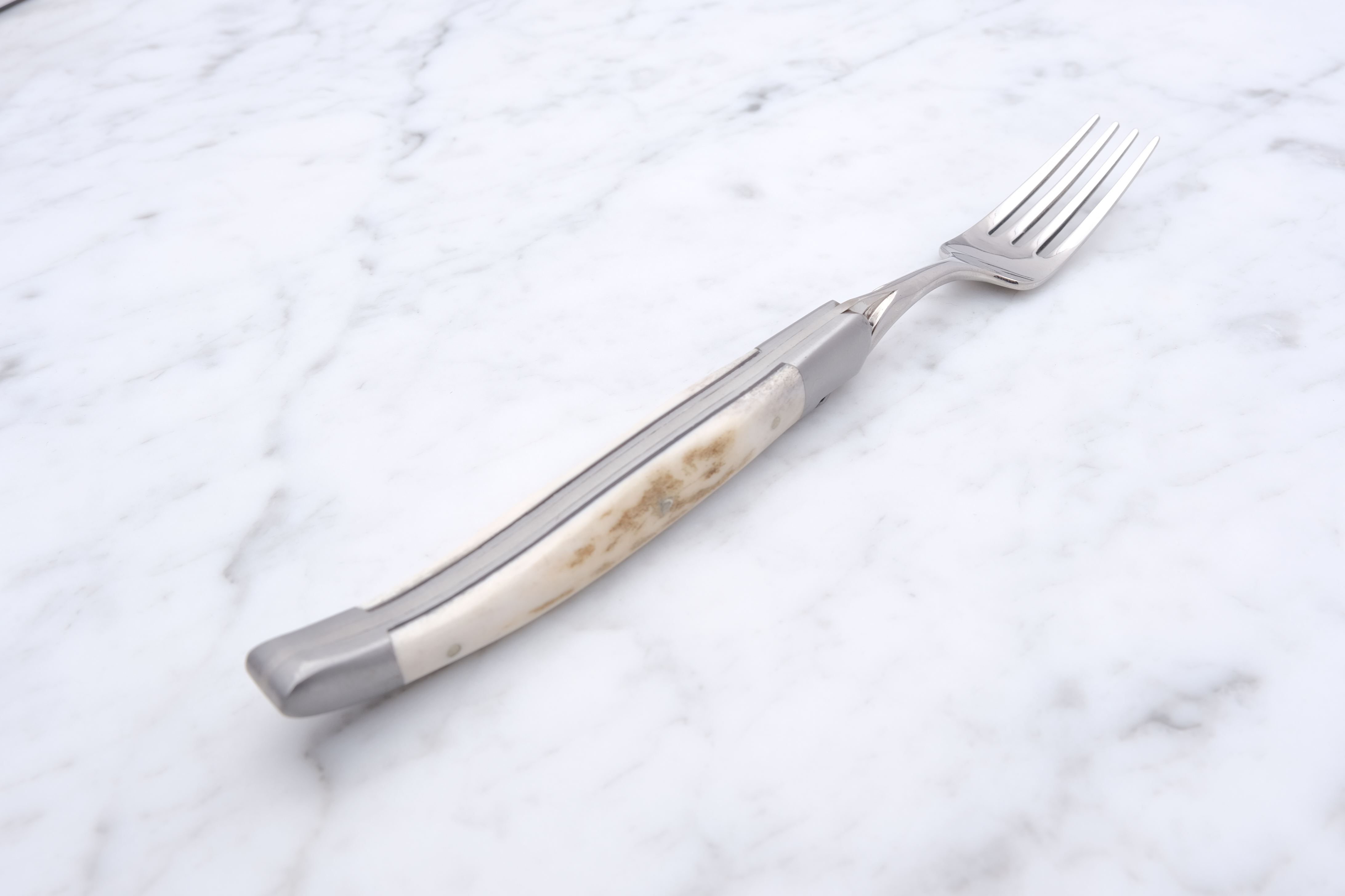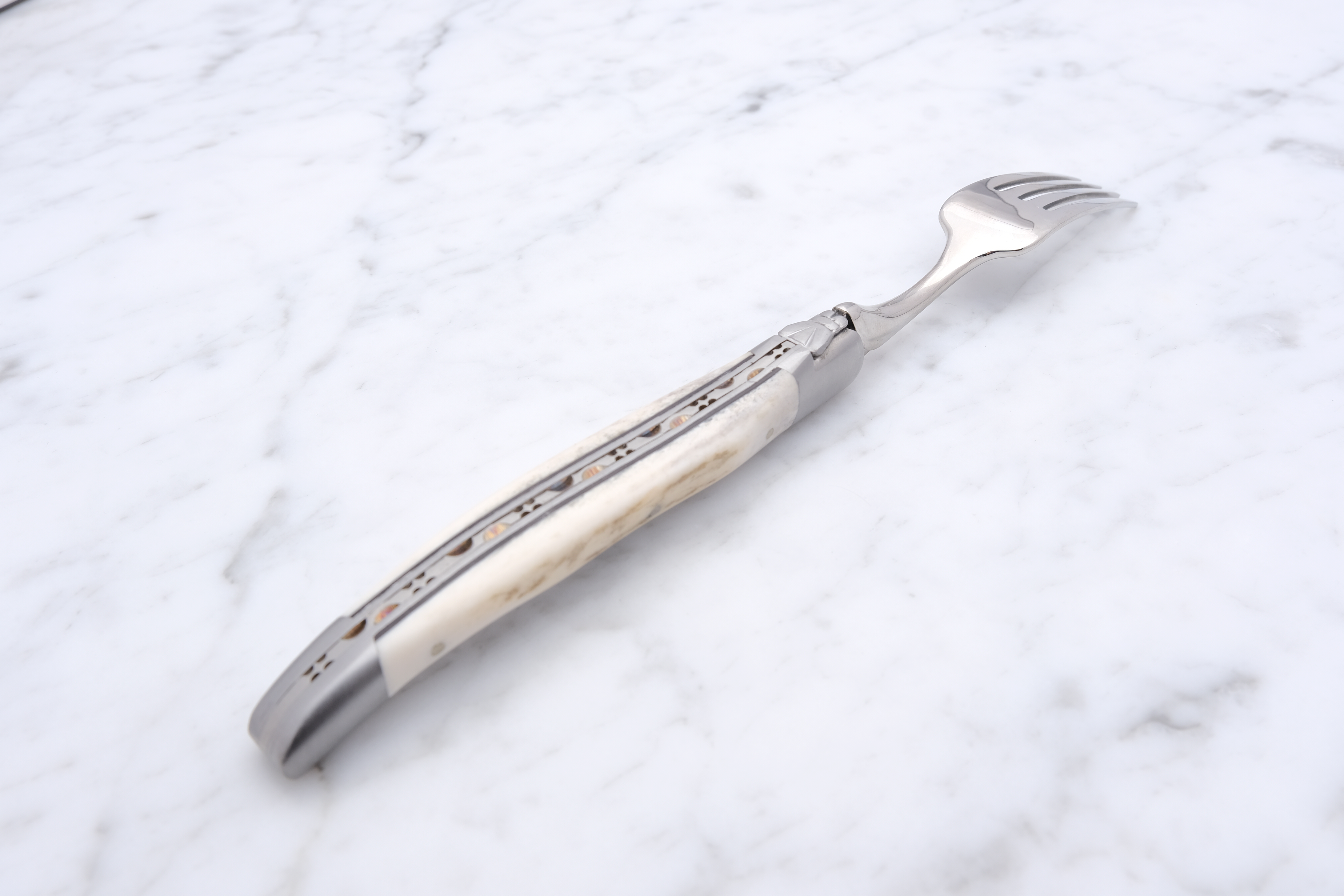 Die Qualität, aus dem Hause Aubrac, ist sehr hoch und alle Produkte werden in Handarbeit hergestellt. Sämtliches Holz und Knochen wird von den hauseigenen Mitarbeitern importiert, behandelt und in die einzigartigen Griffe geschnitten, die Sie an den Gabeln finden.