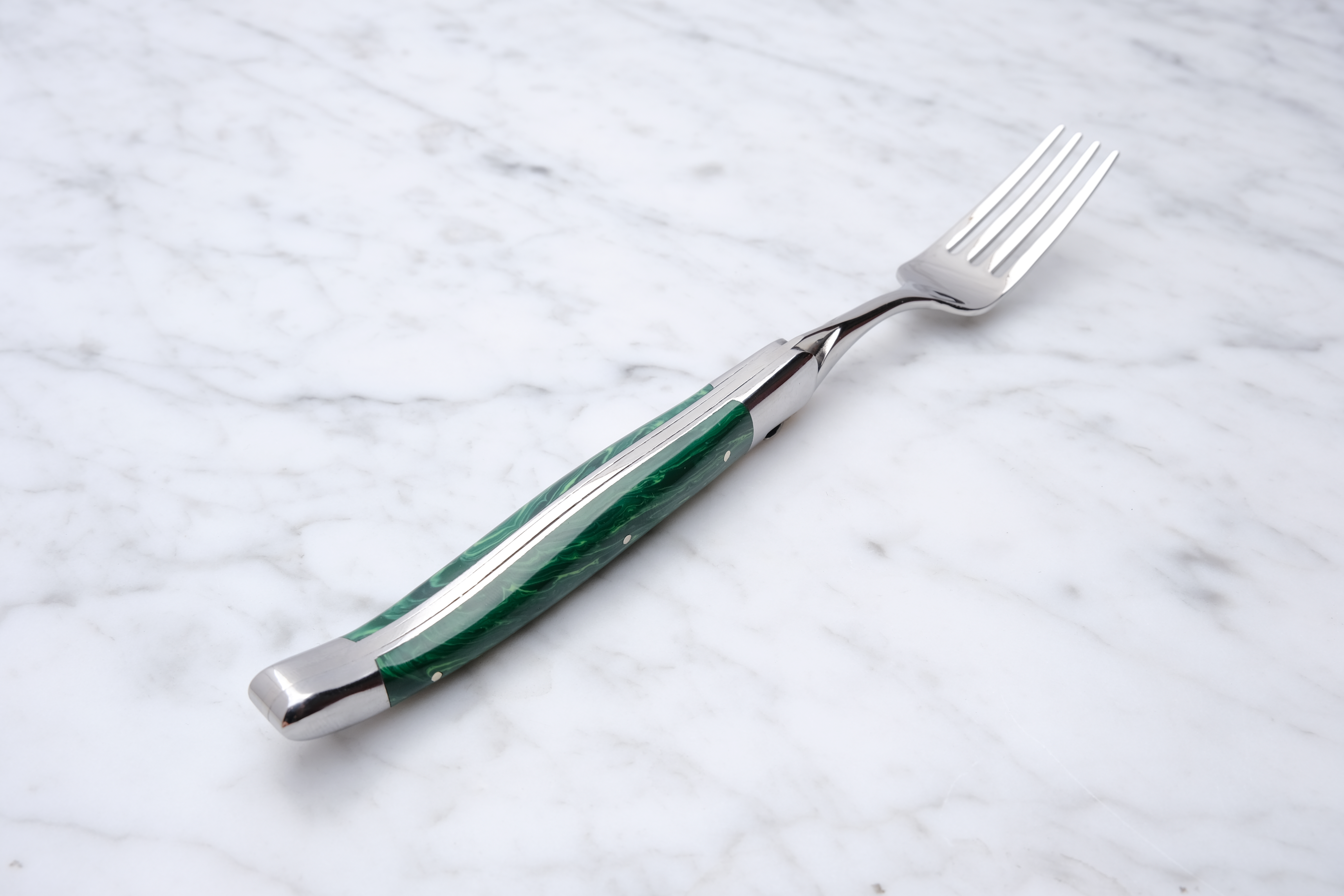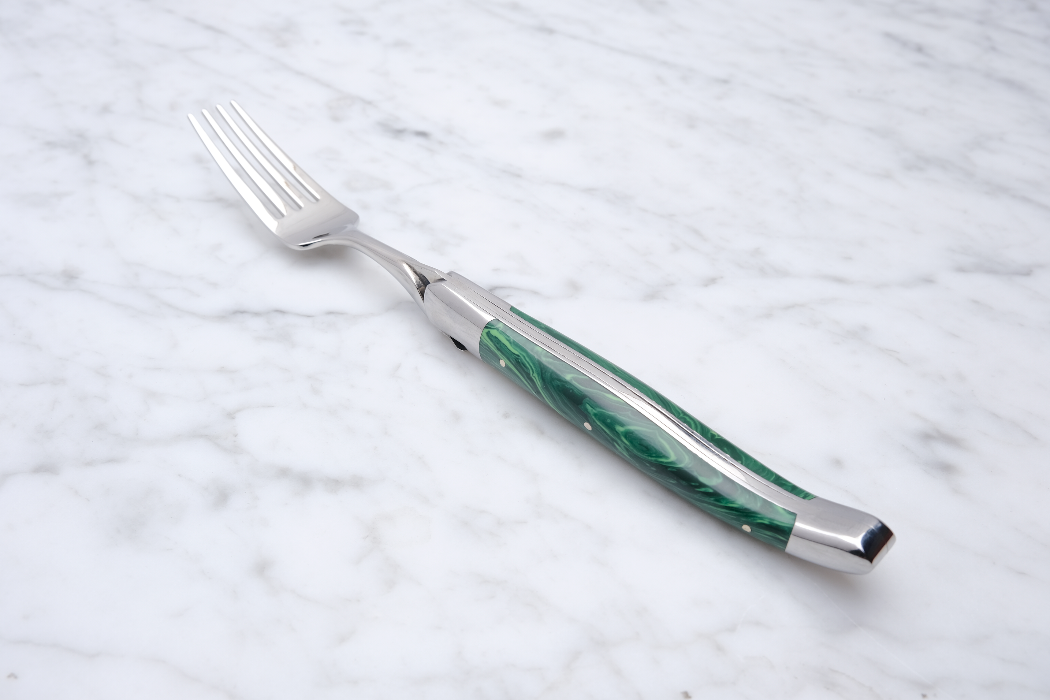 Die Gabel ist mit einem Griff aus Malachit ausgestattet, einem wunderschönen Naturmaterial, das jeder Gabel einen einzigartigen Charakter verleiht. Bei Laguiole En Aubrac ist es nicht nur das Produkt, sondern auch die Geschichte dahinter, die den Unterschied macht. Jede Gabel ist das Ergebnis erfahrener Handwerker, die Traditionen und Qualität schätzen.