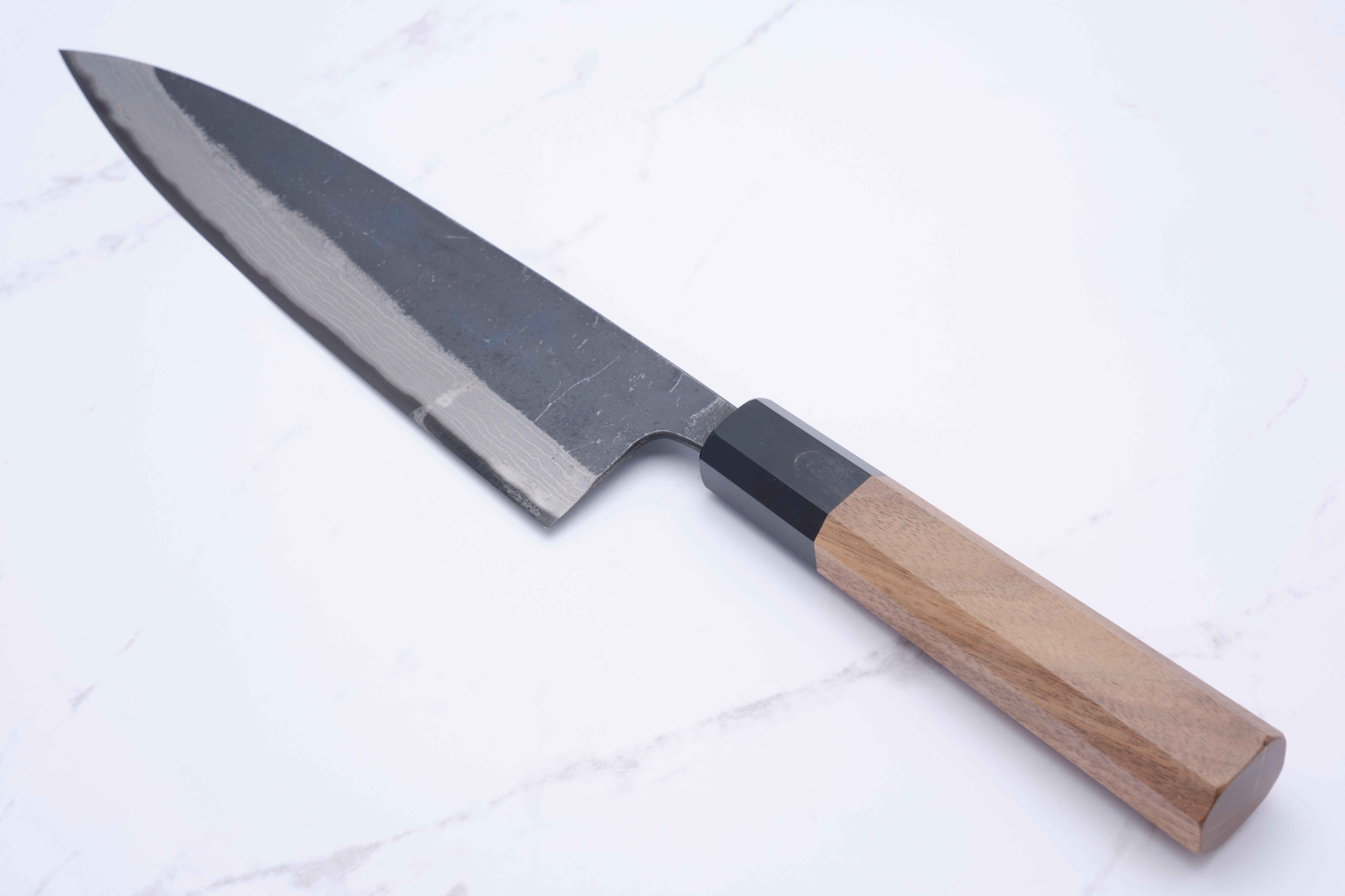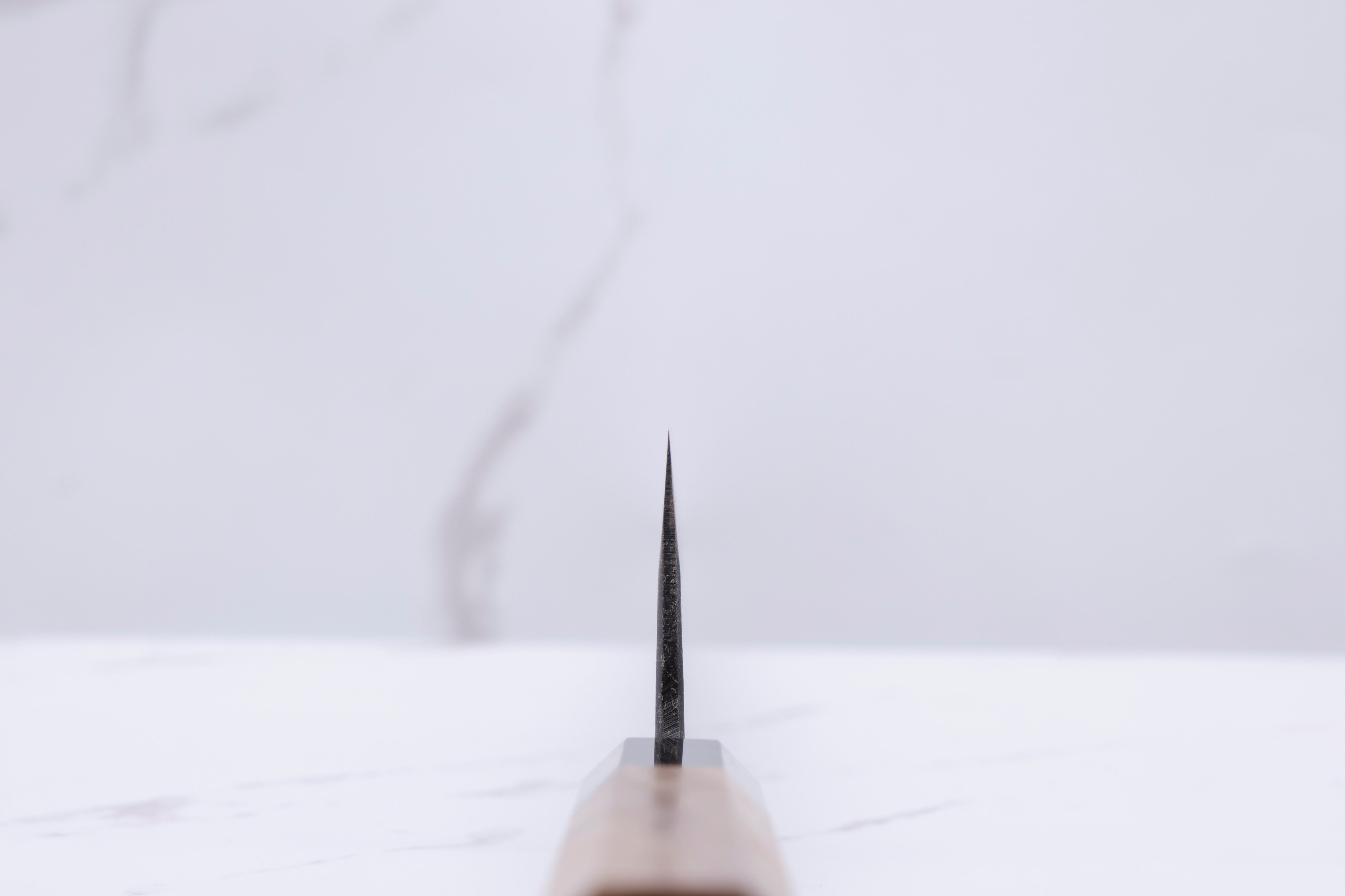 Die Kumokage-Serie besteht aus Aogami Nr. 2 im Kern und weichem Eisen an der Außenseite, daher ist bei der Verwendung ein wenig Vorsicht erforderlich, die Schneidfähigkeit und die einfache Schärfbarkeit machen dies jedoch wett. Kumokage bedeutet „Wolkenschatten“ und sagt etwas über das Aussehen und den Ausdruck des Messers aus. Das sehr rohe Kurouchi-Finish auf der Oberseite der Klinge, zusammen mit dem wirklich schönen Damast-Finish zum Ei hin, verleiht dem Messer eine super schöne Balance zwischen „unvollendet“ und unglaublich gut gemacht.