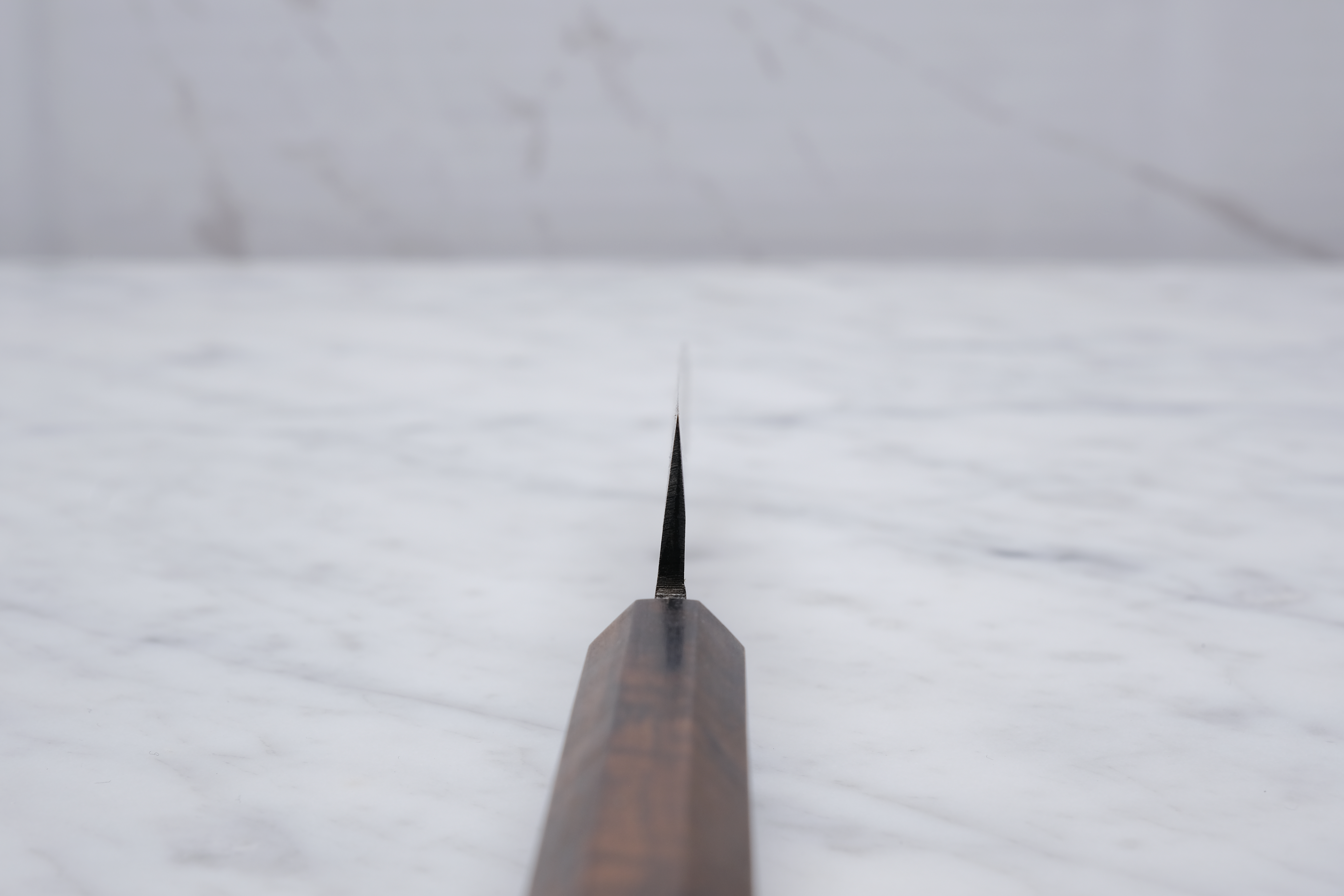 Sie haben ein klassisches Kurouchi-Finish an der Oberseite der Klinge und ein Kasumi-Finish weiter unten in Richtung Ei. Der Mahlgrad ist fantastisch, sie werden hinter dem Ei ziemlich dünn und haben daher einen guten Schnittriss, und es wurde ein bisschen an Passform und Finish gearbeitet.
