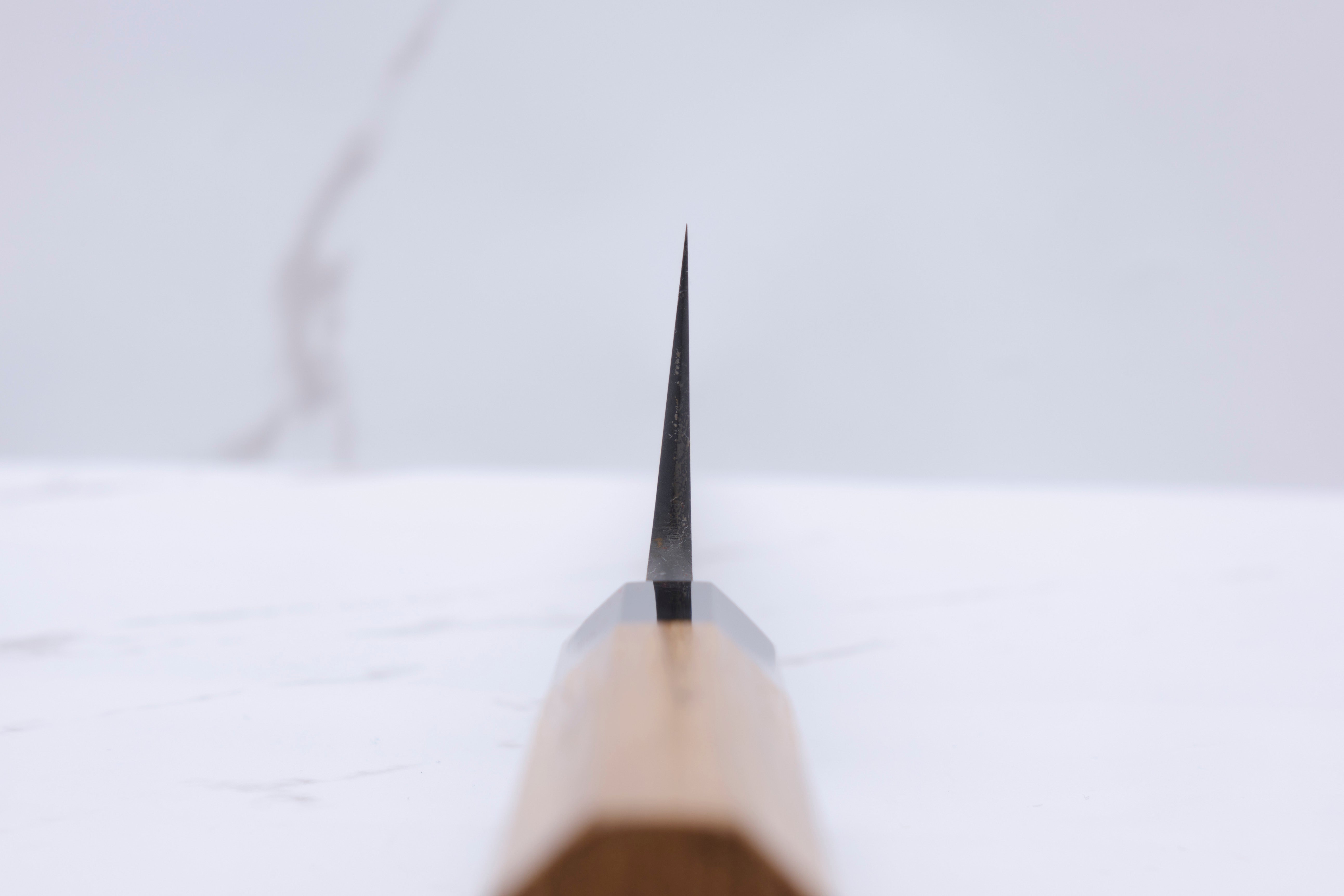Die Yoake-Serie ist SUPER robust. Kommt schön dick aus der Zange und ist im Allgemeinen auf der Rückseite dick, verjüngt sich aber weiter unten zum Ei hin sehr schön und ist am Ende ziemlich dünn. Ein echtes Arbeitstier mit einem fantastischen Schliff, der ihm sowohl Stabilität als auch außergewöhnlich gute Schneidfähigkeit verleiht .