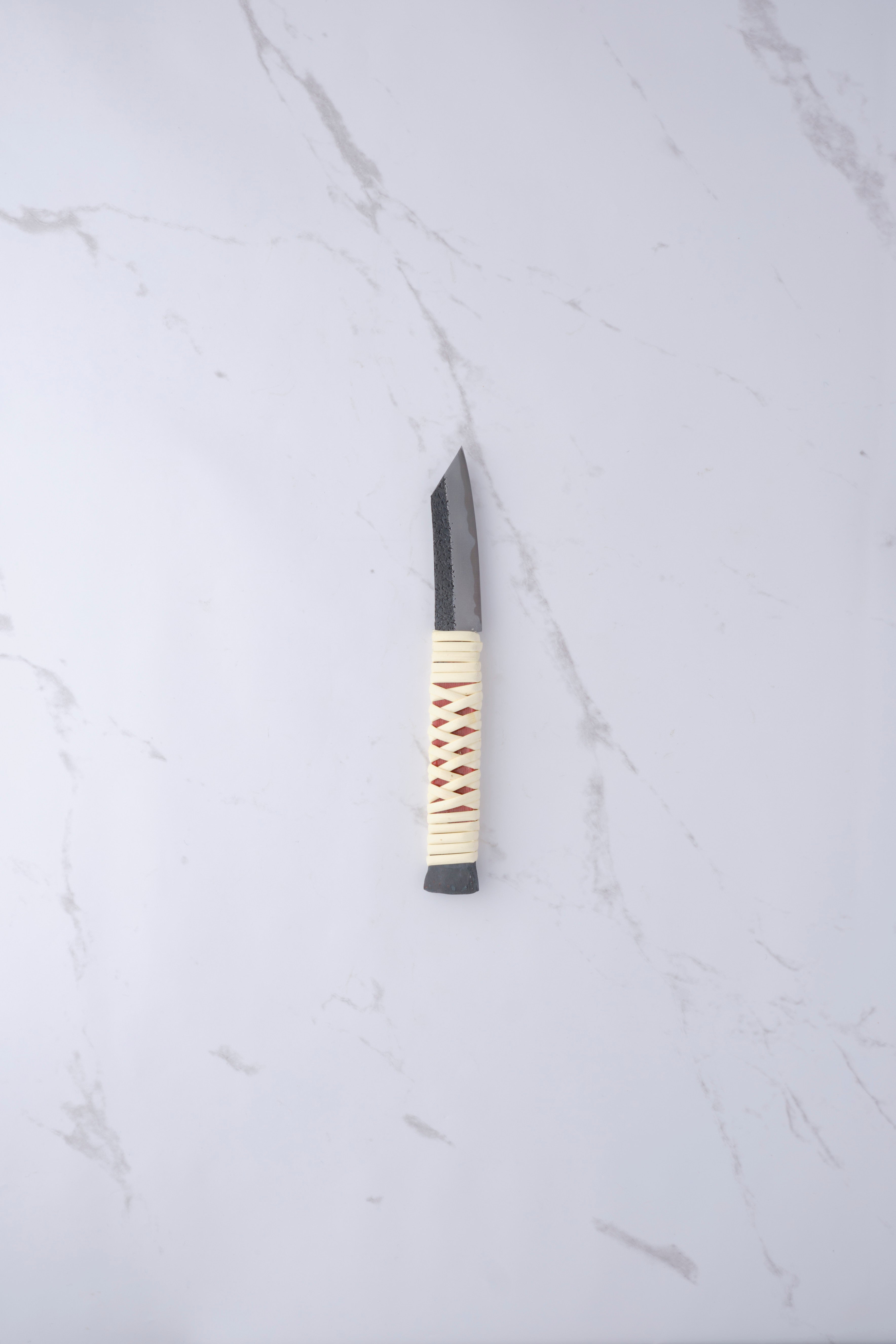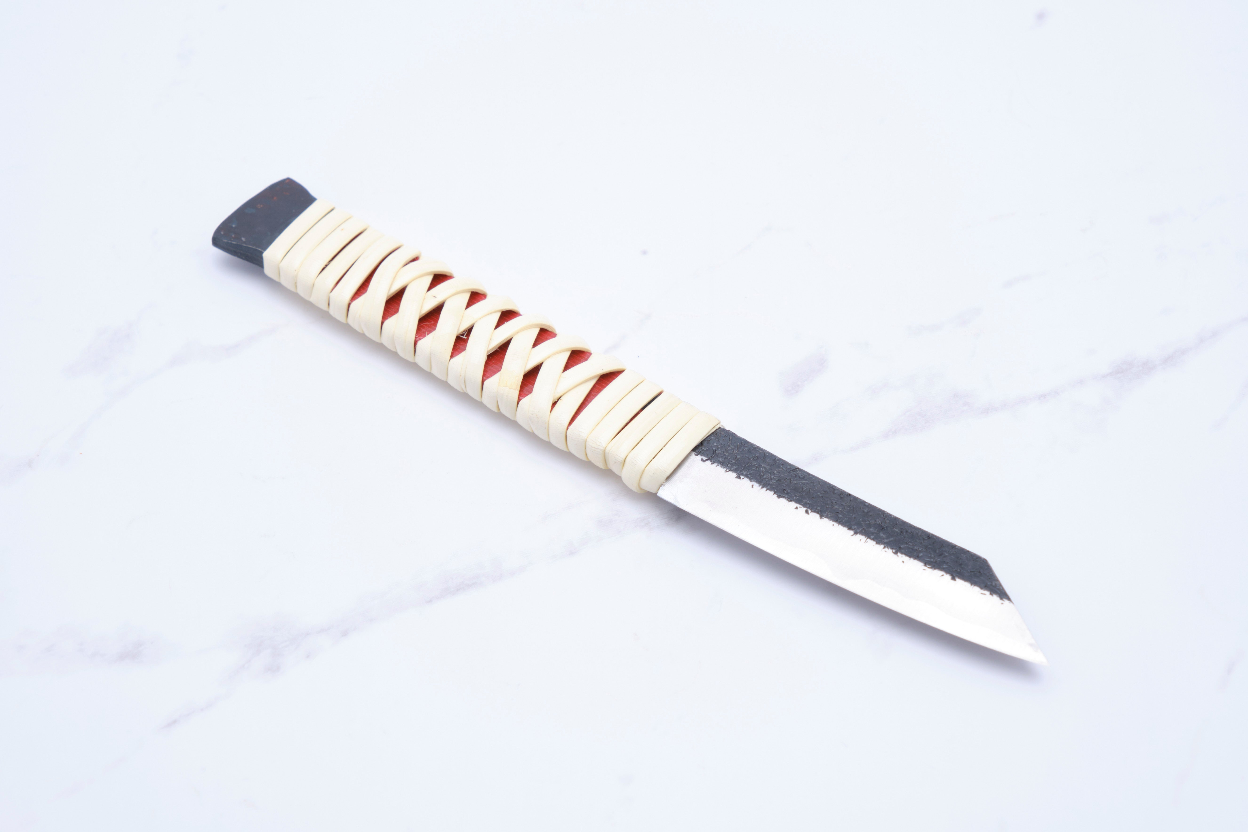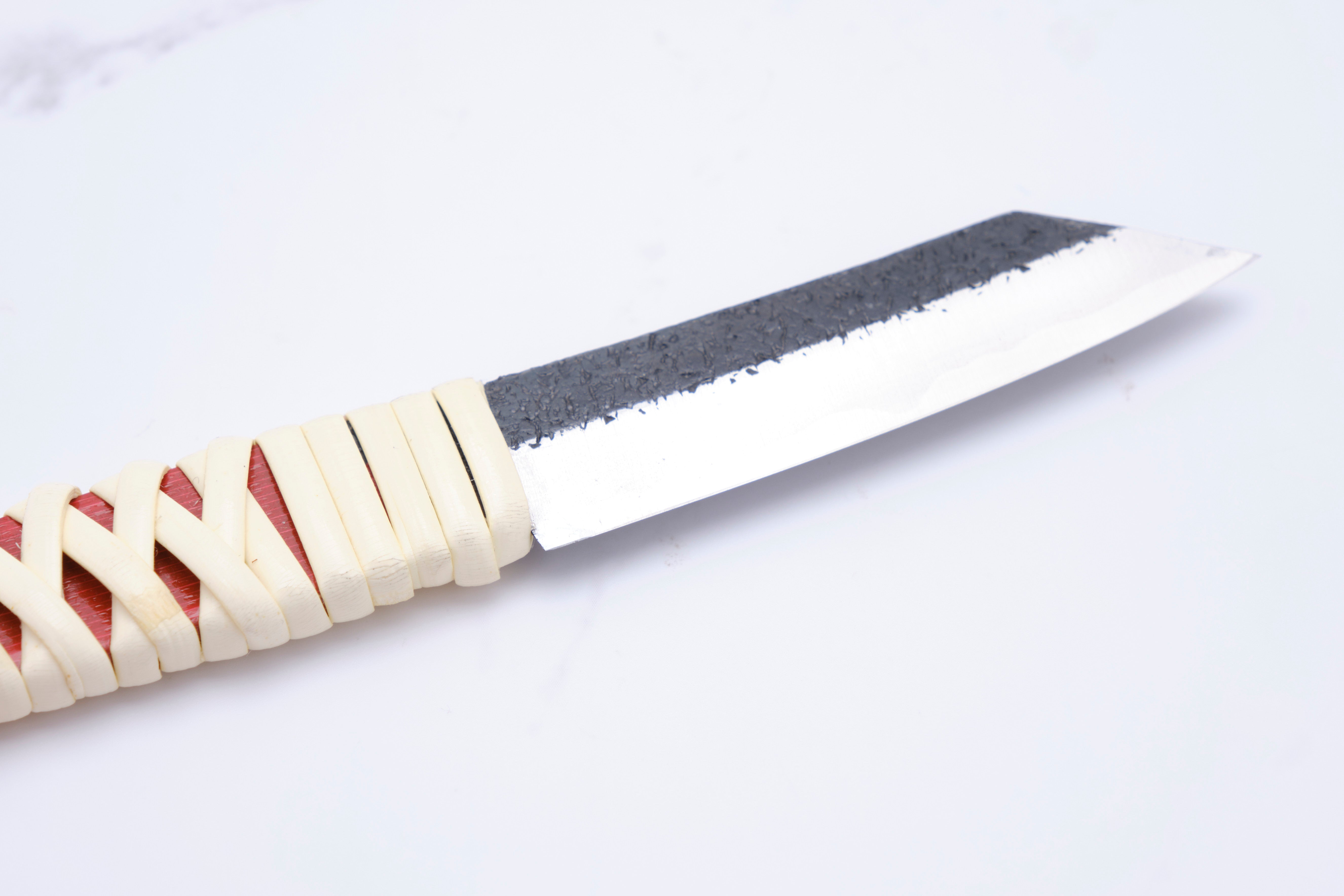 Das Messer besteht aus 3 Lagen mit blauem Stahl (Aogami) im Kern, umgeben von Weicheisen. Die Klinge ist 6 cm lang und die Gesamtlänge beträgt 17 cm.
