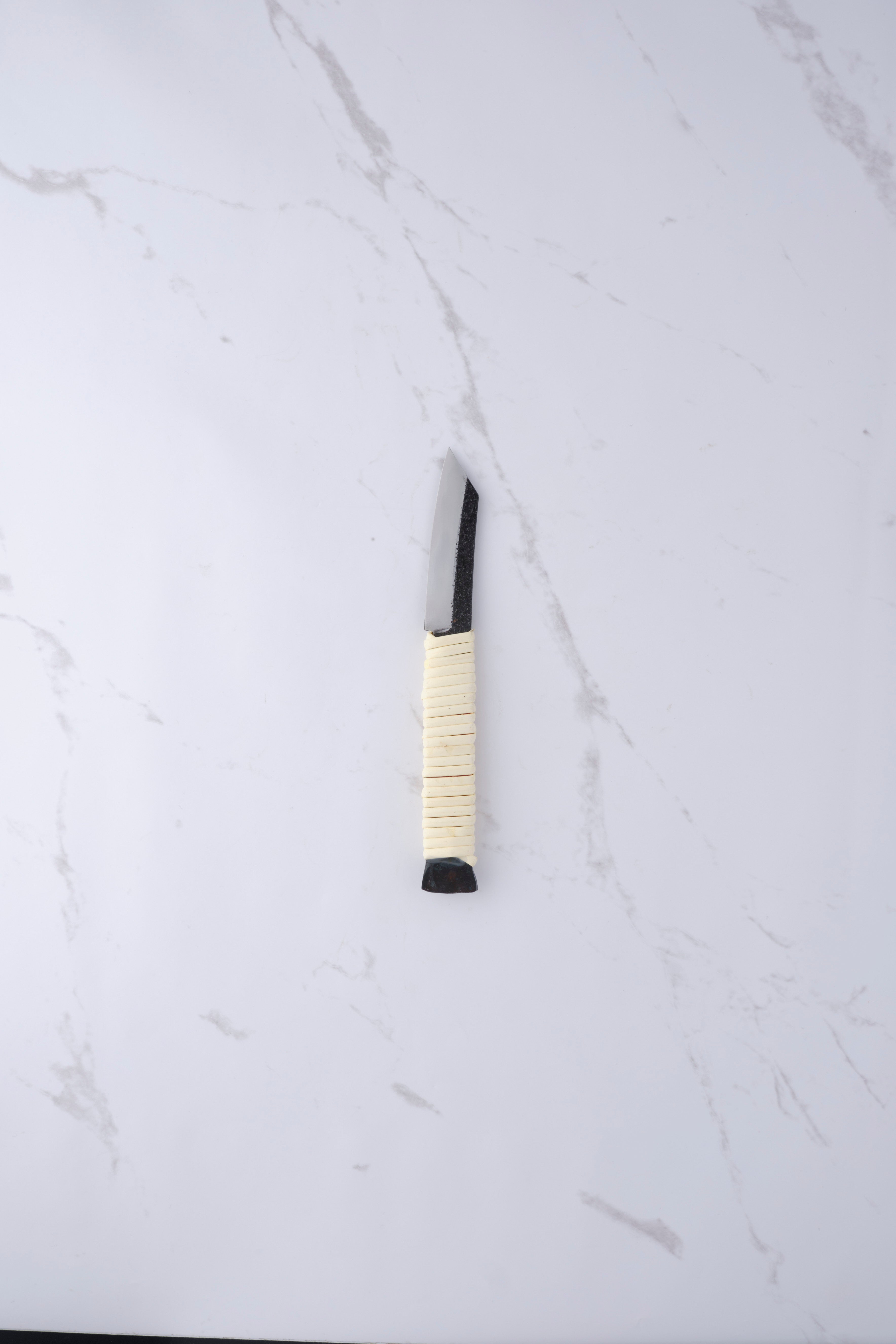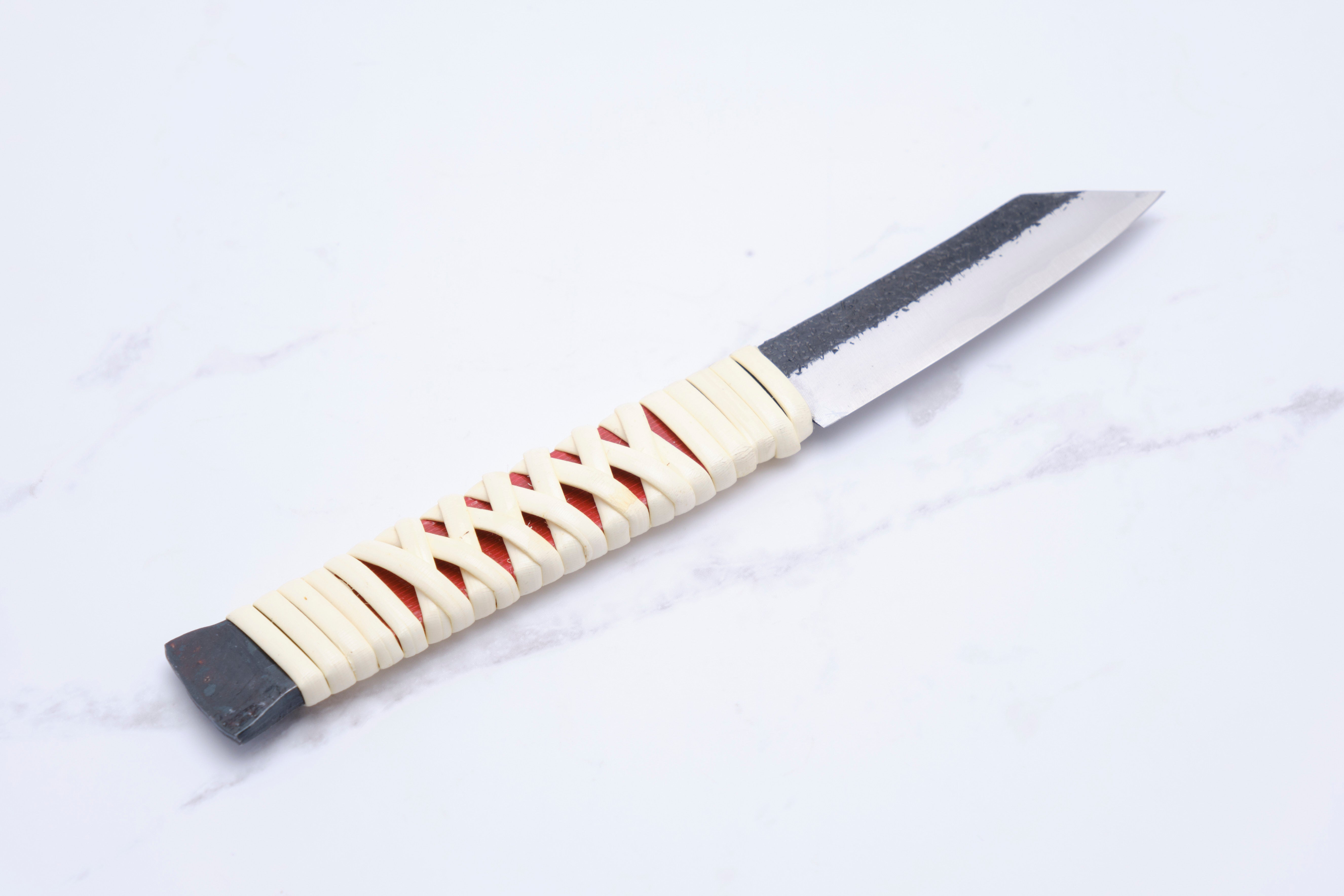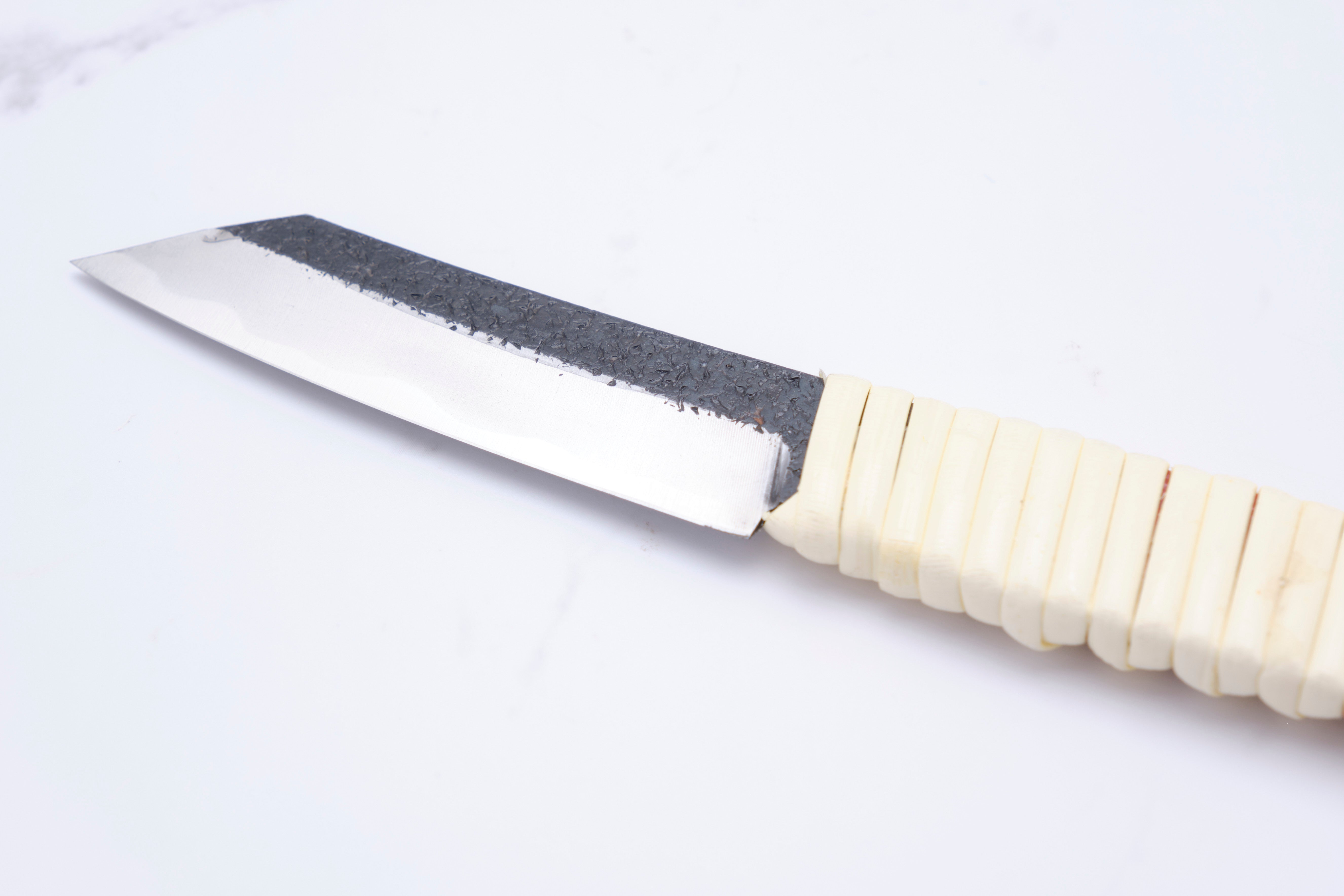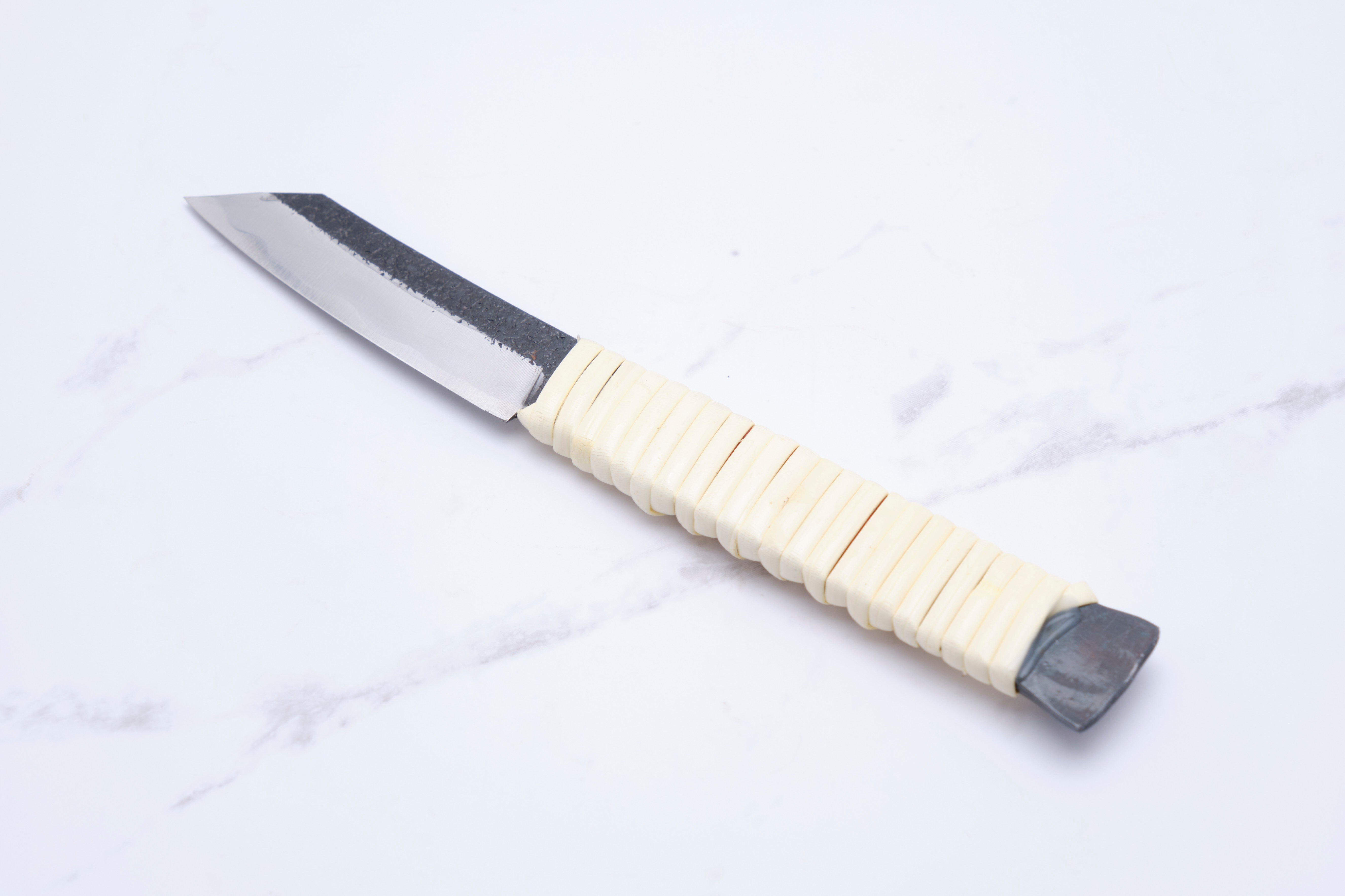 Das Messer besteht aus 3 Lagen mit blauem Stahl (Aogami) im Kern, umgeben von Weicheisen. Die Klinge ist 6 cm lang und die Gesamtlänge beträgt 17 cm.