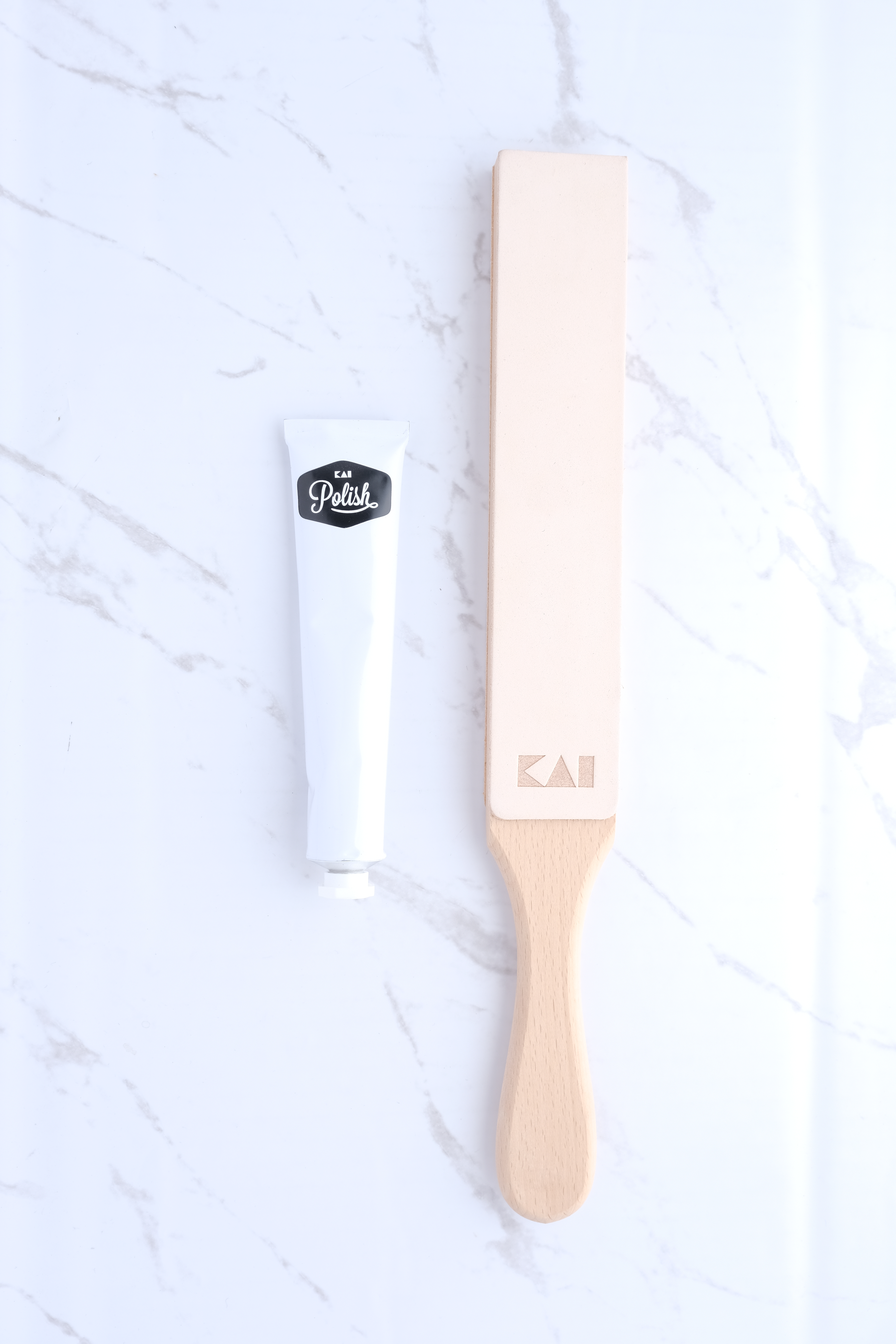 Ein handgehaltener Lederriemen in guter Qualität mit einem Griff aus Buchenholz. Wird mit Poliermittel geliefert, das auf das Leder aufgetragen wird, um ein feineres Finish zu erzielen.