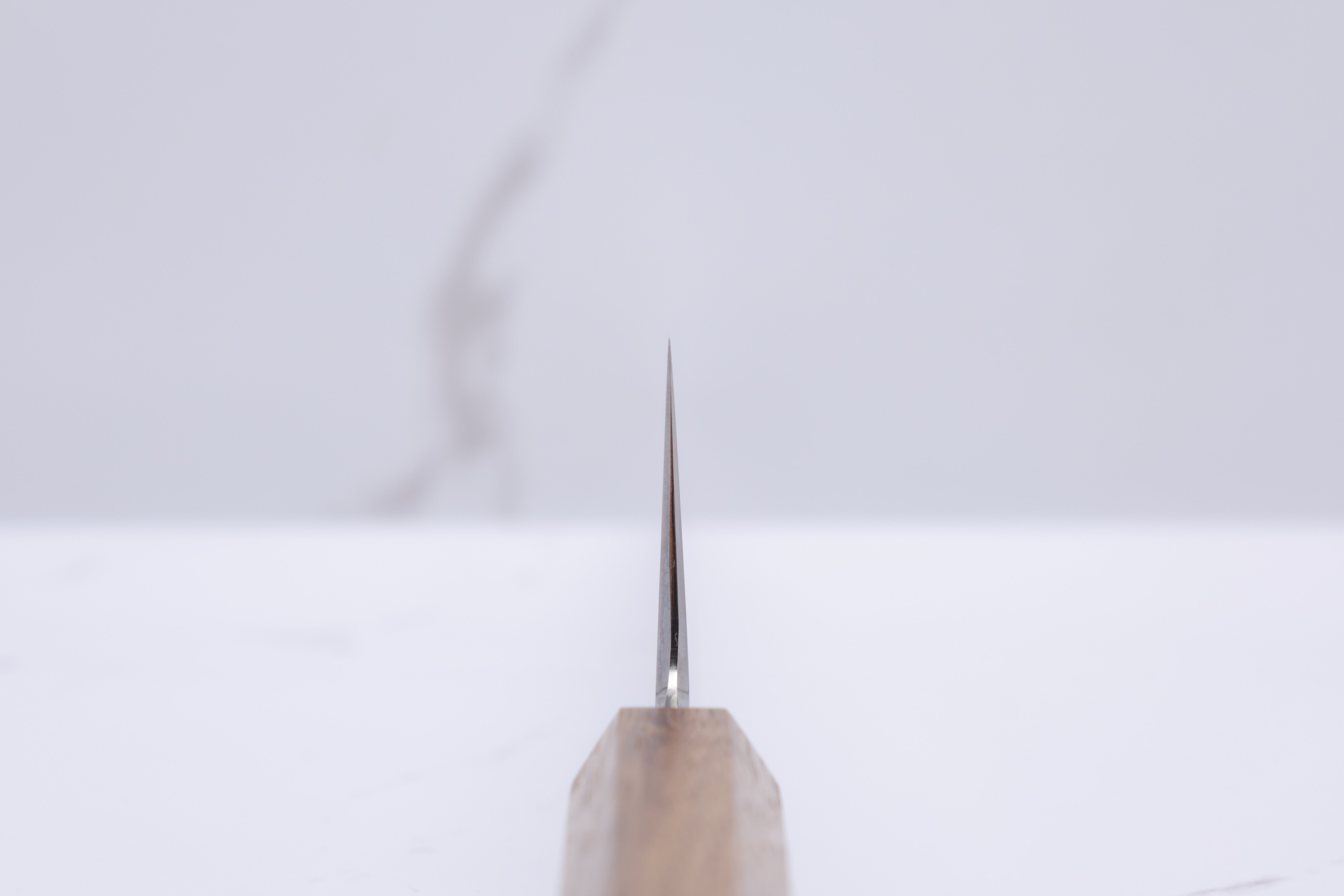 Die Klinge besteht aus drei Lagen Stahl, dessen Kern Aogami-2 (Blau-2) ist, einer der klassischen japanischen Kohlenstoffstähle.Alles über Stahlarten können Sie in unserem Artikel zum Thema Stahl hier nachlesen , aber wenn Sie keine Lust dazu haben, können Sie Aogami-2 kurz als eine relativ harte Legierung beschreiben, die rostet. Auf jeder Seite des Kerns befindet sich eine Schicht Weichstahl, die ebenfalls rostet. Denken Sie daher unbedingt daran, dieses Messer abzuspülen, sobald Sie etwas geschnitten haben. Eventuell können Sie die Klinge nach dem Kochen mit säurefreiem Speiseöl einfetten, um sie vor Rost zu schützen.