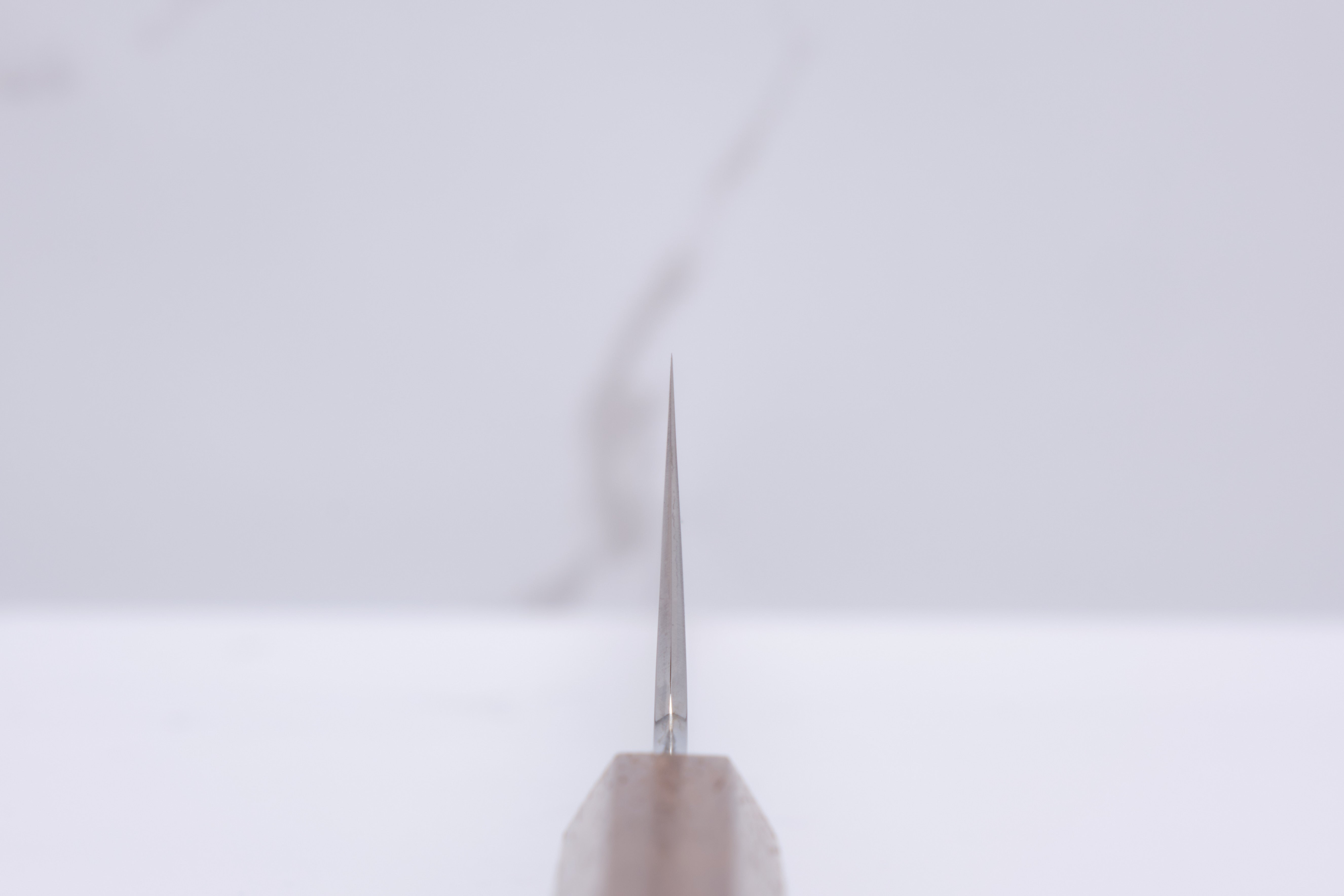 Wie von Konosuke erwartet, ist das Finish absolute Spitzenklasse. Der Klingenrücken ist abgerundet und poliert – so auch auf der rechten Seite der Klinge an der Ferse. Es liegt daher sehr angenehm in der Hand, wenn man zu den Menschen gehört, die beim Umgang mit dem Messer die Finger ganz auf der Klinge haben. Diese kleinen Details sehen wir selten und auf jeden Fall nur bei den luxuriösesten Messern.