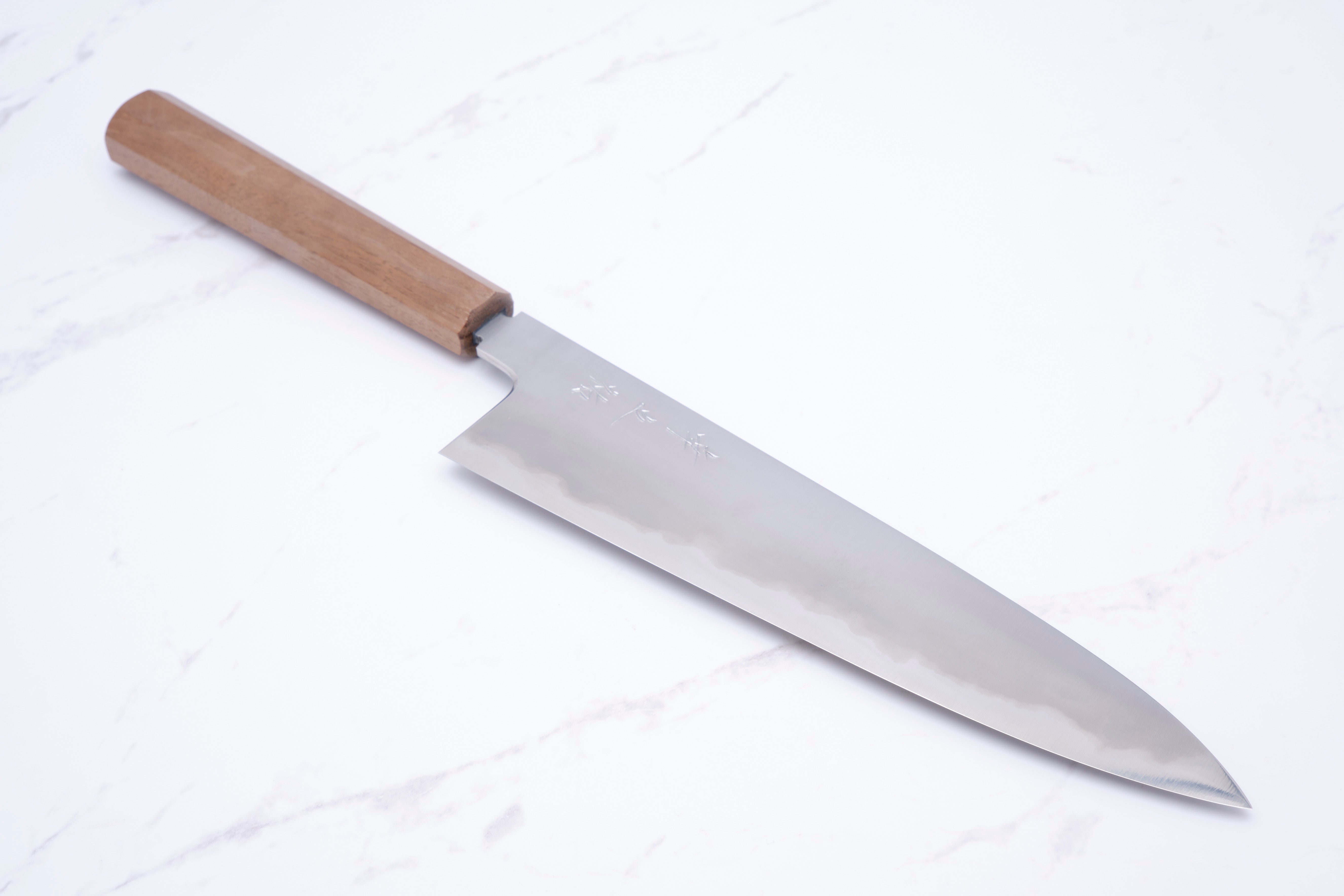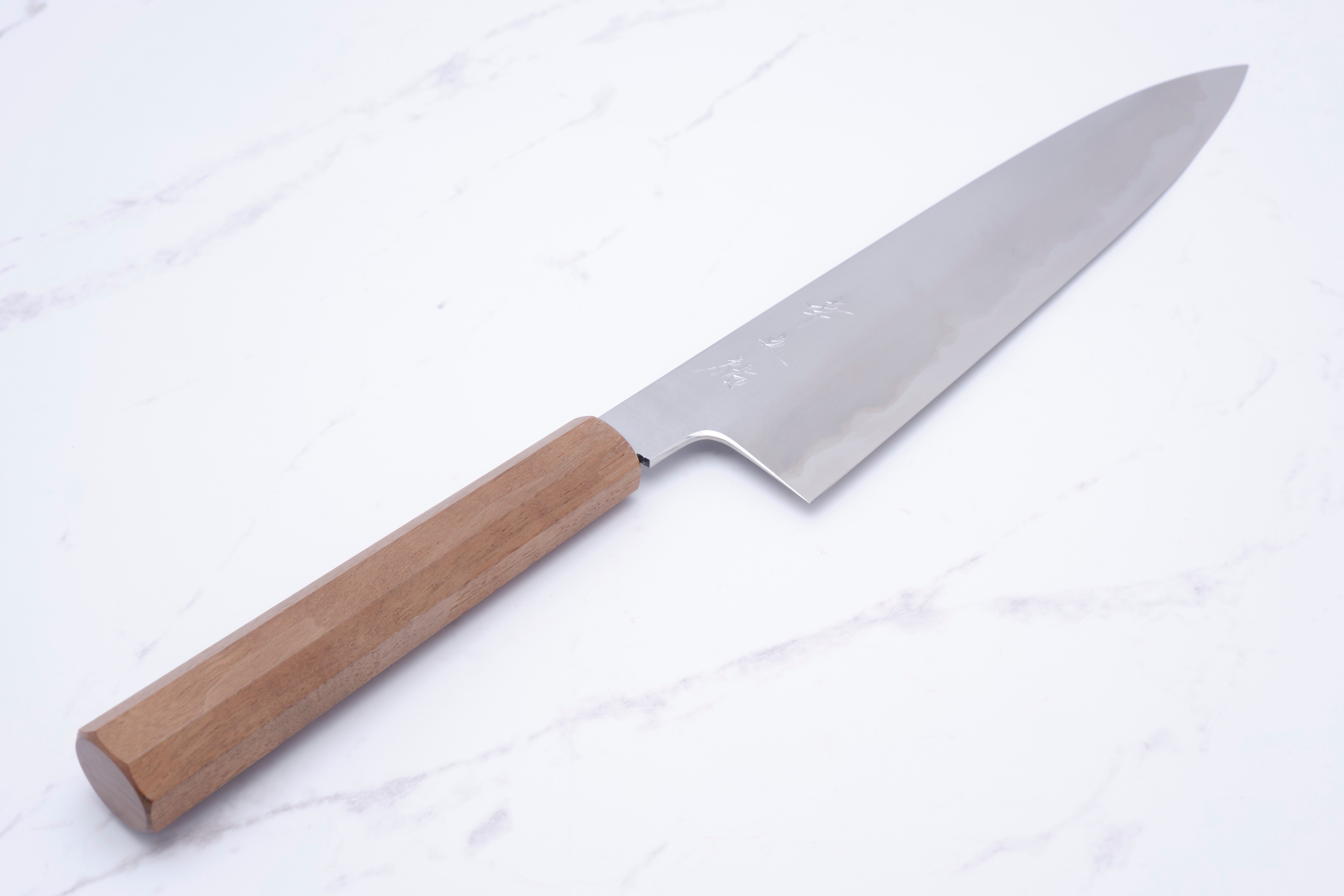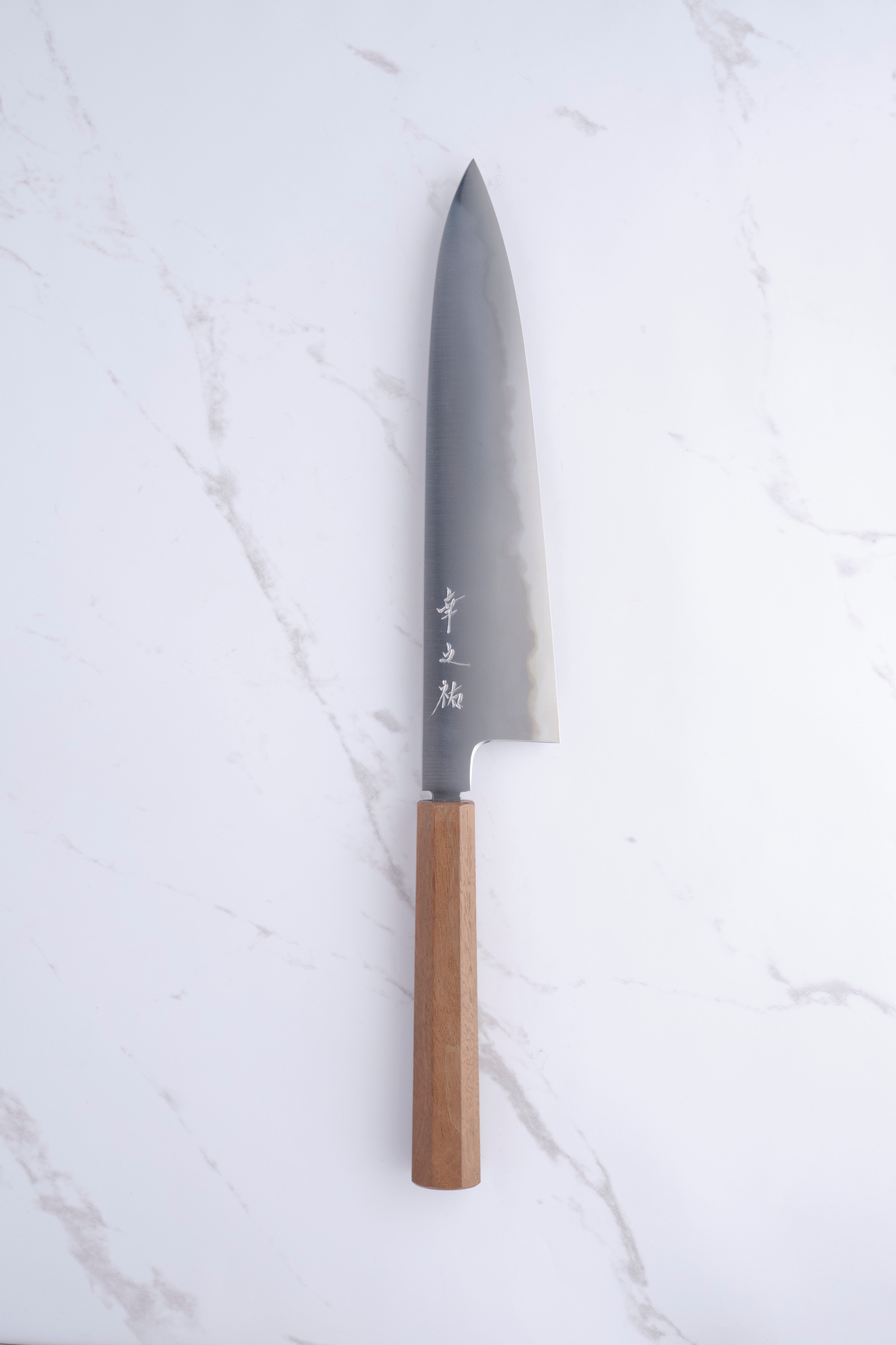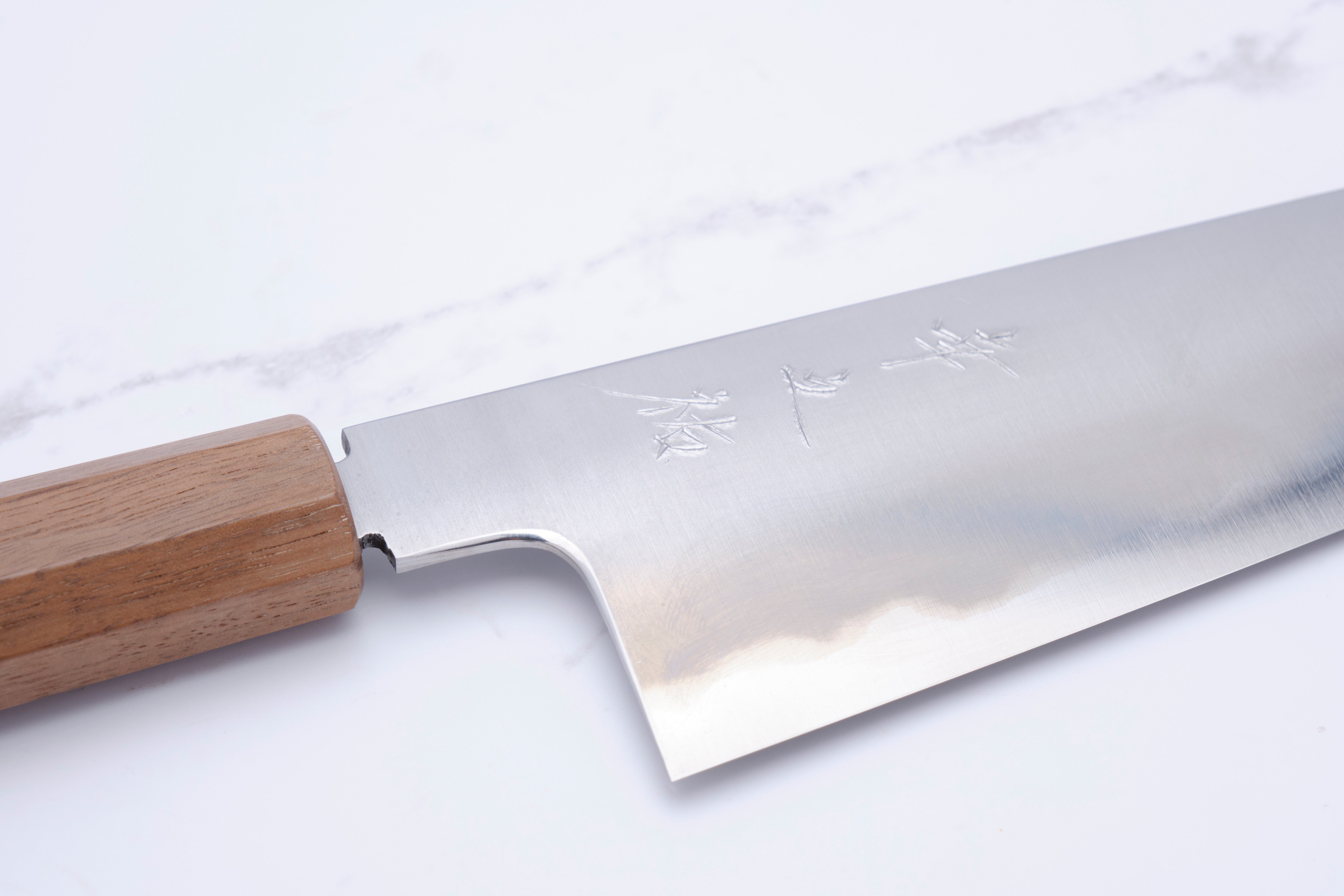 Das 225-mm-Gyuto besteht aus 3 Schichten. Ein Kern von Shirogami Nr. 2 (weiß 2), der von Weicheisen umarmt wird. Man muss daher damit rechnen, dass die gesamte Klinge Patina aufweist, aber ein extrem hohes Schärfepotenzial aufweist.
