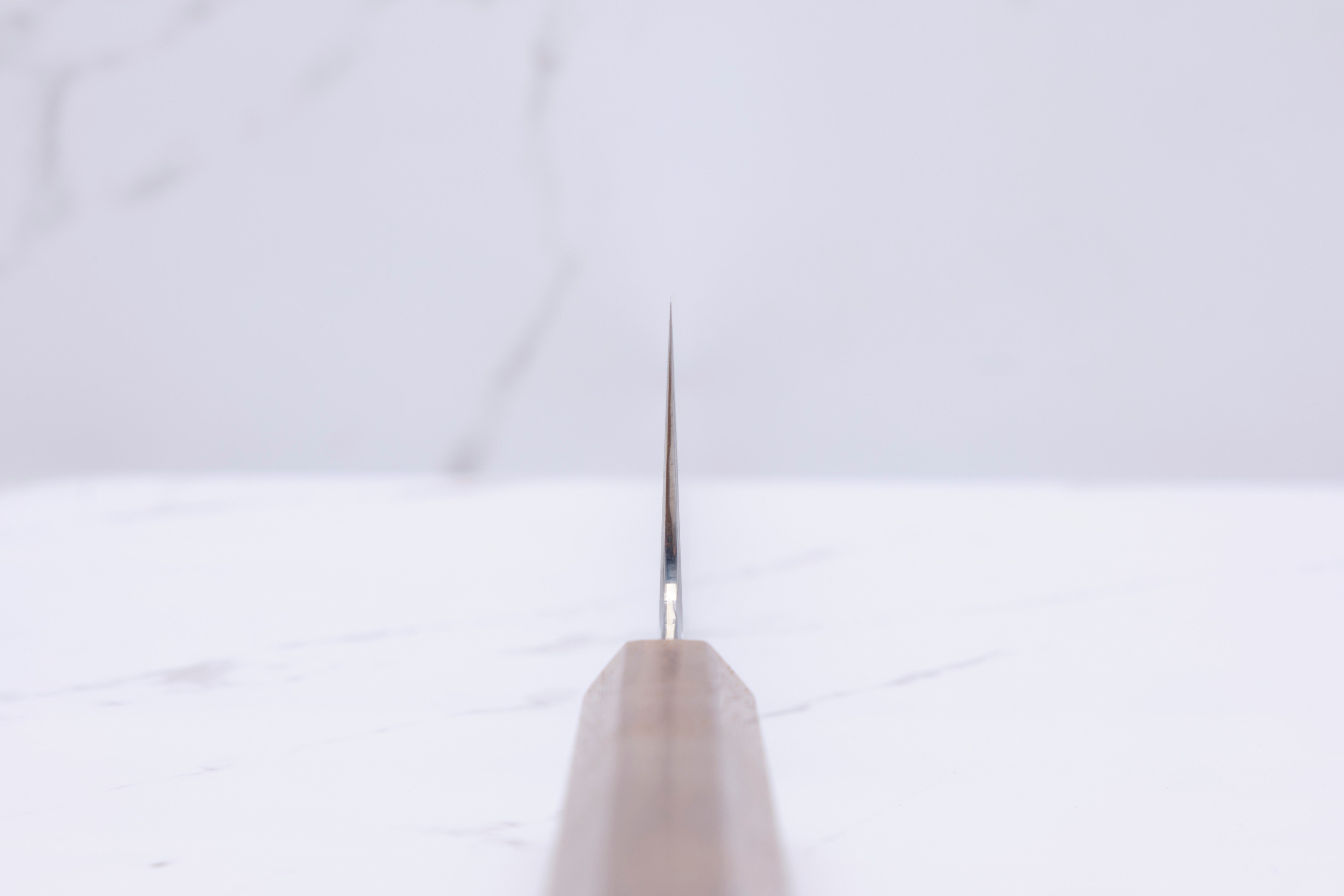 Was wir an diesem Messer wirklich cool finden, ist, dass es an der Unterseite der Ferse etwas höher ist, als man es normalerweise von Konosuke sieht. Es gibt mehr „Knöchelfreiheit“ beim Arbeiten damit und gibt dem Messer auch etwas mehr Platz zum Ausdünnen.