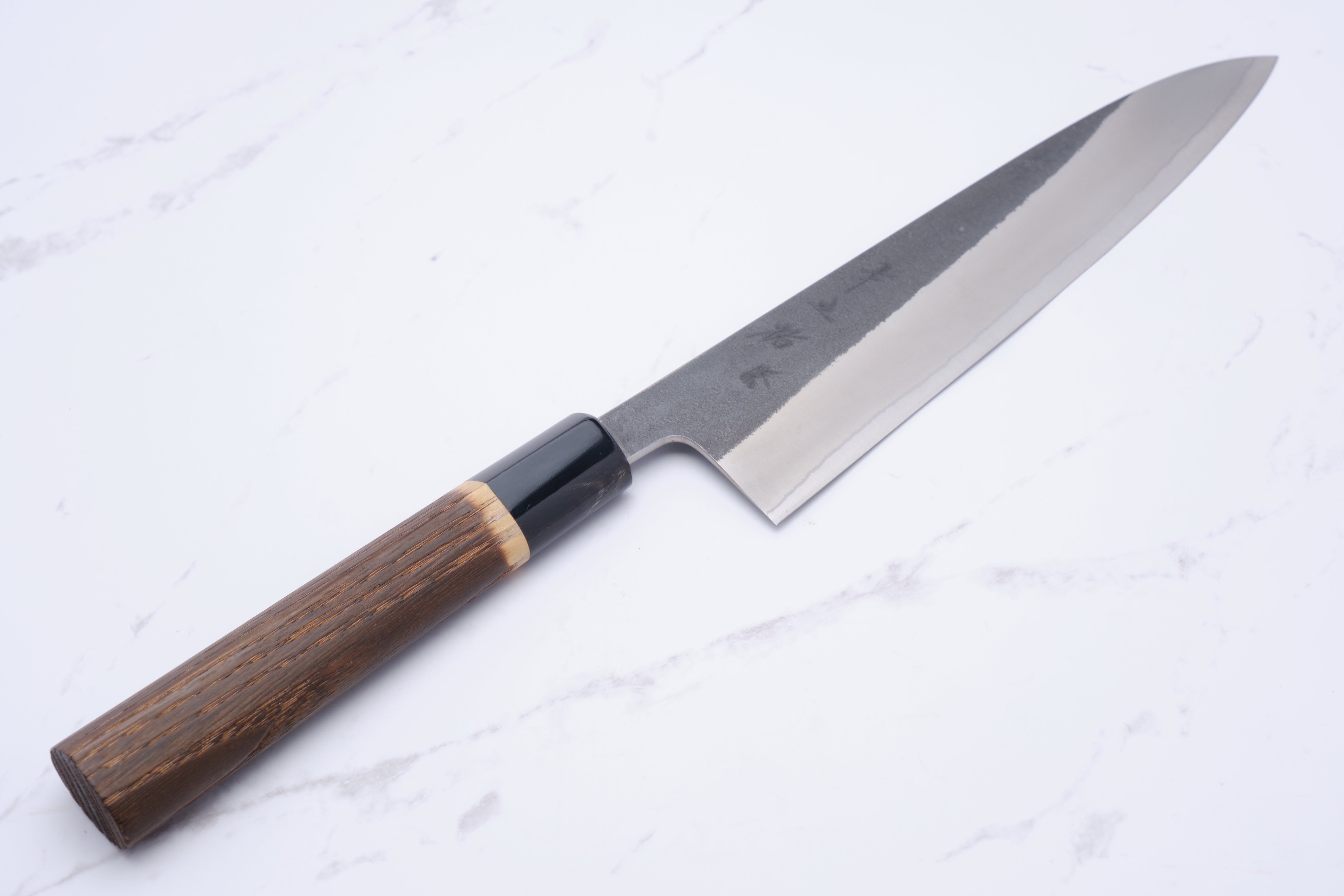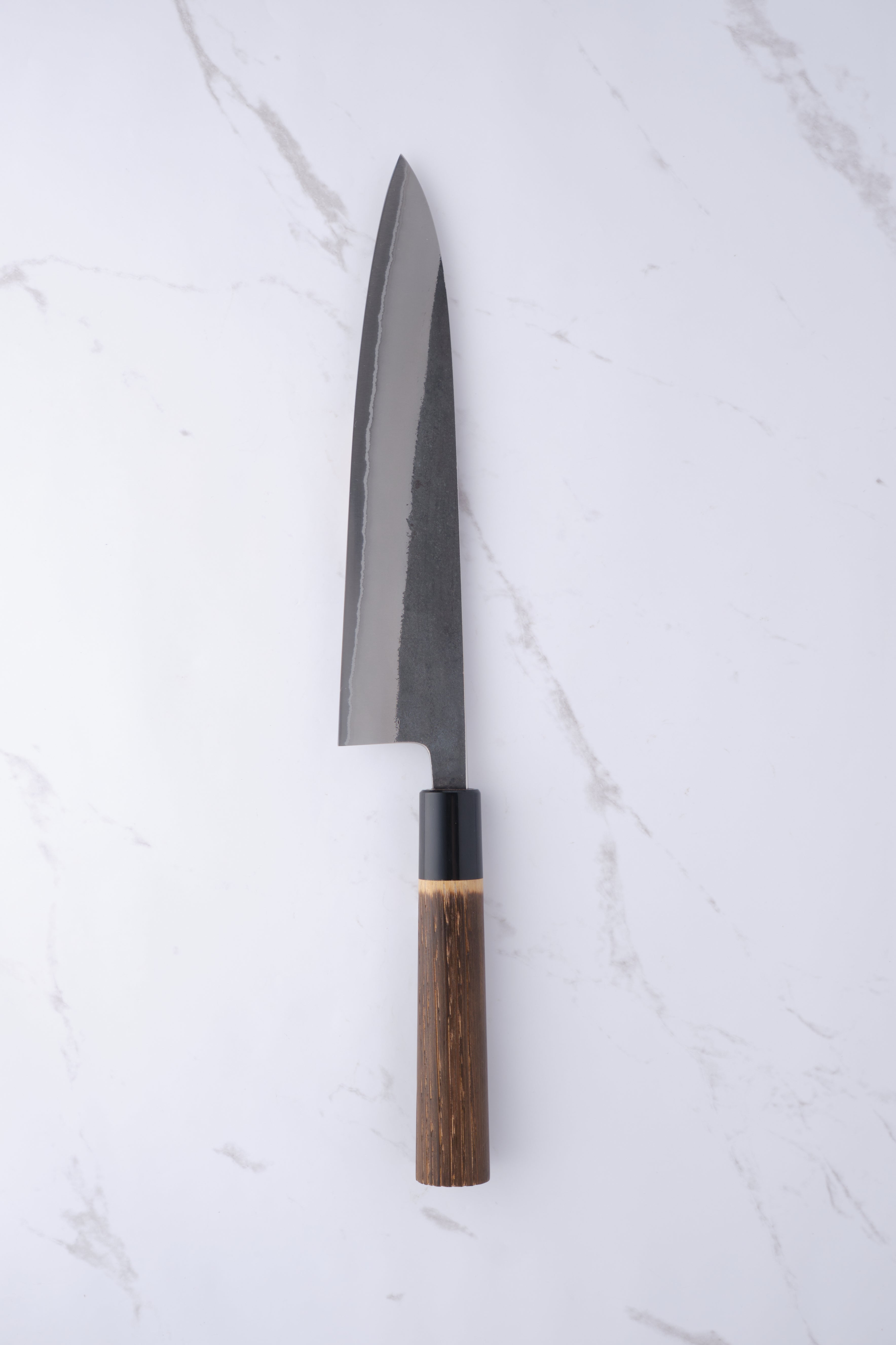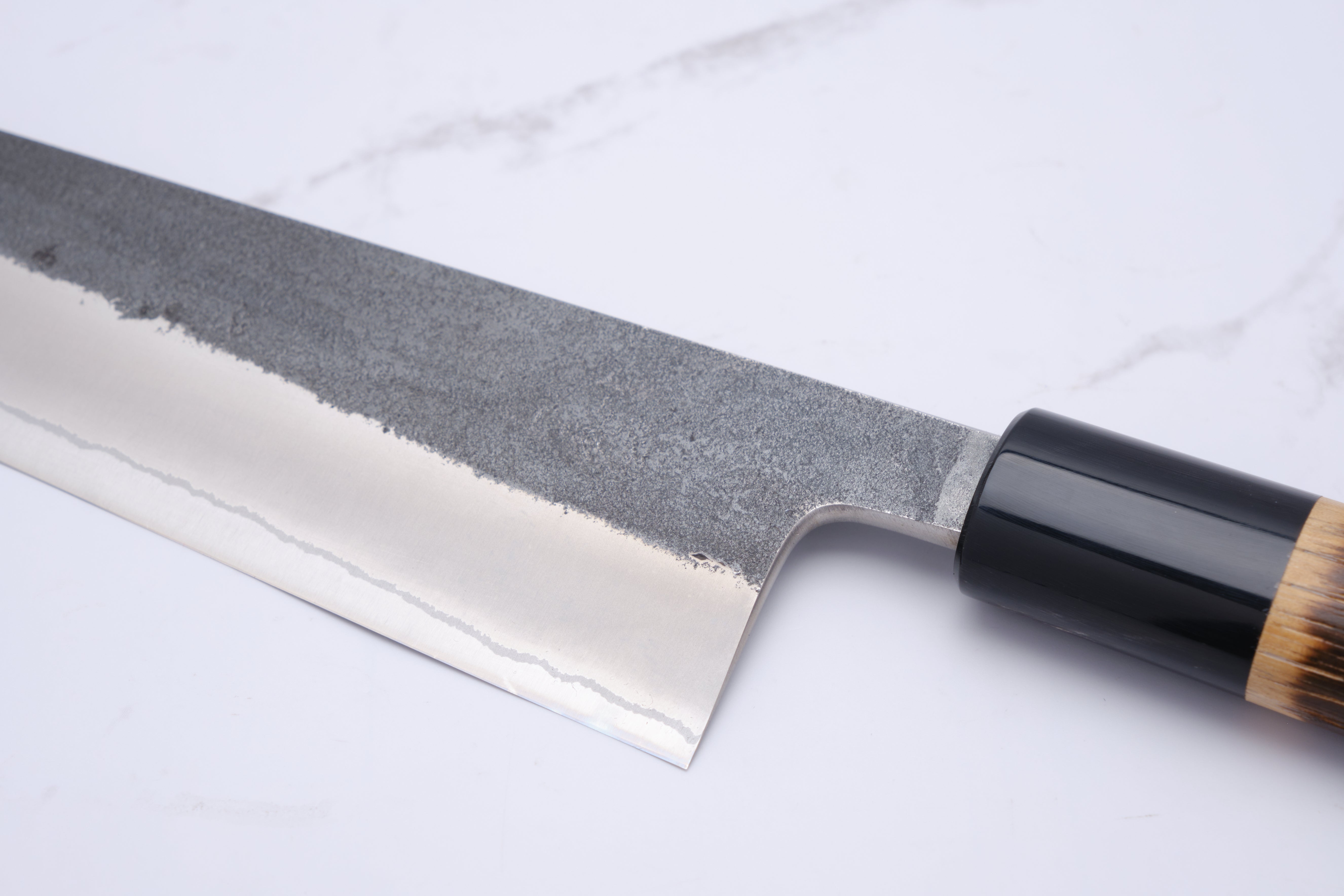 Das Konosuke YW 210 mm Gyuto Shirogami 2 ist ein außergewöhnliches Kochmesser, das Robustheit mit unglaublicher Schärfe verbindet. Dieses Messer ist mit einem dickeren Griff ausgestattet, der ein solides Gefühl vermittelt, während der ultradünne Schliff hinter der Schneide ein unvergleichliches Schneiderlebnis gewährleistet. Die YW-Serie ist dreilagig aufgebaut, mit Shirogami 2 als Kernstahl, umgeben von einer Edelstahlummantelung und einem eleganten Kurouchi-Finish. Der Griff besteht aus gebrannter Kastanie und Büffelhorn, was sowohl Komfort als auch Stil bietet. Shirogami 2, auch bekannt als White 2, ist einer der reinsten Kohlenstoffstähle aus Japan, wodurch eine extrem scharfe und pflegeleichte Schneide erreicht wird.