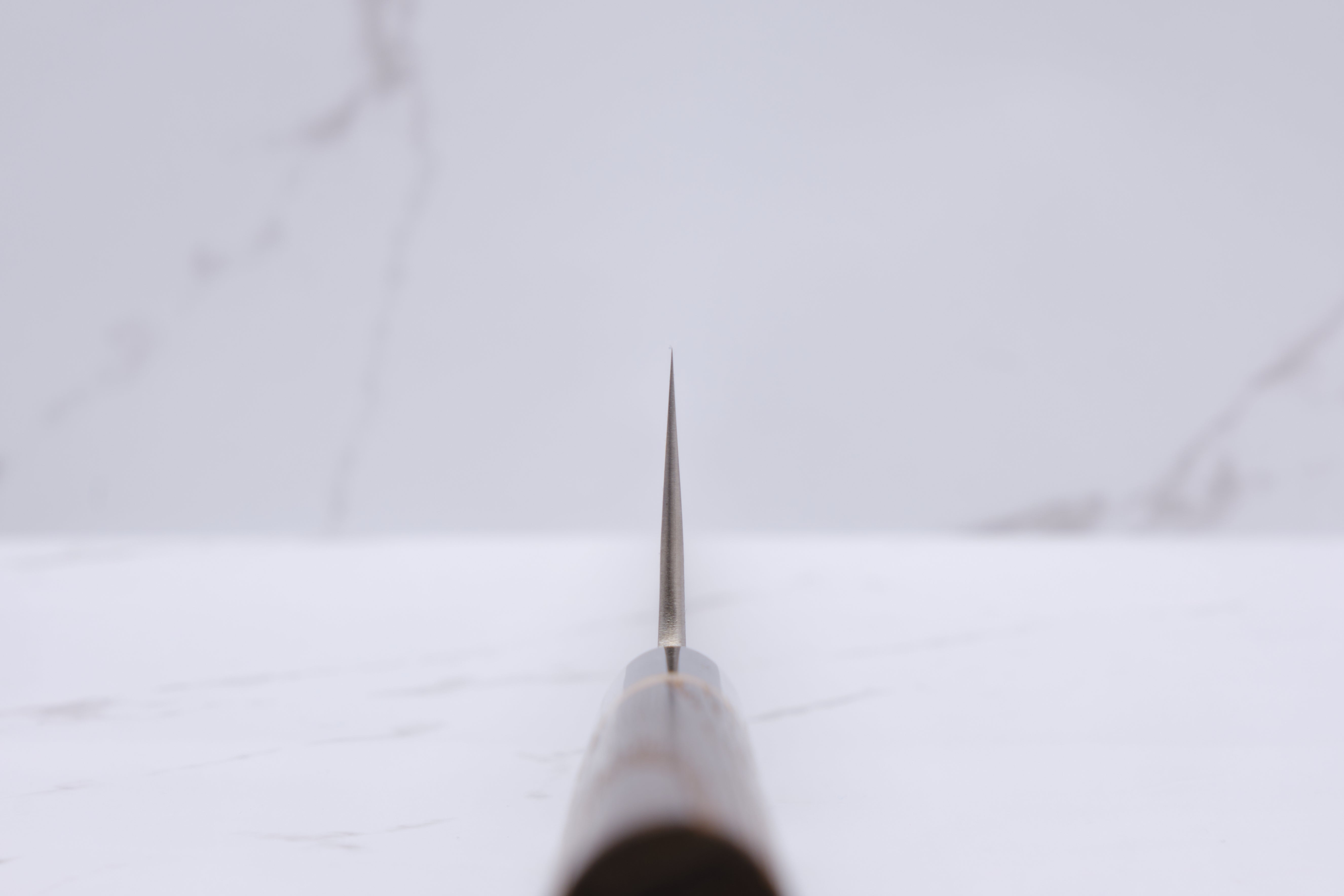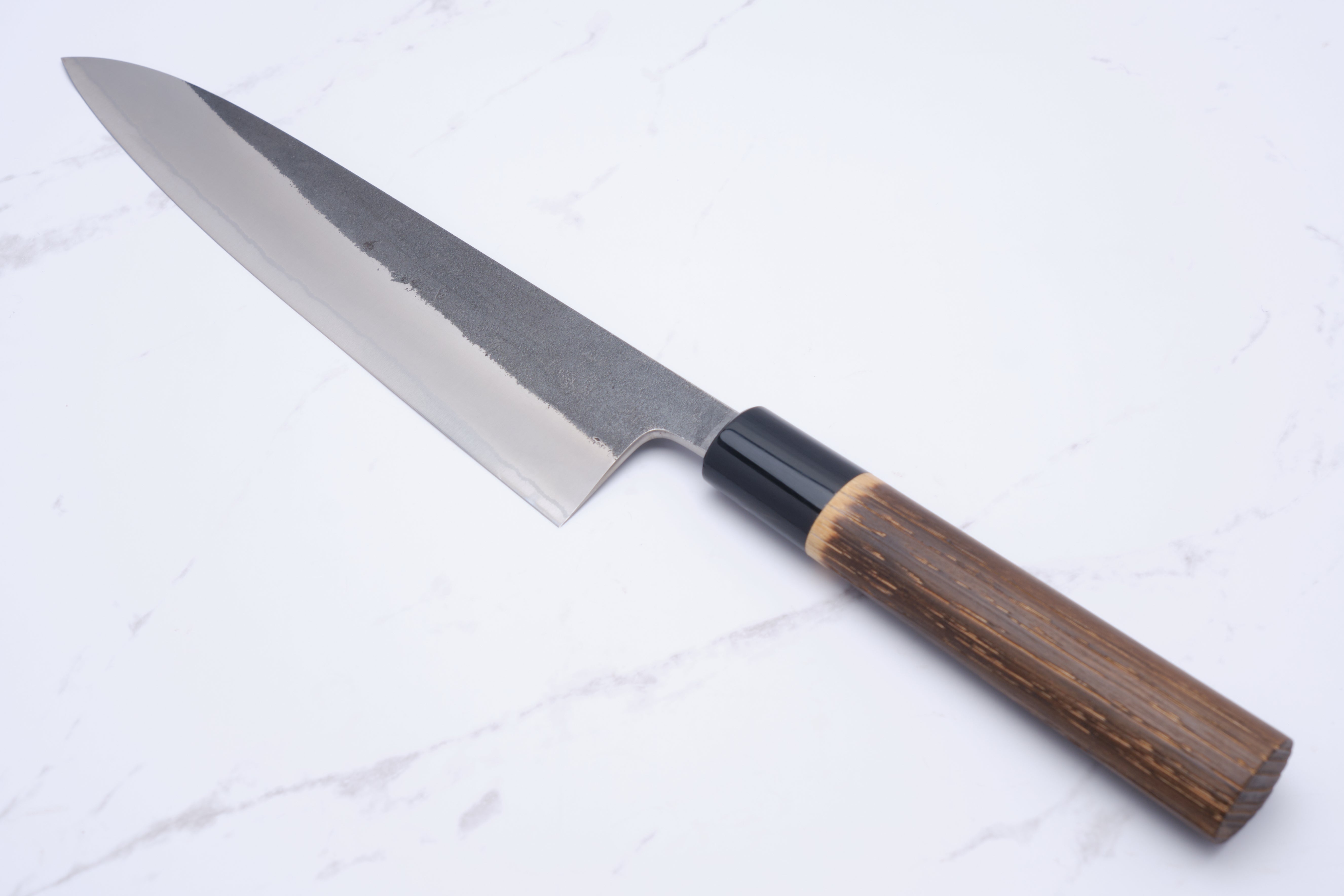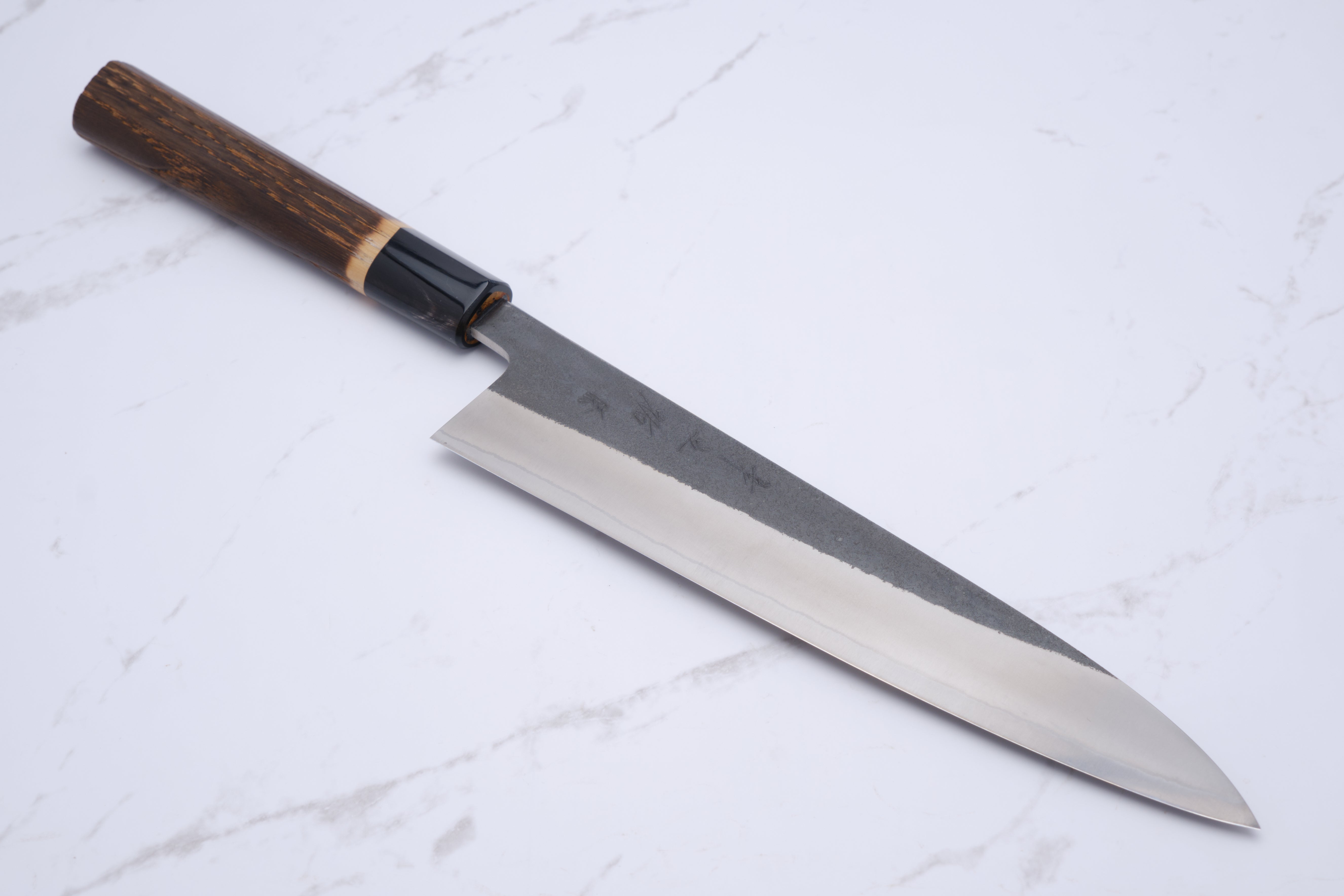 Das Konosuke YW 210 mm Gyuto Shirogami 2 ist ein außergewöhnliches Kochmesser, das Robustheit mit unglaublicher Schärfe verbindet. Dieses Messer ist mit einem dickeren Griff ausgestattet, der ein solides Gefühl vermittelt, während der ultradünne Schliff hinter der Schneide ein unvergleichliches Schneiderlebnis gewährleistet. Die YW-Serie ist dreilagig aufgebaut, mit Shirogami 2 als Kernstahl, umgeben von einer Edelstahlummantelung und einem eleganten Kurouchi-Finish. Der Griff besteht aus gebrannter Kastanie und Büffelhorn, was sowohl Komfort als auch Stil bietet. Shirogami 2, auch bekannt als White 2, ist einer der reinsten Kohlenstoffstähle aus Japan, wodurch eine extrem scharfe und pflegeleichte Schneide erreicht wird.