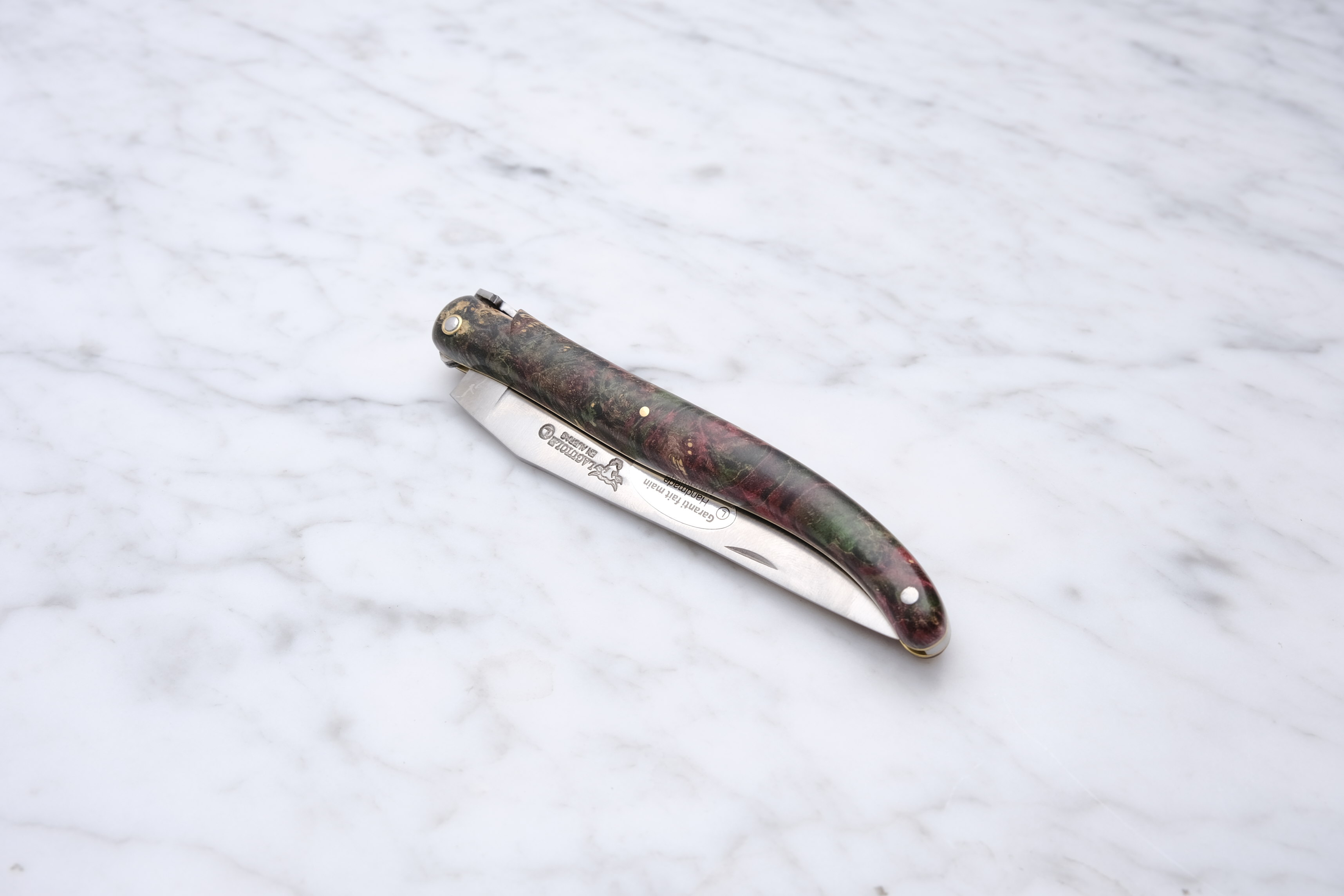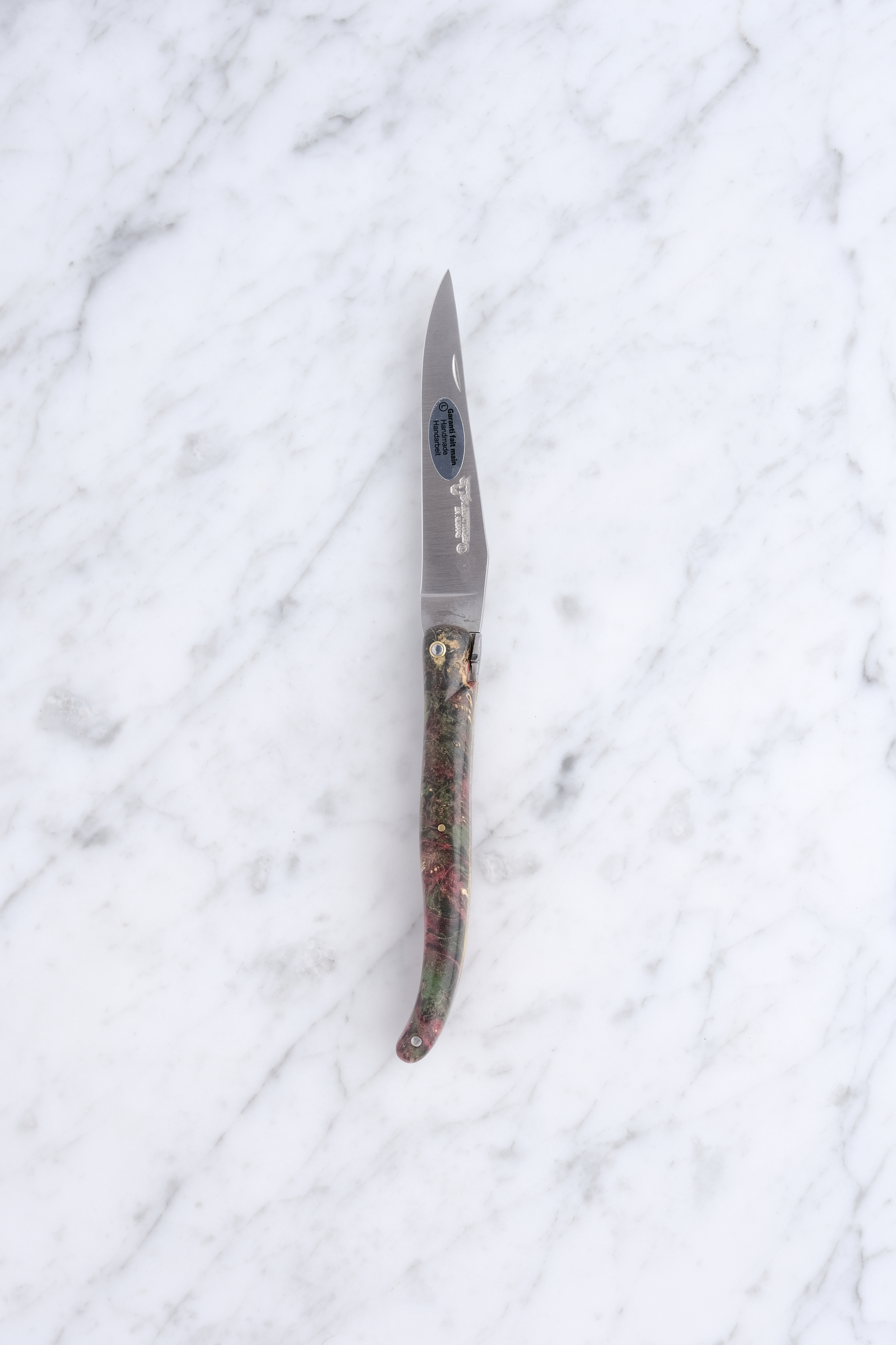 Ein Laguiole en Aubrac Messer hat eine Klinge aus schwedischem 12C27 Stahl, der eine gute rostfreie Legierung ist. Es wird in der Werkstatt auf eine feine Schneide geschliffen und lässt sich leicht wieder schärfen, wenn der Bedarf besteht, wobei wir Ihnen gerne helfen.