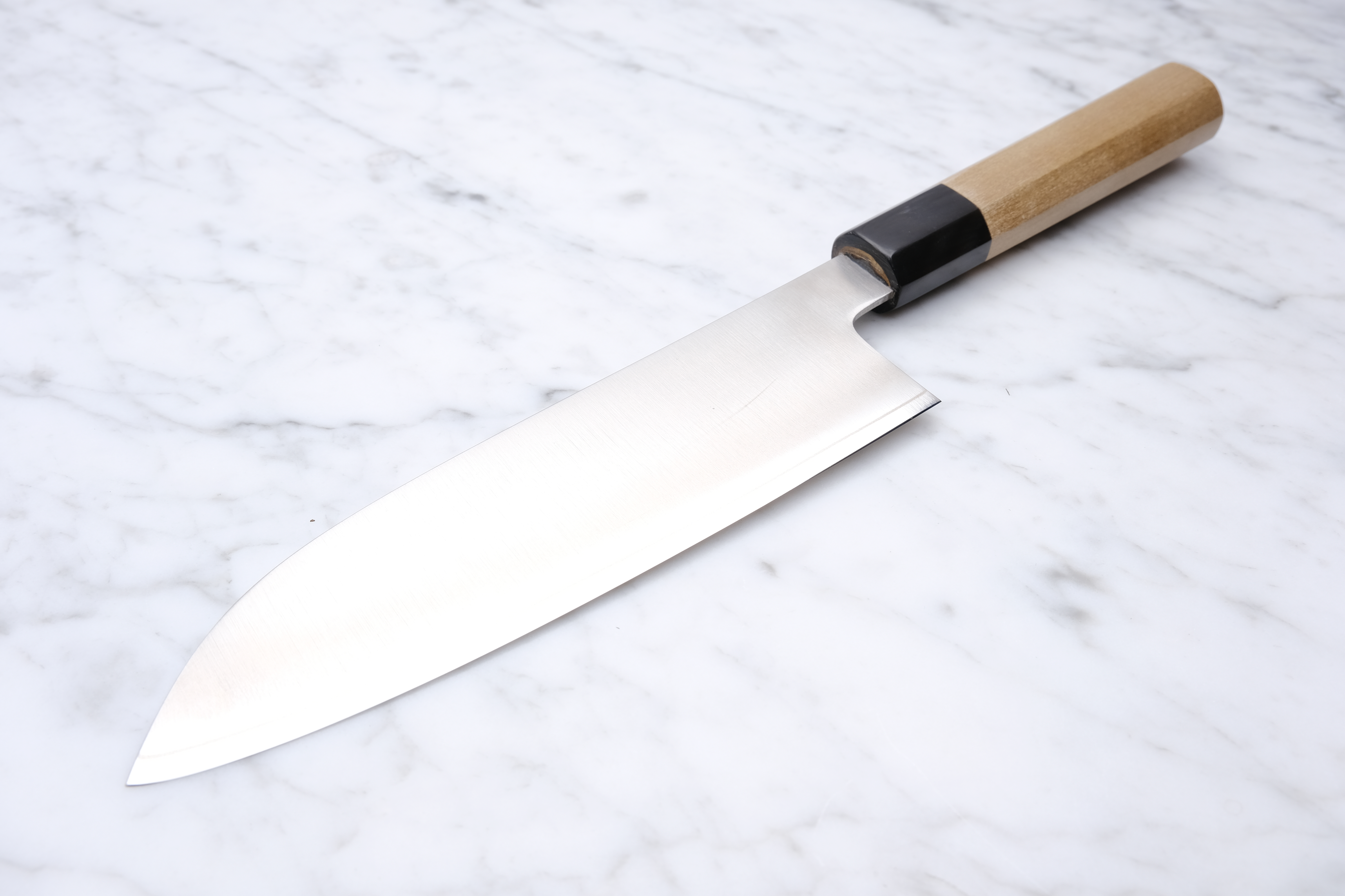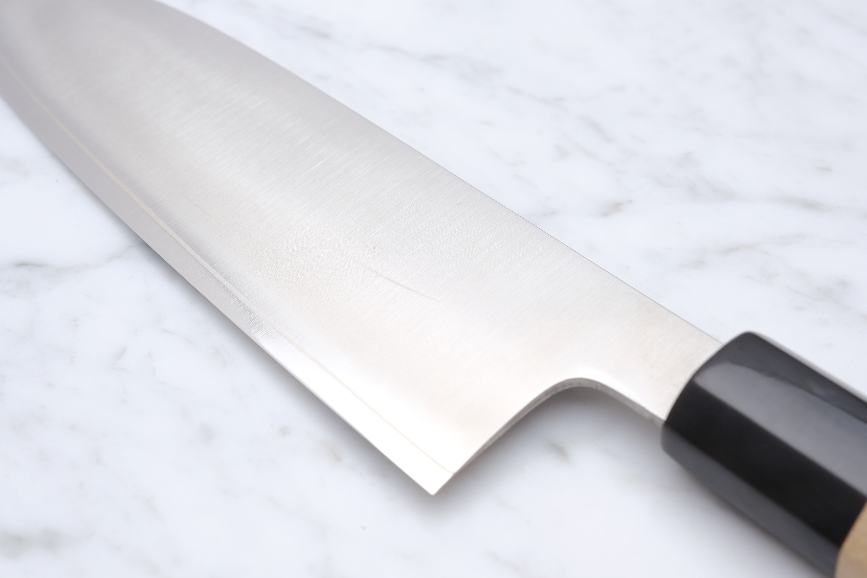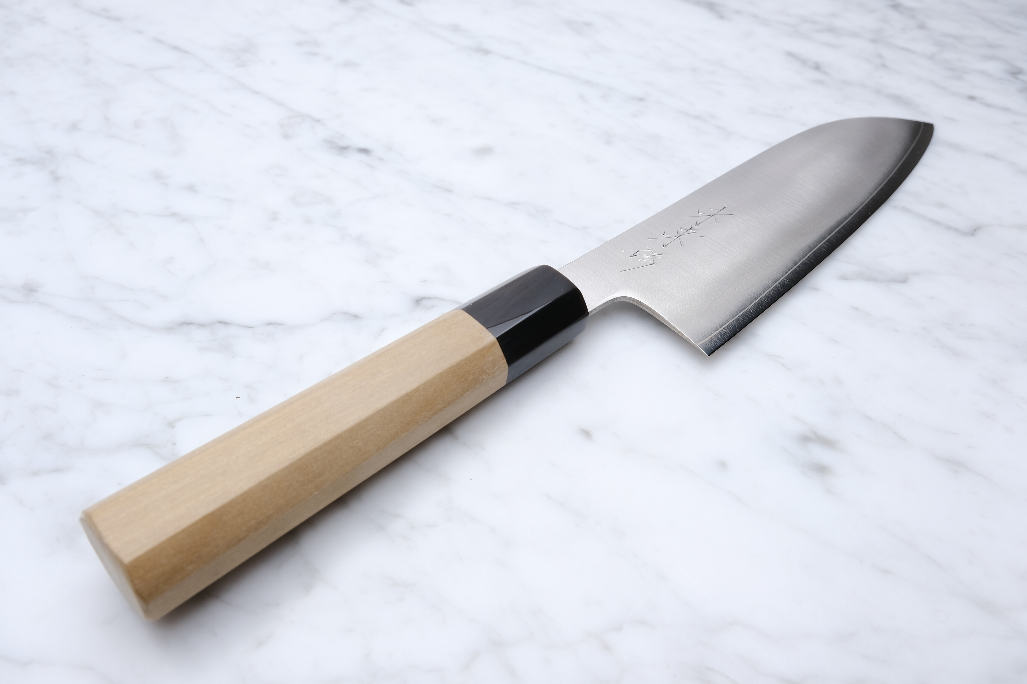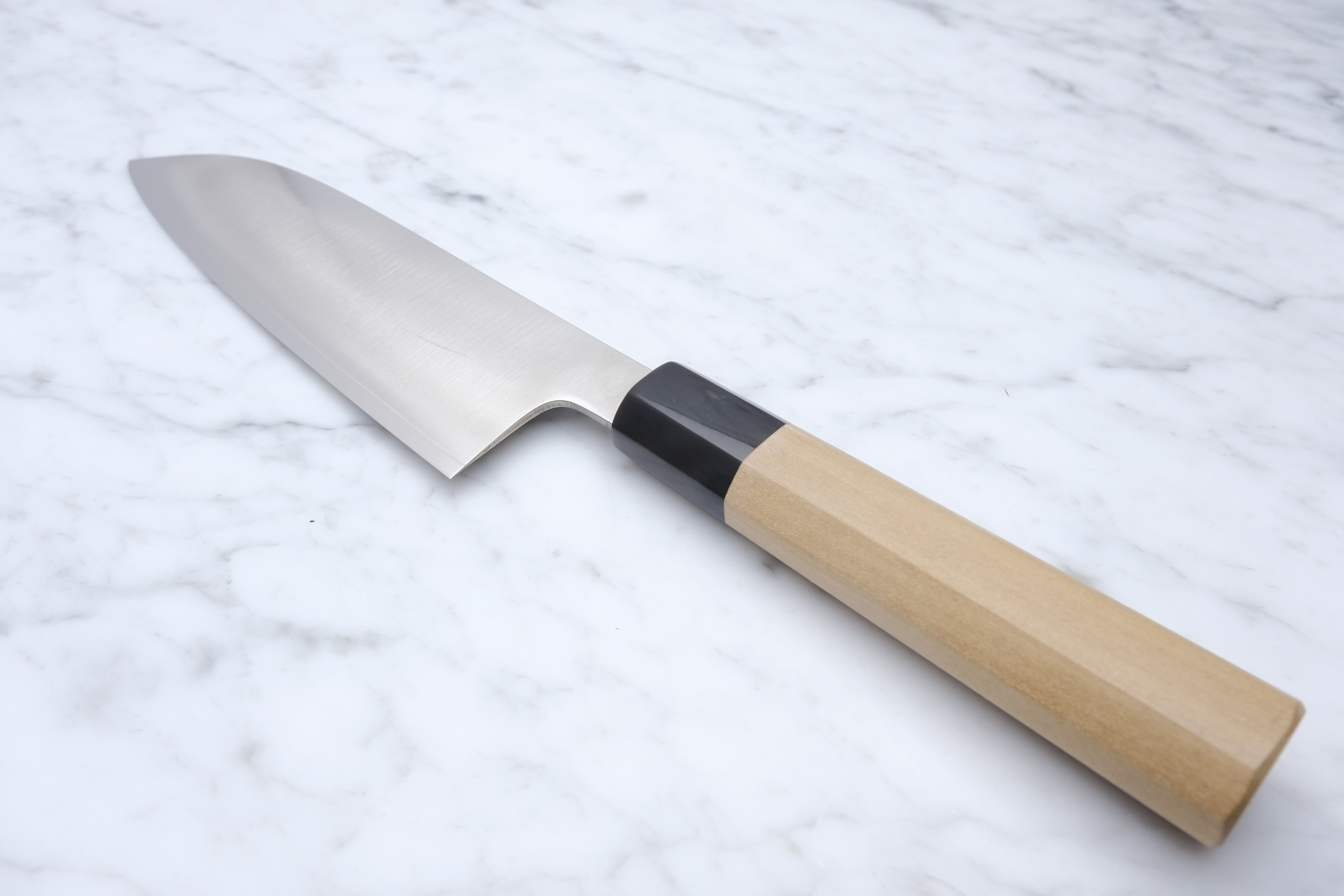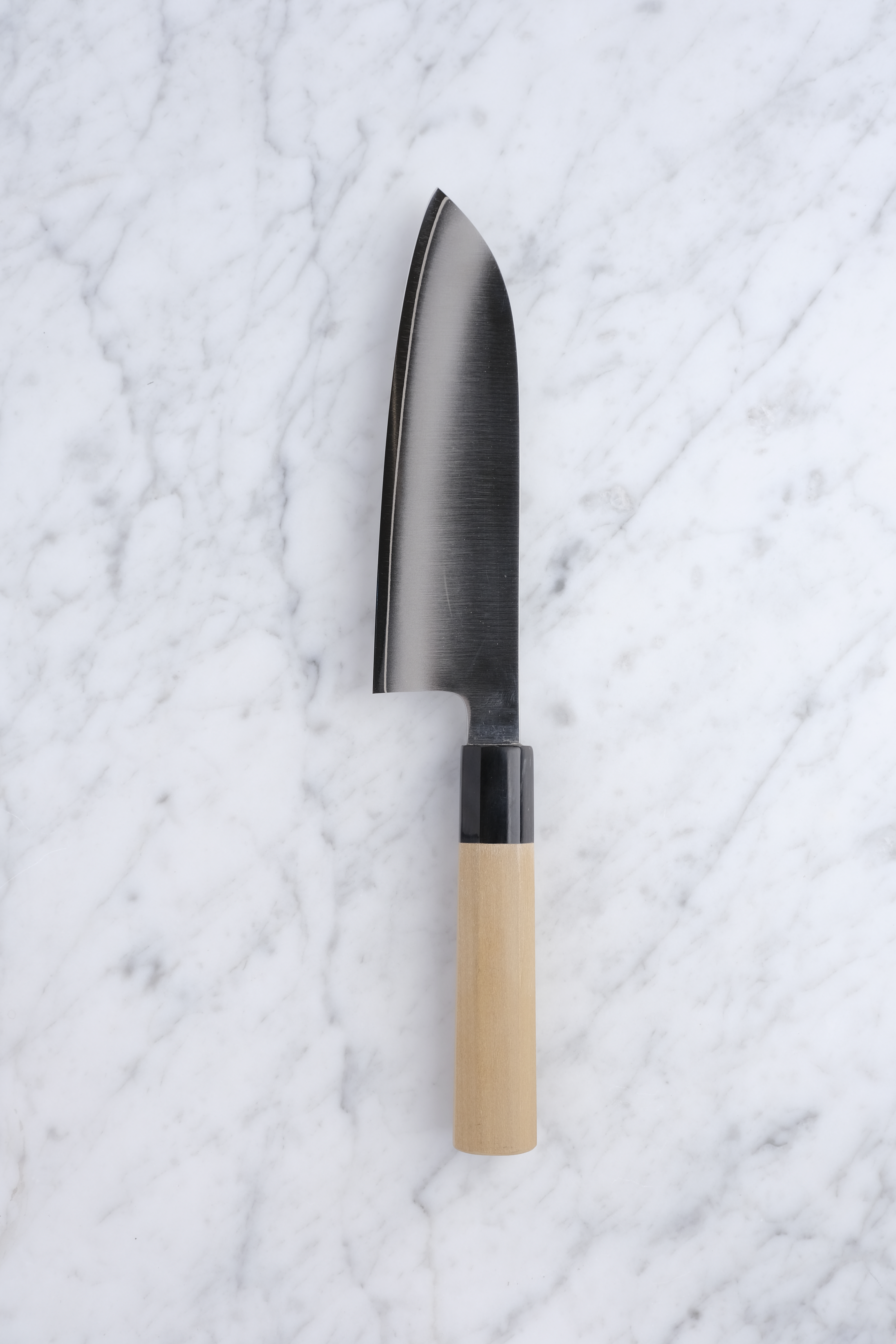 Das Messer hier ist ein 17 cm Santoku. Es kann als kleineres Kochmesser betrachtet werden und wird für die gleichen Aufgaben verwendet – also Fleisch und Gemüse hacken und in Scheiben schneiden.