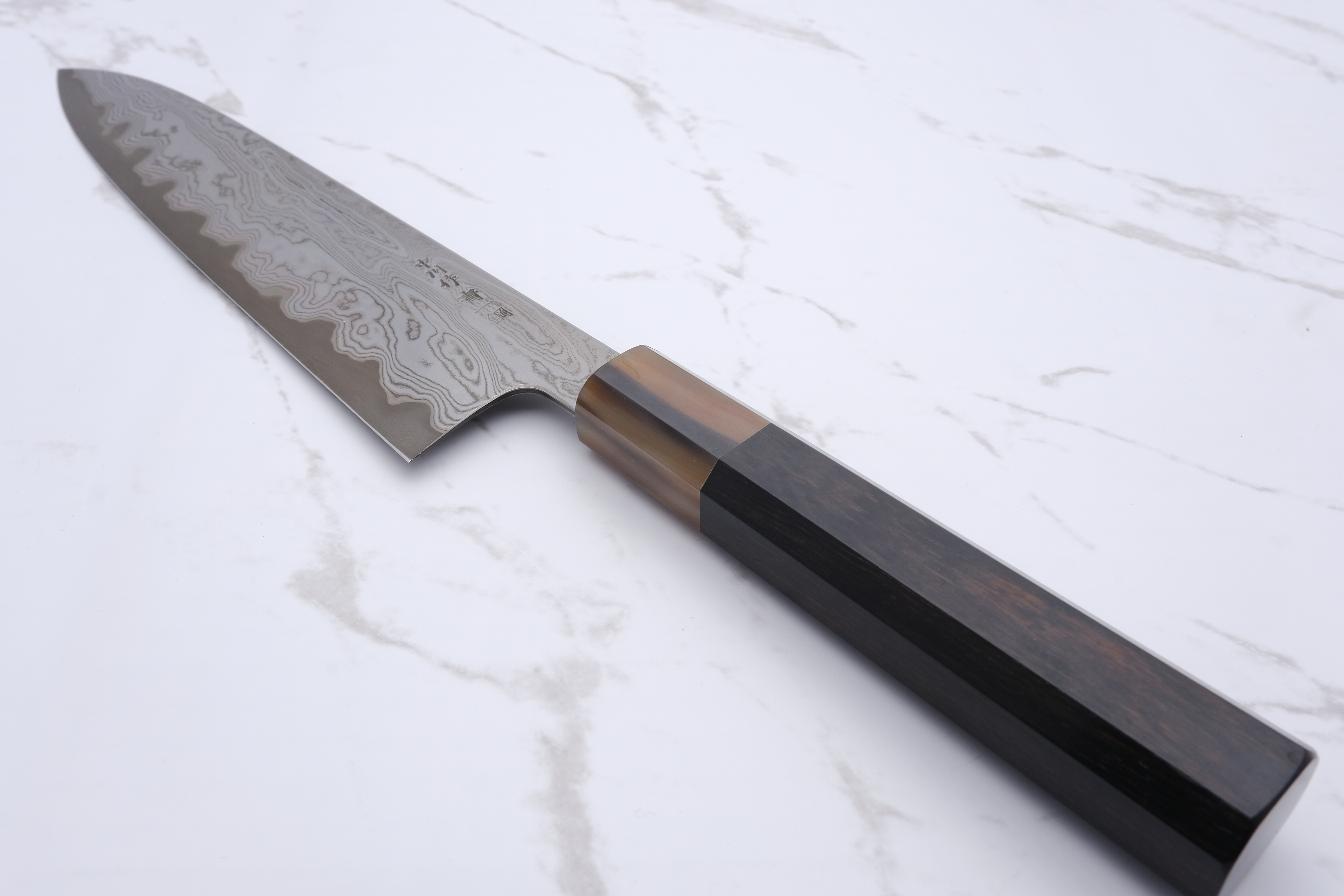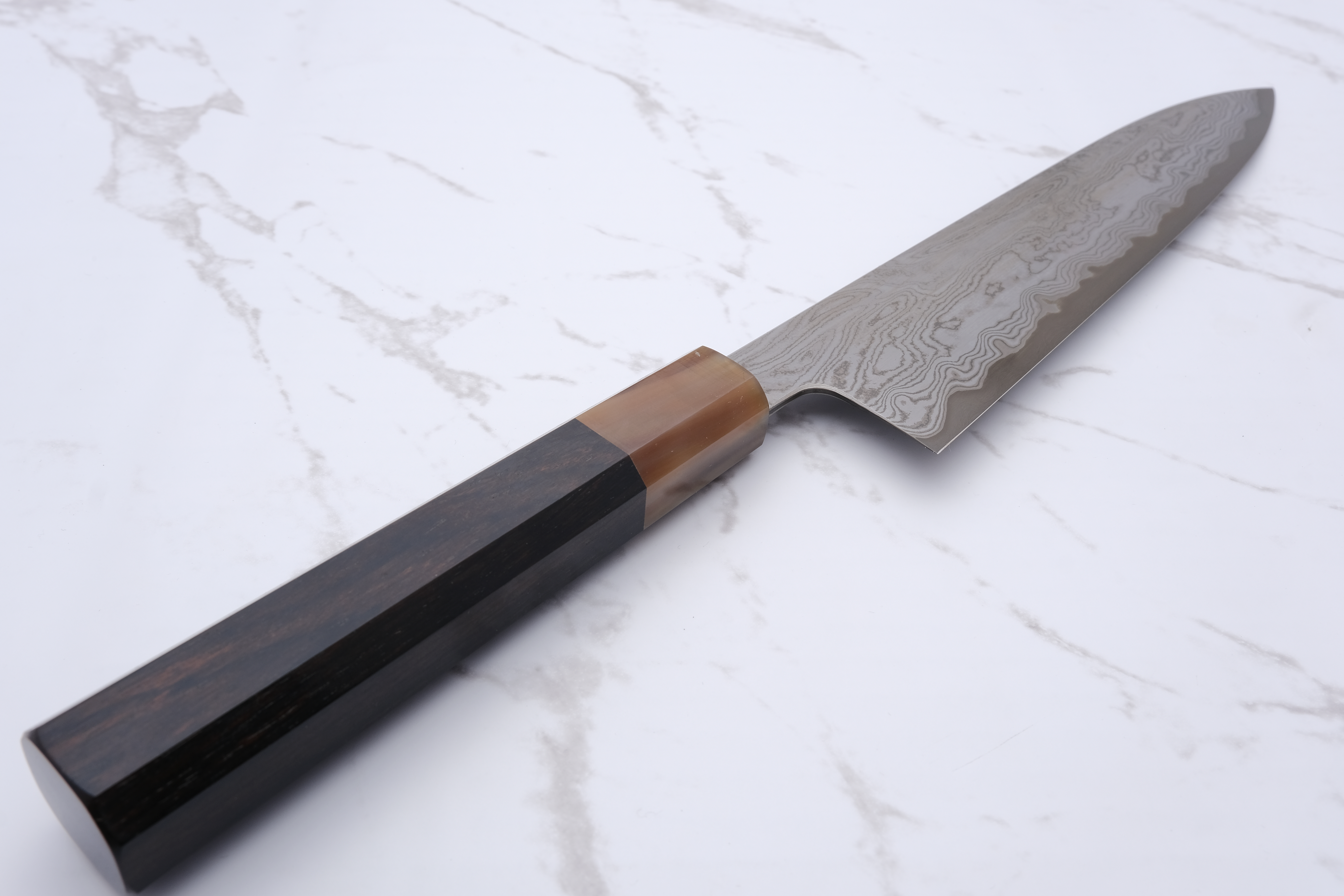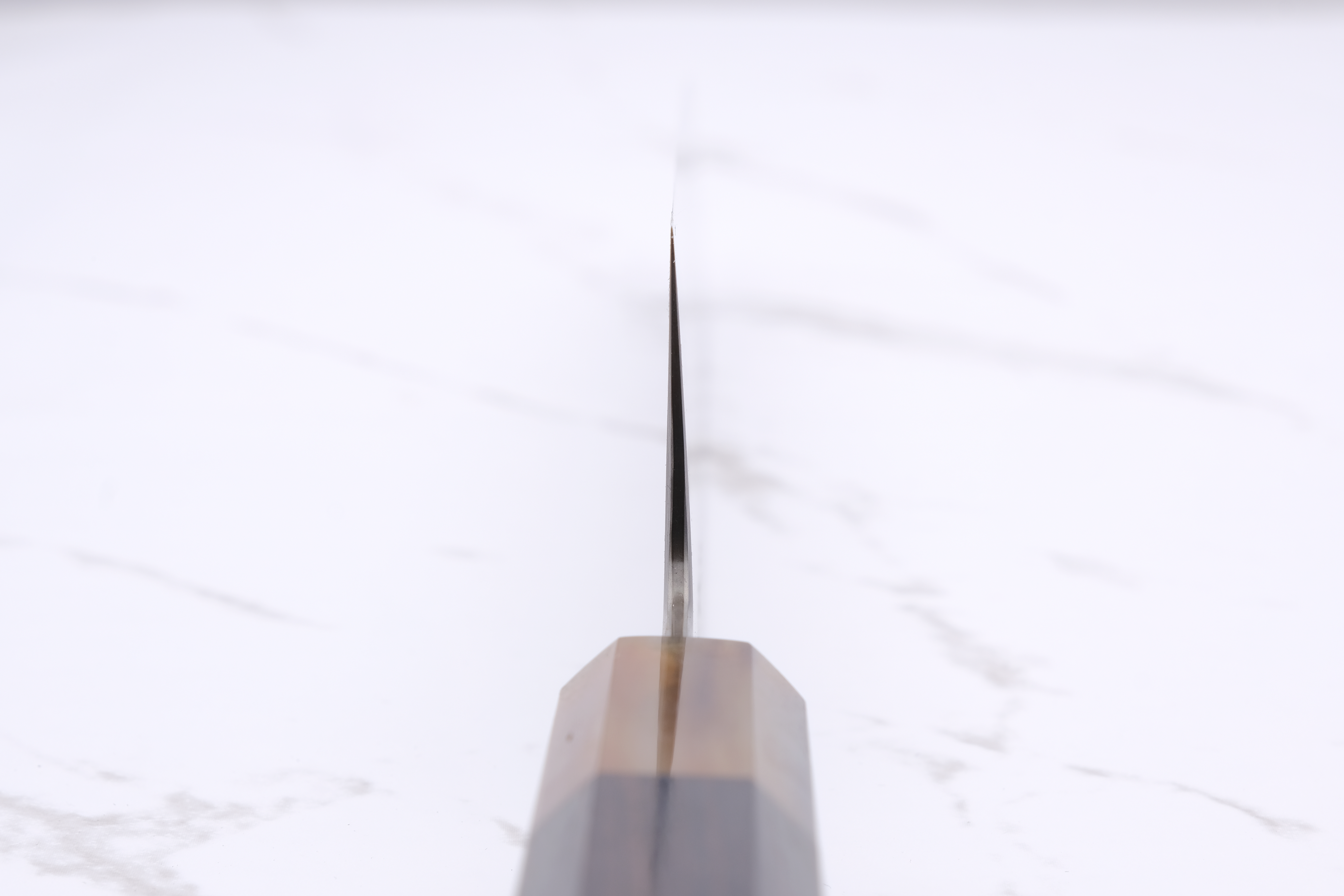 Hier gibt es Leckereien für viel Geld. Dieses Messer ist eine Zusammenarbeit zwischen Satoshi Nakagawa, der die Klinge mit Myojin Naohito als Schärfer schmiedete. Möglicherweise kennen Sie Myojin bereits von den mittlerweile seltenen Tetsujin-, MM- und Fujiyama-Messern von Konosuke, und hier stehen Qualität und Verarbeitung absolut im Vordergrund.