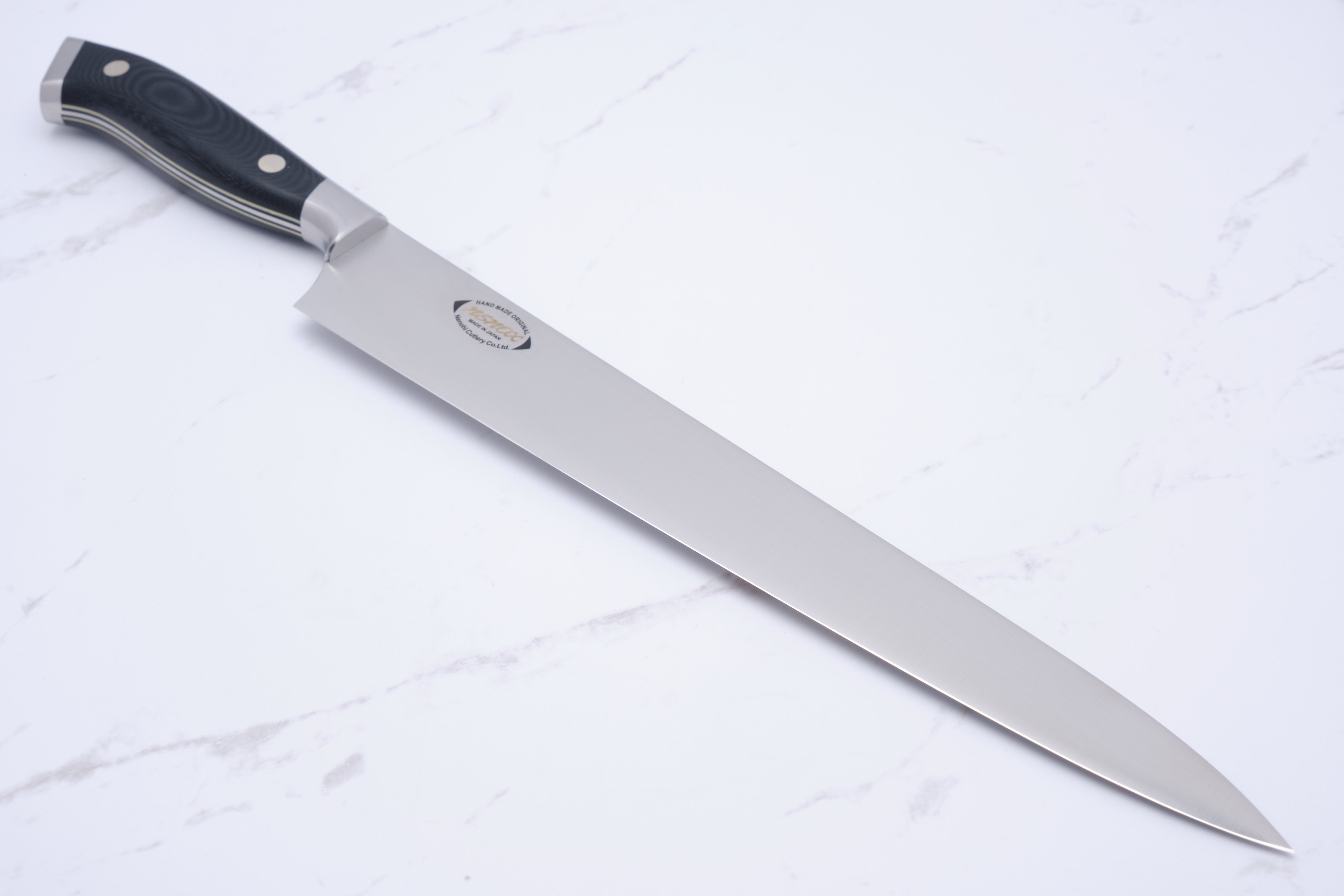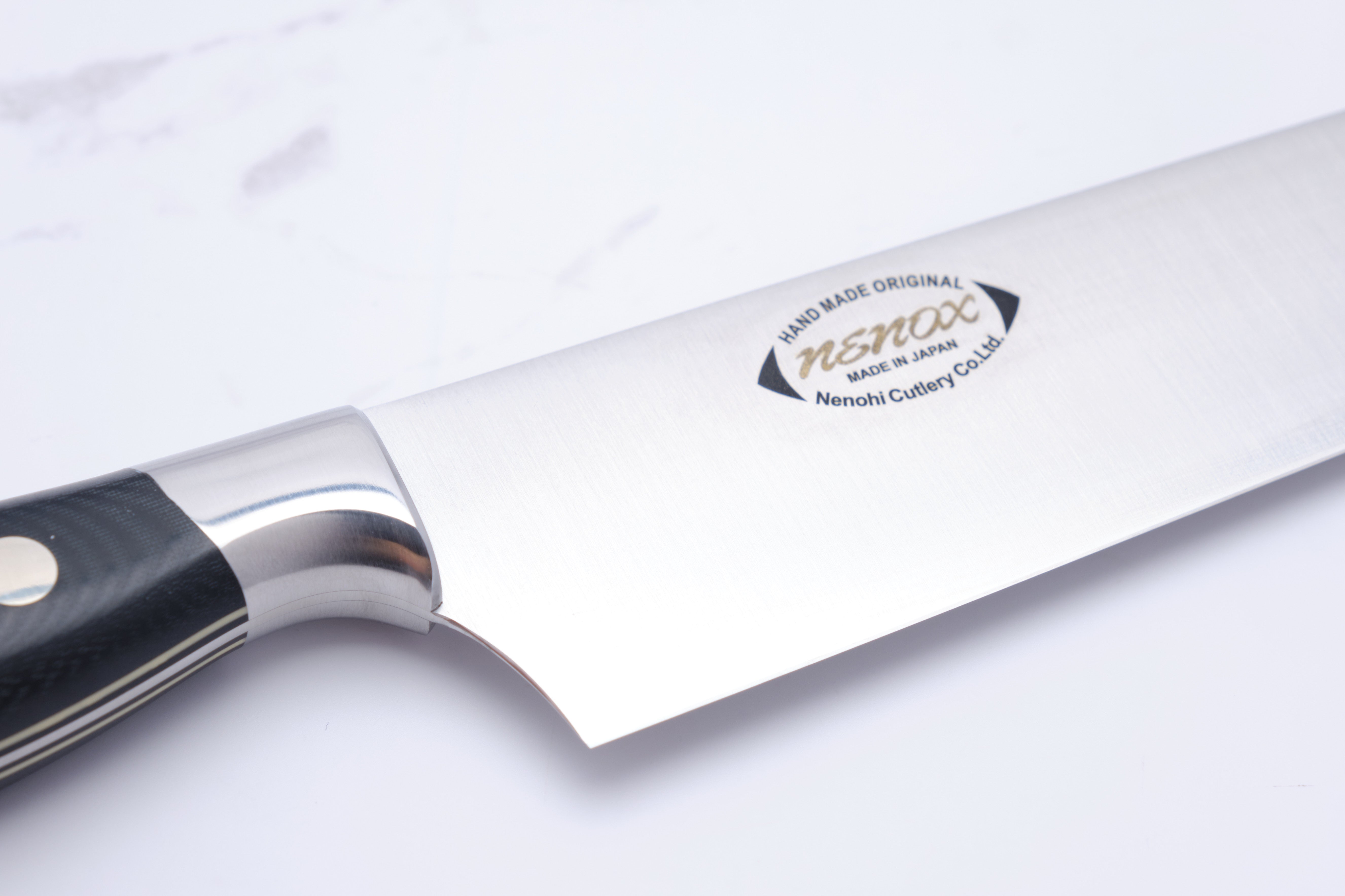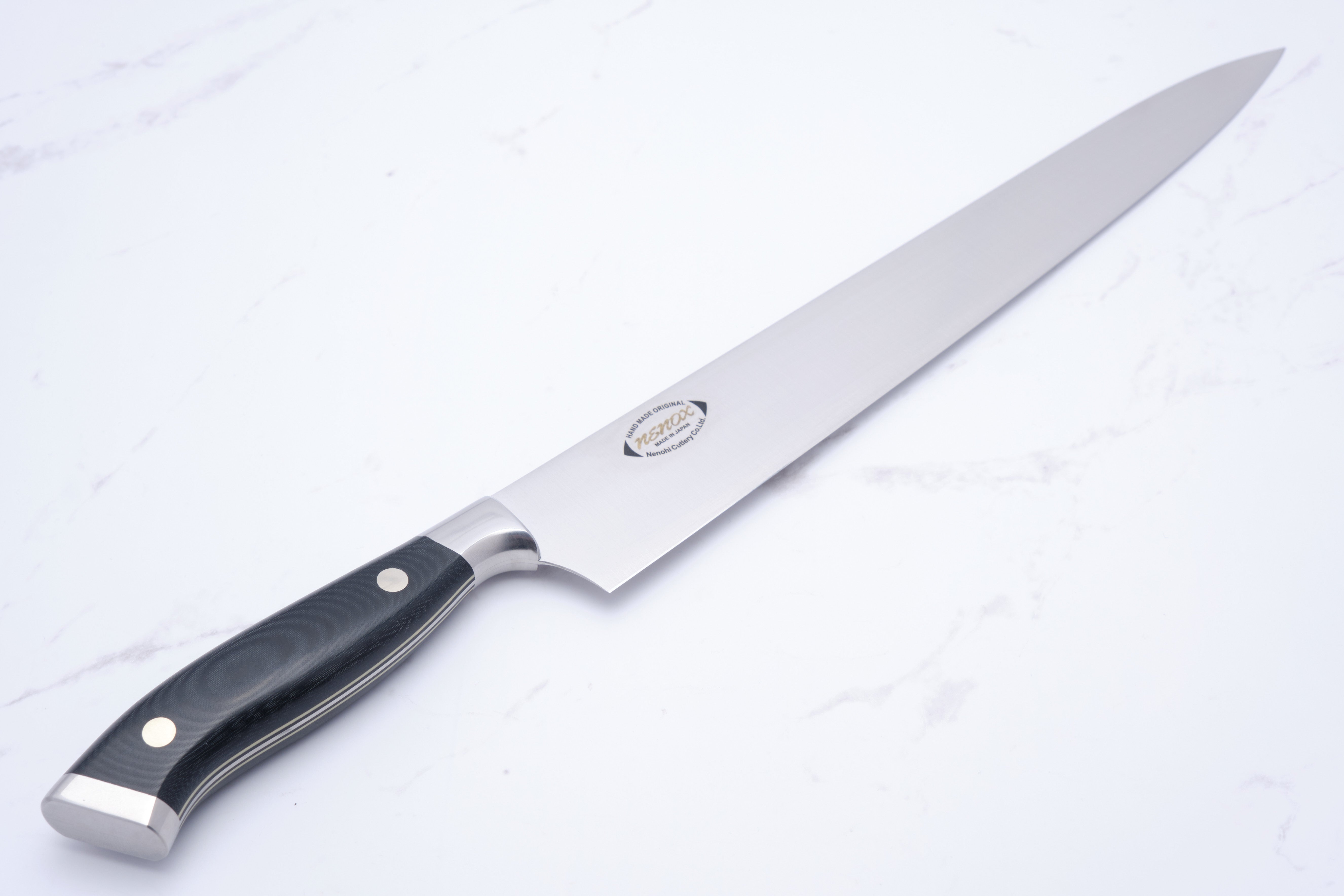 Zu den exklusivsten Messerherstellern der Welt zählt Nenox aus Tokio. Das Messer hier ist ein 285 mm großes Sujihiki im Westernstil mit einer tollen Schneide und einem wunderschönen schwarzen Micarta-Griff.