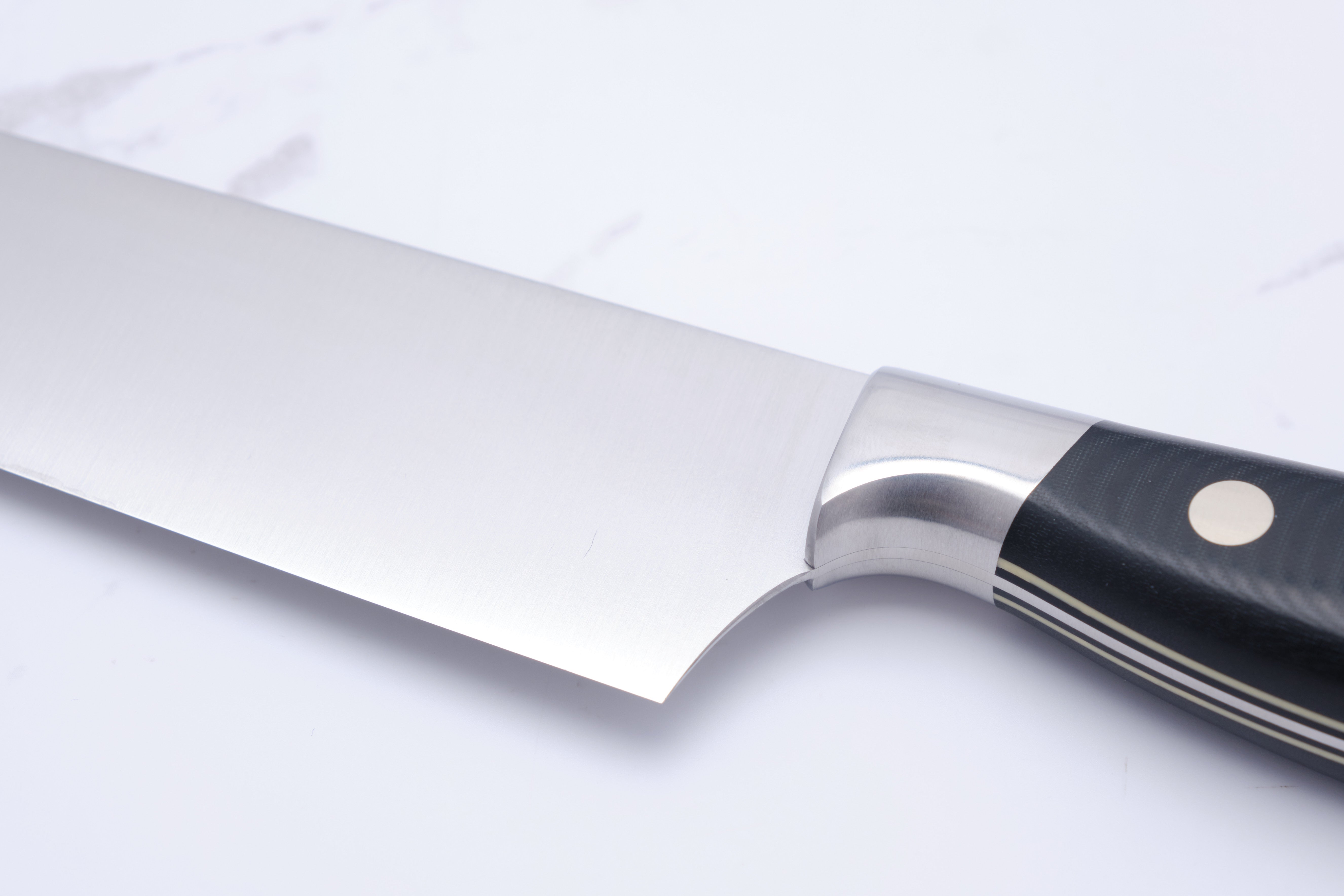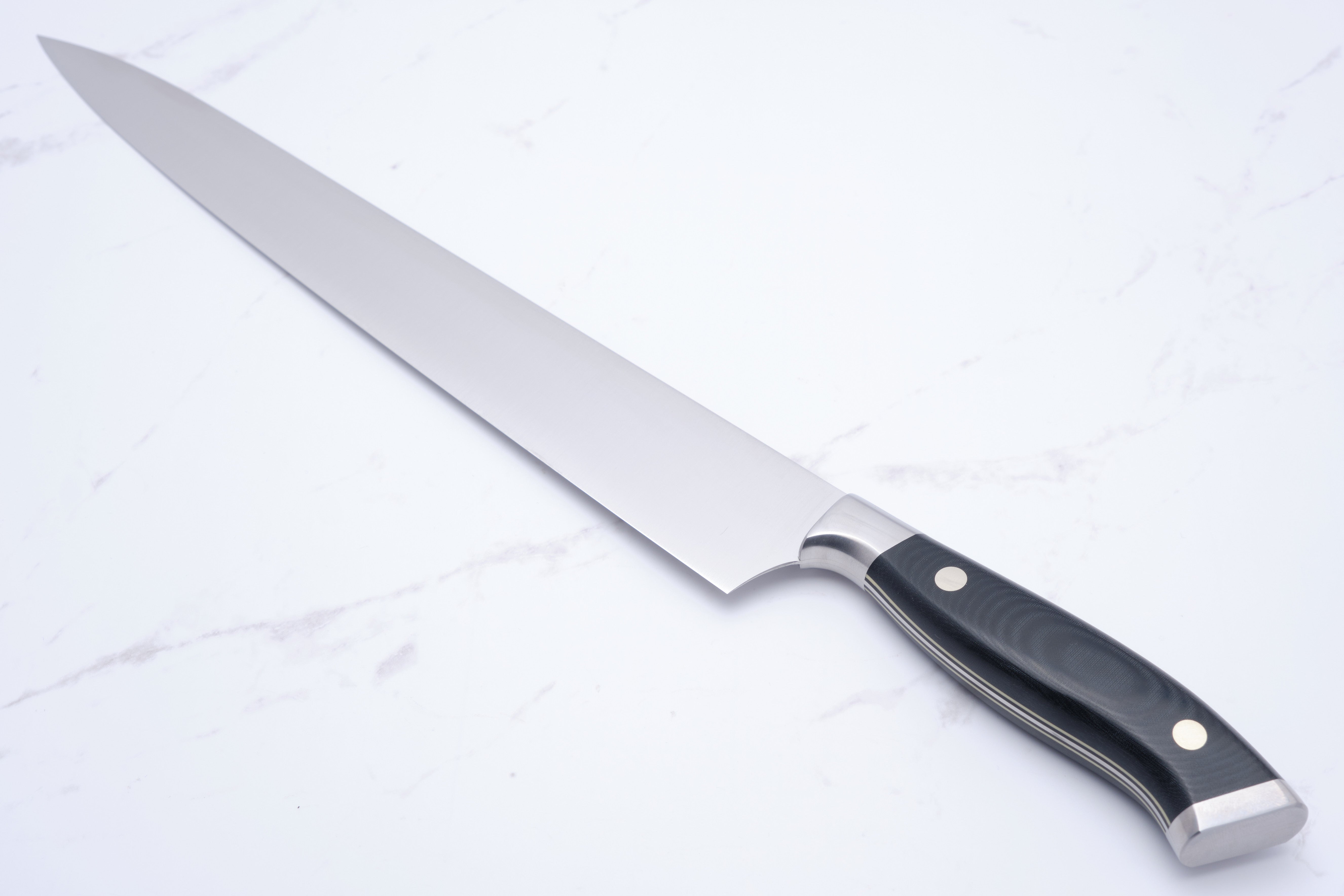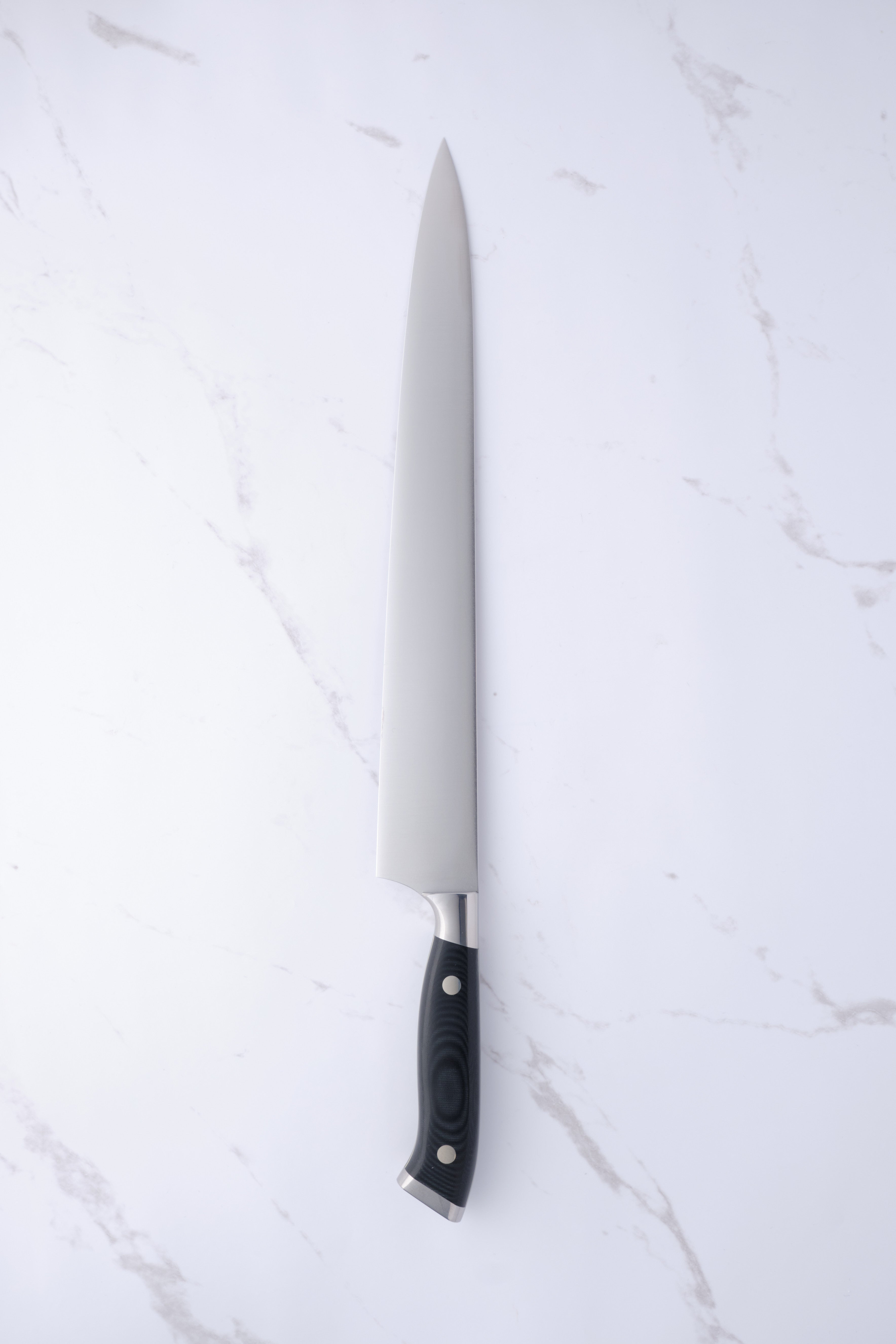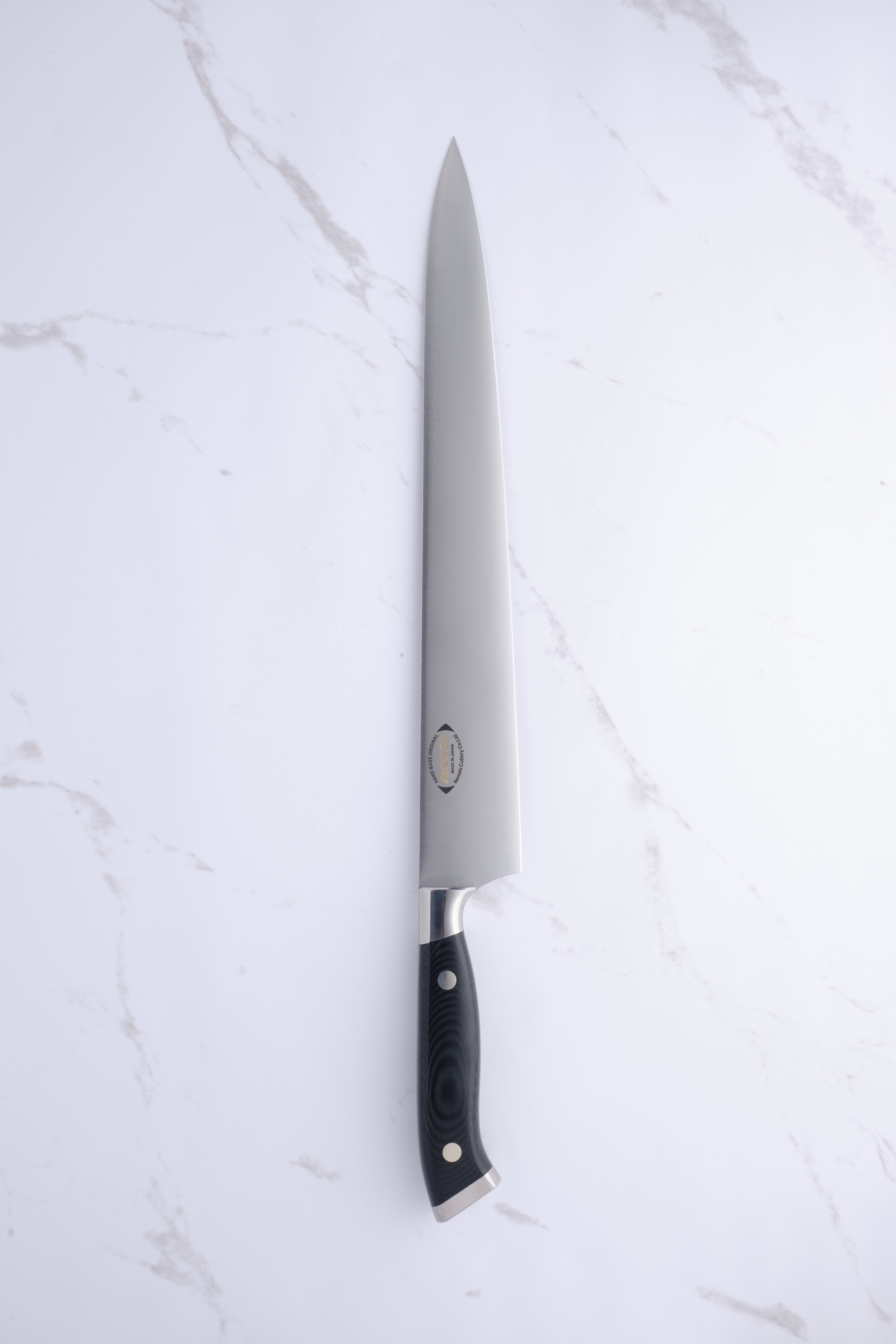 Zu den exklusivsten Messerherstellern der Welt zählt Nenox aus Tokio. Das Messer hier ist ein 285 mm großes Sujihiki im Westernstil mit einer tollen Schneide und einem wunderschönen schwarzen Micarta-Griff.