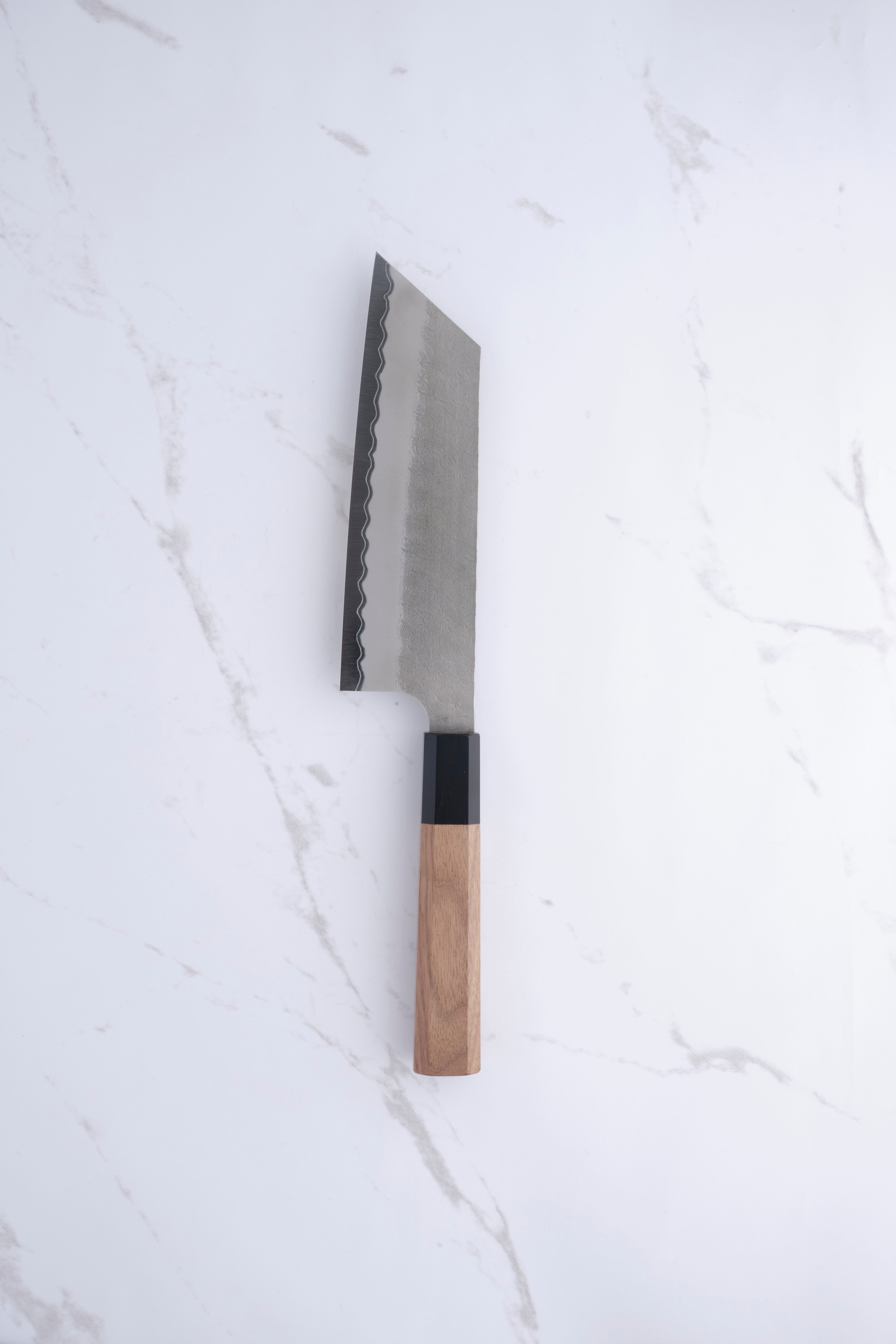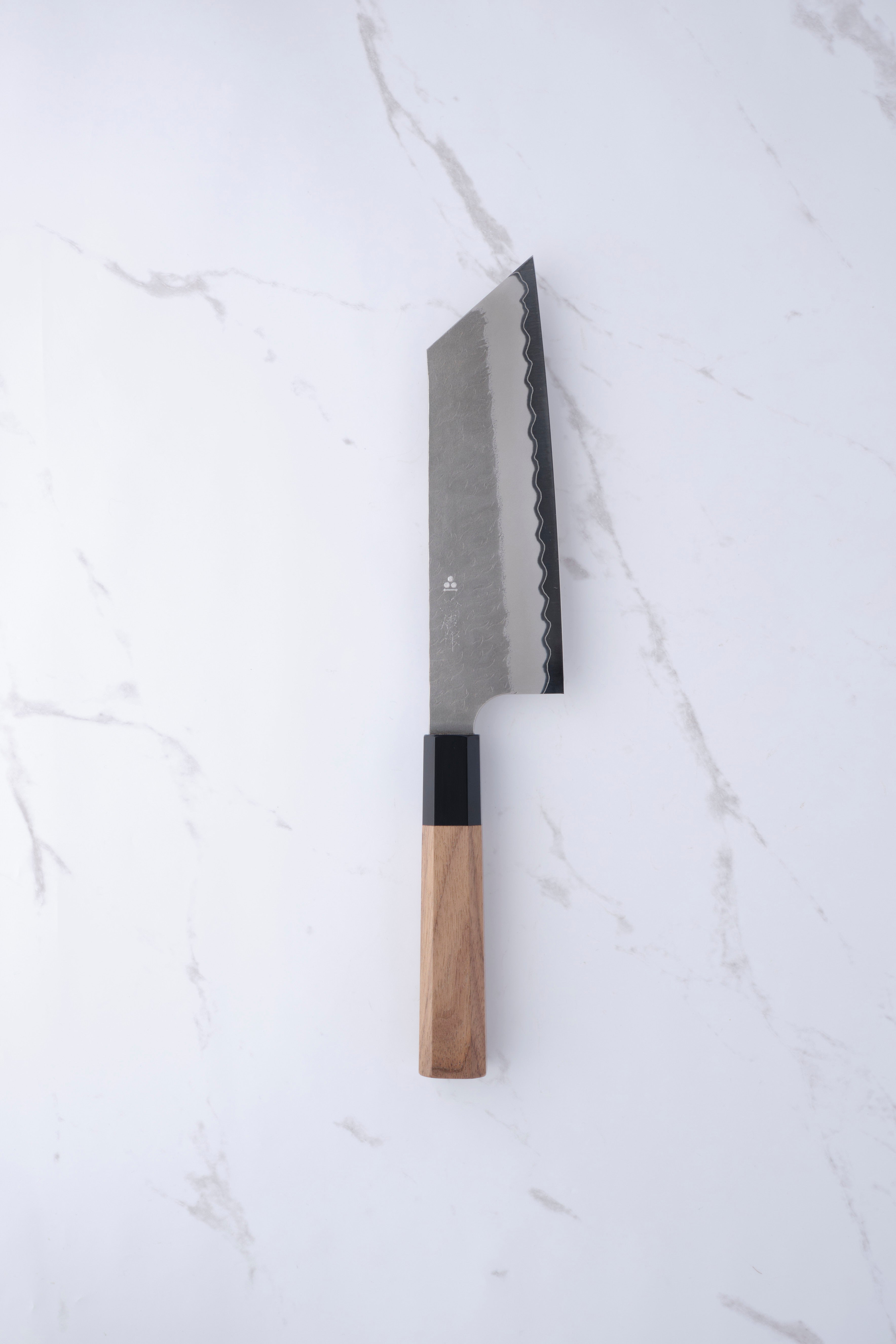 Nigara Hamono, eine renommierte Schmiede aus der japanischen Region Aomori, präsentiert stolz das K-Tip Nakiri 180 mm, ein Messer, das traditionelle Handwerkskunst mit moderner Innovation verbindet. Meisterschmied Go Yoshizawa ist bekannt für seine Fähigkeit, neue Techniken zu erforschen und Messer zu schaffen, die nicht nur funktional, sondern auch Kunstwerke sind. Dieses Nakiri ist aus Aogami Super (Blau-Super)-Stahl gefertigt und auf eine beeindruckende Härte von 63–64 HRC gehärtet, was für unübertroffene Schärfe und Haltbarkeit sorgt.