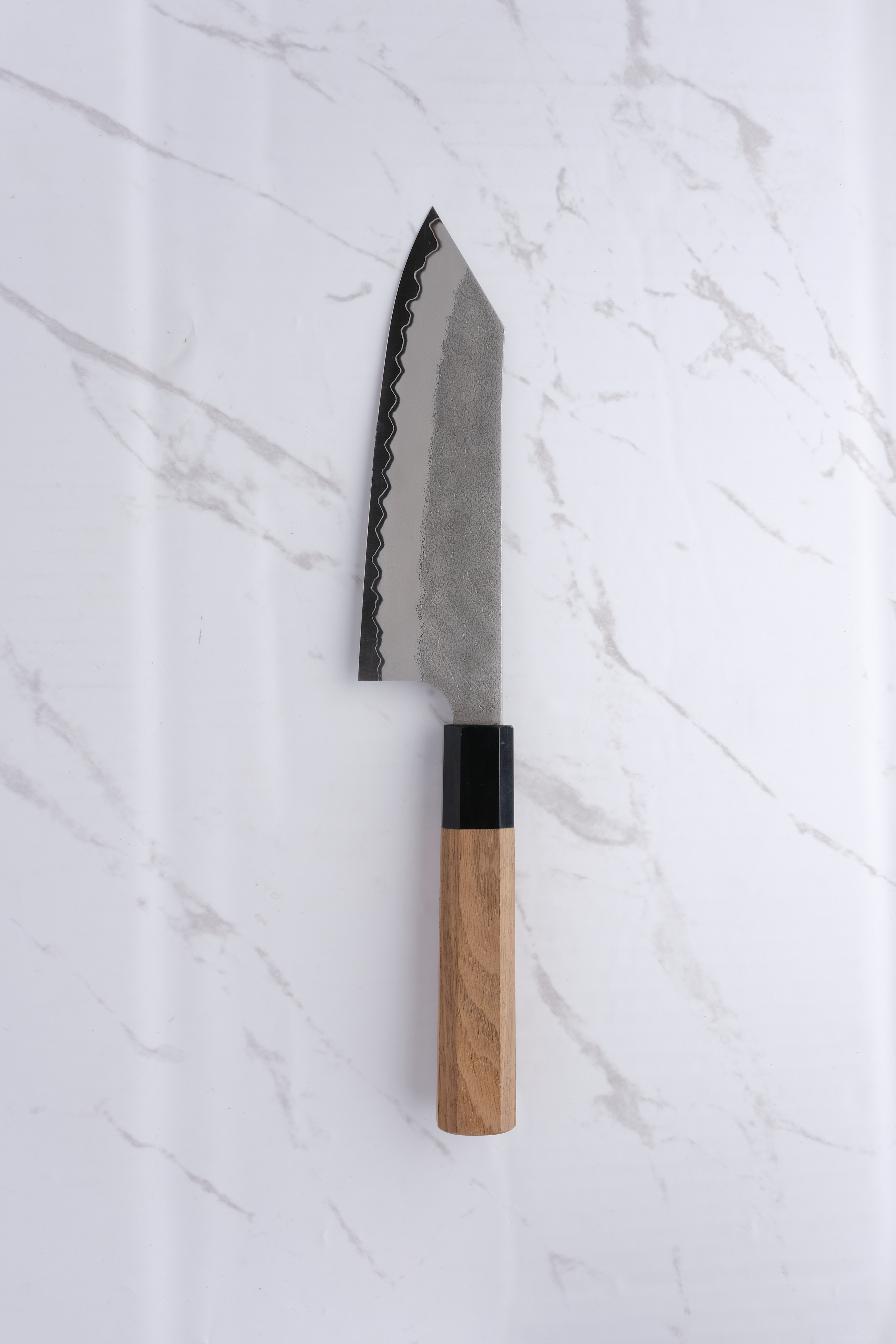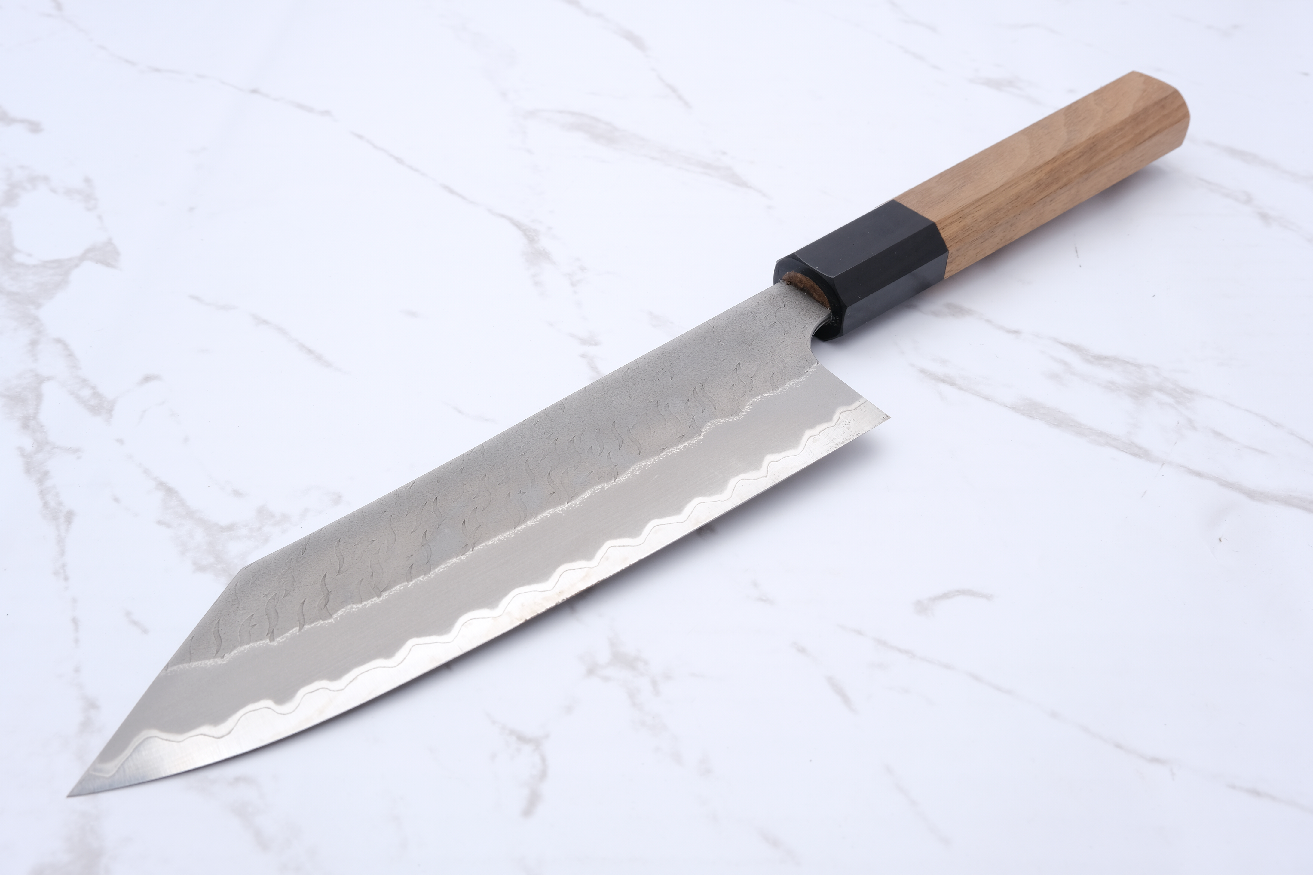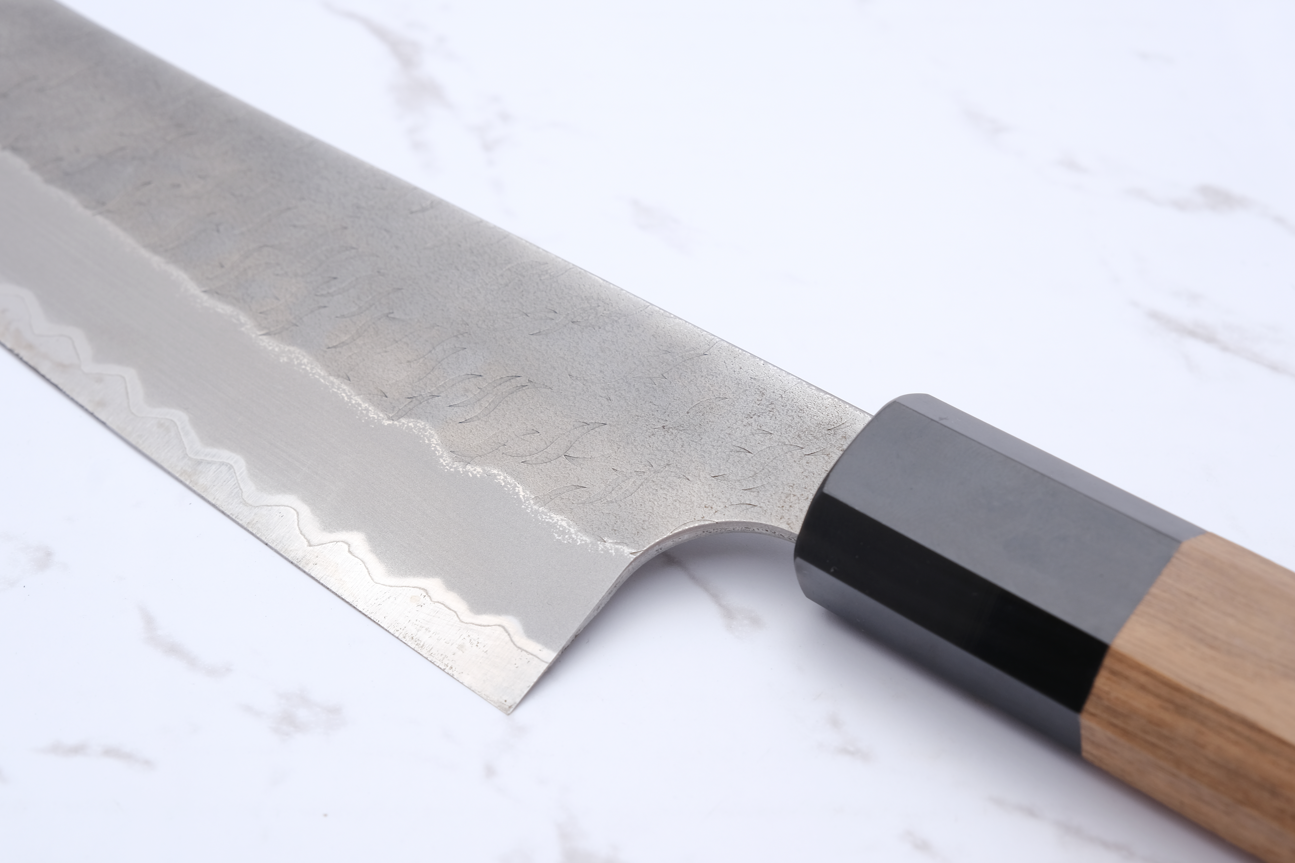 Das Design ist sowohl funktional als auch ästhetisch ansprechend, mit einem dunklen Migaki-Finish und einer markanten Tsuchime-Textur, die einen schönen Kontrast zum glatten Kasumi-Finish an der Schneide bildet. Dieses Messer ist ideal für Profiköche und Feinschmecker, die ihr Küchenerlebnis verbessern möchten.