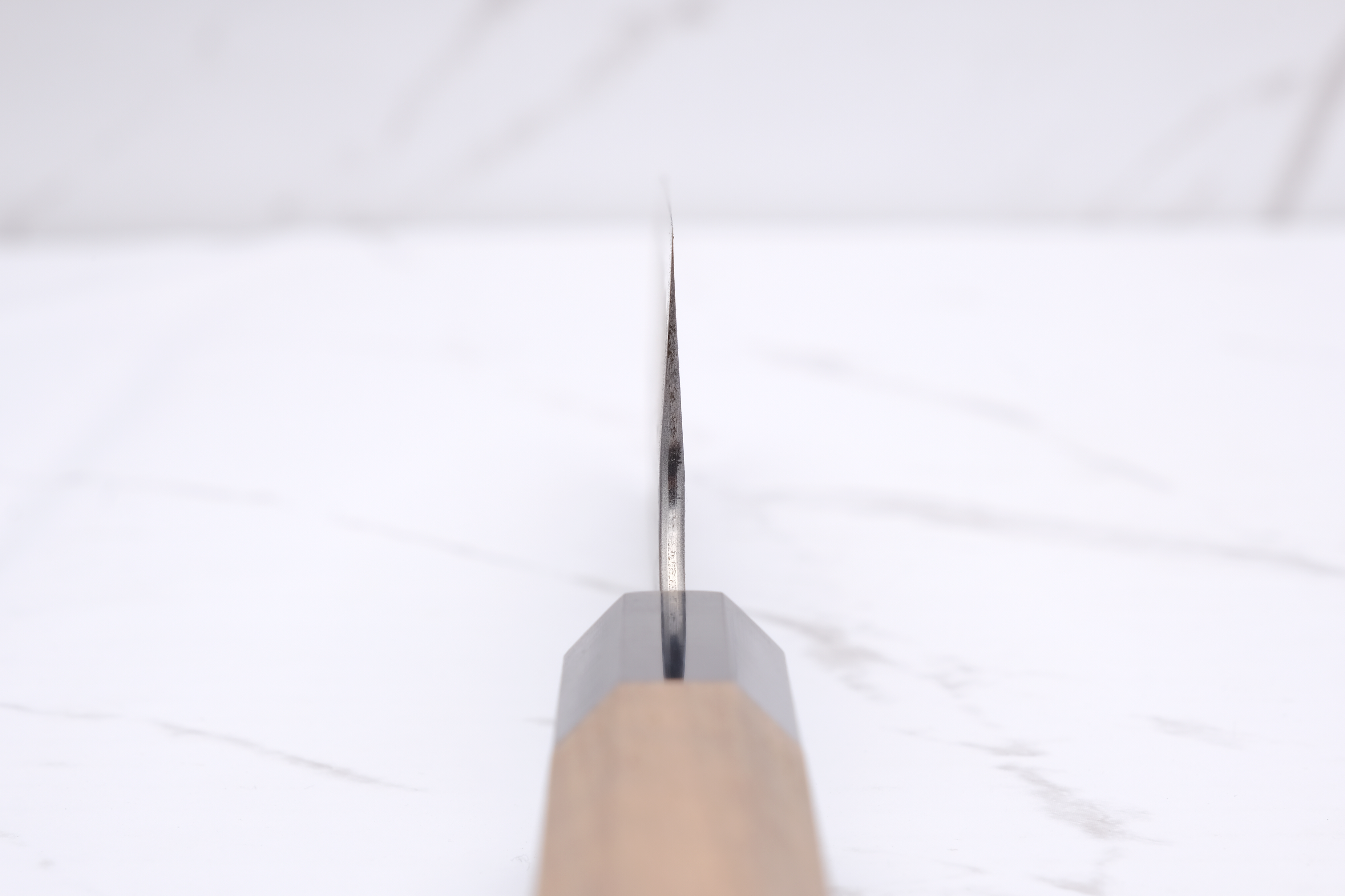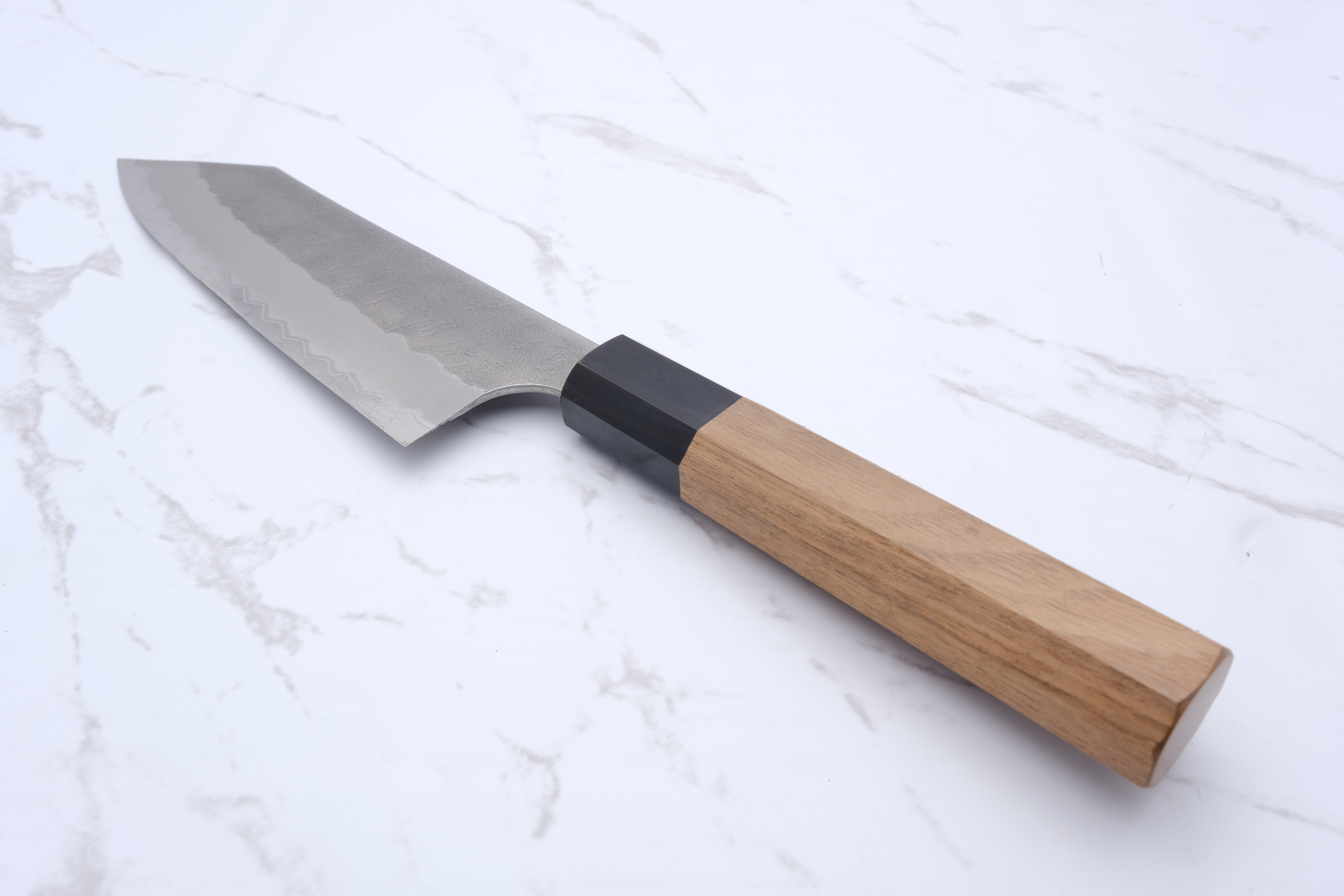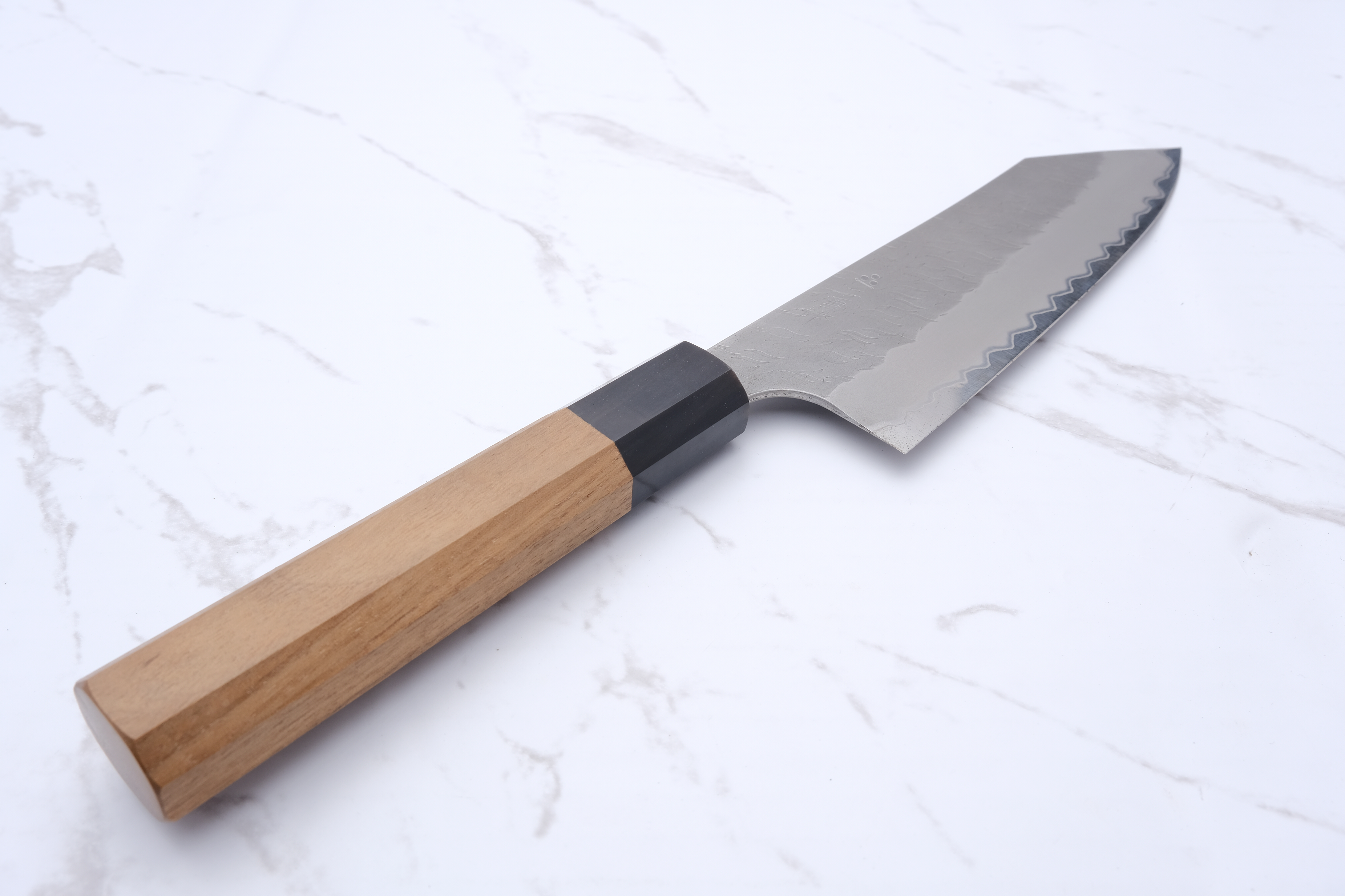 Das Design ist sowohl funktional als auch ästhetisch ansprechend, mit einem dunklen Migaki-Finish und einer markanten Tsuchime-Textur, die einen schönen Kontrast zum glatten Kasumi-Finish an der Schneide bildet. Dieses Messer ist ideal für Profiköche und Feinschmecker, die ihr Küchenerlebnis verbessern möchten.