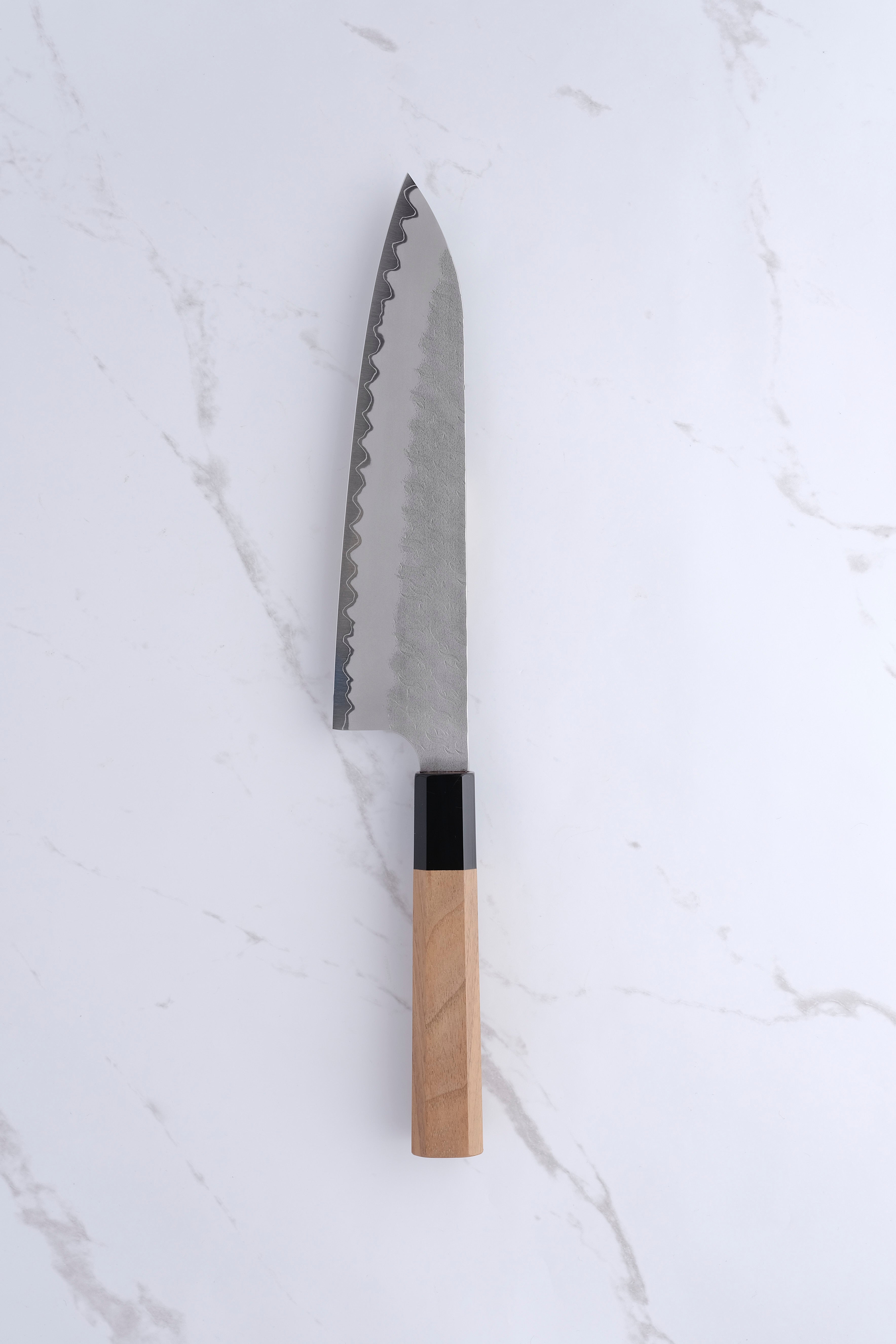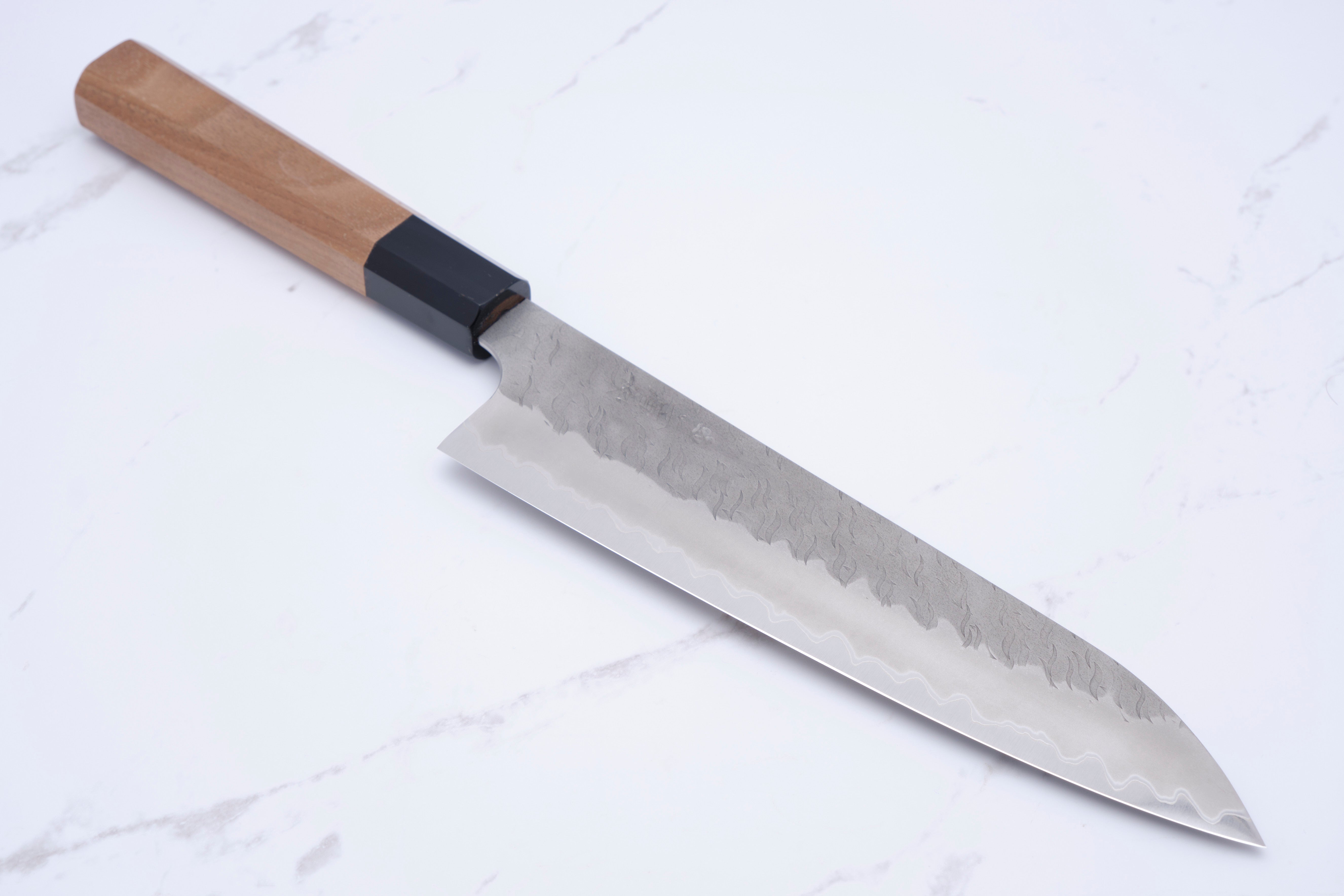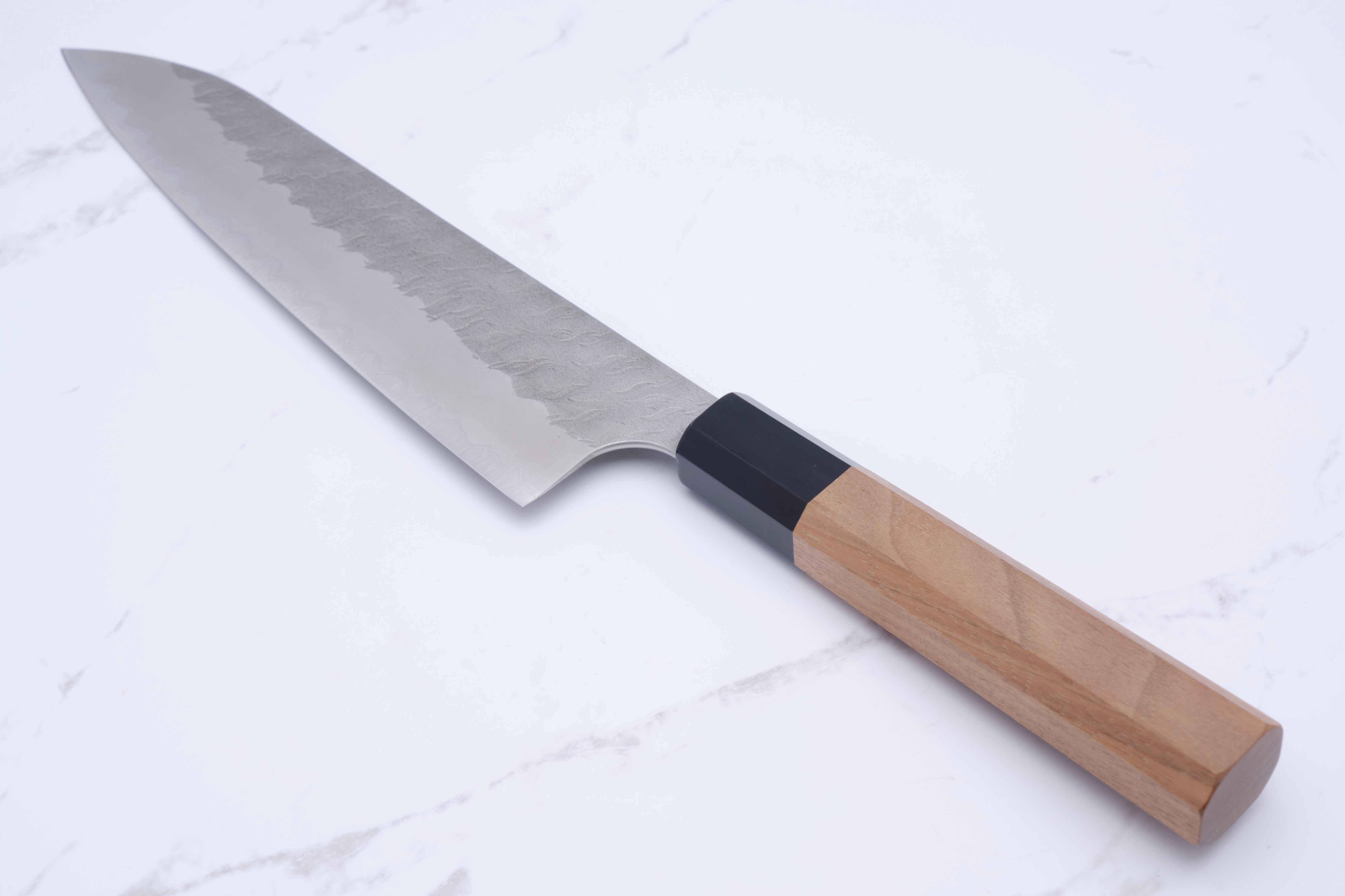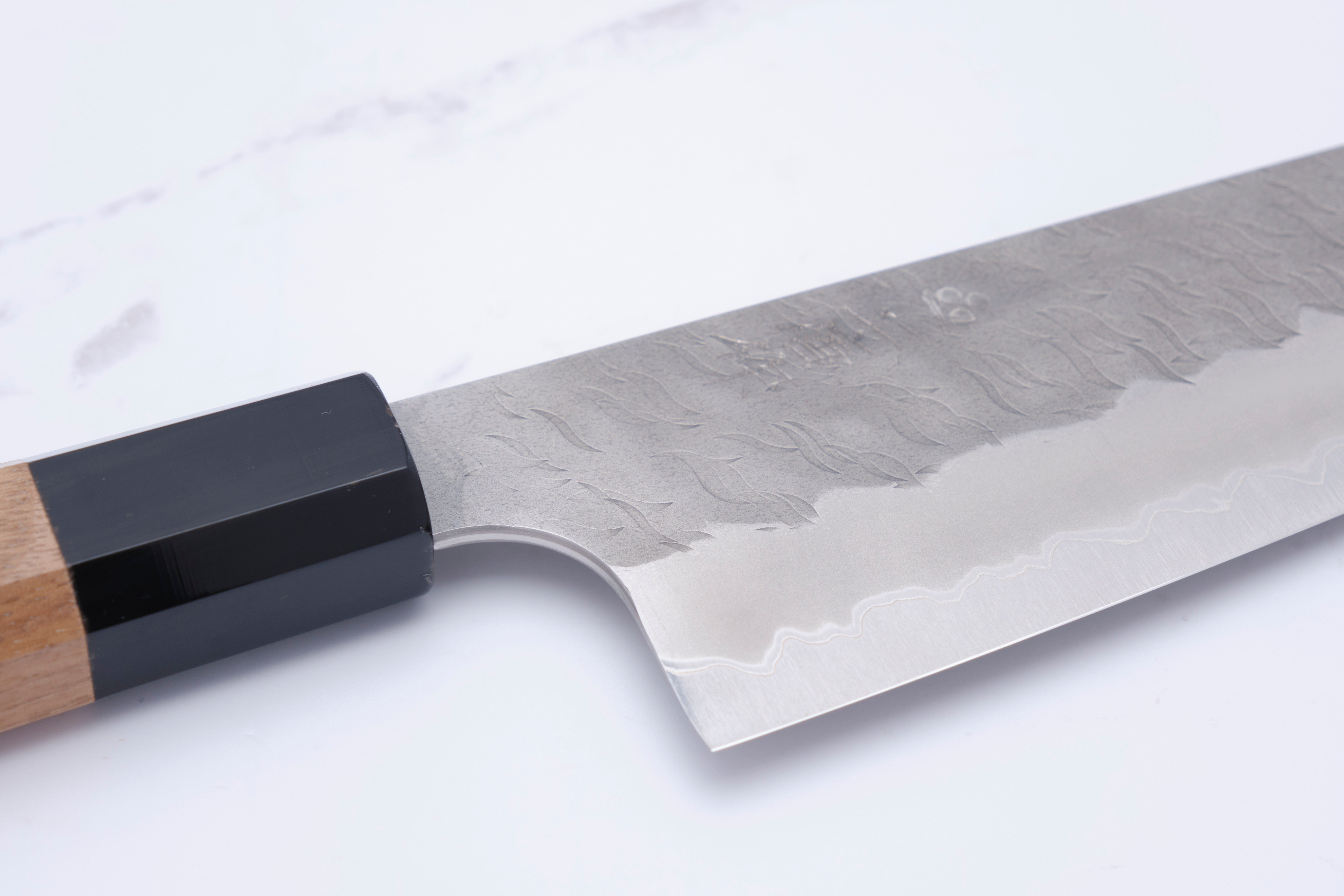 Diese Messer sind etwas „einfacher“ als die oben genannten. Sie bestehen aus Aogami Super (blaues Super) im Kern, der auf 63–64 HRC gehärtet ist und von einer rostfreien Ummantelung umgeben ist. Obwohl das Finish nicht so komplex ist wie bei einigen ihrer anderen Produkte, ist es dennoch auf jeden Fall etwas Besonderes. Sie sind mit einem relativ dunklen Migaki und einem sehr auffälligen Tsuchime an der Oberseite der Klinge versehen, das außerdem mit einem superschönen Kasumi übereinstimmt nach unten zum Ei.