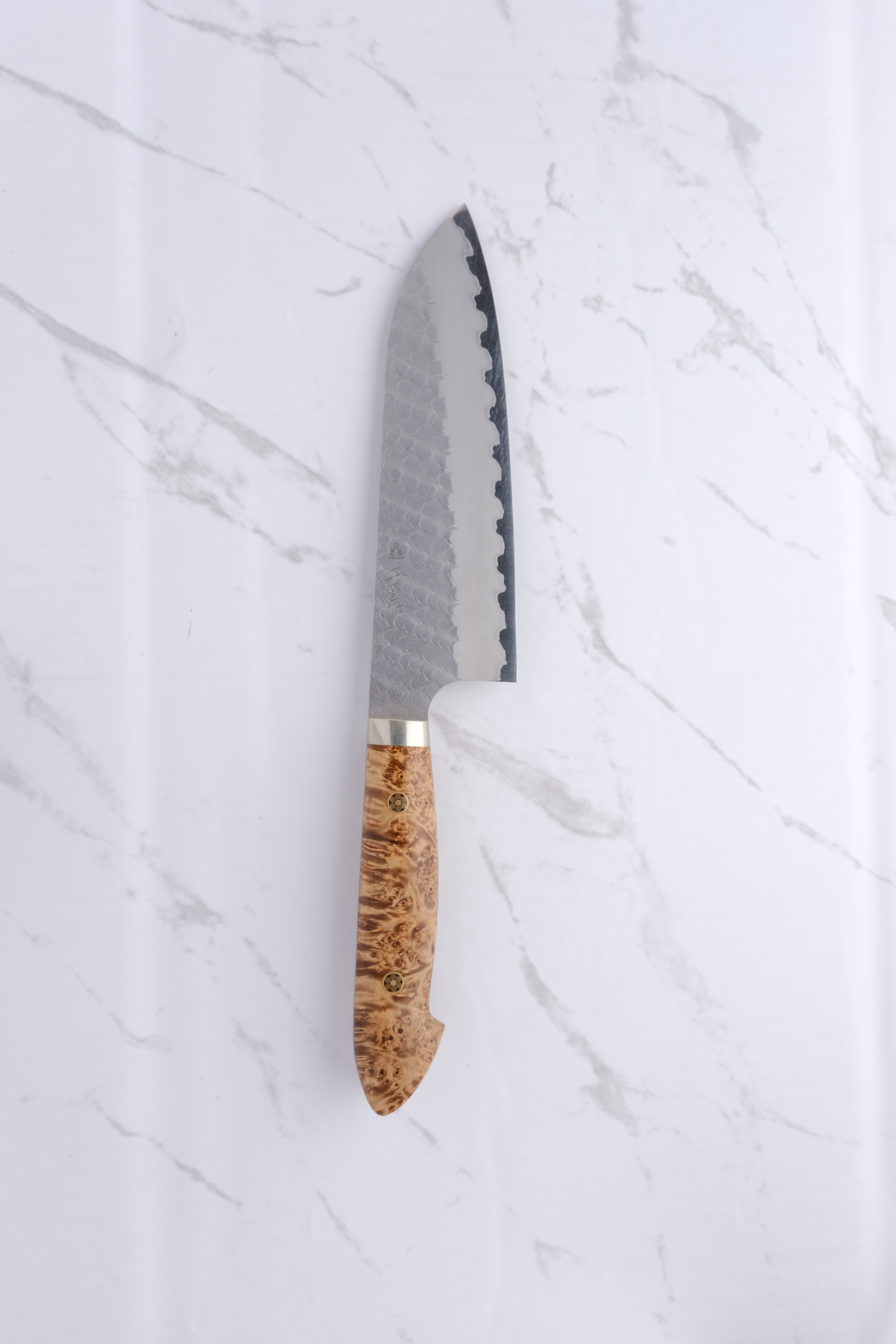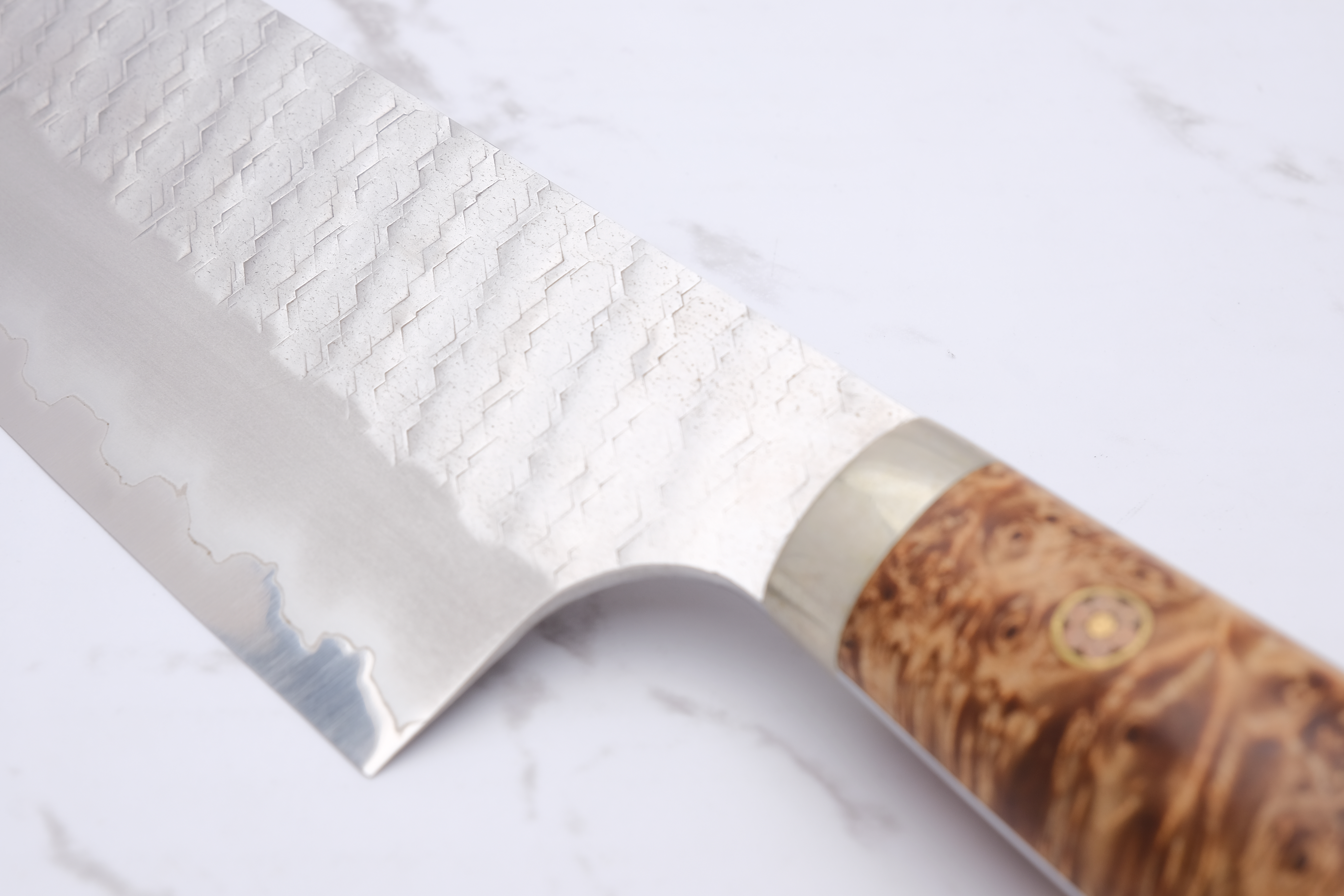 Das Nigara Hamono Santoku 180 mm SG2 – Western Maple ist ein hervorragendes Messer aus der renommierten Nigara Hamono Schmiede in Aomori, Japan. Meisterschmied Go Yoshizawa ist für seinen innovativen Ansatz in der Messerherstellung bekannt, und dieses Santokumesser ist ein perfektes Beispiel seiner Handwerkskunst. Mit einem Kern aus SG2-Stahl, gehärtet auf 63-64 HRC, bietet dieses Messer außergewöhnliche Schärfe und Haltbarkeit. Die Edelstahlummantelung sorgt dafür, dass das Messer rostbeständig bleibt, während das schöne Kurouchi-Finish und das auffällige Tsuchime für ein elegantes Erscheinungsbild sorgen. Ob Profikoch oder Feinschmecker, dieses Messer wird ein unverzichtbares Werkzeug in Ihrer Küche sein.