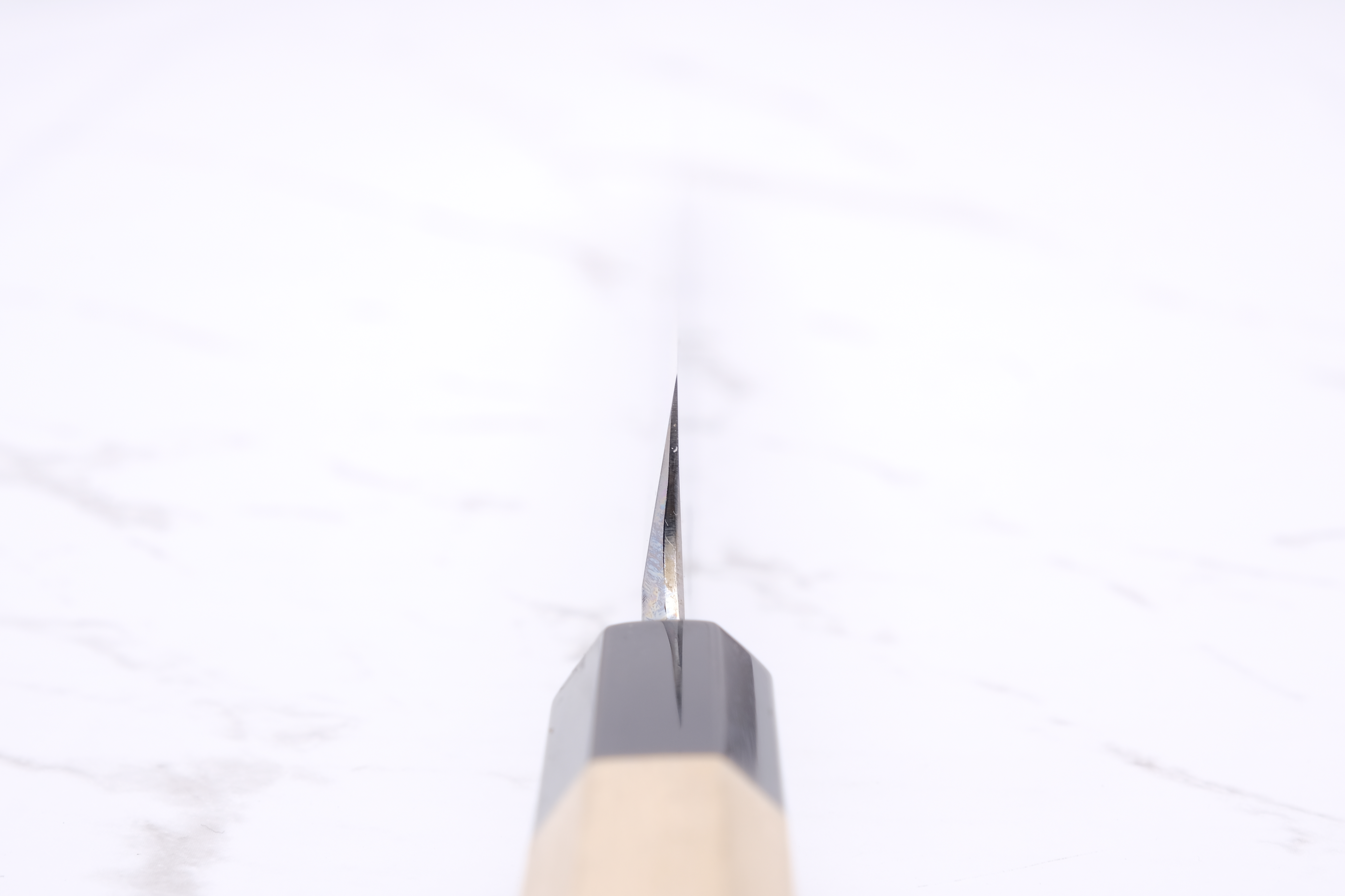 Sakai Kikumori ist seit 1926 für seine Expertise in der Messerherstellung bekannt, und ihr Choyo Blue #1 K-Tip Yanagiba ist ein leuchtendes Beispiel ihrer Handwerkskunst. Geschmiedet vom renommierten Yoshikazu Tanaka, bekannt für seine Fähigkeit, Stahl zu härten, wurde dieses Messer vom legendären Morihiro geschliffen, der der Klinge eine beeindruckende Hochglanzpolitur und einen unverwechselbaren Breitschliff verleiht. Mit einem Kern aus blauem #1-Stahl und einer Außenseite aus Weicheisen bietet dieses Messer die perfekte Balance aus Schärfe und Haltbarkeit und eignet sich ideal zum präzisen Schneiden von Fisch und anderen empfindlichen Zutaten.