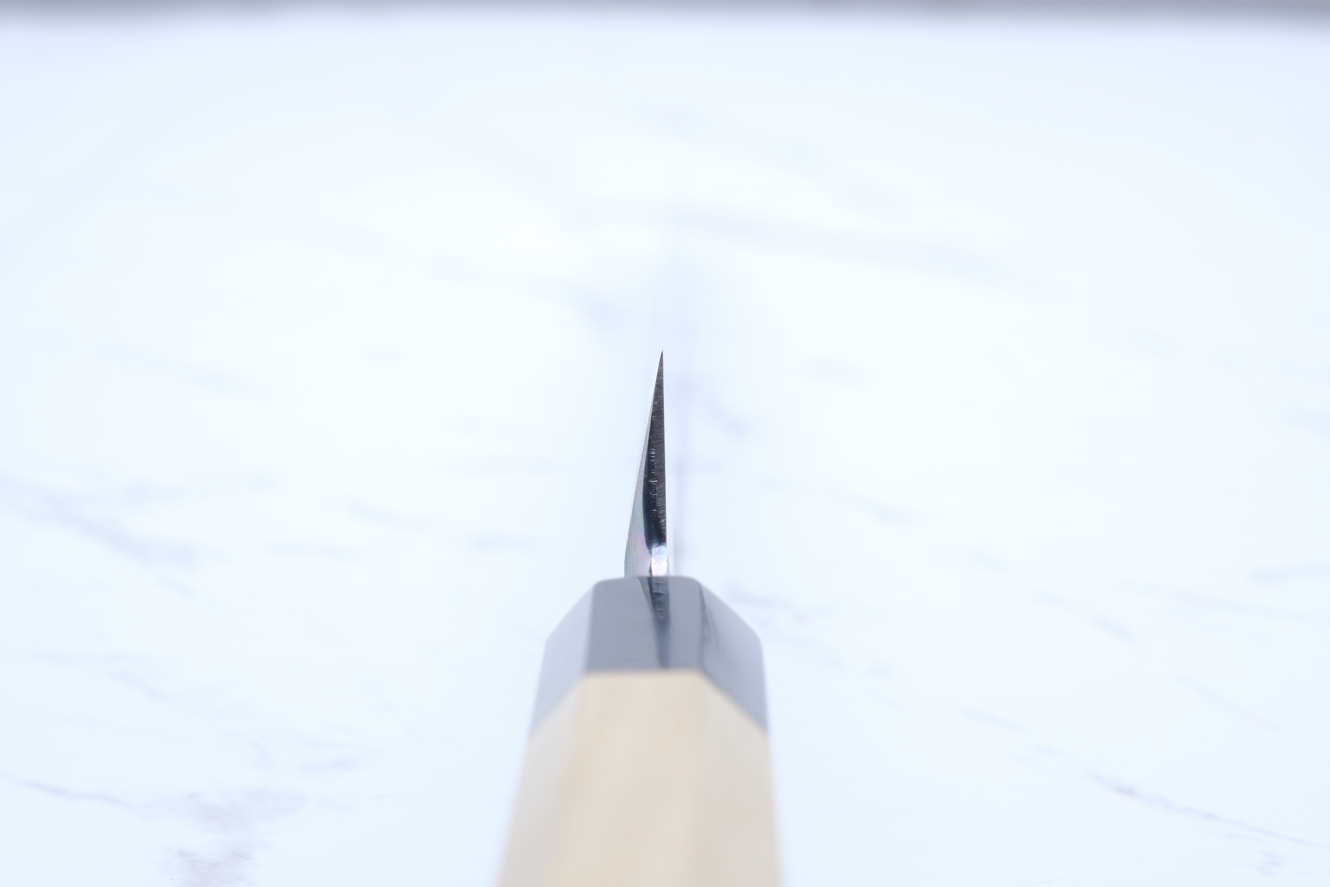 Das Messer wird vom legendären Yoshikazu Tanaka geschmiedet, der mit über 50 Jahren Erfahrung als einer der besten Schmiede in Sakai gilt. Tanaka arbeitet mit seinem Sohn in der Schmiede, wo er sich ausschließlich auf die Arbeit mit weißem und blauem Kohlenstoffstahl konzentriert, die er mit traditionellen Methoden wie Kiefernholzkohle und Reisstroh beim Härten perfektioniert.