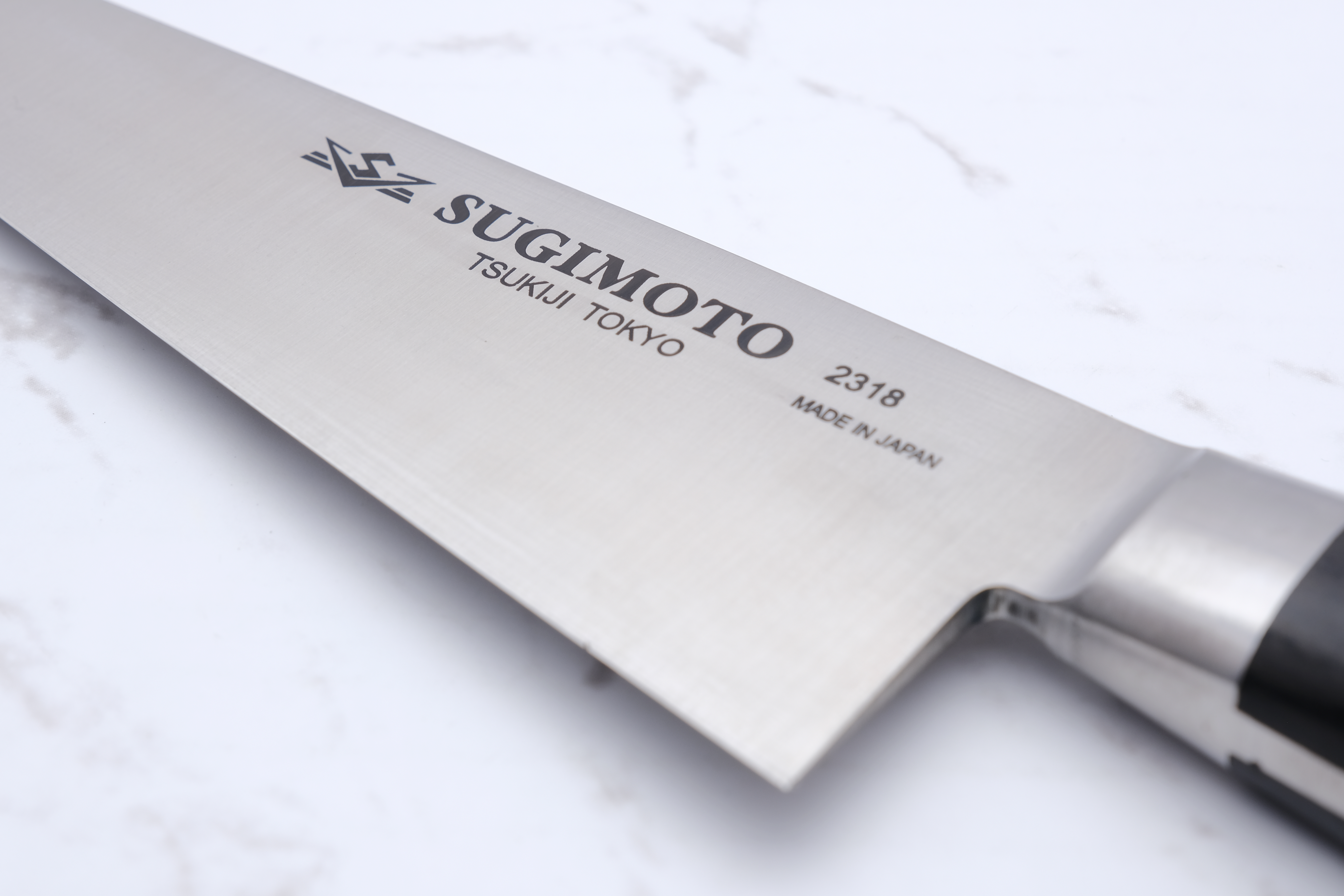 Sugimoto Hamono aus Tokio hat mit seiner HM-Serie das klassische Western-Design mit traditionellem japanischen Kohlenstoffstahl und einem reinen Rechtsschliff vereint. Auf den Bildern des Messers hier erkennt man deutlich das hohe Ei auf der rechten Seite, daher müssen wir der Übersichtlichkeit halber betonen, dass dieses Messer nur für Rechtshänder geeignet ist.