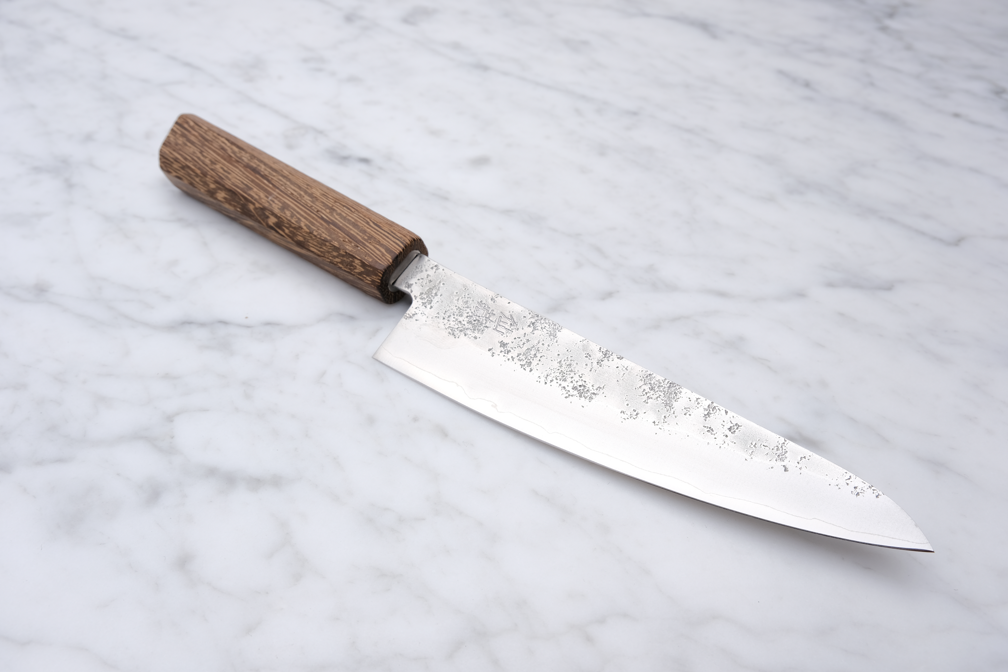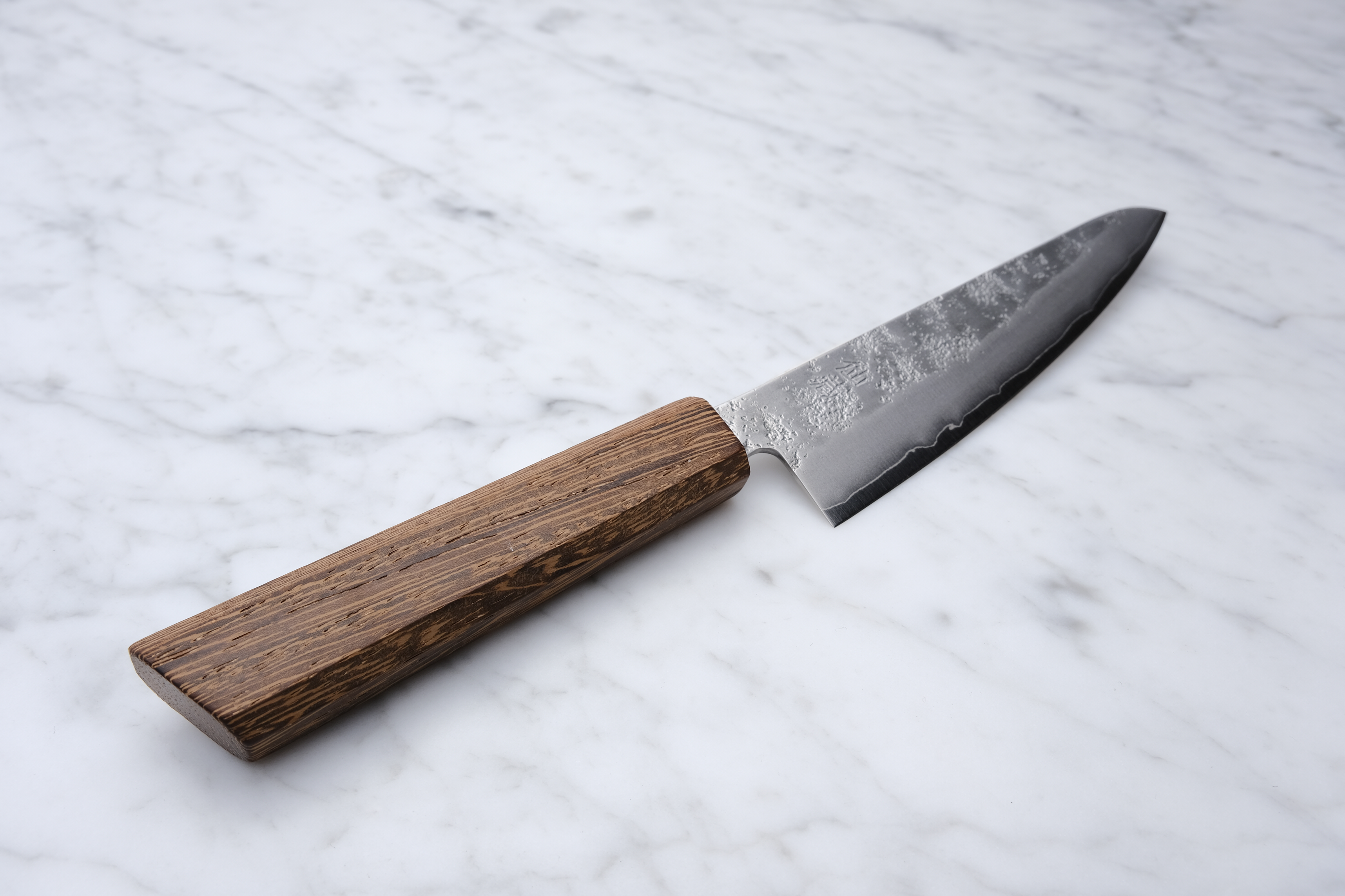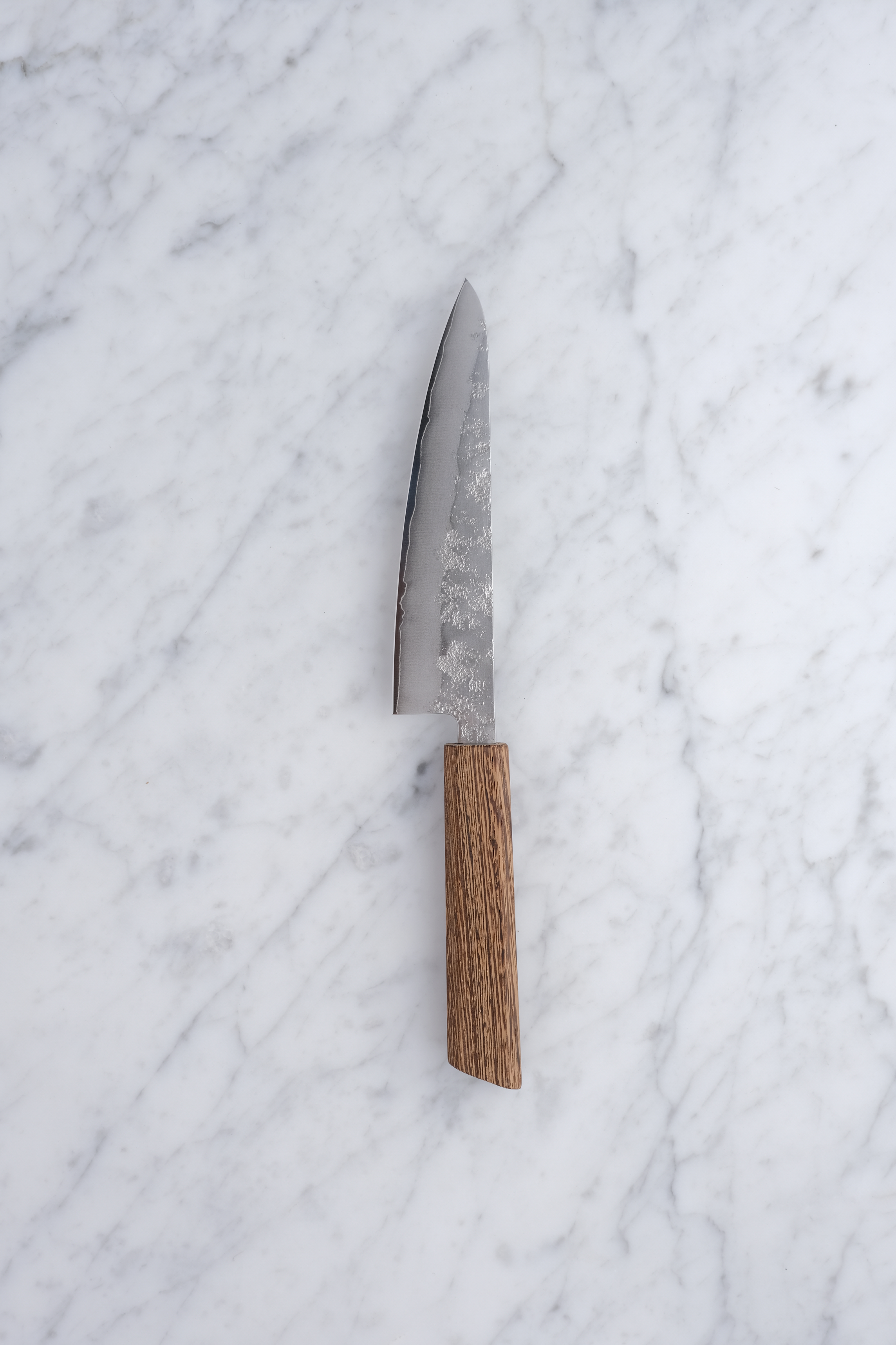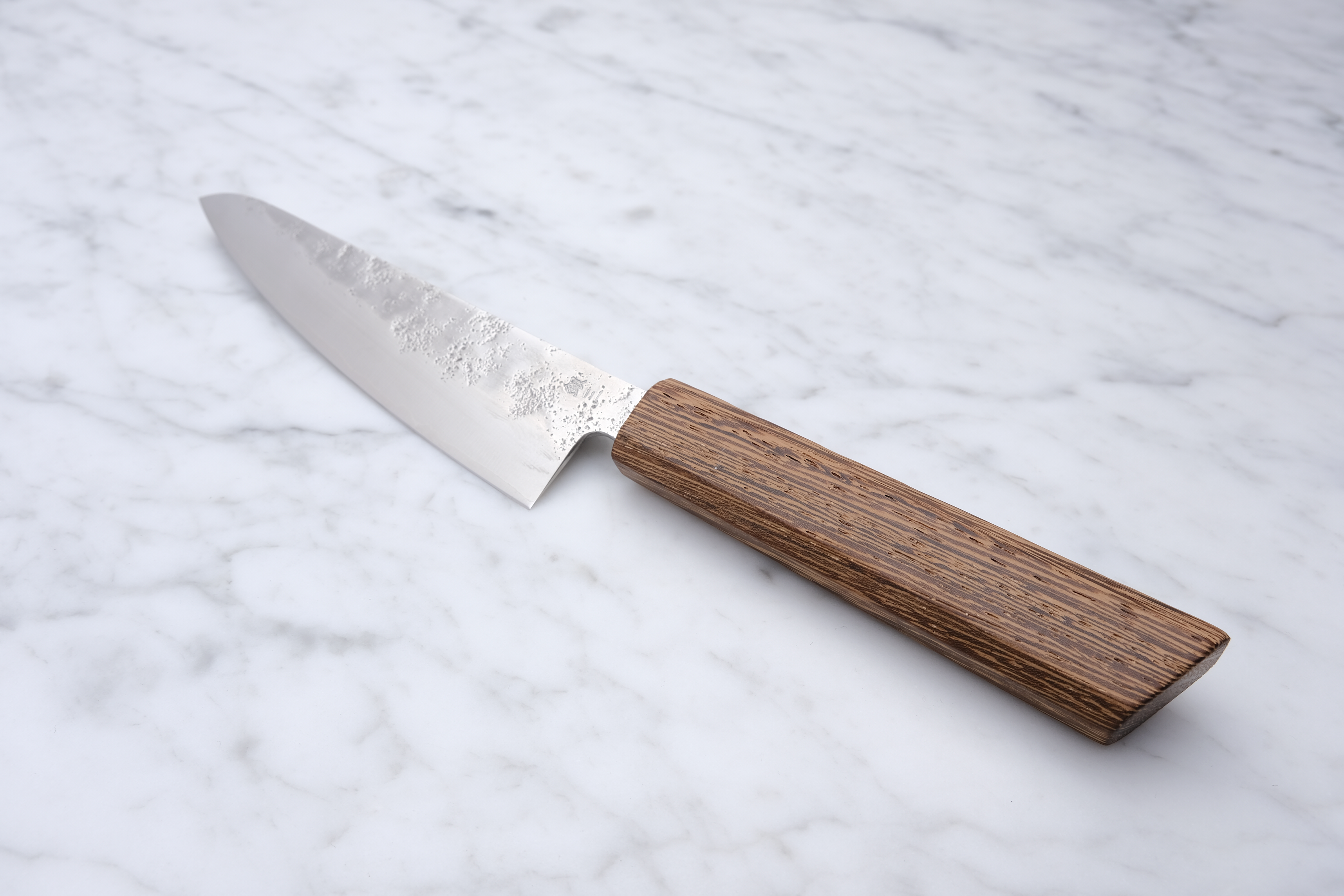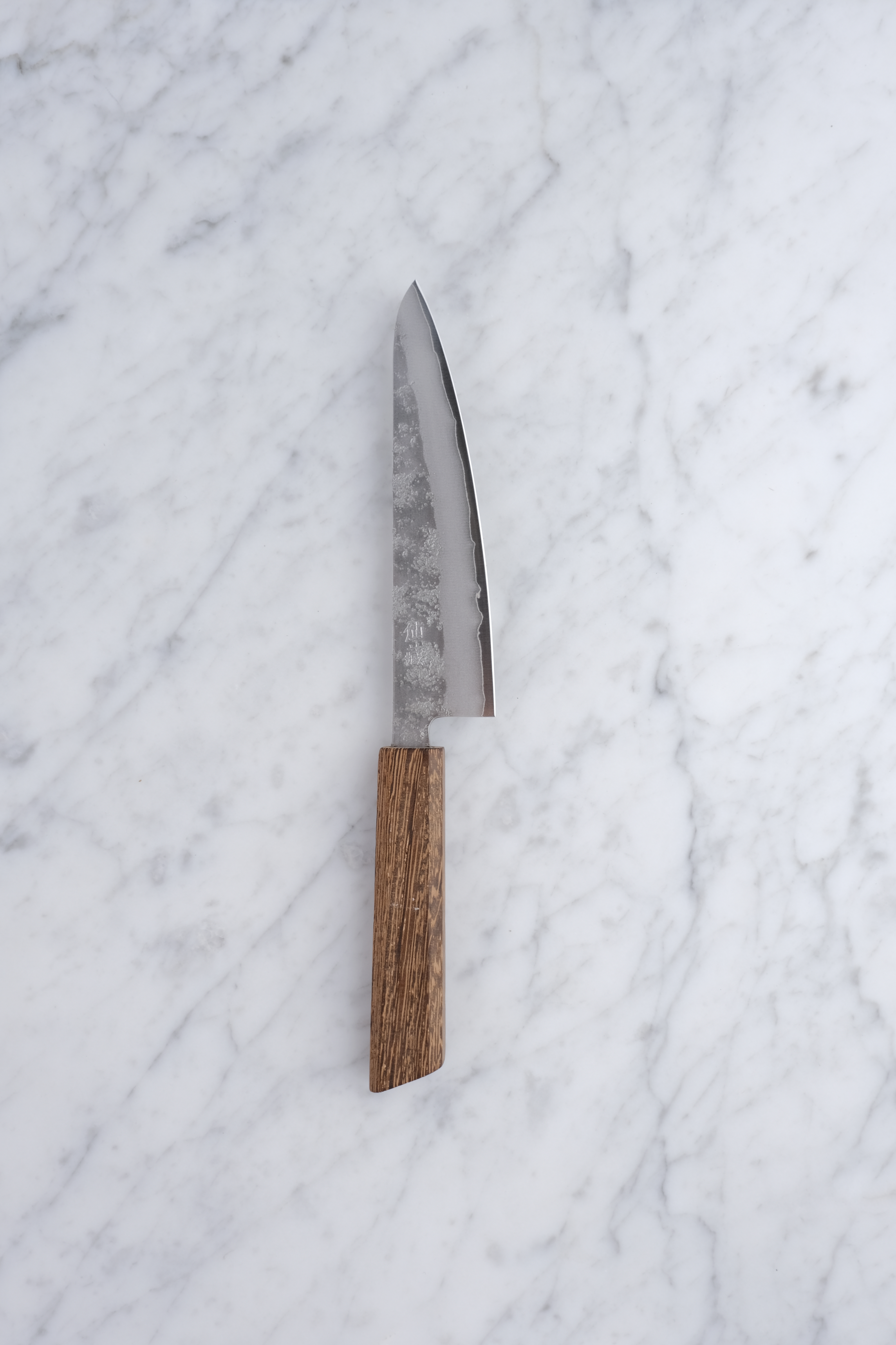 Bei diesem Messer handelt es sich um ein kleines Santoku mit einer Länge von 143 mm, mit Ginsan im Kern und zwei rostfreien Außenschichten. Ginsan ist ein rostfreier Stahl mit vielen Eigenschaften wie Kohlenstoffstahl. Das bedeutet, dass er sich leicht schärfen lässt und richtig scharf wird.