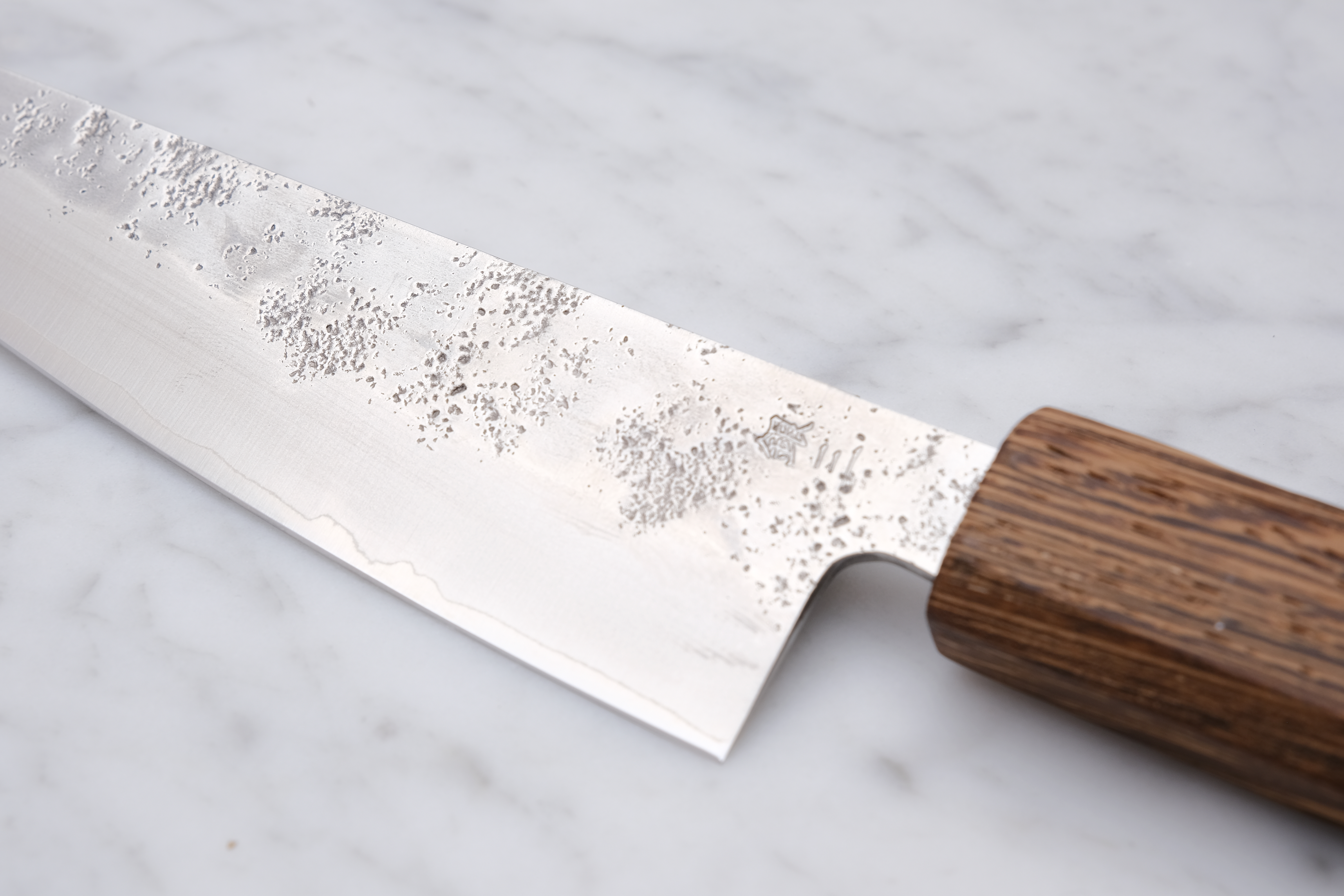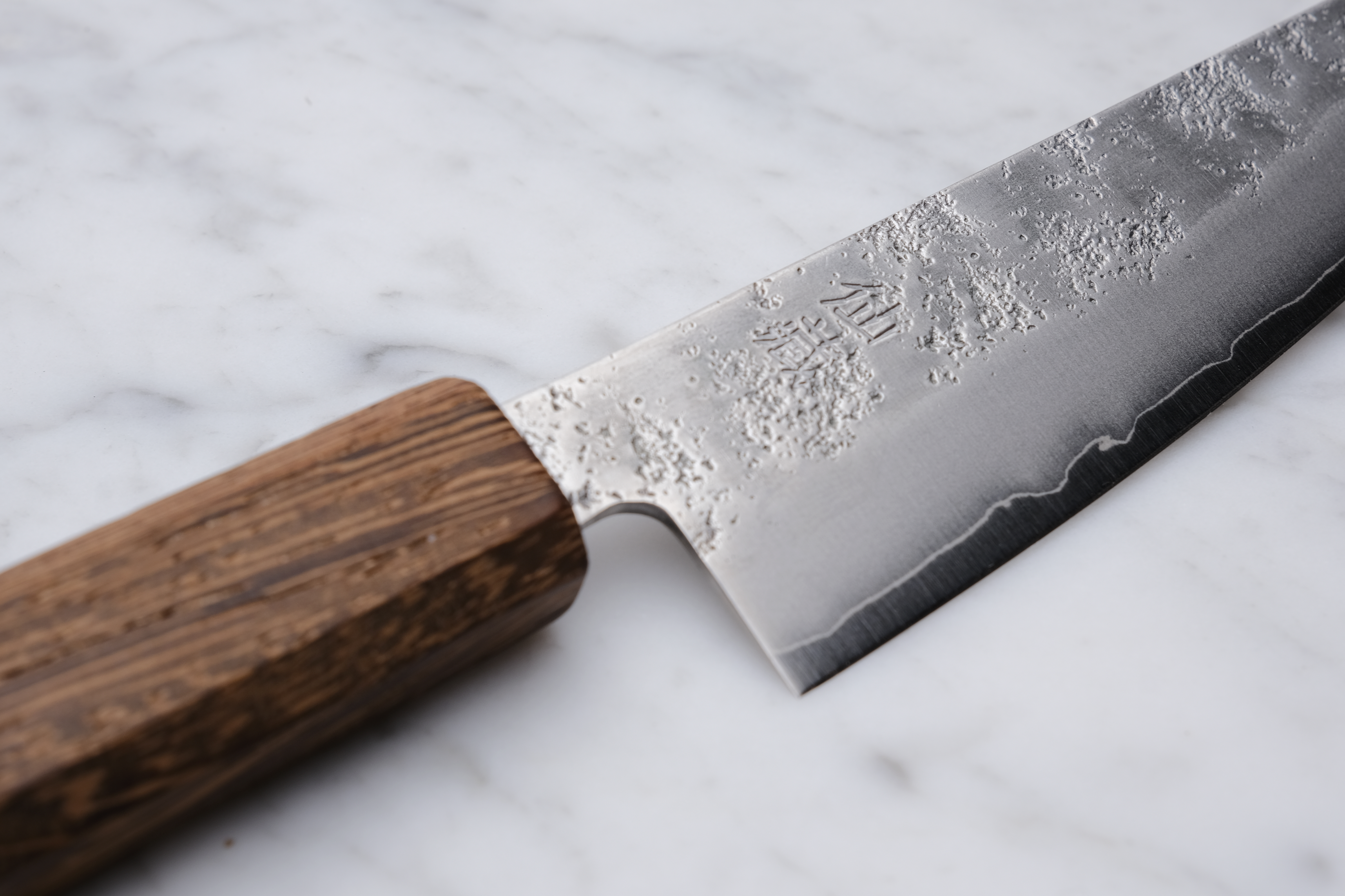 Die Retro-Serie hat ein traditionelleres Aussehen mit einem schönen, rustikalen Nashiji-Finish auf der Oberseite der Klinge und einem traditionellen achteckigen Griff.