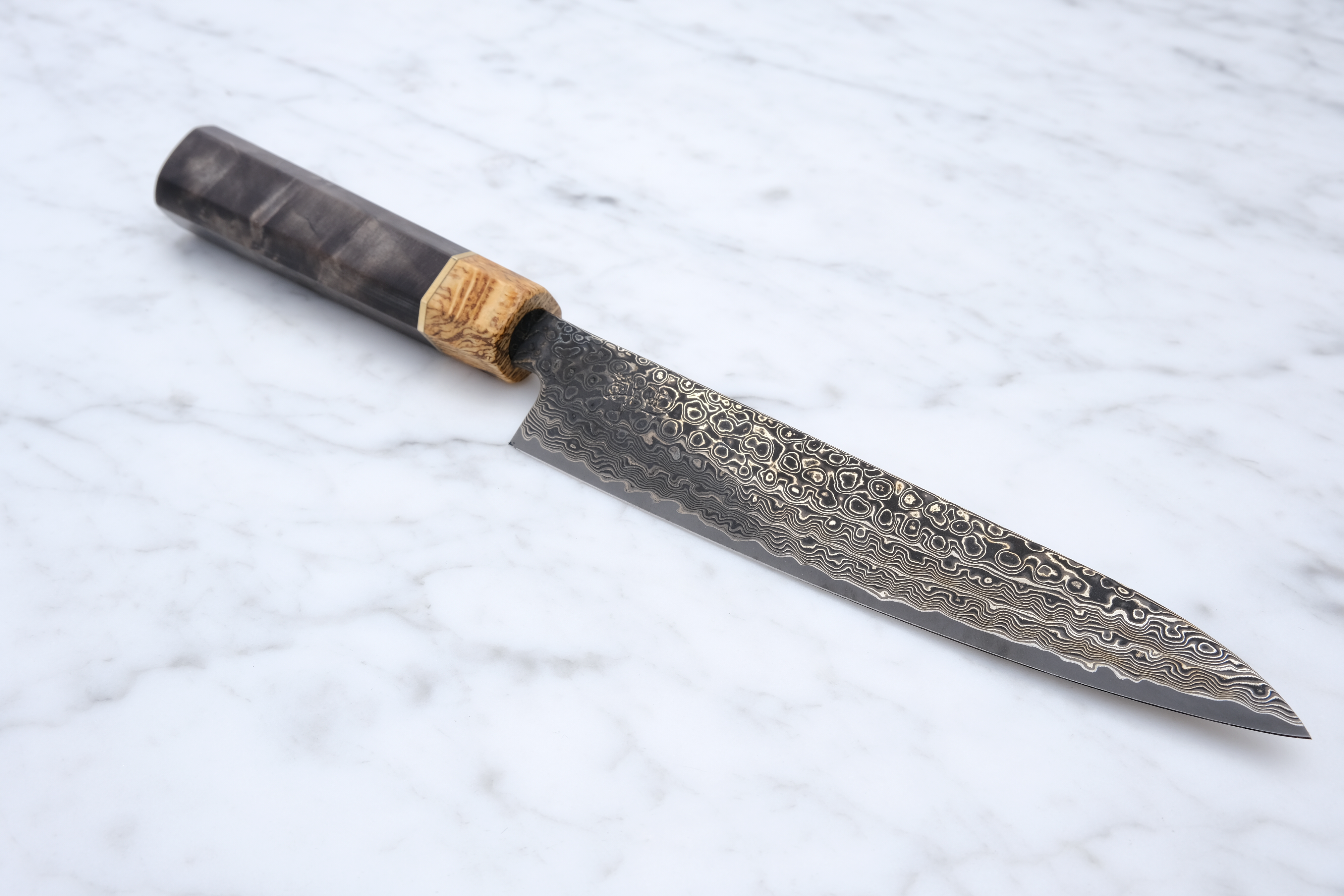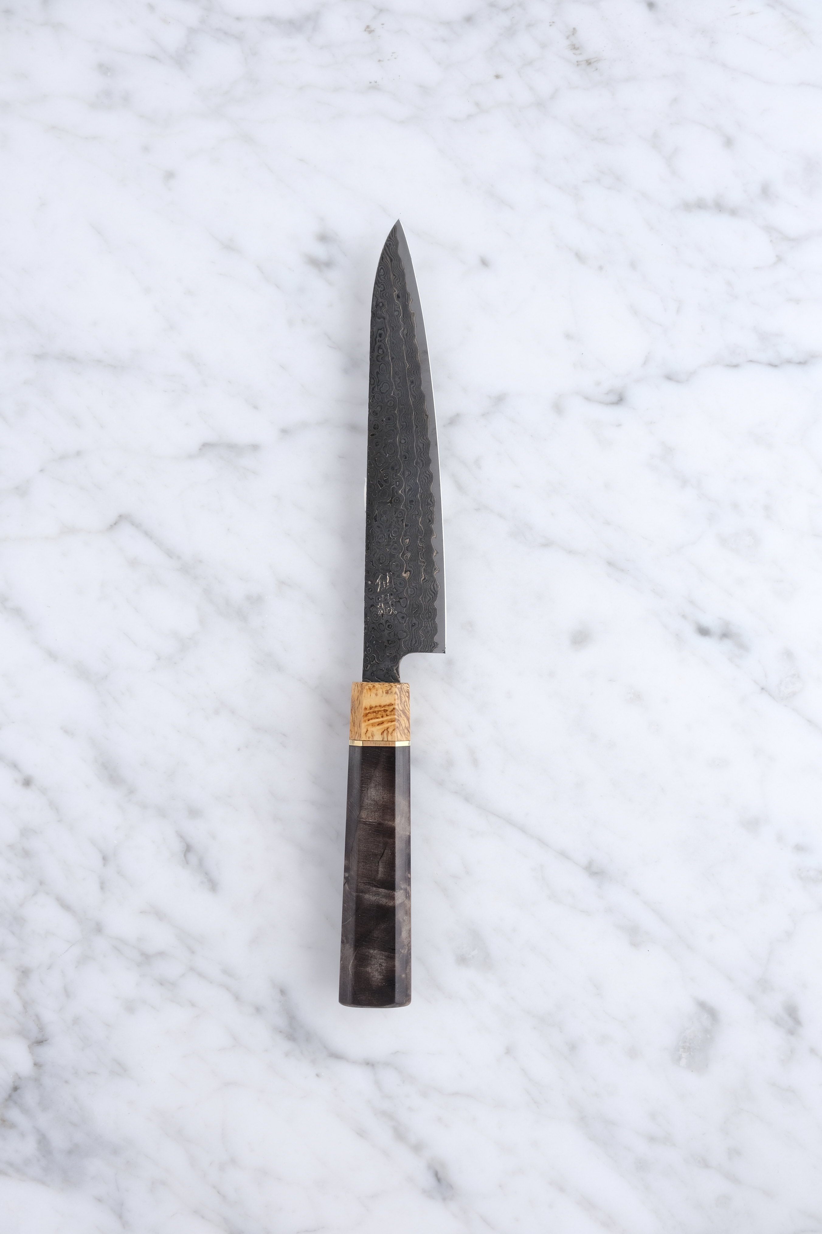 Das Petty hier ist ein gutes kleineres Allround-Messer, das zum Zerteilen von Fleisch und zum Schneiden von Obst und Gemüse verwendet werden kann. Der Griff ist aus stabilisiertem Holz gefertigt, wobei die Ferrule aus diesem 300 Jahre alten Eichenholz besteht.