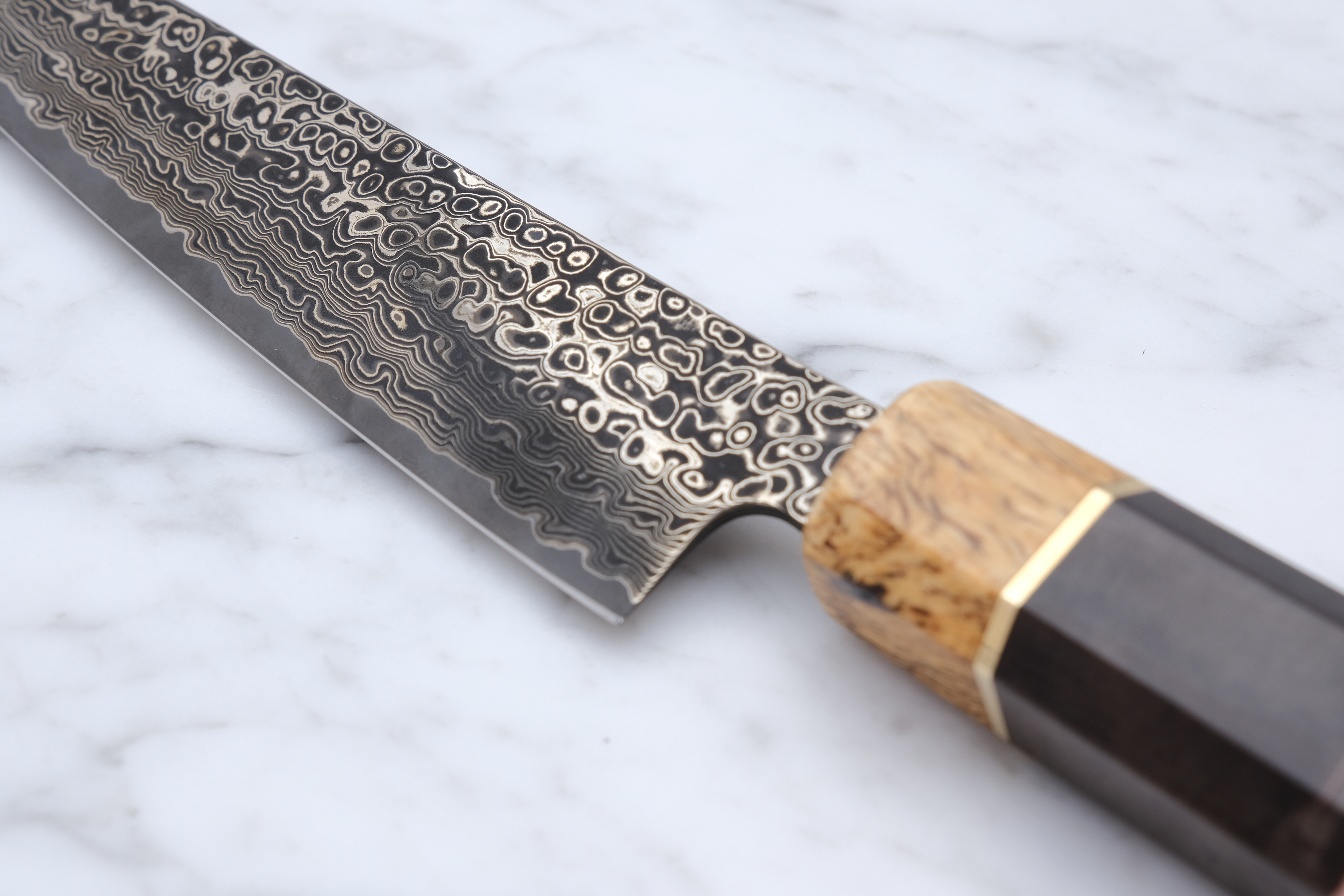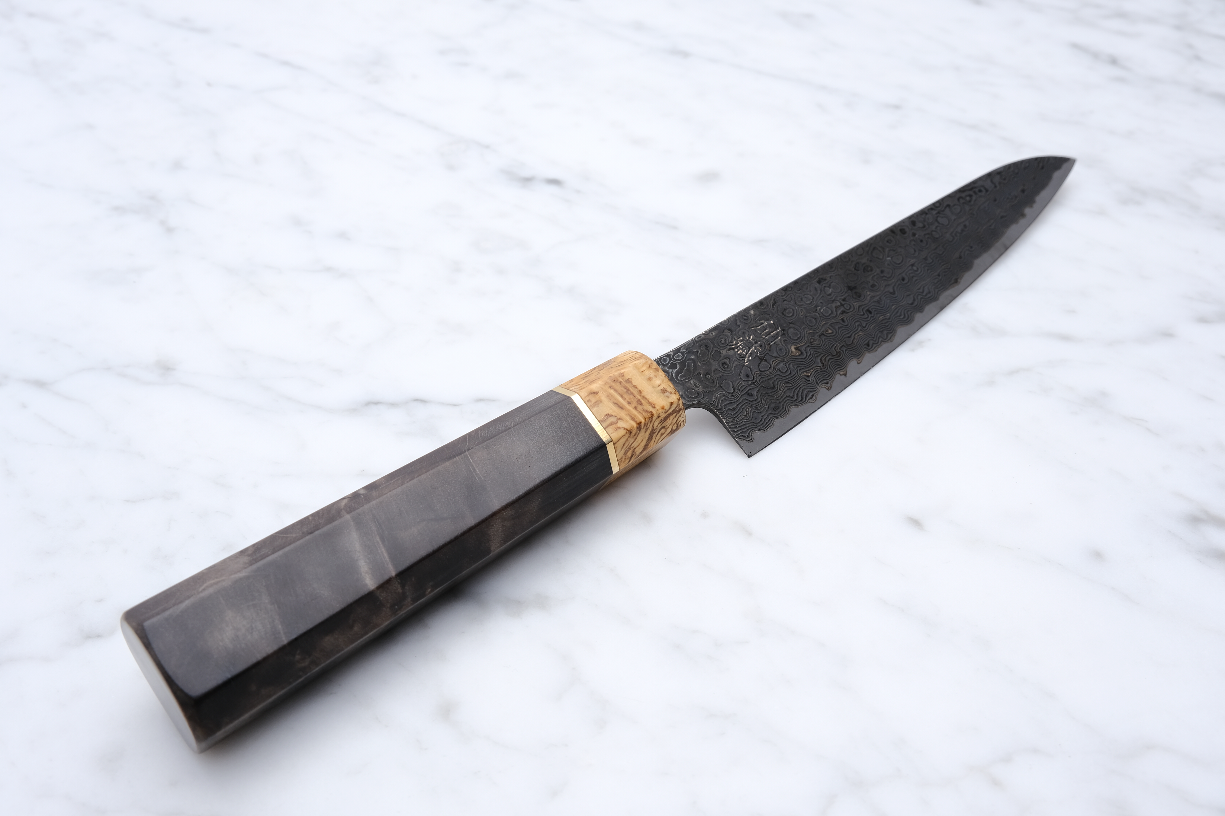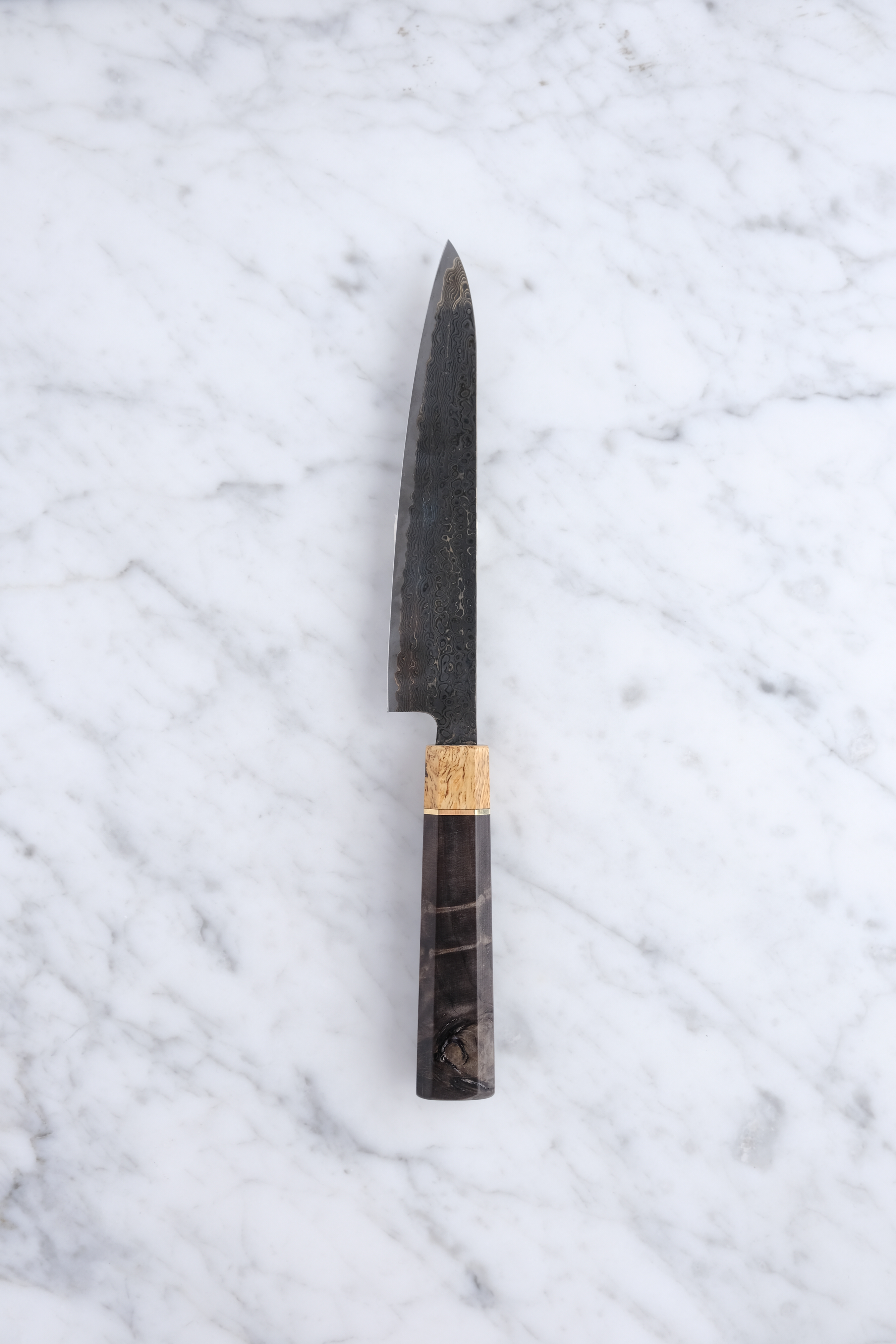 Es wurden nur 2 Messer in der Serie hergestellt, ein Petty von 150mm und ein Gyuto von 210mm. Diese werden mit dem rostfreien SG2 im Kern, umgeben von einer super schönen dunklen Damastverkleidung, hergestellt.