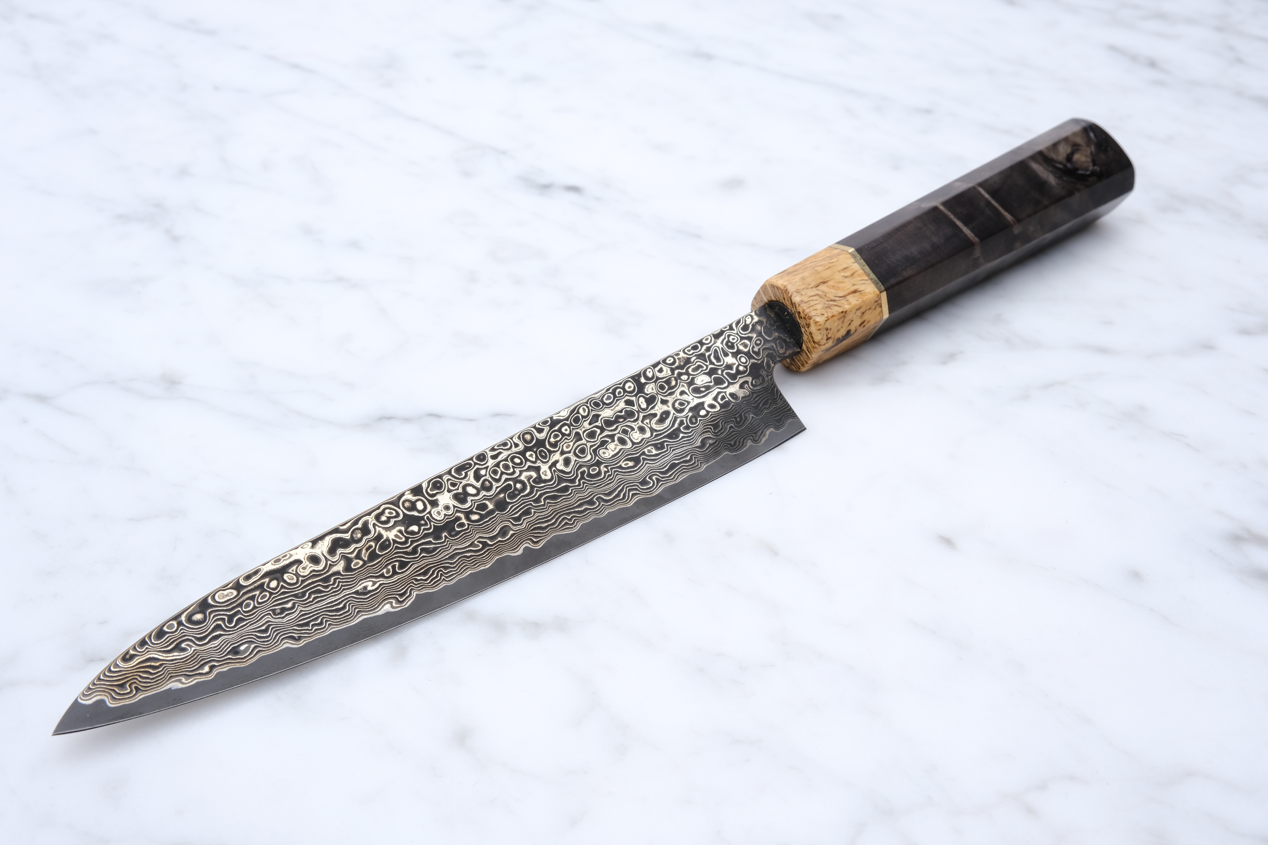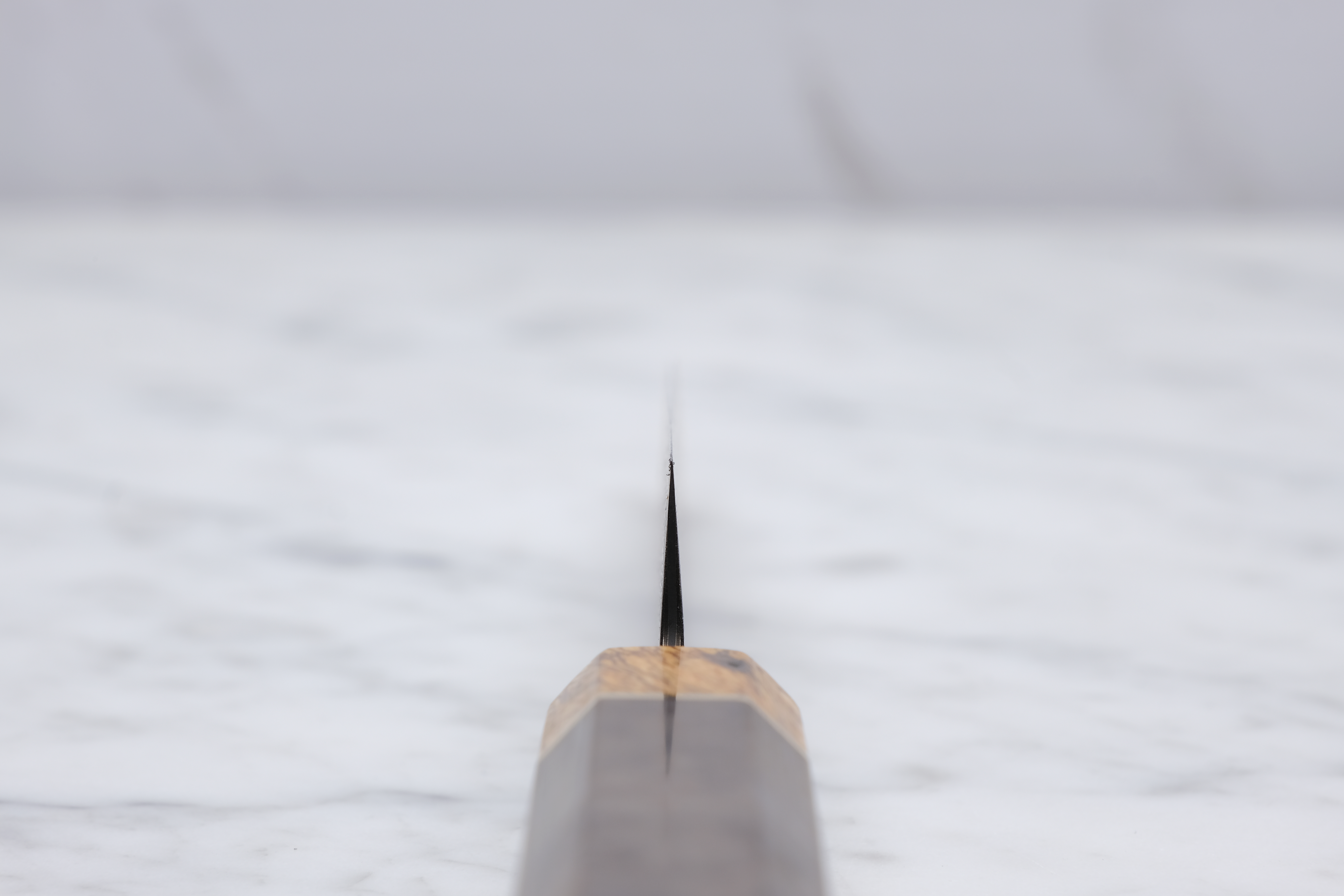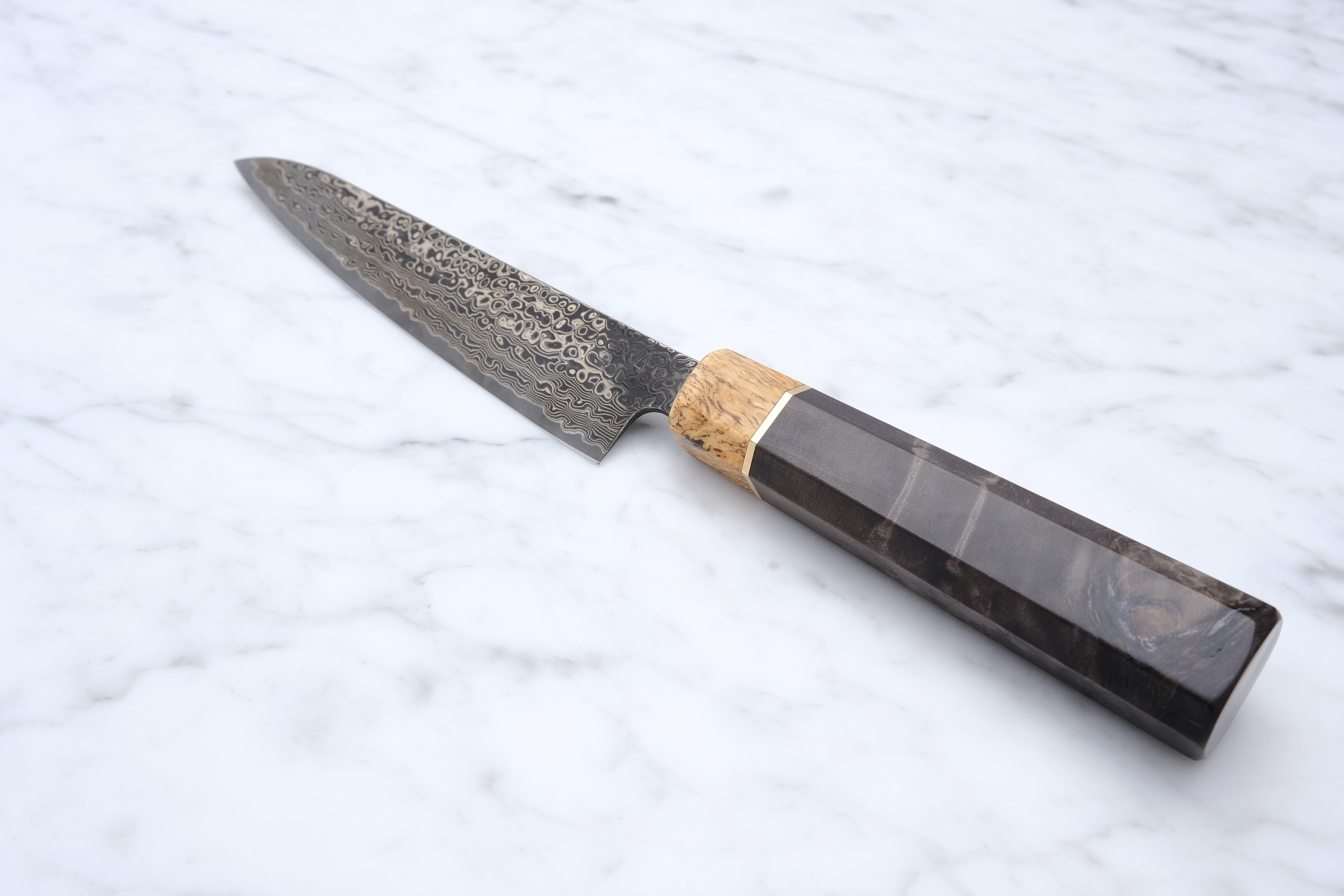 Es wurden nur 2 Messer in der Serie hergestellt, ein Petty von 150mm und ein Gyuto von 210mm. Diese werden mit dem rostfreien SG2 im Kern, umgeben von einer super schönen dunklen Damastverkleidung, hergestellt.