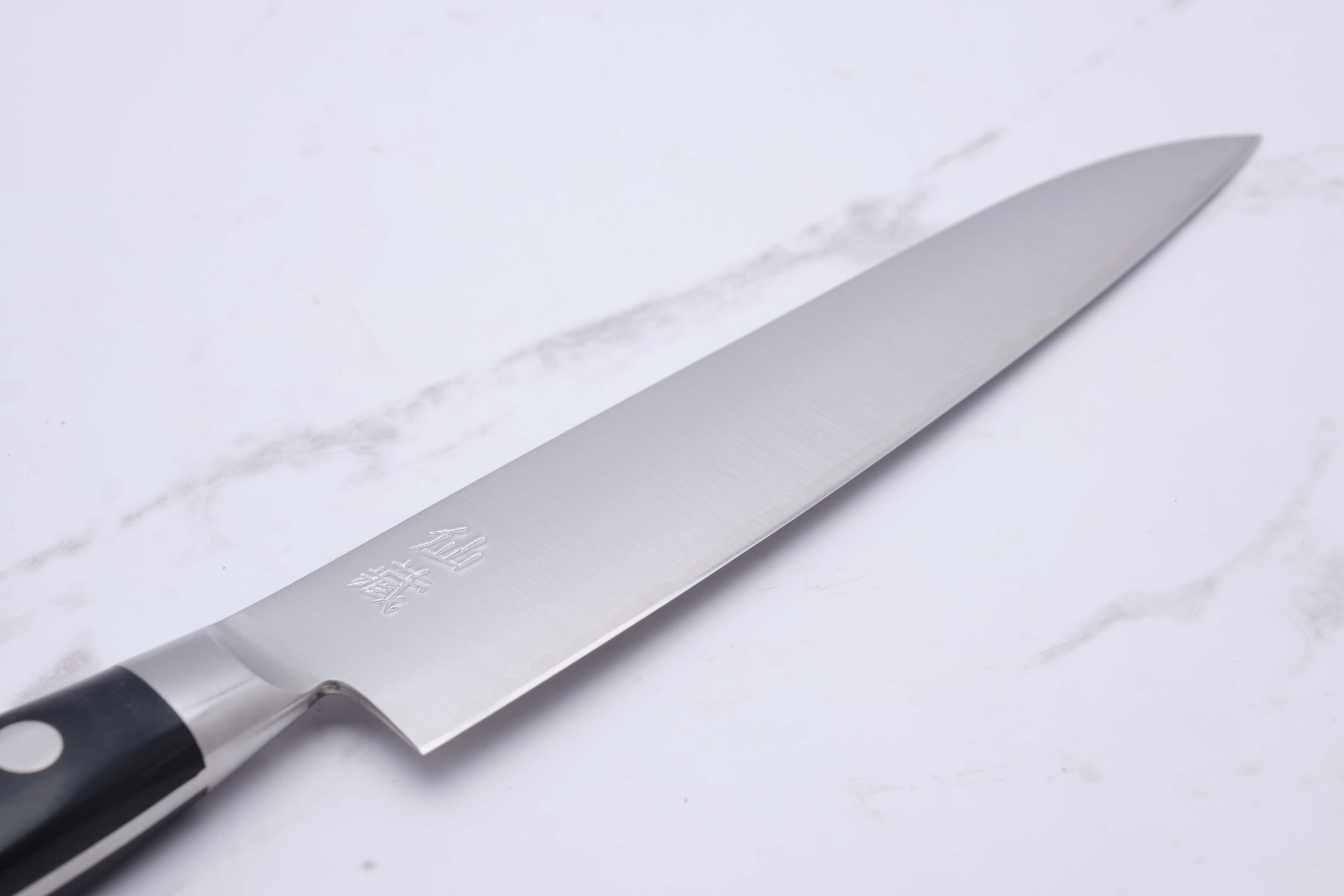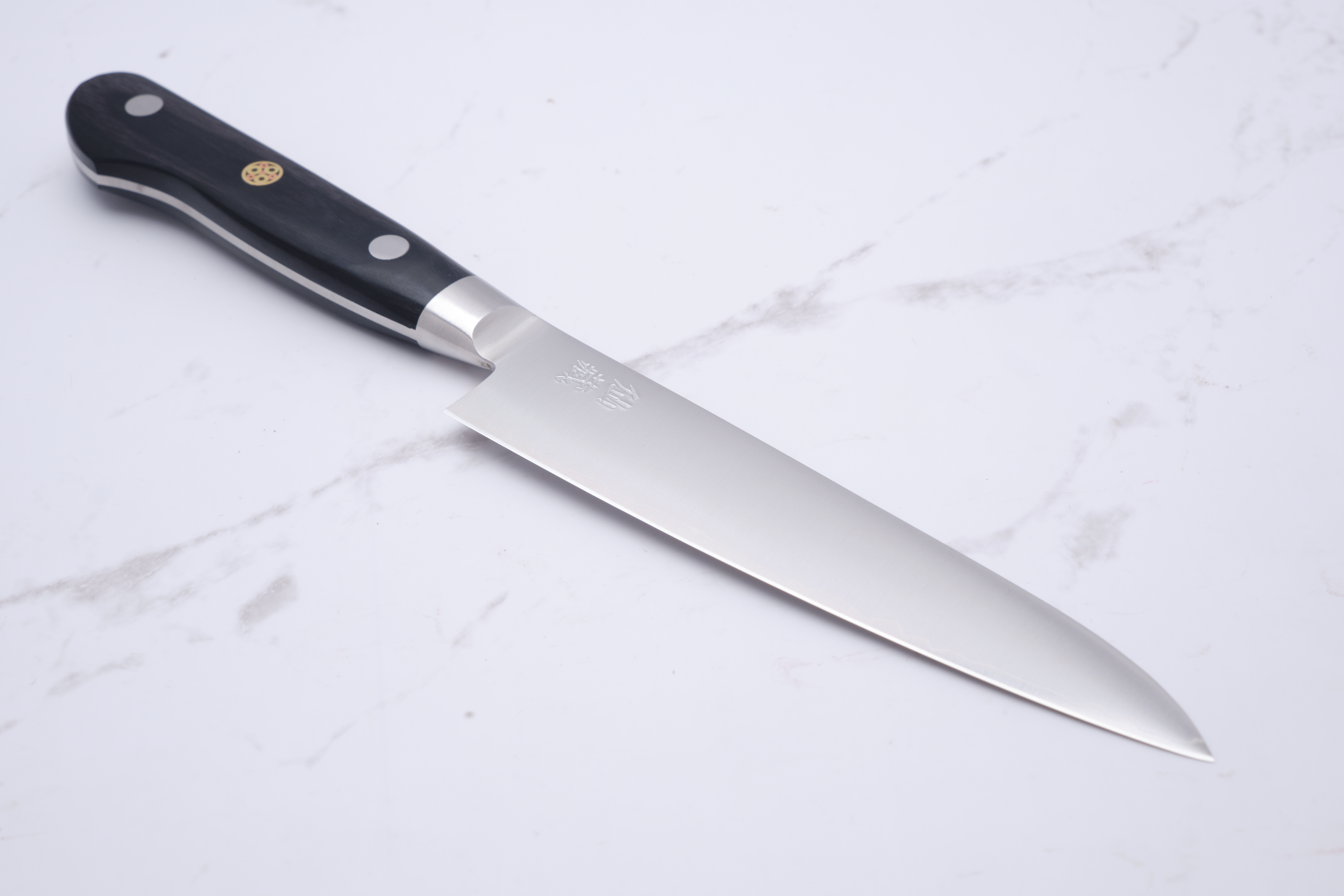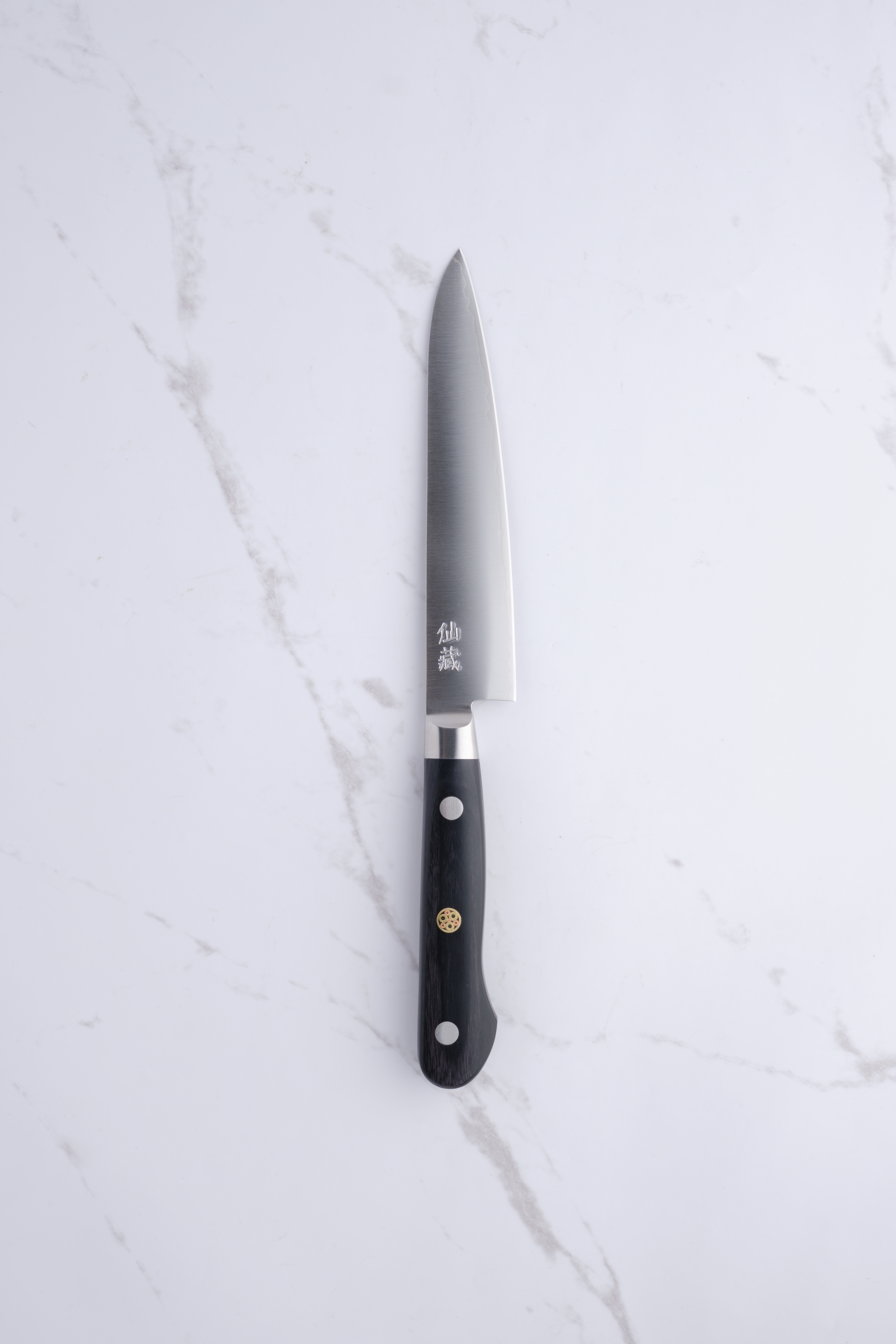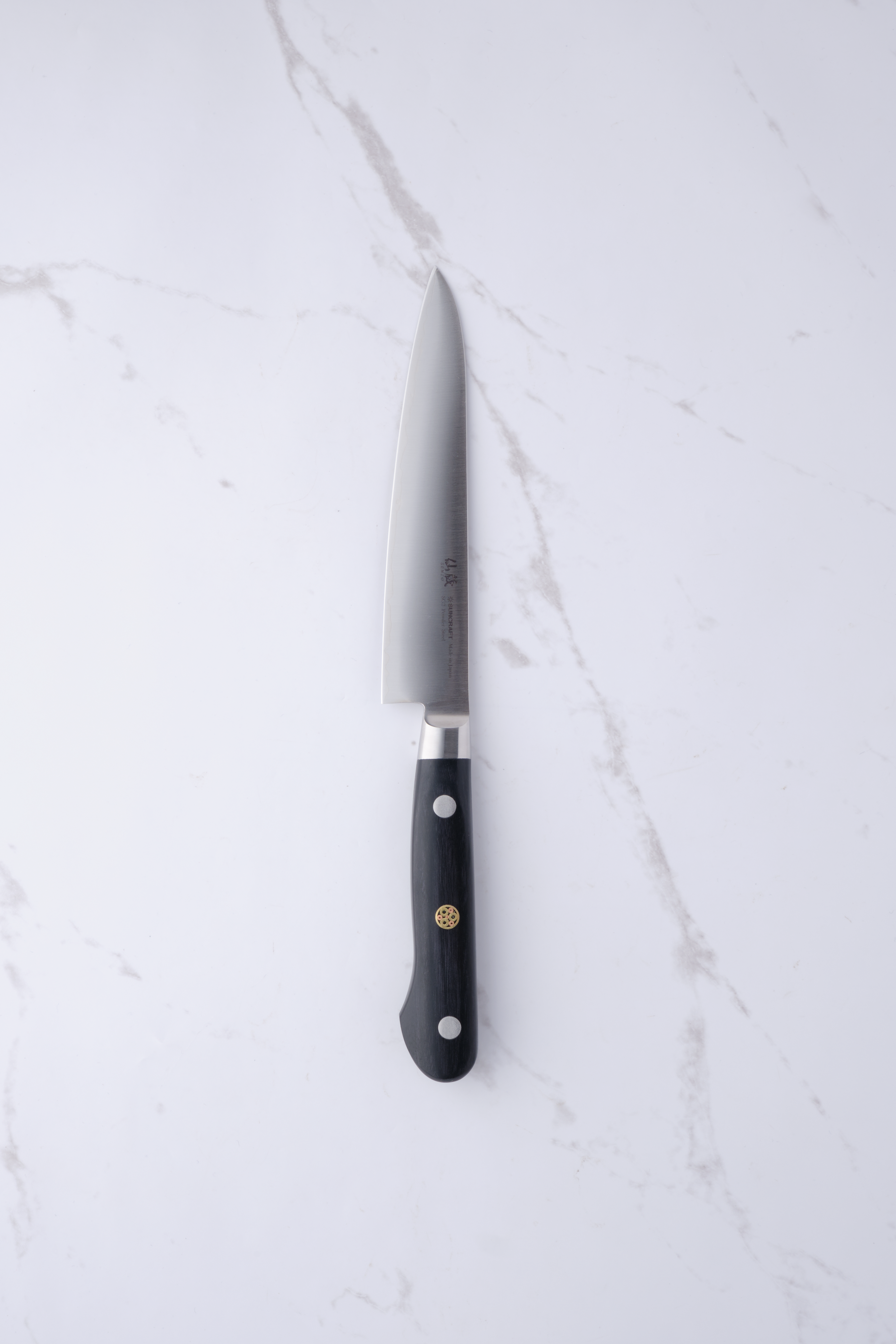 Das Messer hier ist ein 135-mm-Petty, das aus drei Schichten besteht, mit SG2 im Kern und zwei rostfreien Außenschichten. SG2 ist ein sehr harter, rostfreier Pulverstahltyp, der die Eigenschaften hat, sehr scharf zu sein und das Ei lange zu halten.