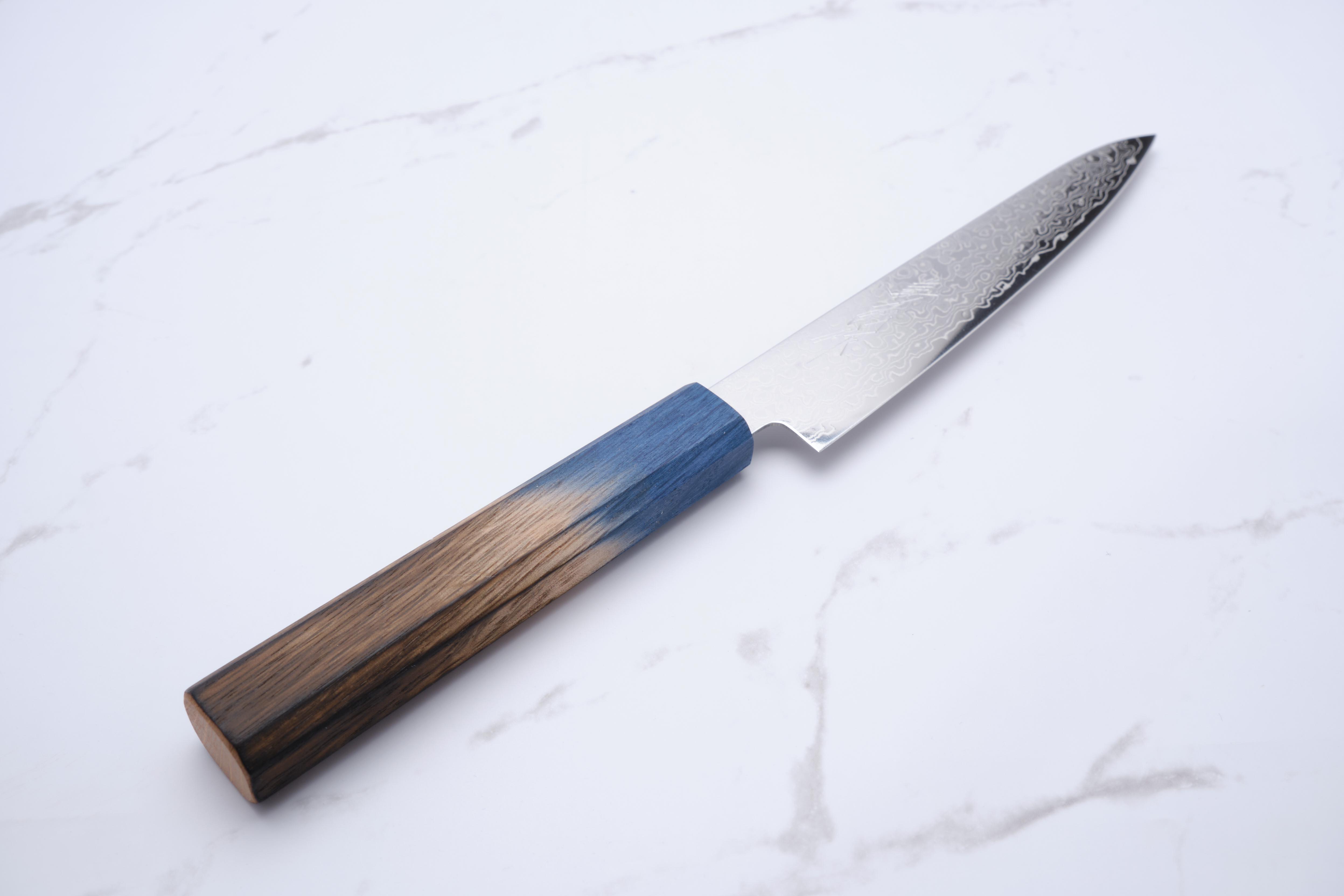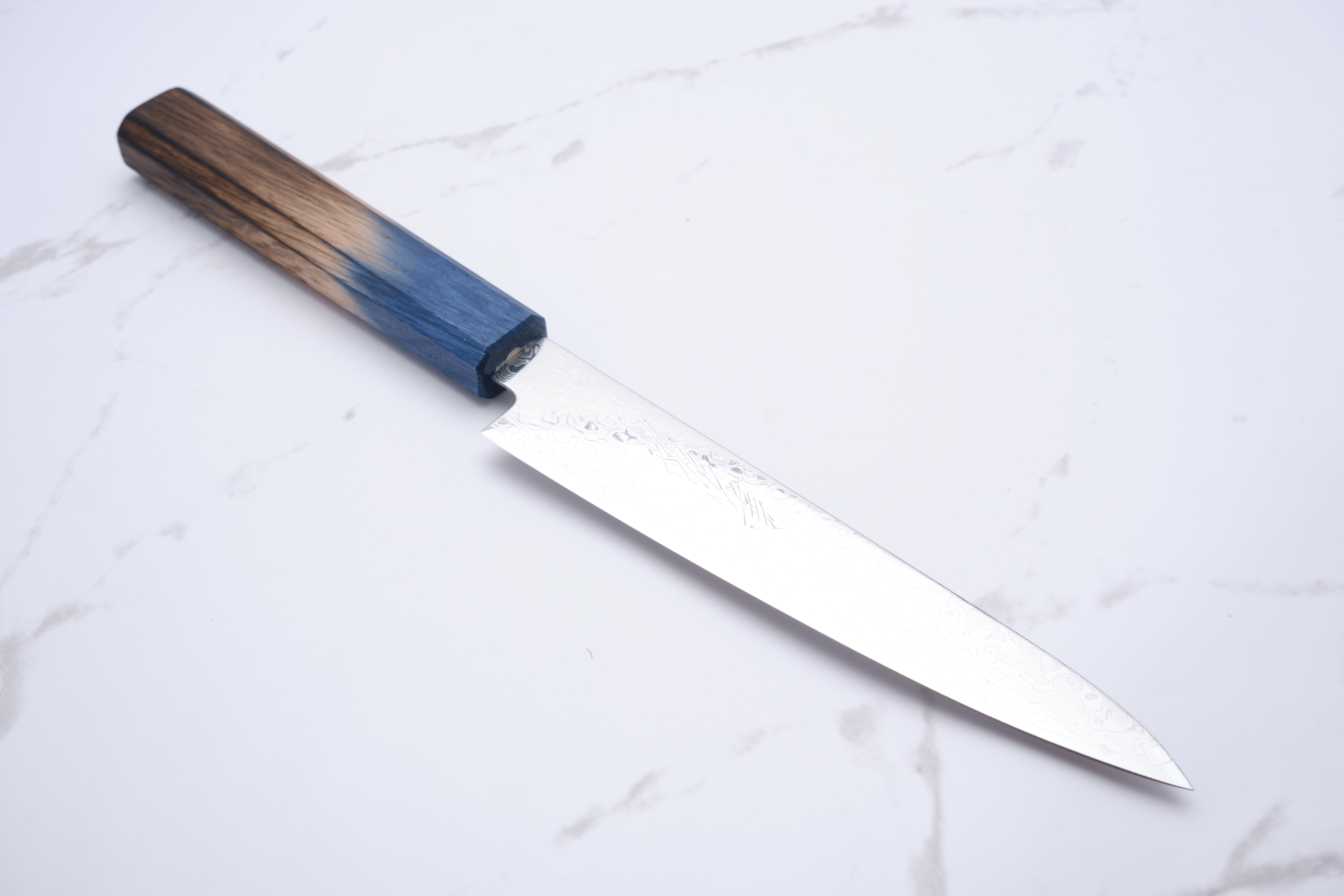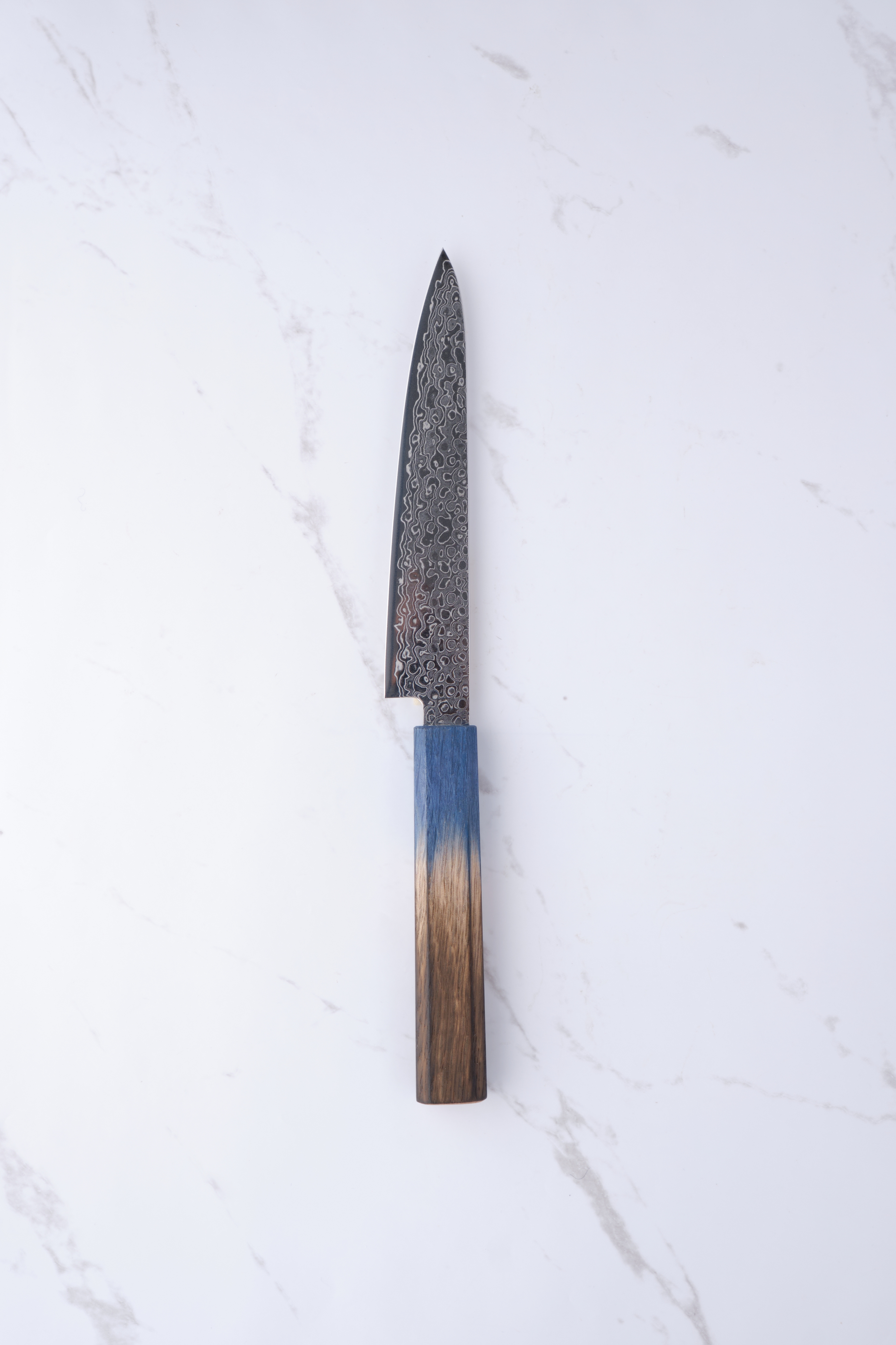 Das Messer besteht aus einem Kern aus ZA-18-Stahl, der für seine Rostbeständigkeit und hohe Härte bekannt ist und für langanhaltende Schärfe und Haltbarkeit sorgt. Die schöne Damastbeschichtung verleiht dem Messer nicht nur einen ästhetischen Mehrwert, sondern verbessert auch die Festigkeit und Schneidfähigkeit. Der Griff besteht aus gebrannter Eiche in elegantem Blau und liegt stilvoll und bequem in der Hand.