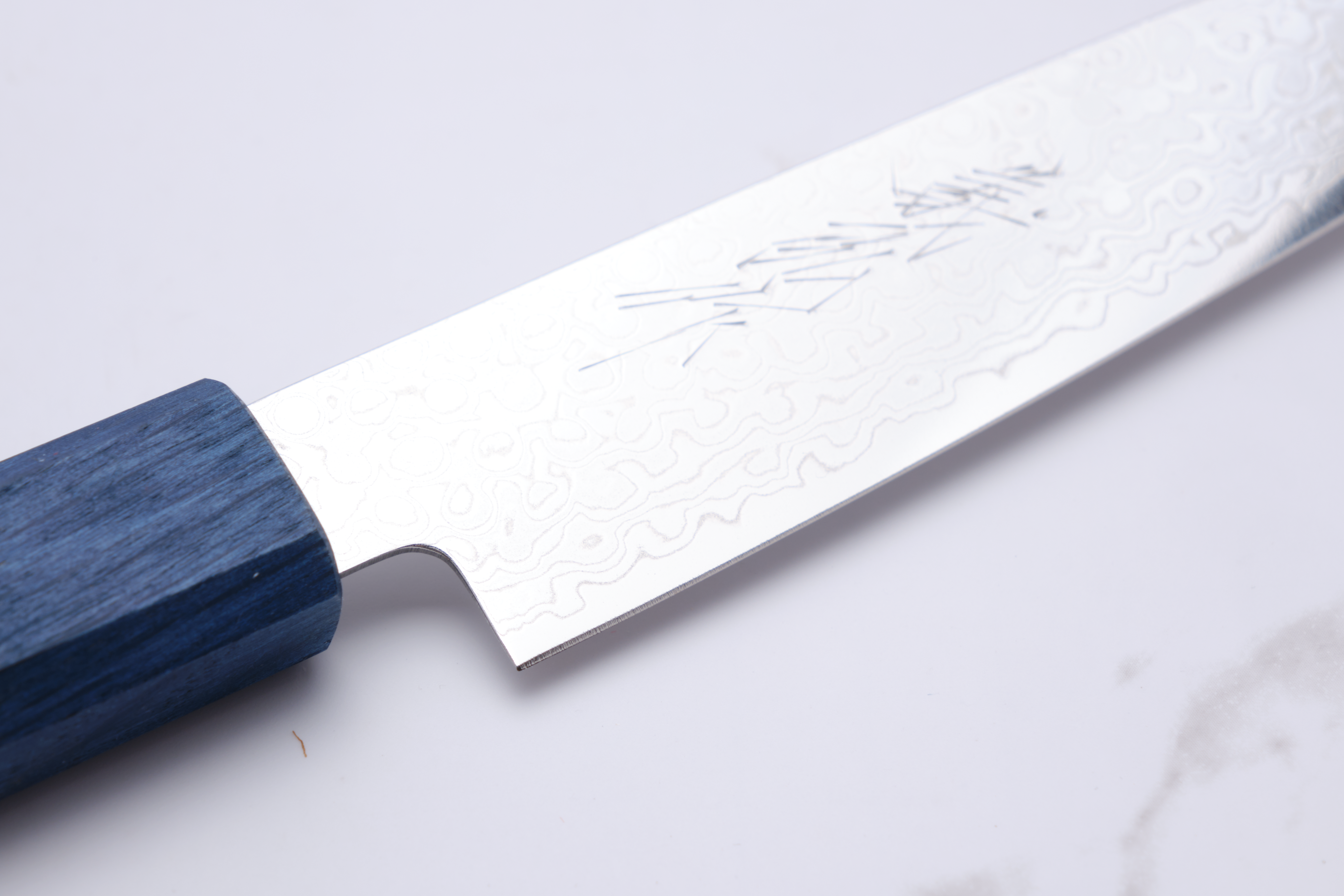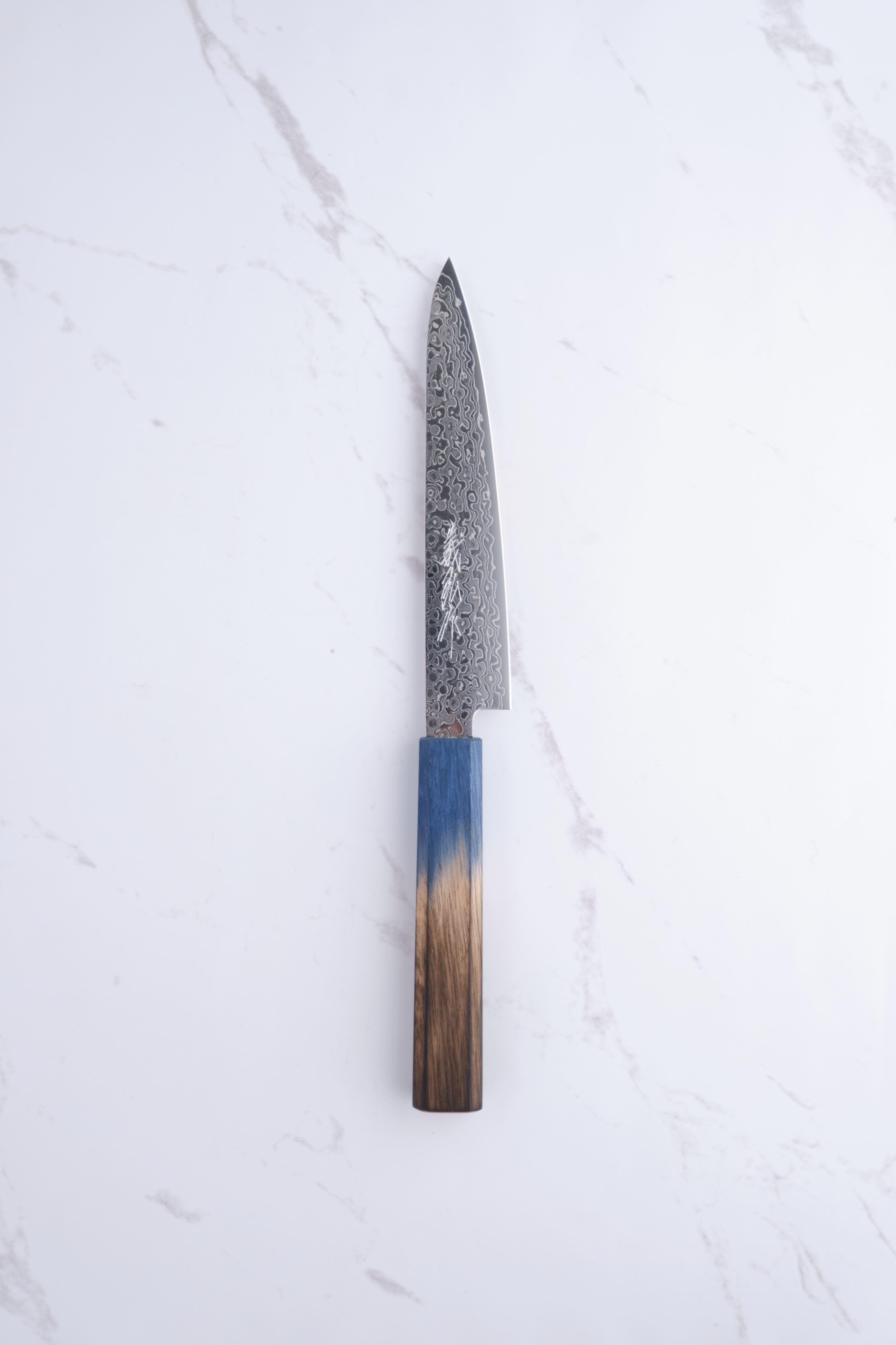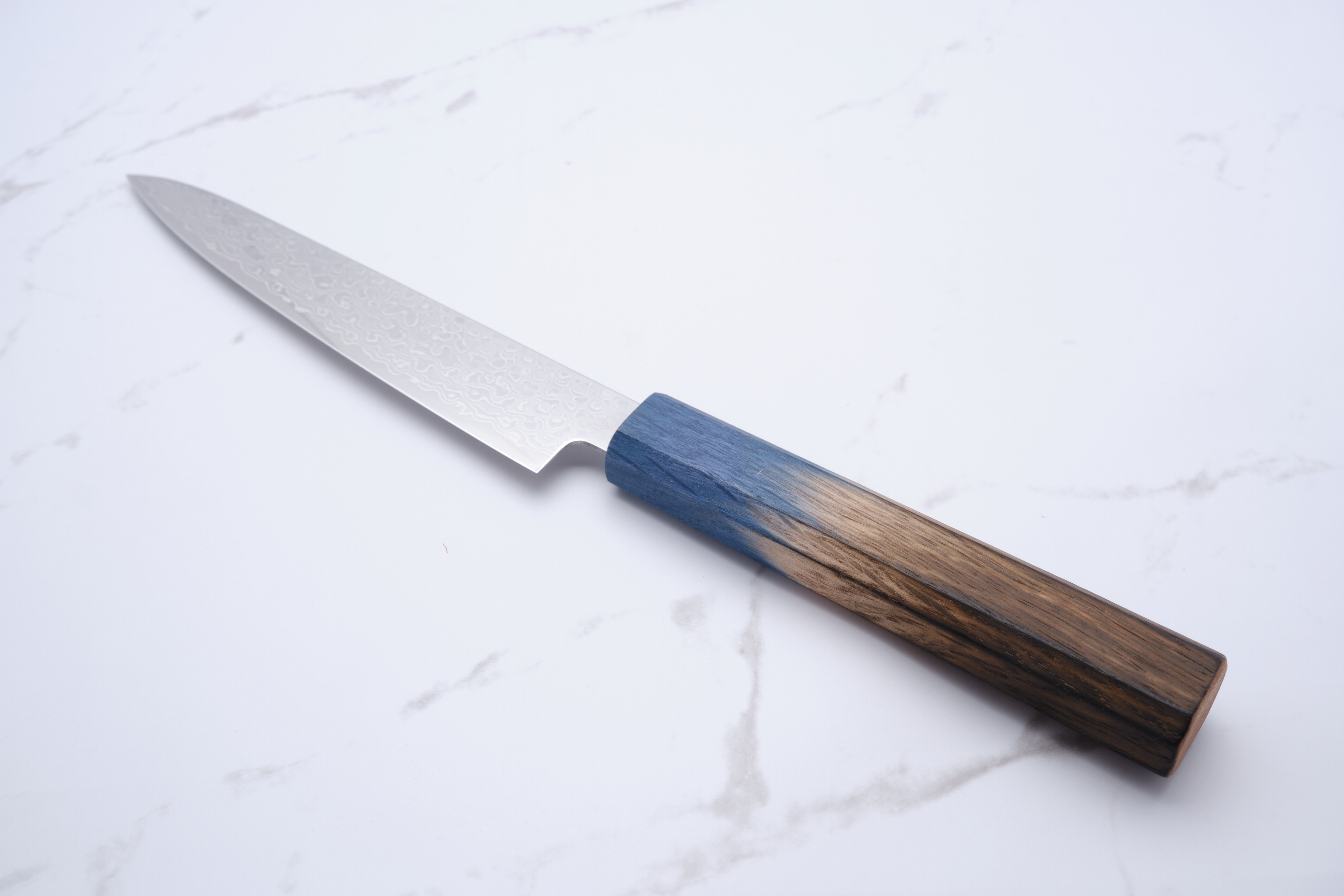 Das Messer besteht aus einem Kern aus ZA-18-Stahl, der für seine Rostbeständigkeit und hohe Härte bekannt ist und für langanhaltende Schärfe und Haltbarkeit sorgt. Die schöne Damastbeschichtung verleiht dem Messer nicht nur einen ästhetischen Mehrwert, sondern verbessert auch die Festigkeit und Schneidfähigkeit. Der Griff besteht aus gebrannter Eiche in elegantem Blau und liegt stilvoll und bequem in der Hand.