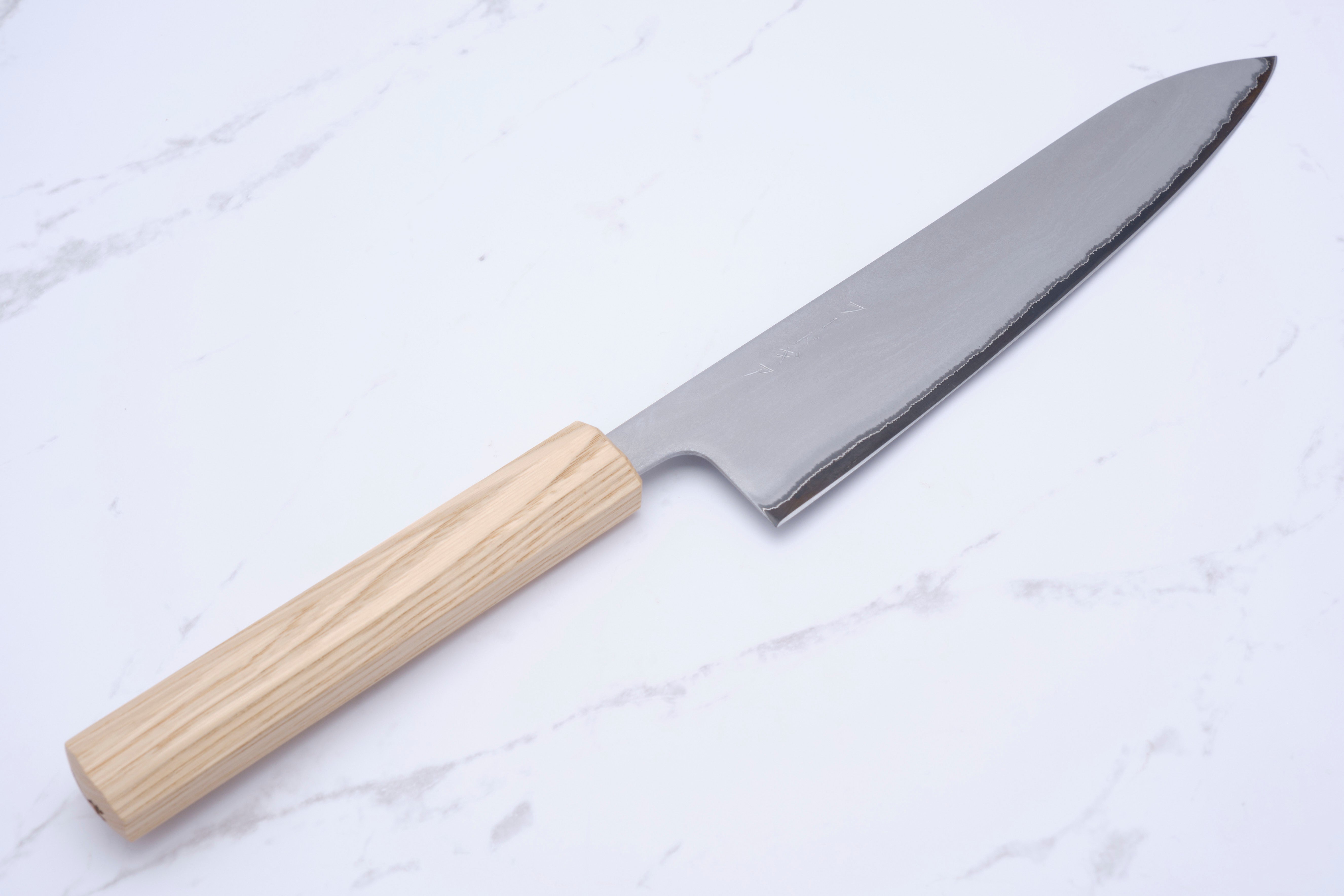 This knife is a 210mm Gyuto made in 3 layers. It has White #1 (Shirogami) in the core and surrounded by 2 stainless outer layers. This means that it is only the egg that will patina over time, and that it is easy to grind up, and has a high potential for sharpness.