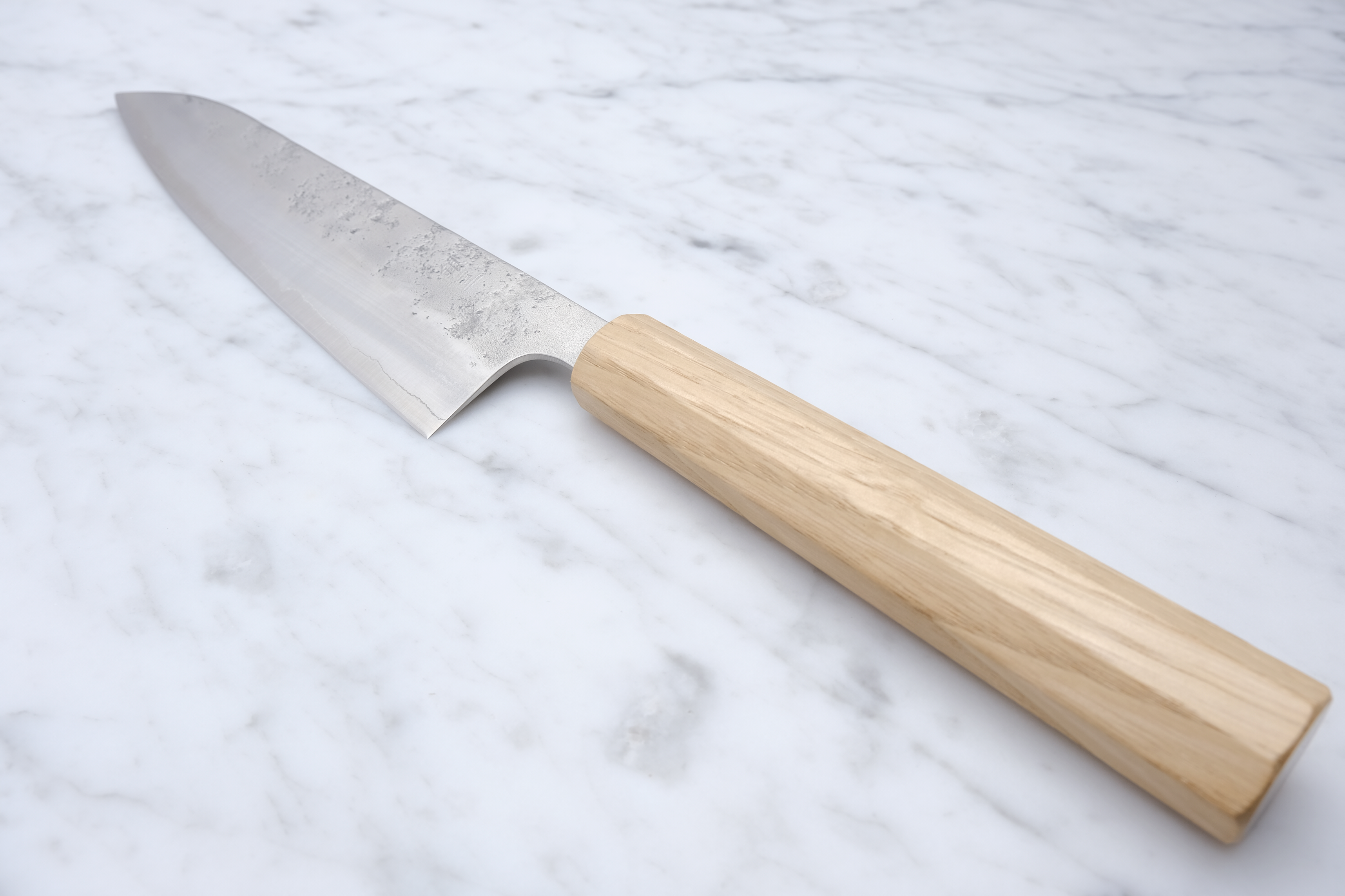 This knife is a 180mm bunka made of 3 layers. It has Gin3 (Ginsan) in the core and is surrounded by 2 stainless steel outer layers. This means that the knife is more or less stainless and requires minimal care regarding rust.