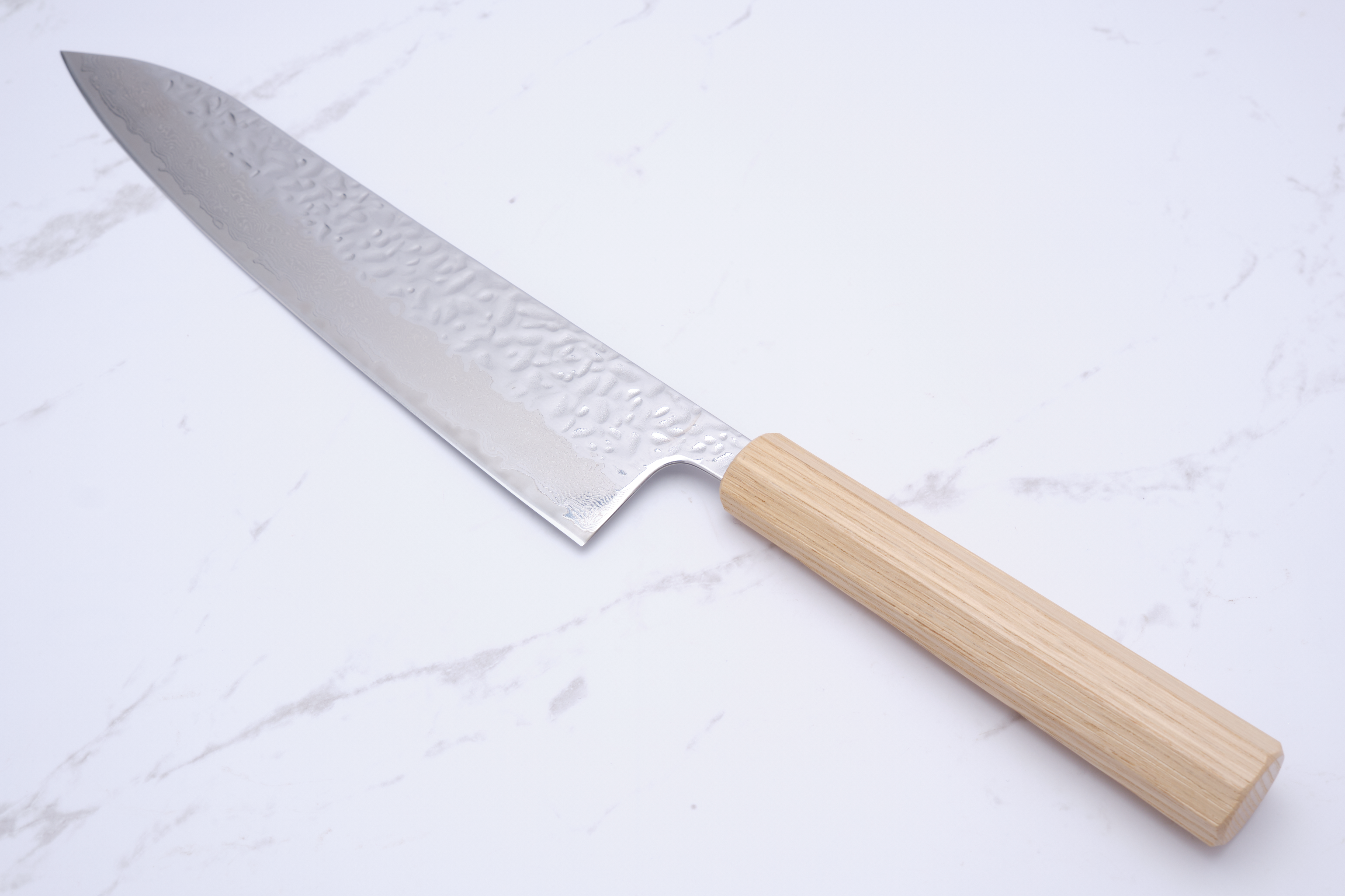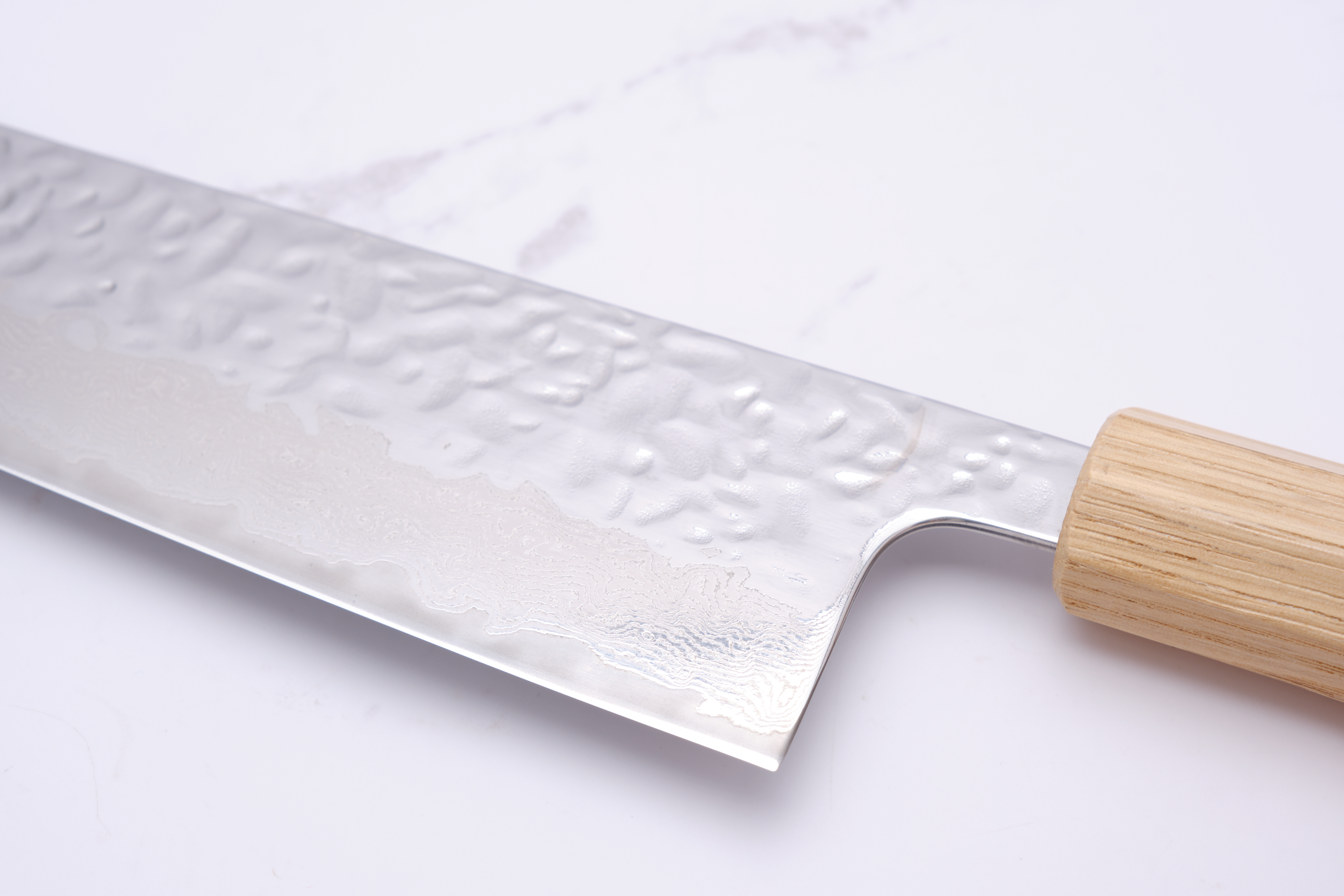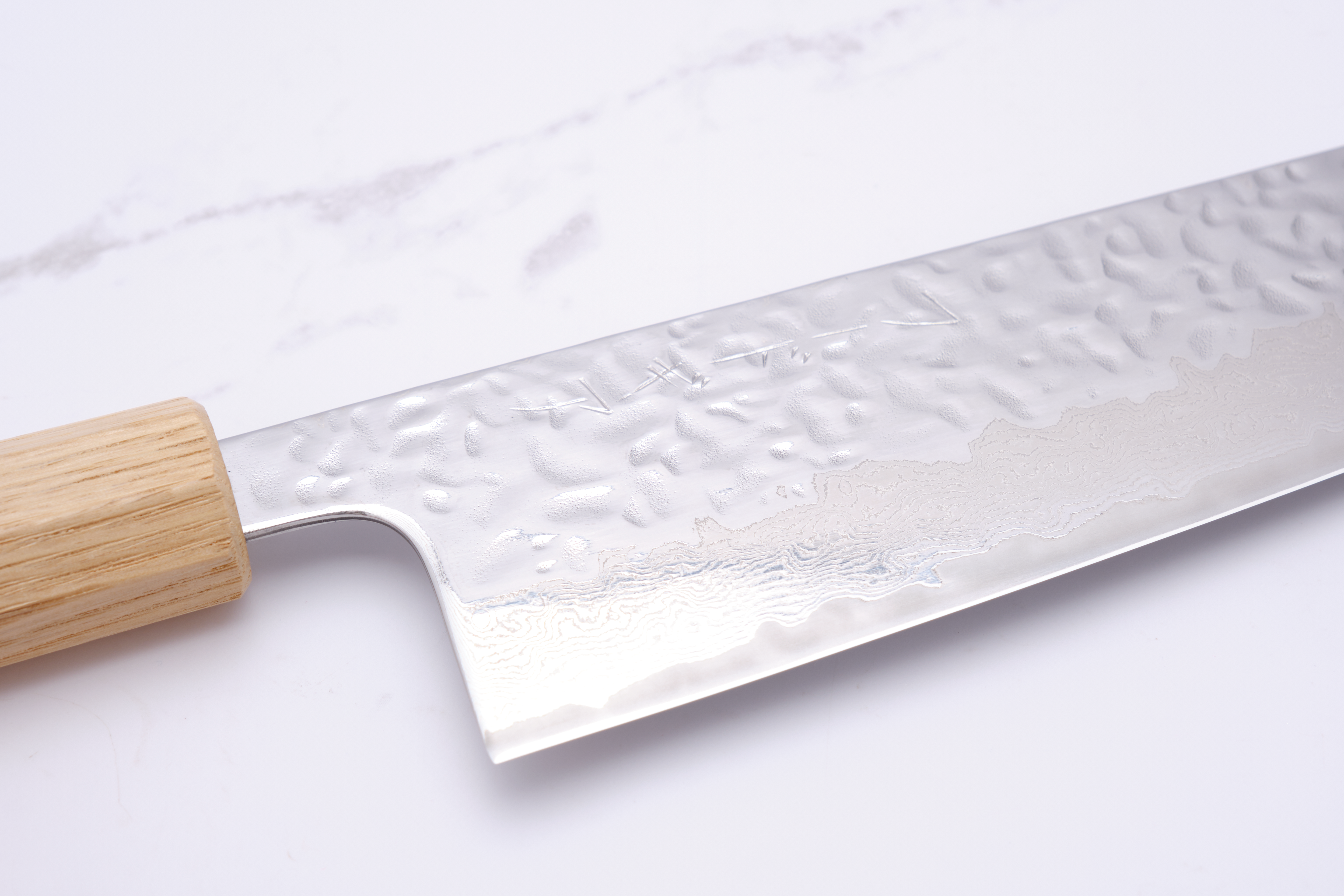 This knife is a 240mm Gyuto. It has AUS-10 in the core and surrounded with nice damascus cladding and tsuchime finish. This means that the knife is more or less rust-free, and requires minimal care compared to rust.