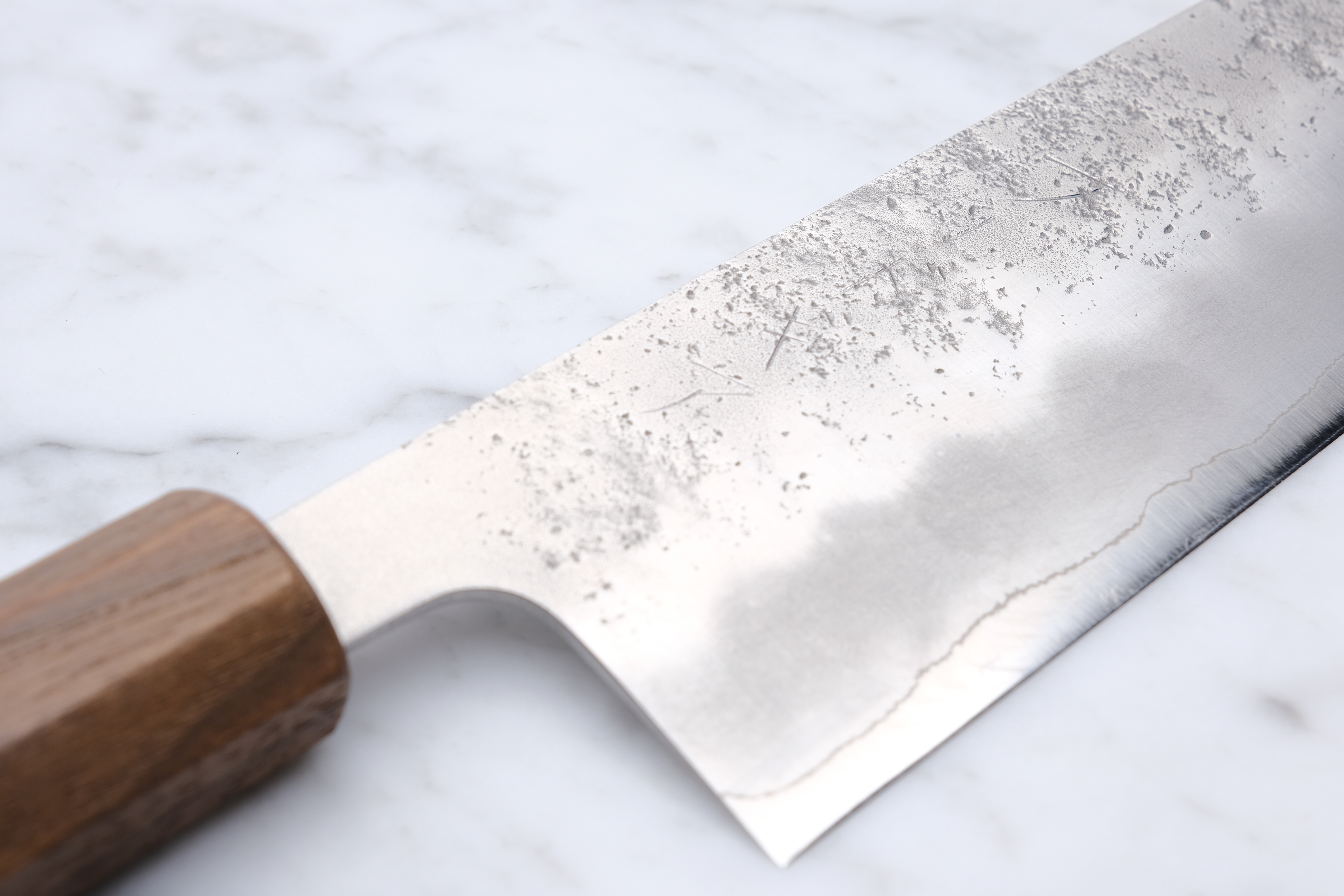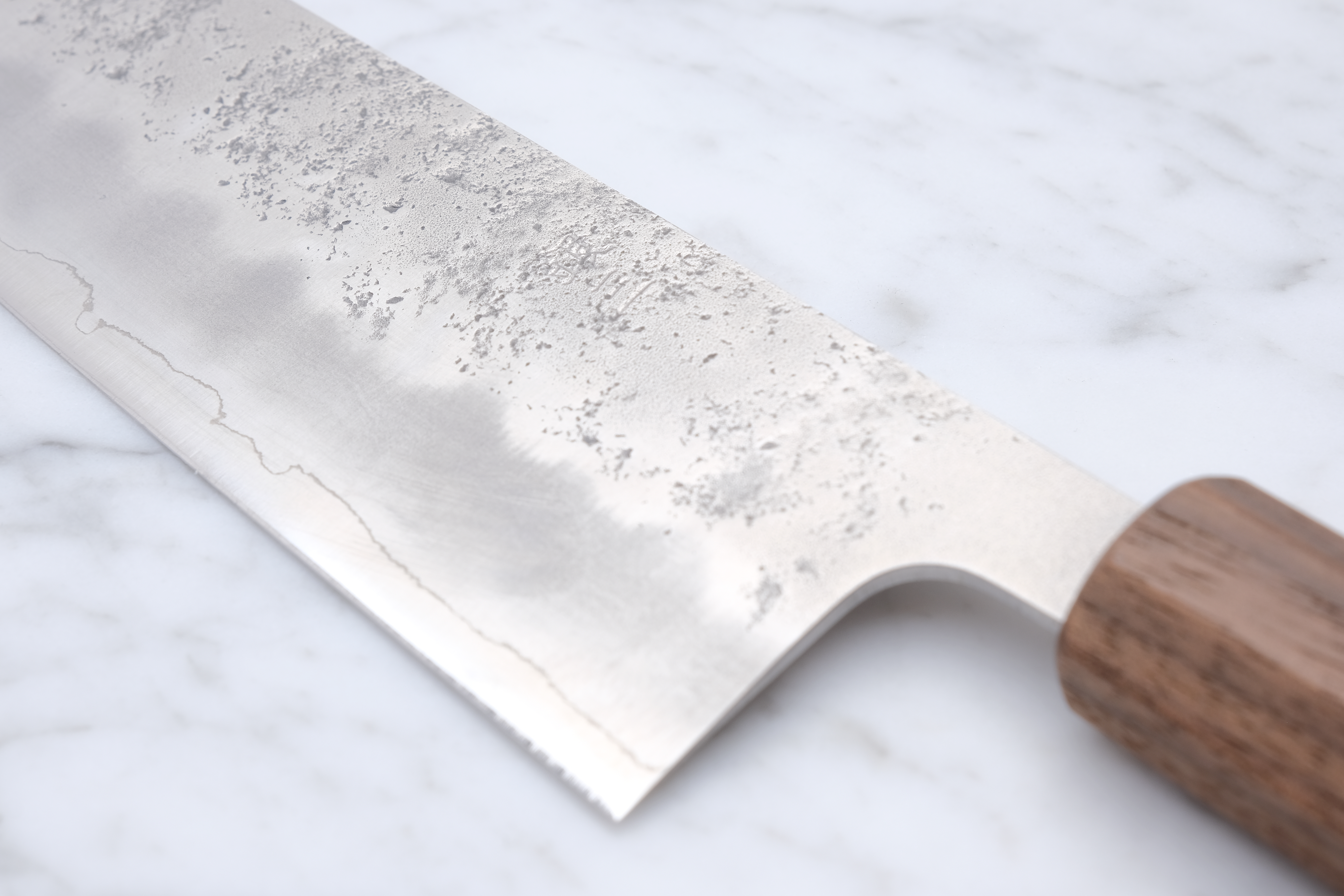 We have had 3 series made by them, each of which has been engraved 'フードギア' which is 'Foodgear' in kanji. The kanji is hand-hammered into each individual knife.