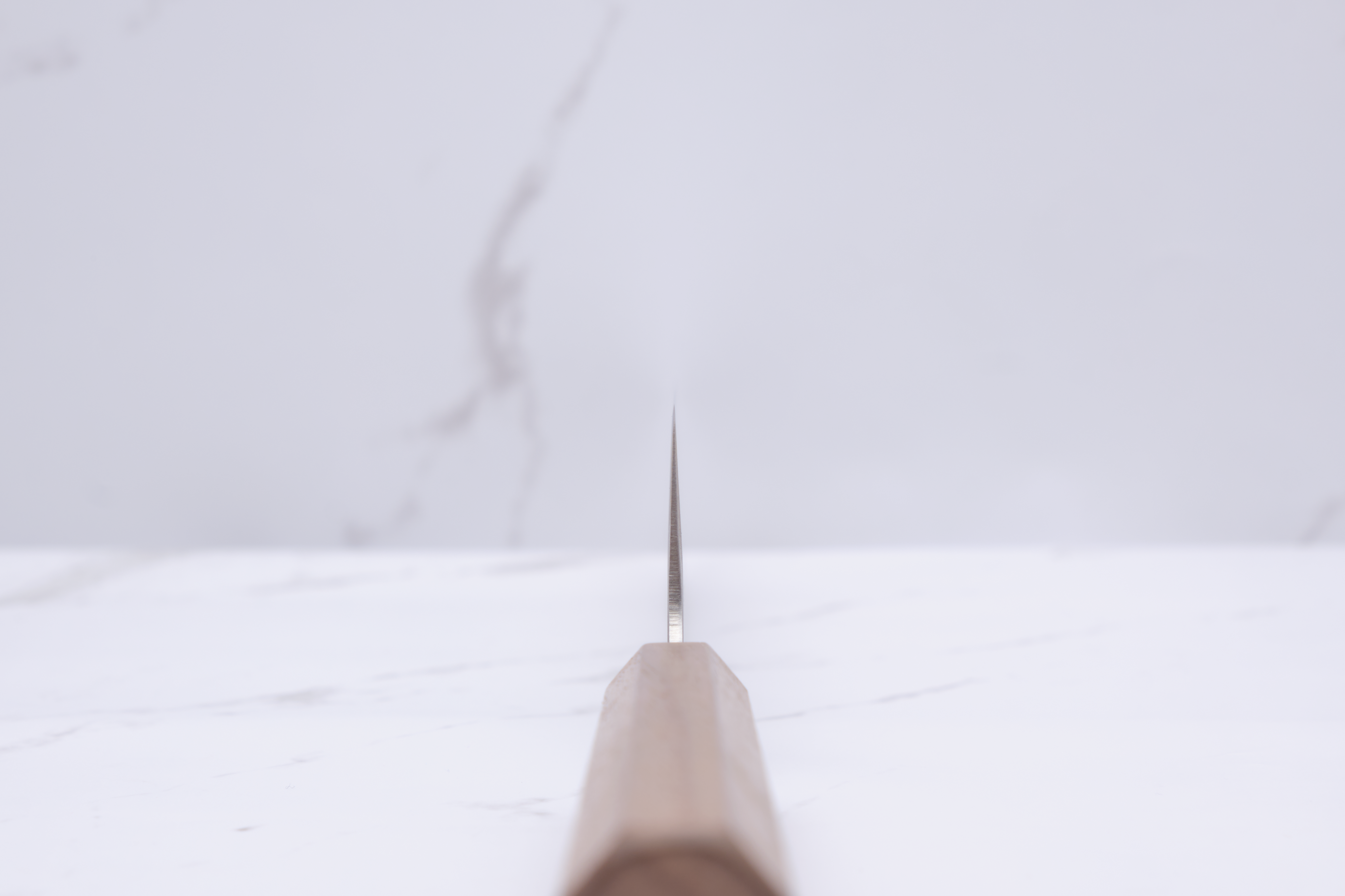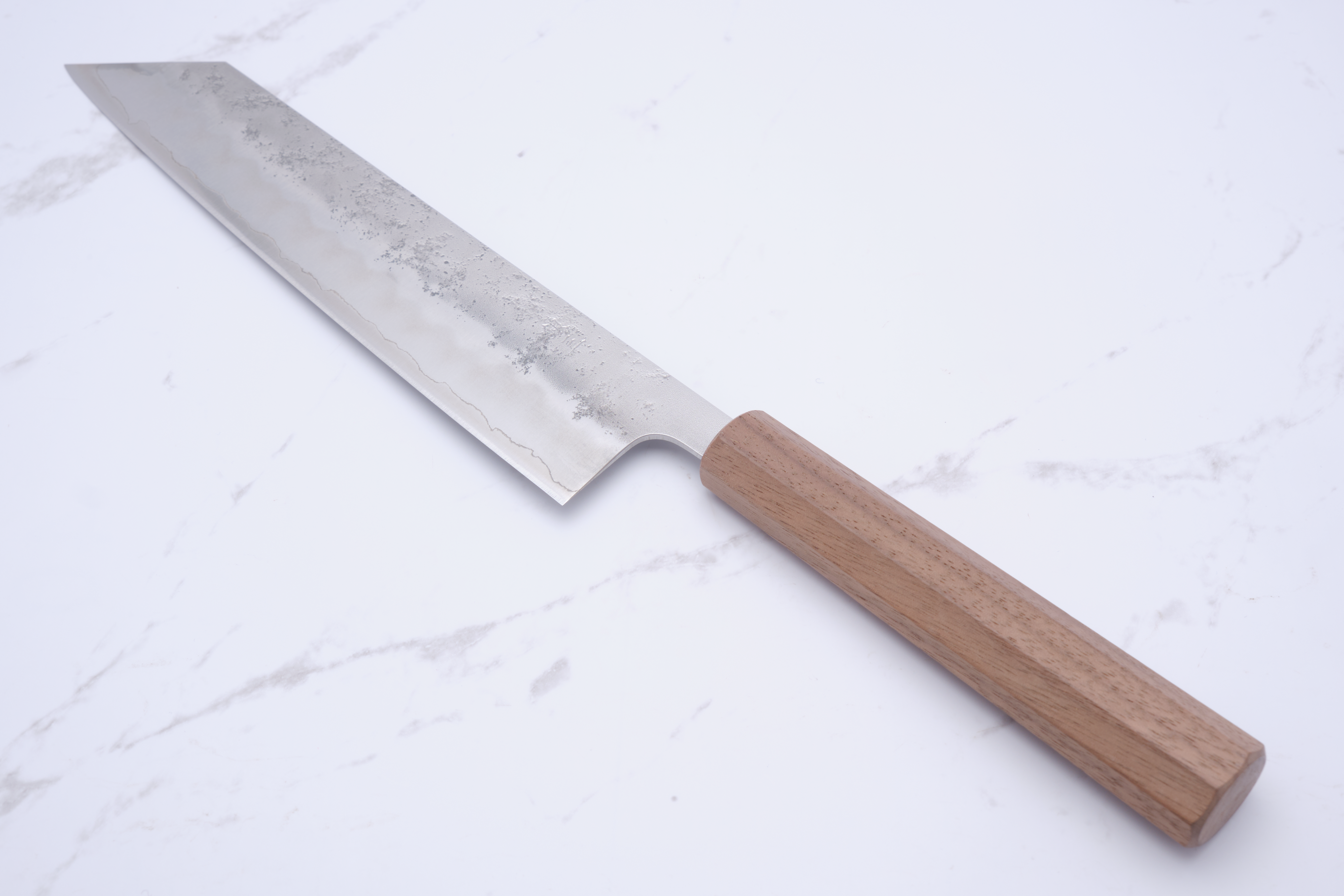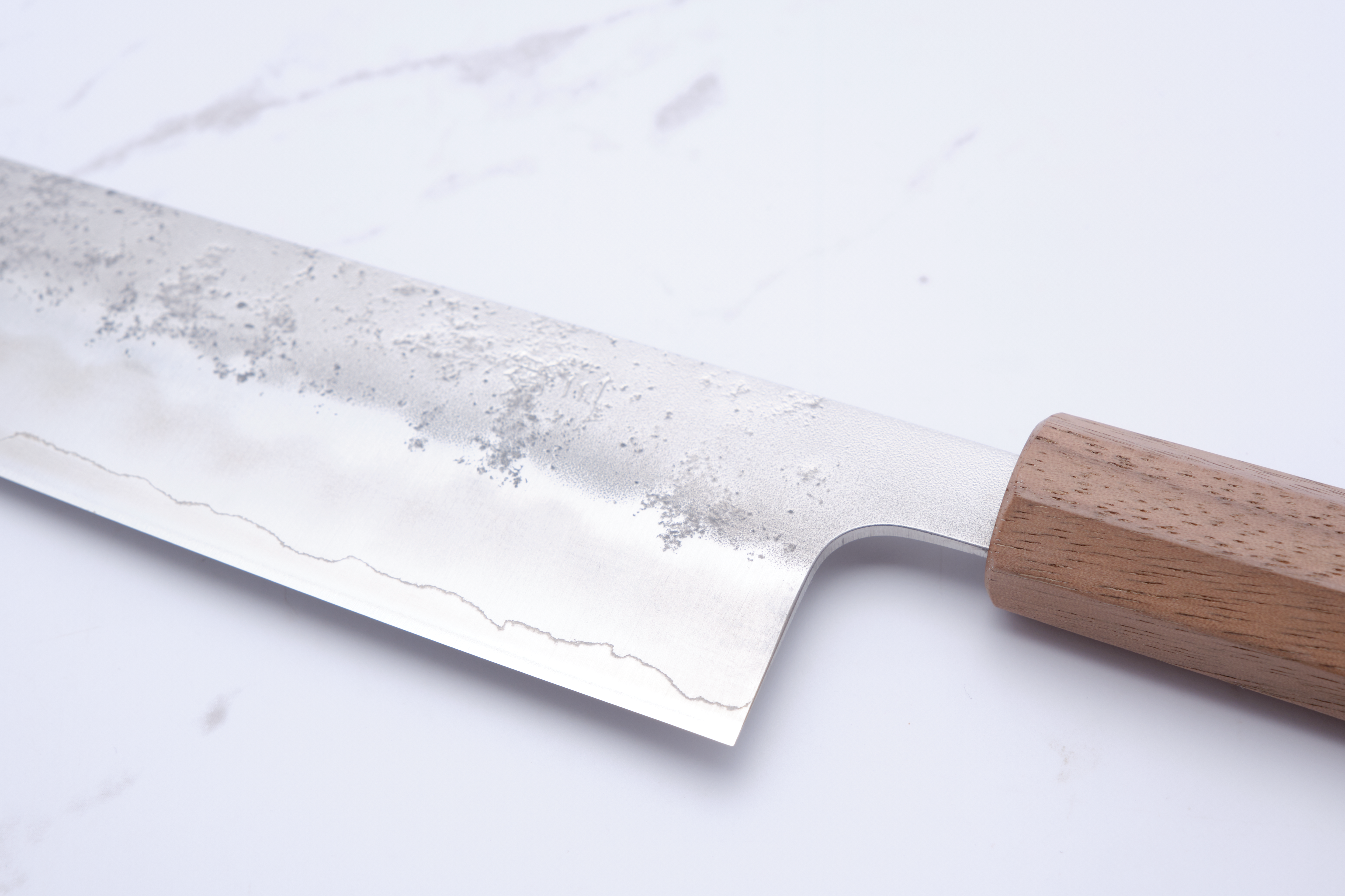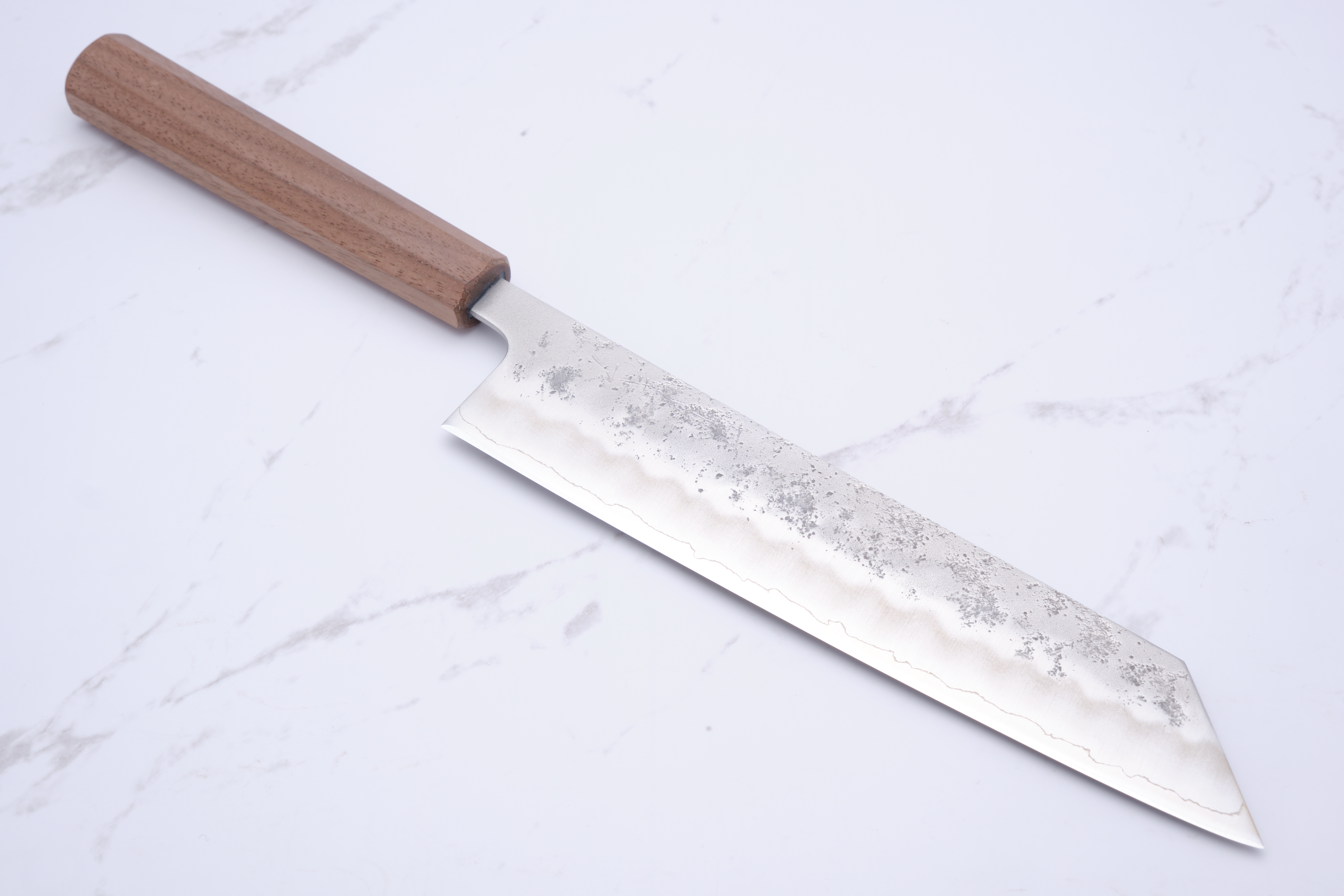 This knife is a 240mm K-Tip Gyuto made in 3 layers. It has Gin3 (Ginsan) in the core and surrounded by 2 stainless outer layers. This means that the knife is more or less rust-free, and requires minimal care compared to rust.