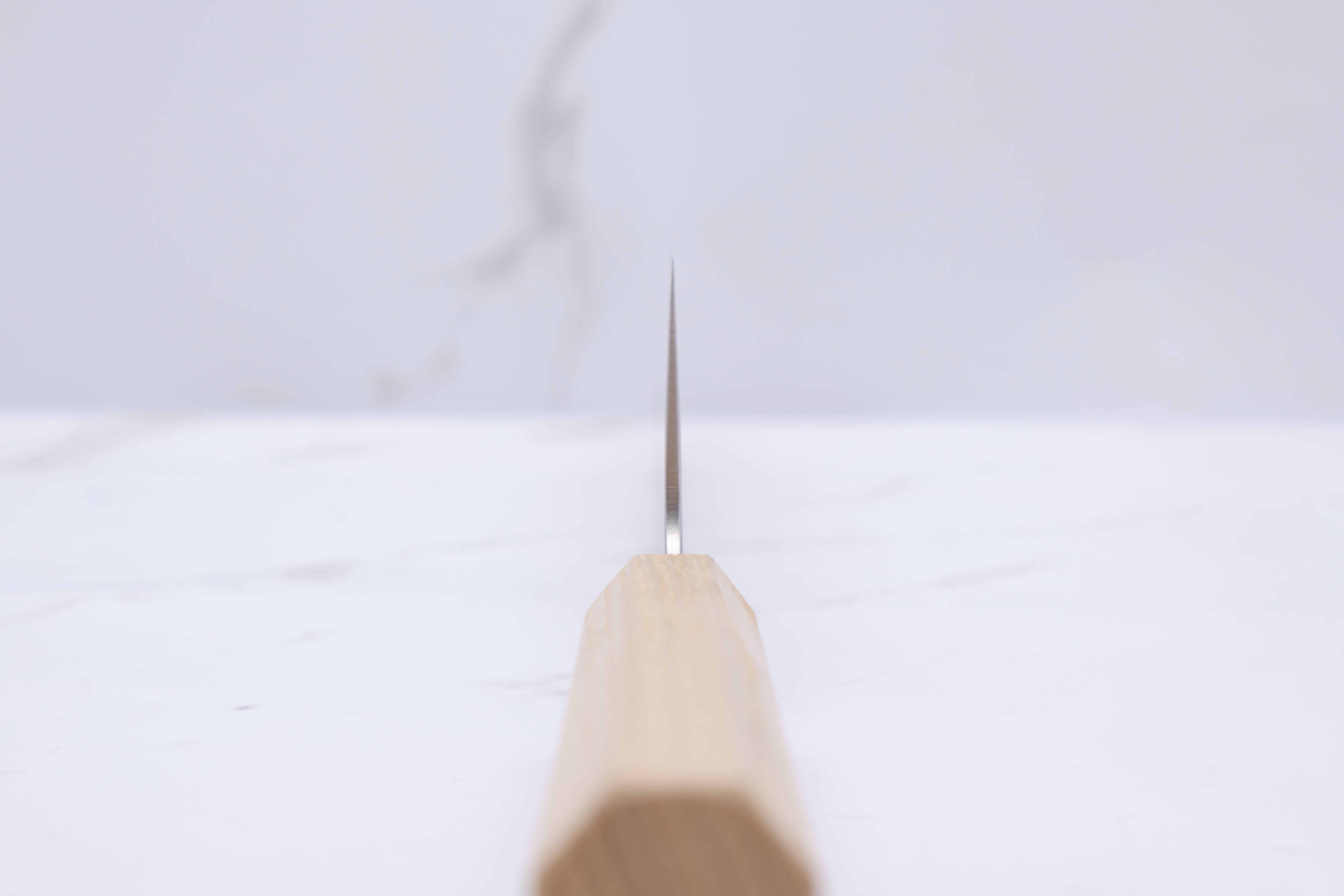 This knife is a 240mm K-Tip Gyuto made in 3 layers. It has Gin3 (Ginsan) in the core and surrounded by 2 stainless outer layers. This means that the knife is more or less rust-free, and requires minimal care compared to rust.