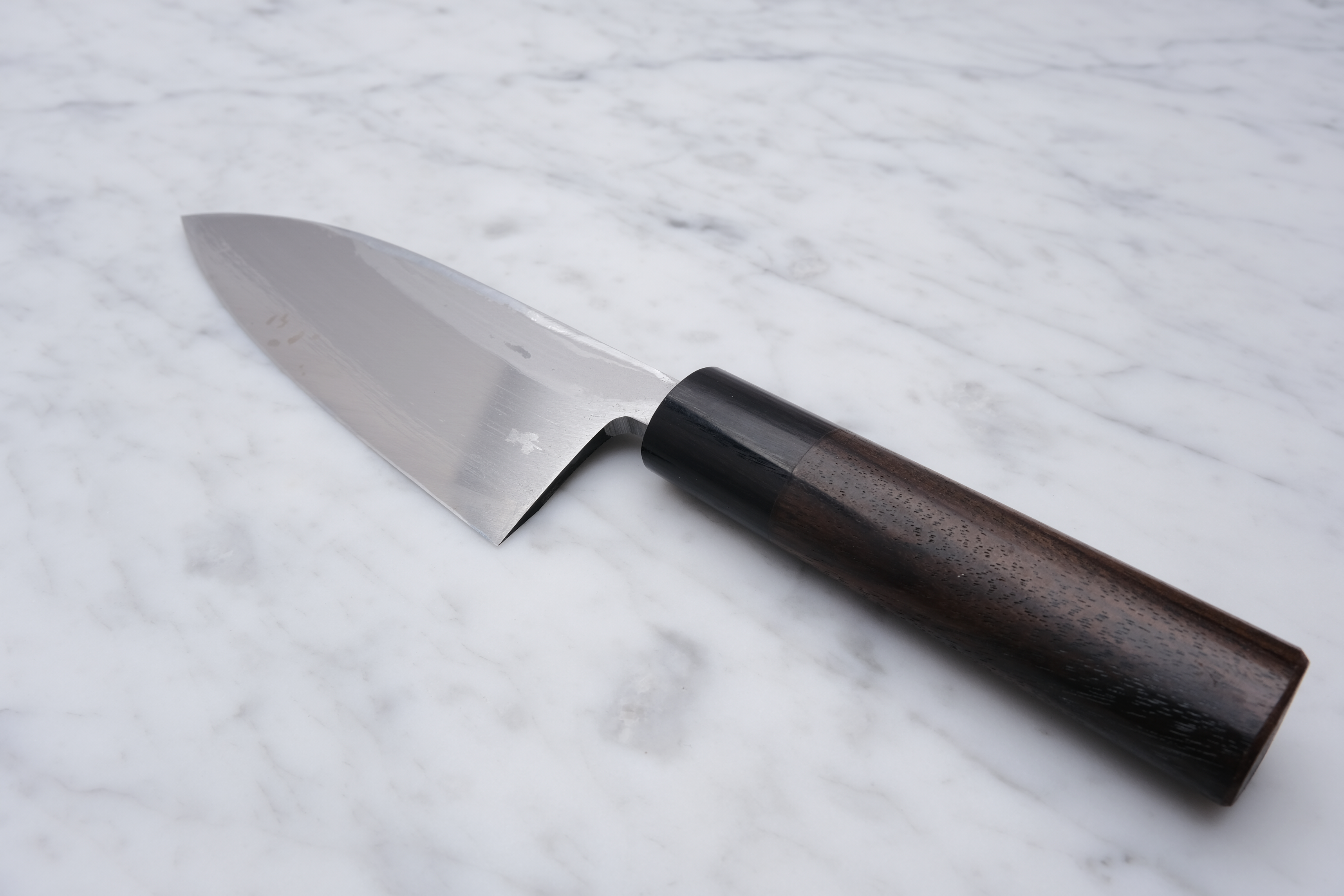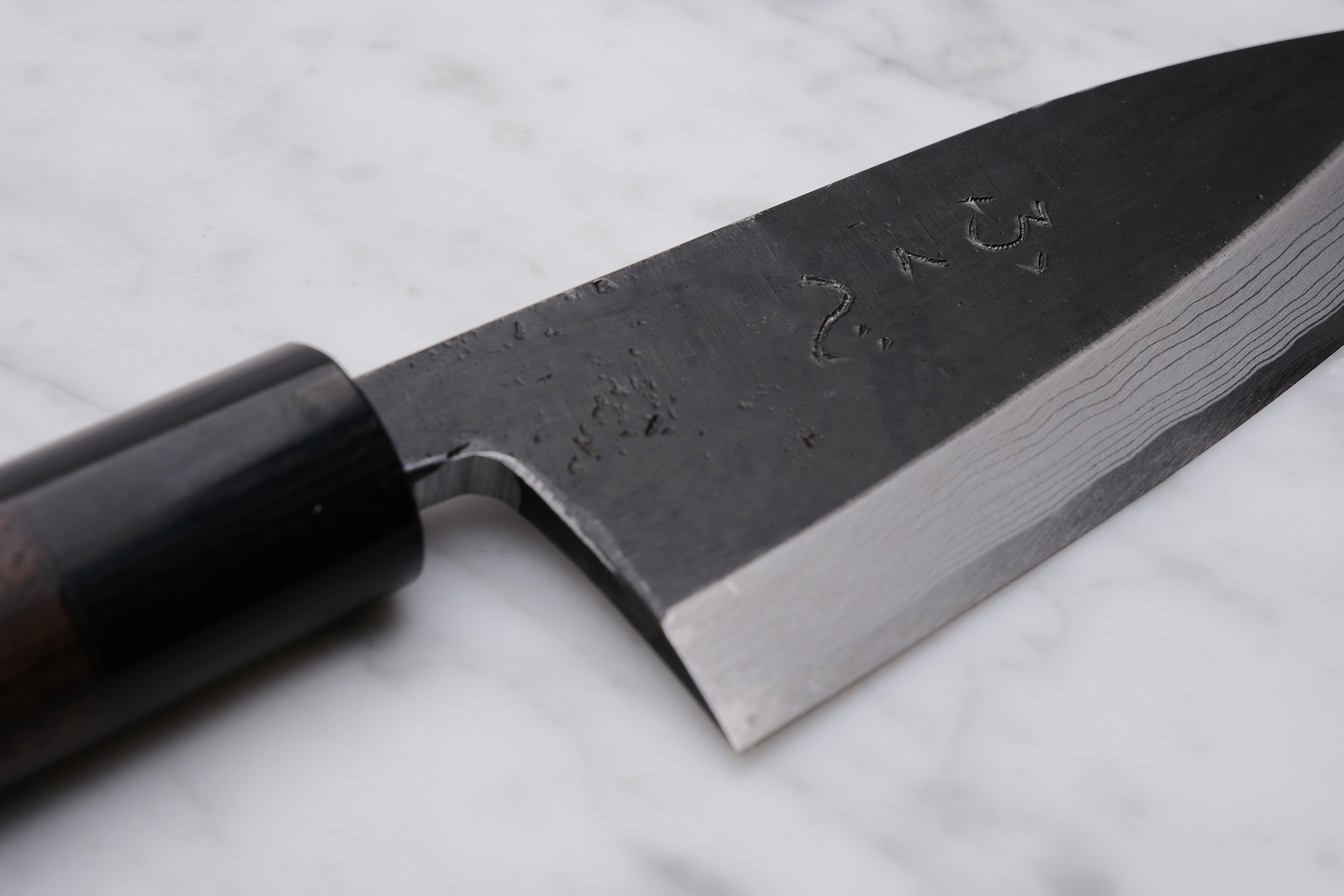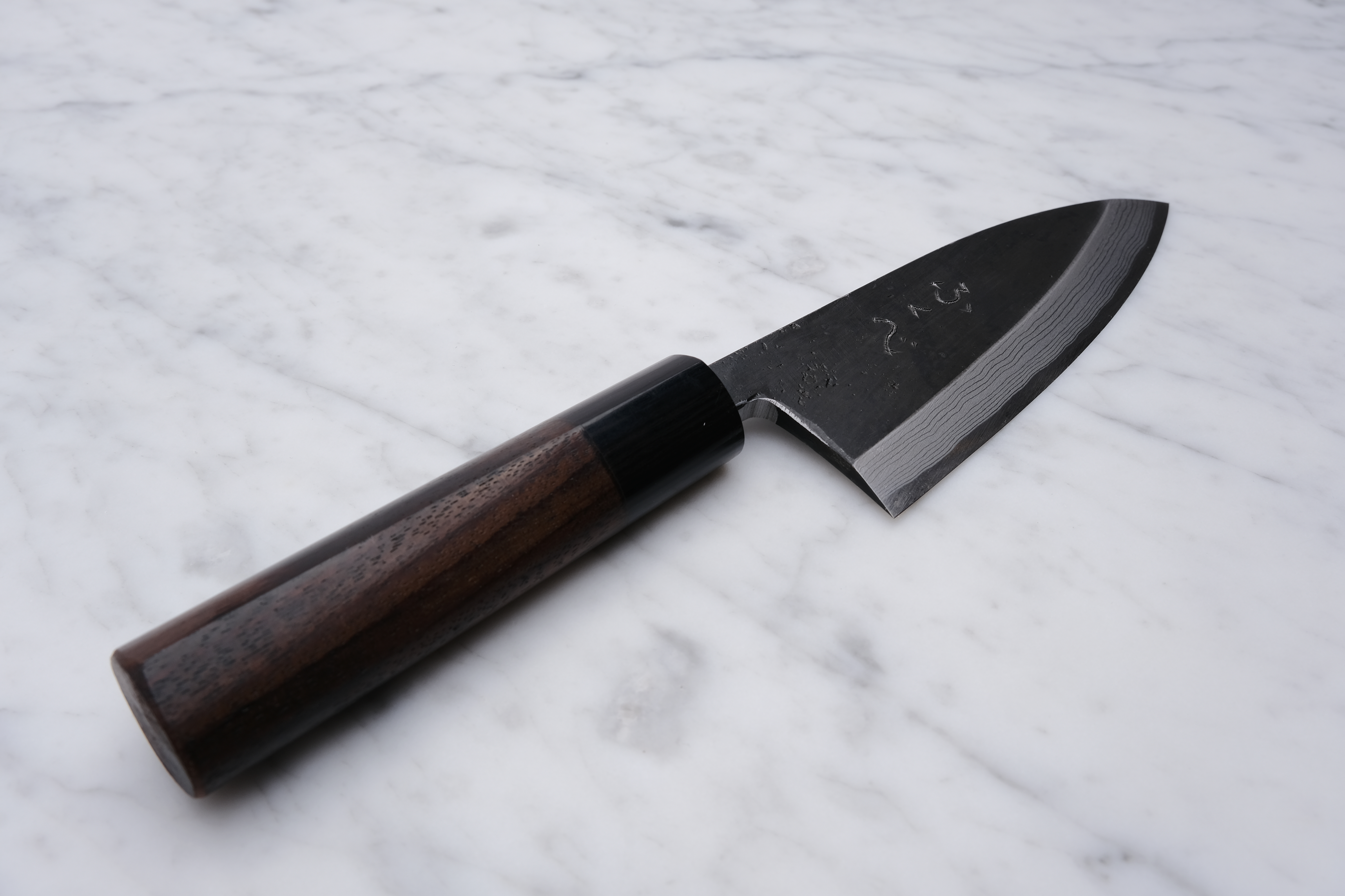 The knives are finished with a rustic kurouchi finish, and a damask cladding further towards the edge. The handle is a D-shaped (shinogi) type handle for right-handed users, made of sandalwood with a dark pakkawood ferrule.