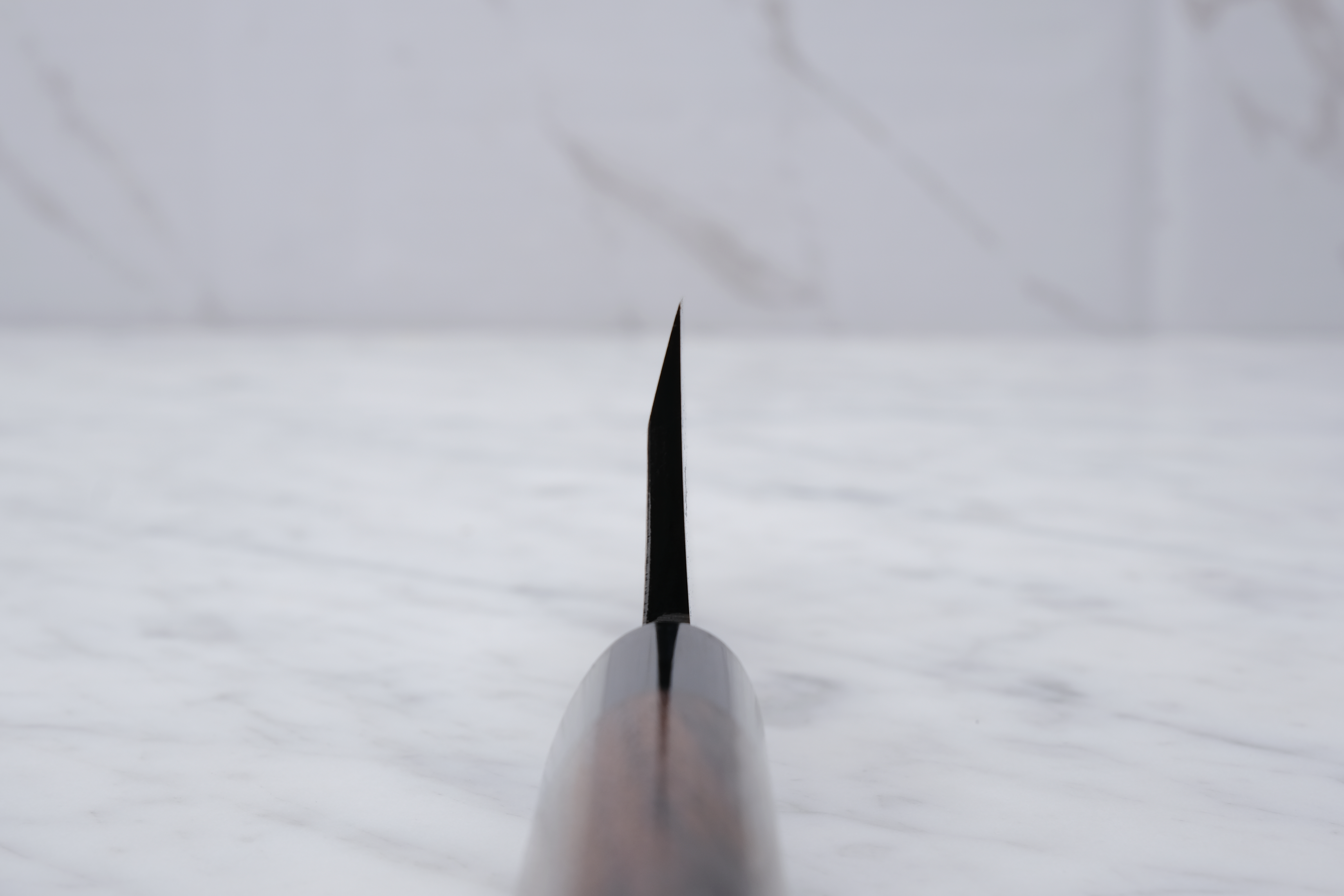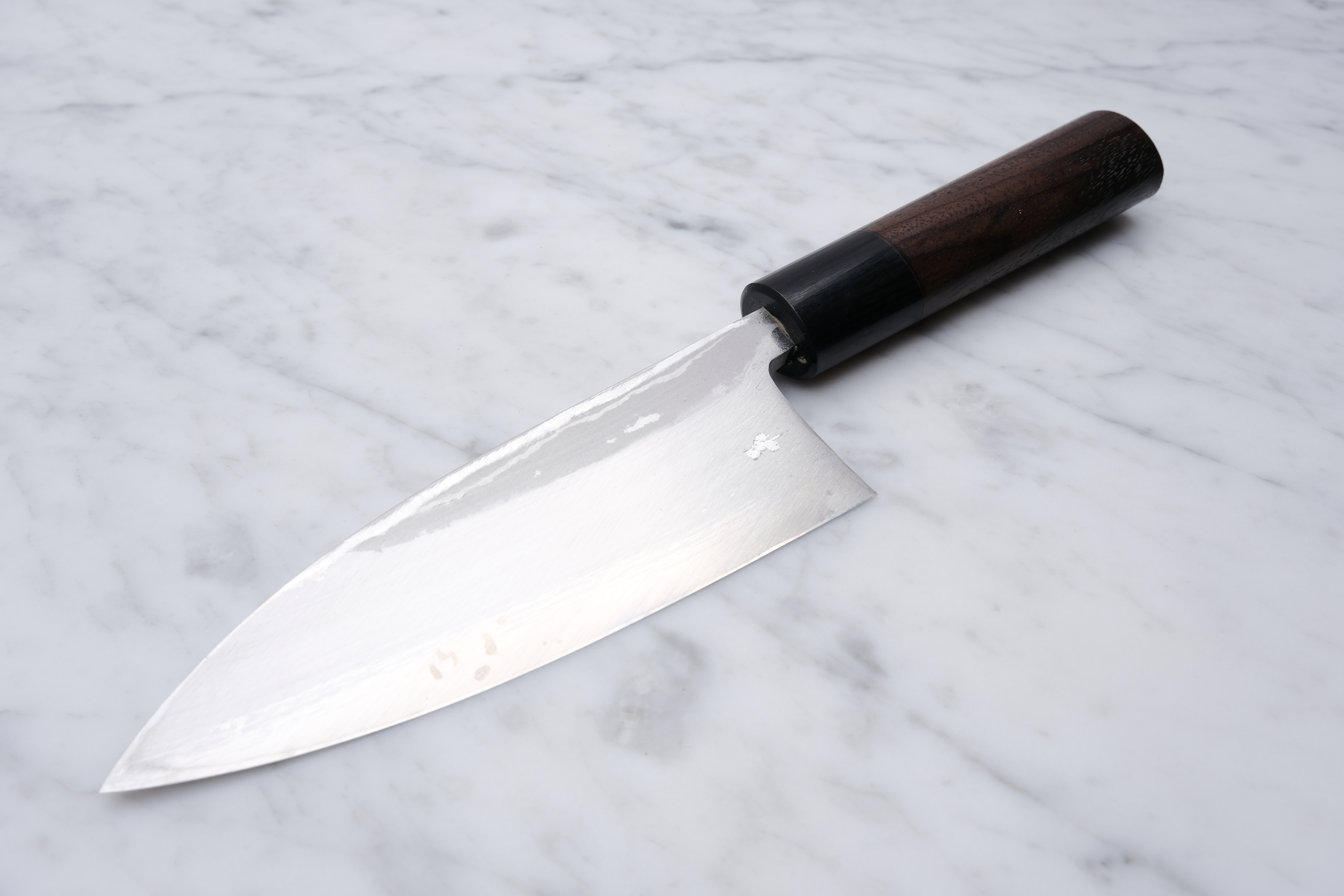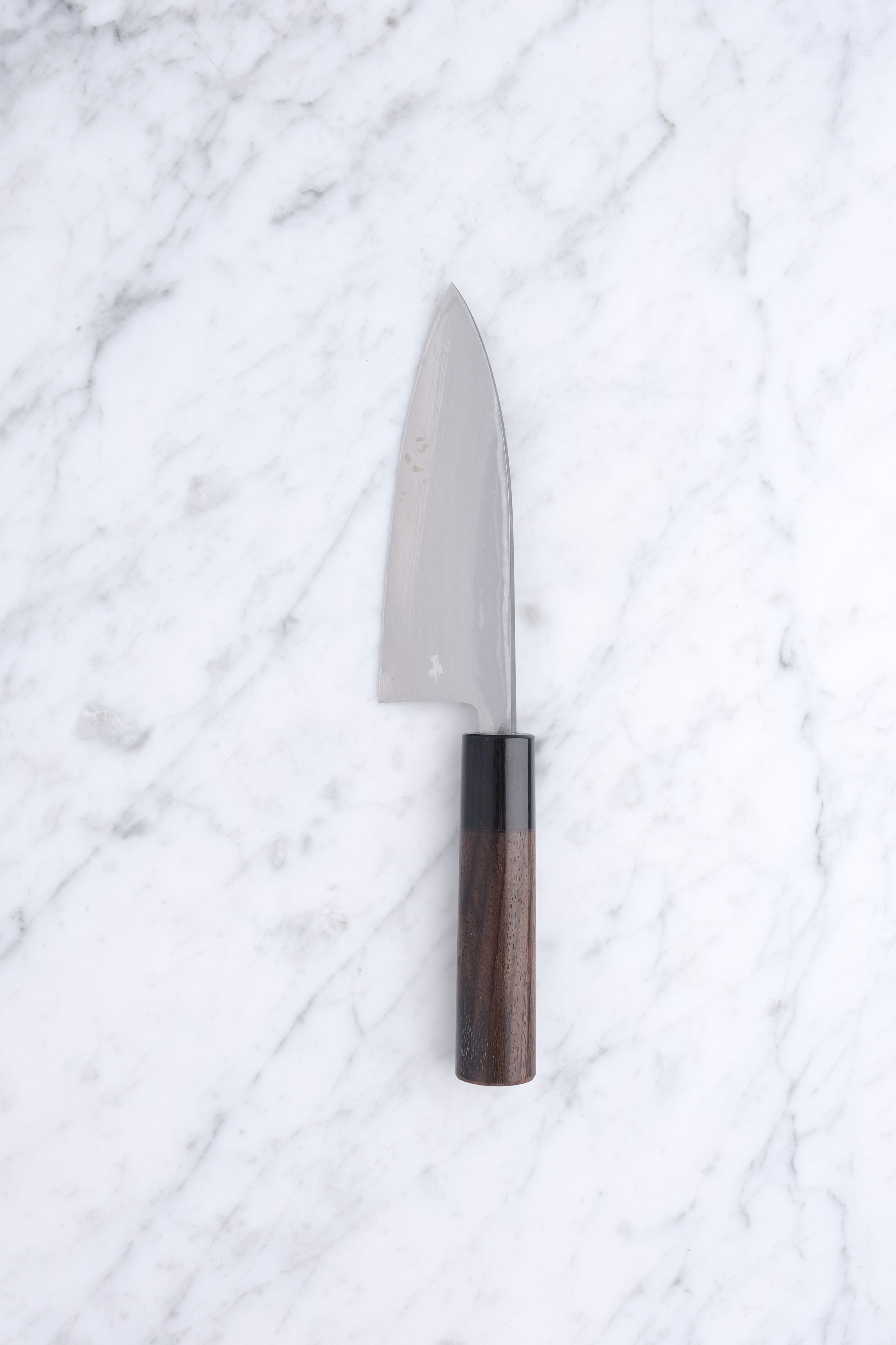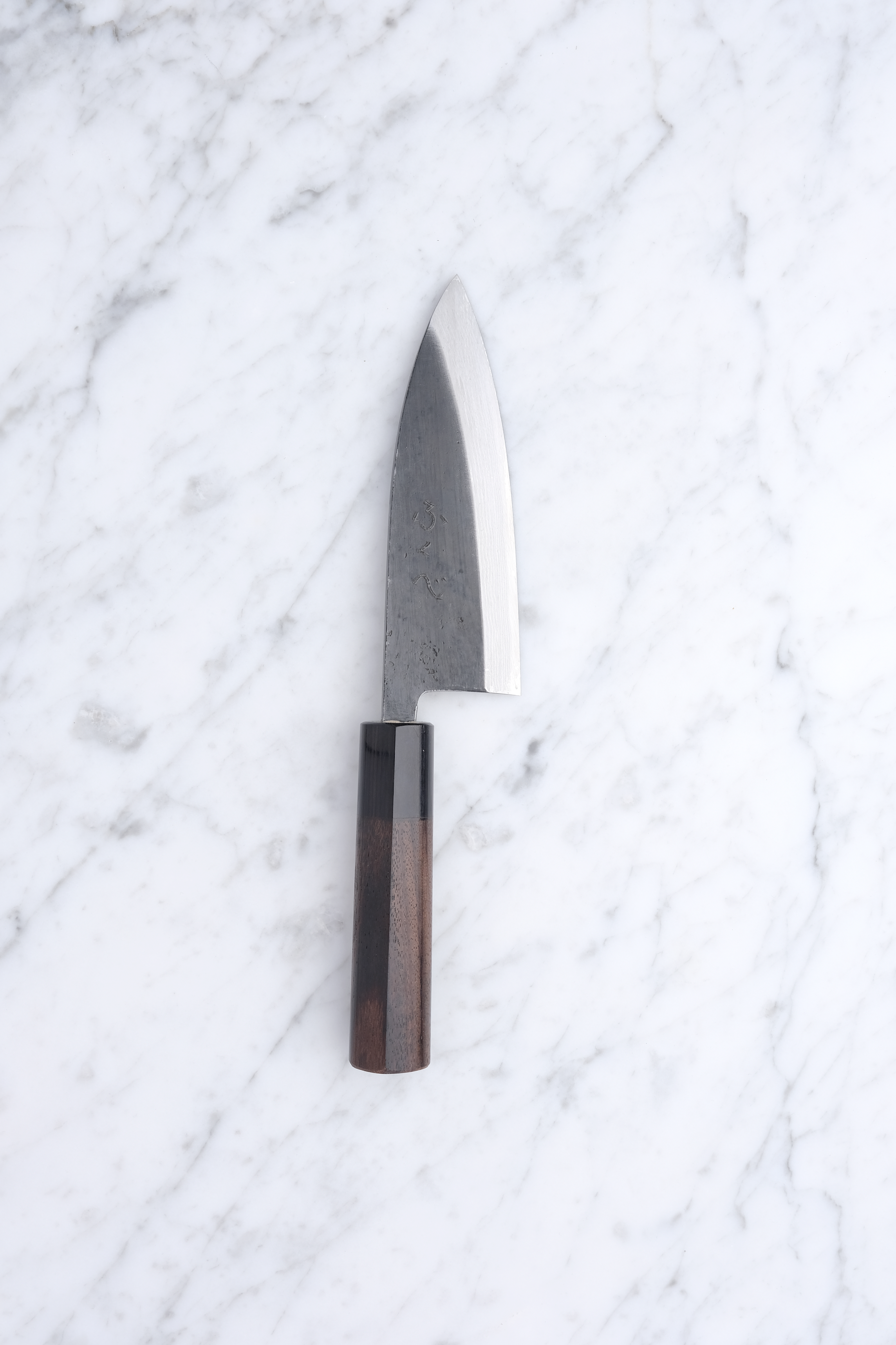The knives are finished with a rustic kurouchi finish, and a damask cladding further towards the edge. The handle is a D-shaped (shinogi) type handle for right-handed users, made of sandalwood with a dark pakkawood ferrule.