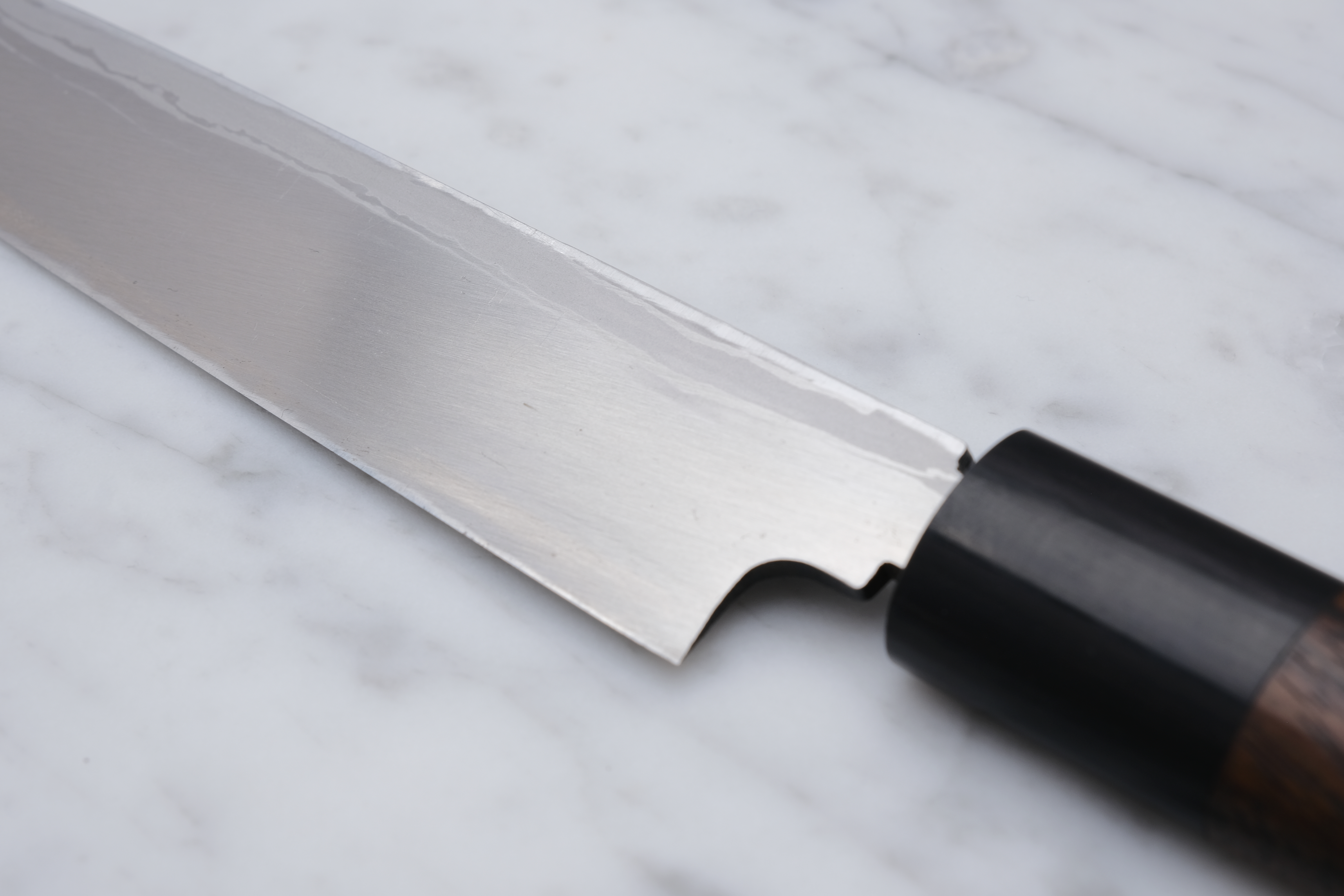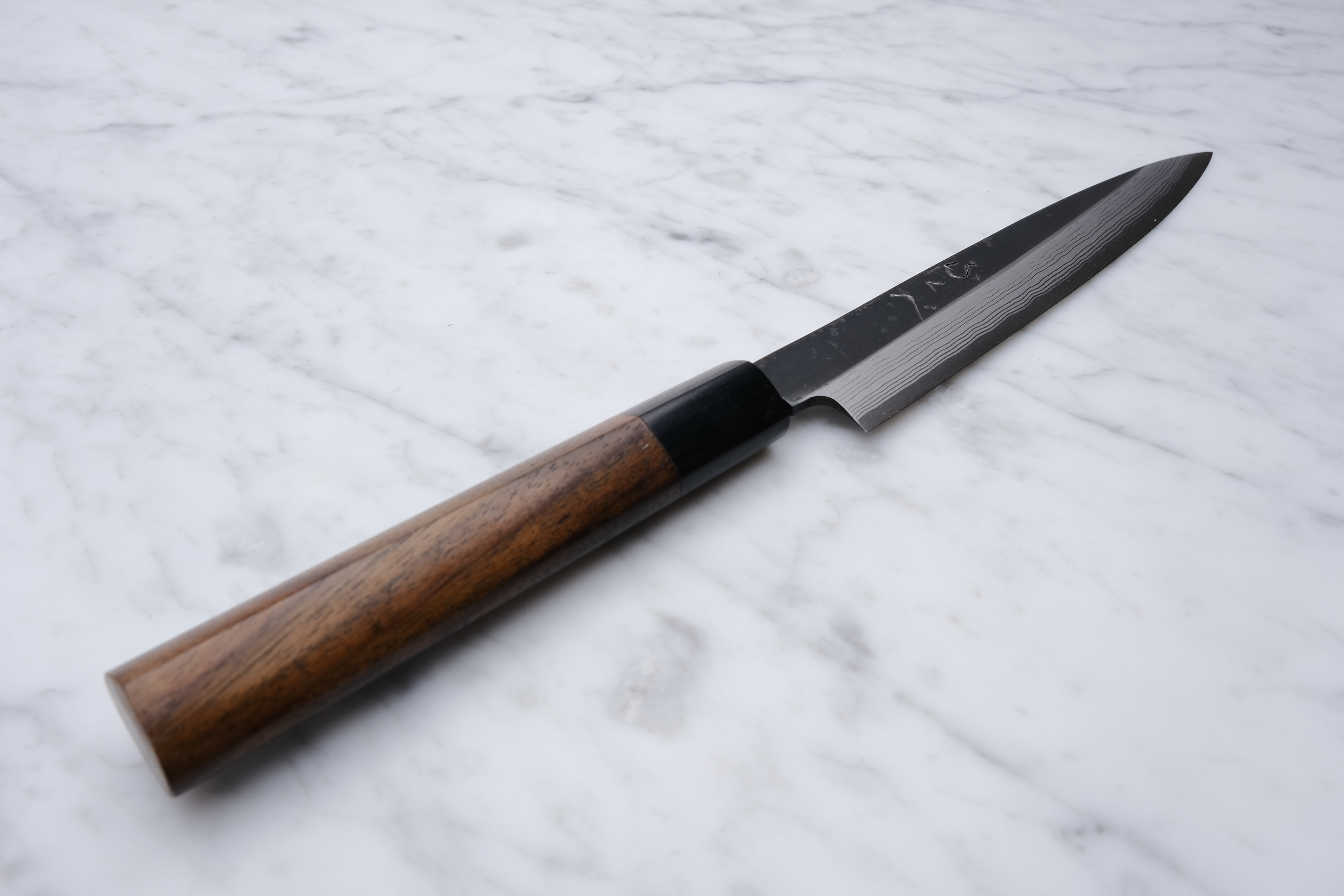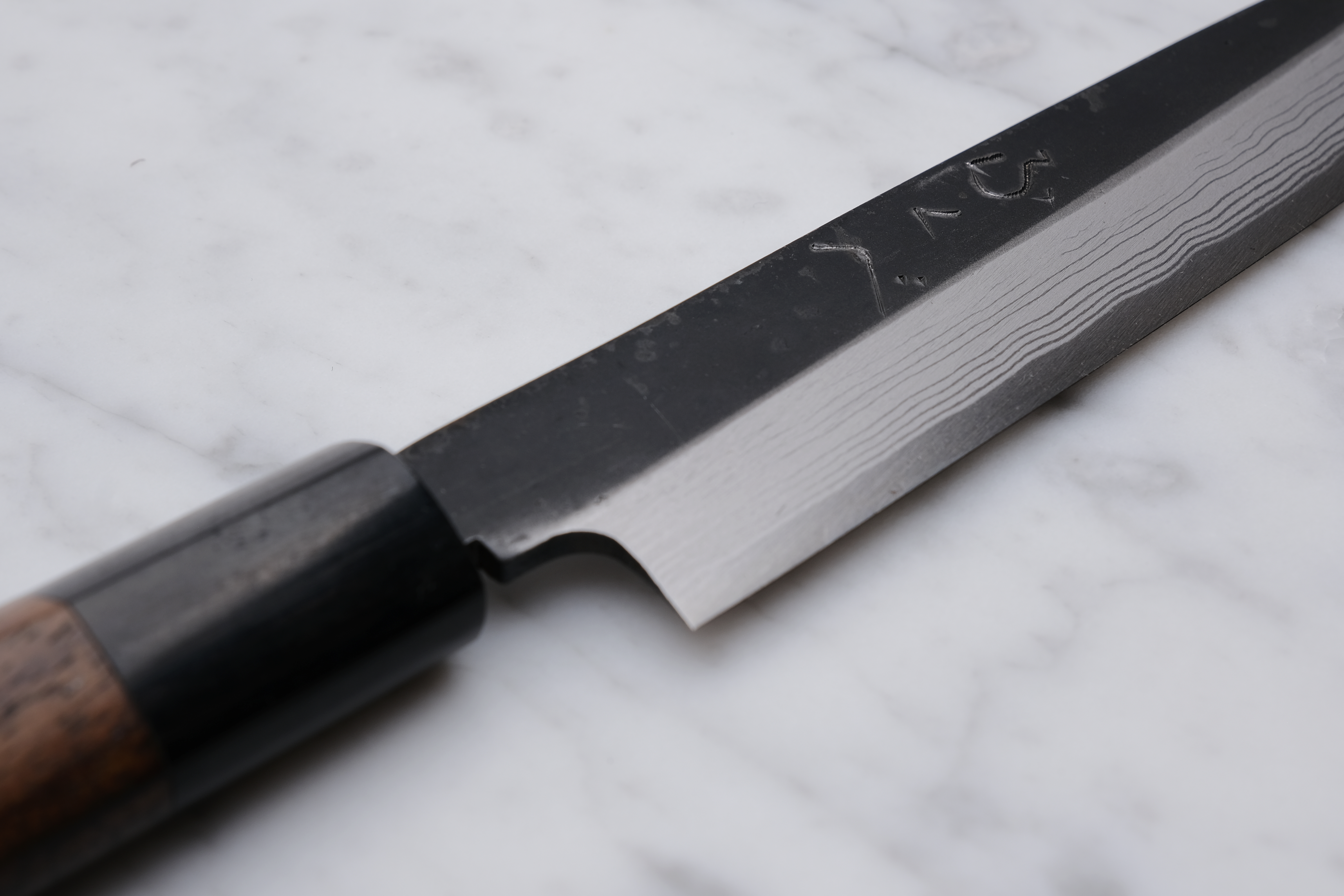 The knives are finished with a rustic kurouchi finish, and a damask cladding further towards the edge. The handle is a D-shaped (shinogi) type handle for right-handed users, made of sandalwood with a dark pakkawood ferrule.