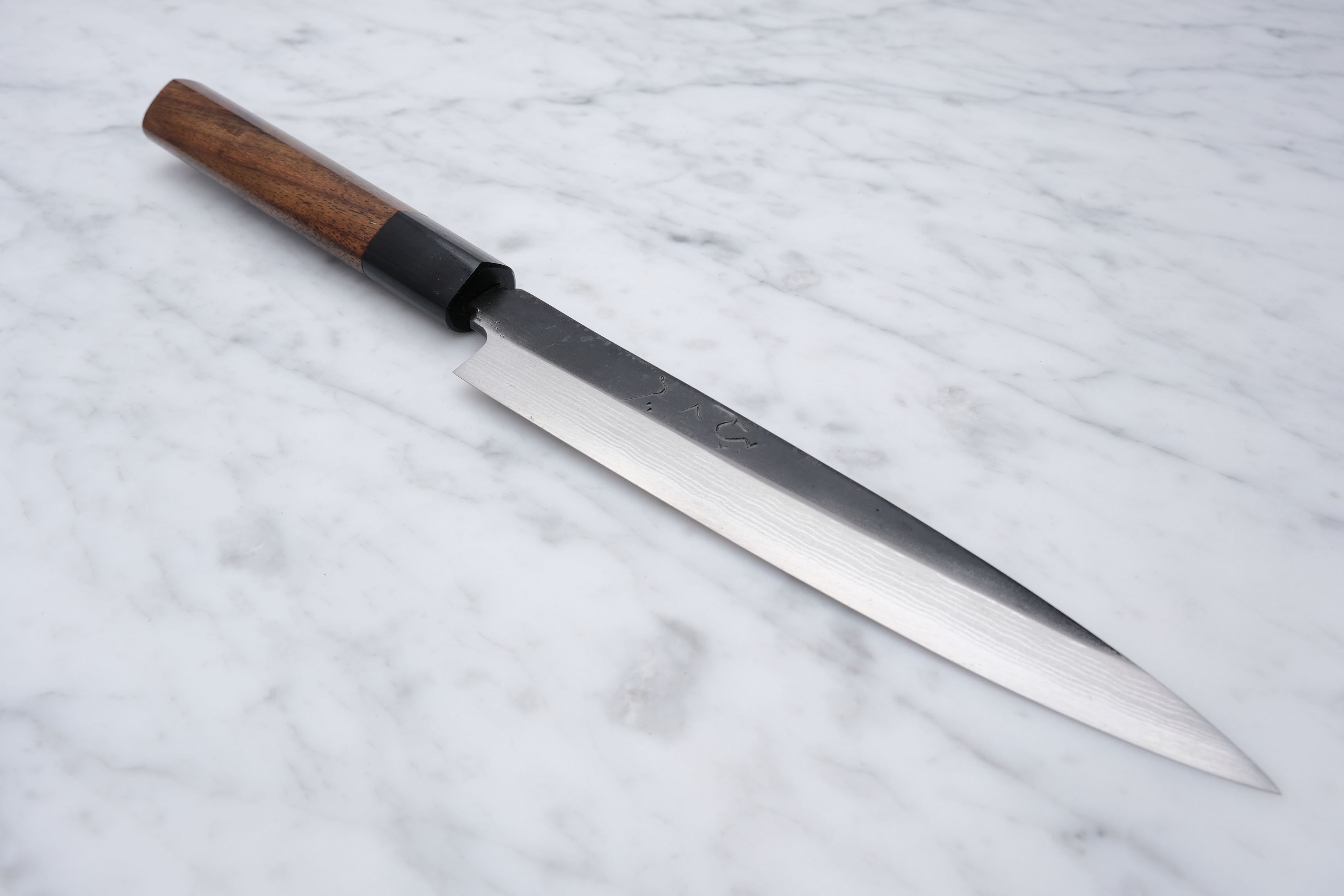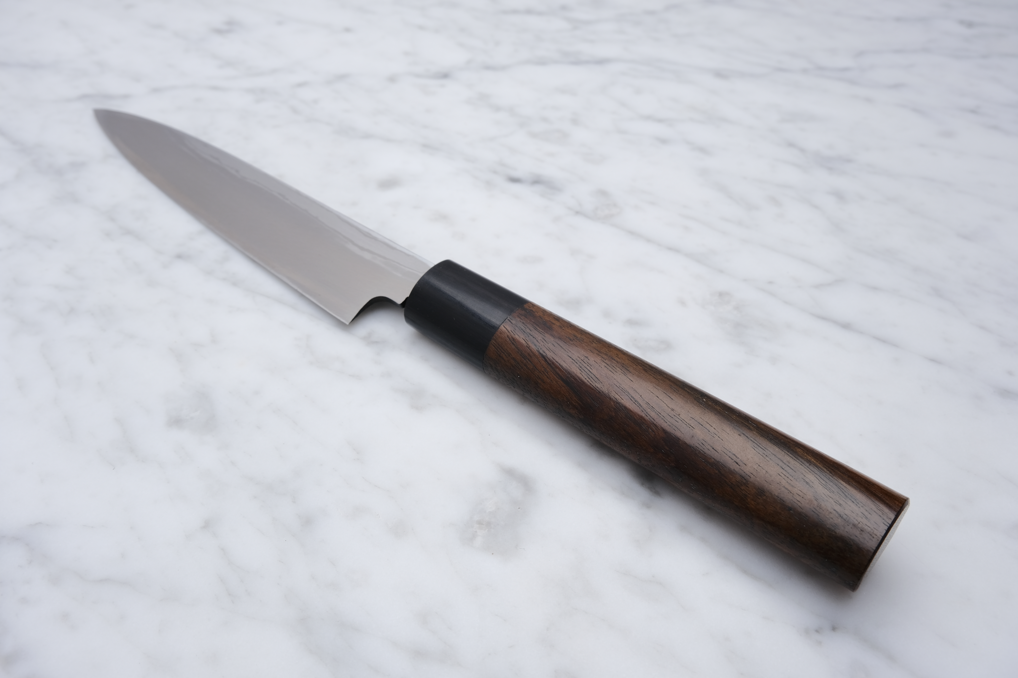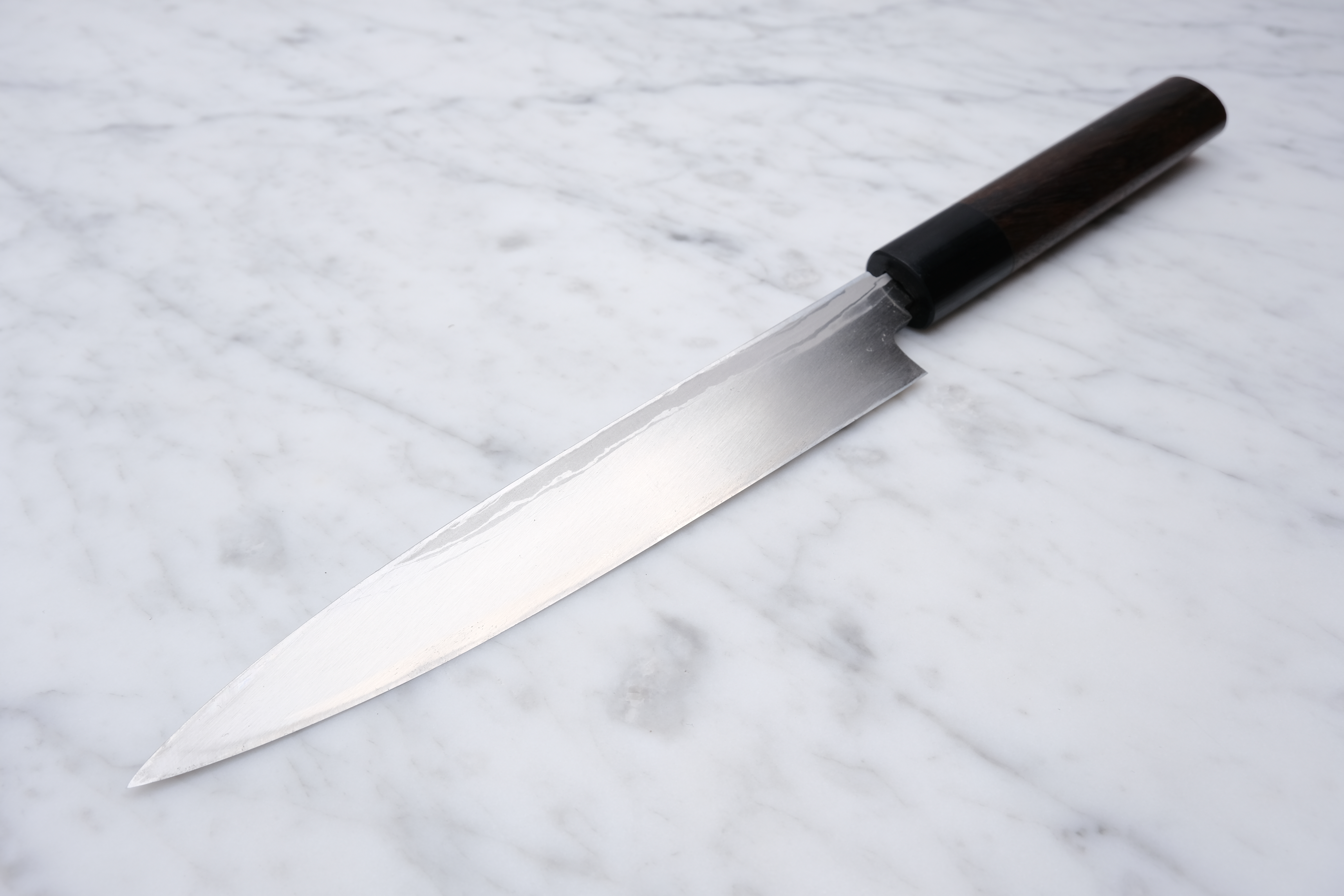 The knives are finished with a rustic kurouchi finish, and a damask cladding further towards the edge. The handle is a D-shaped (shinogi) type handle for right-handed users, made of sandalwood with a dark pakkawood ferrule.