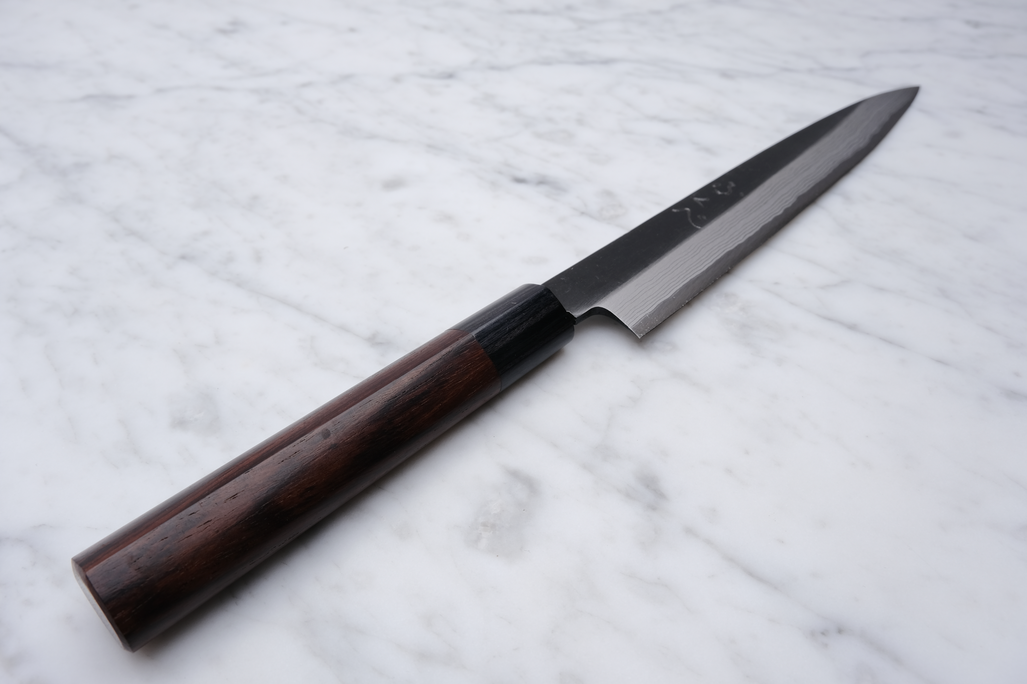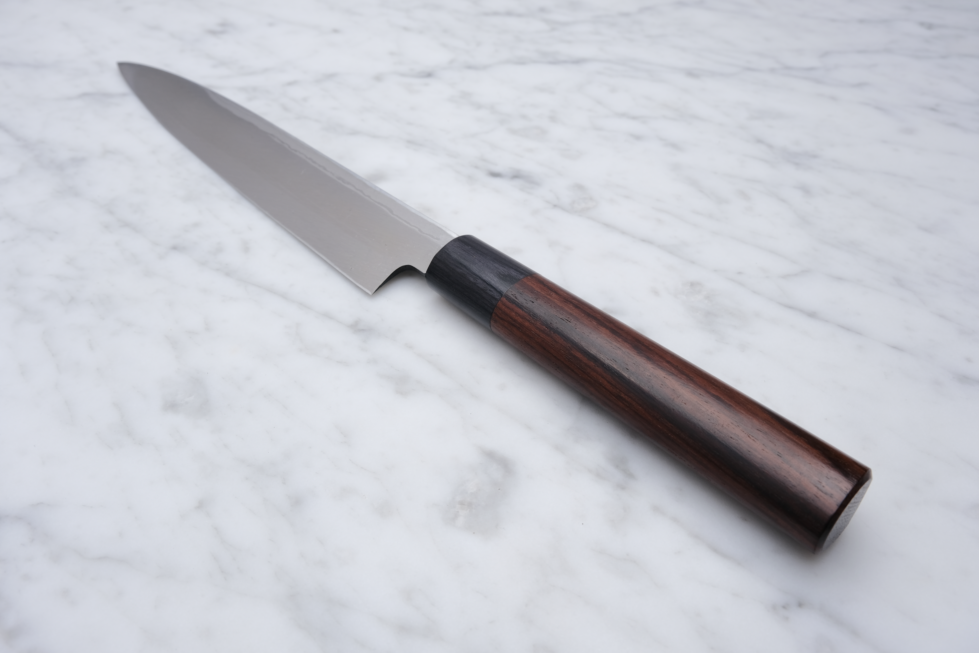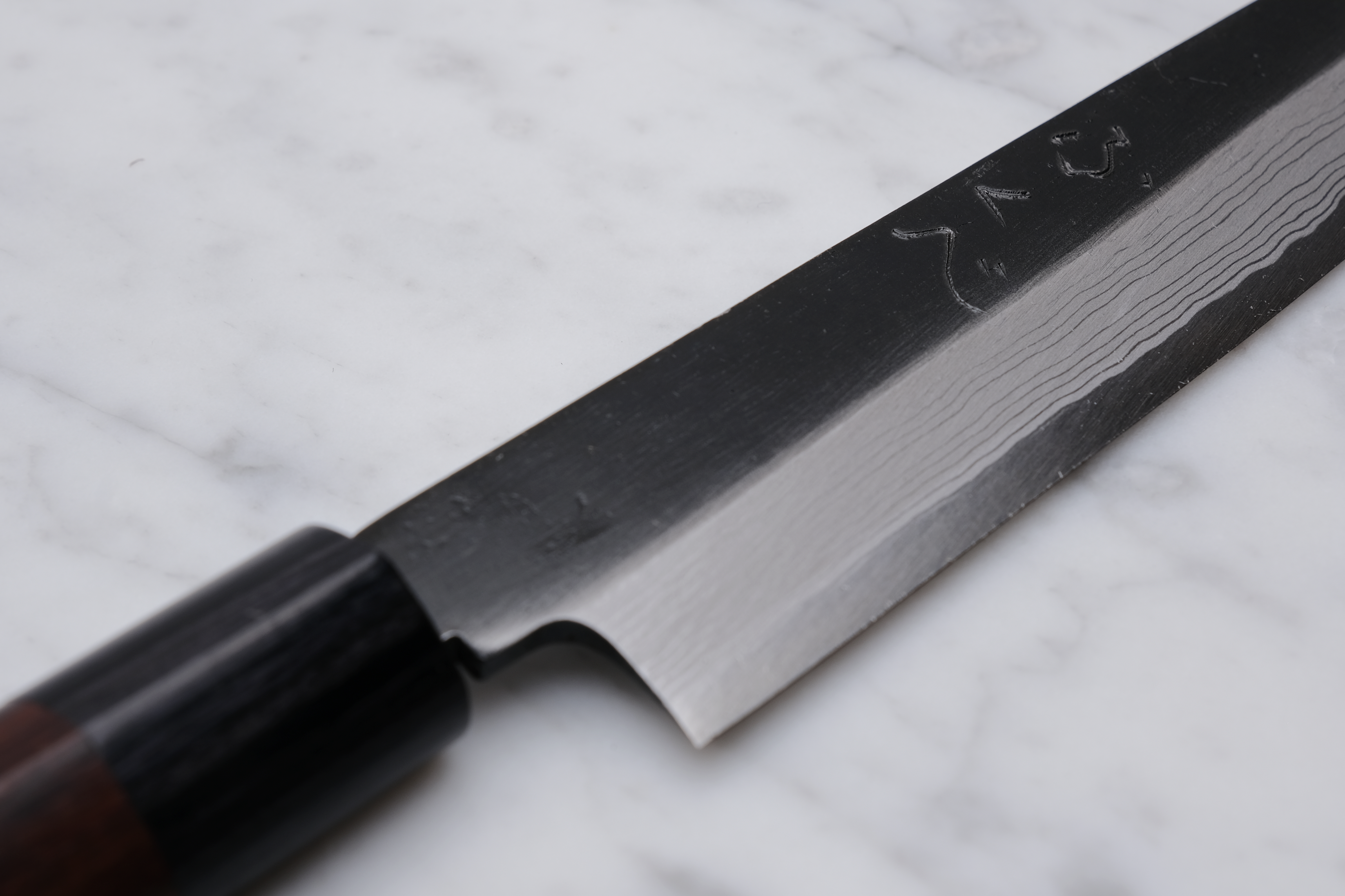 The knives feature a rustic kurouchi finish, and a damask cladding further towards the edge. The handle is a D-shaped (shinogi) type handle for the right hand, made of sandalwood with a dark pakkawood ferrule.