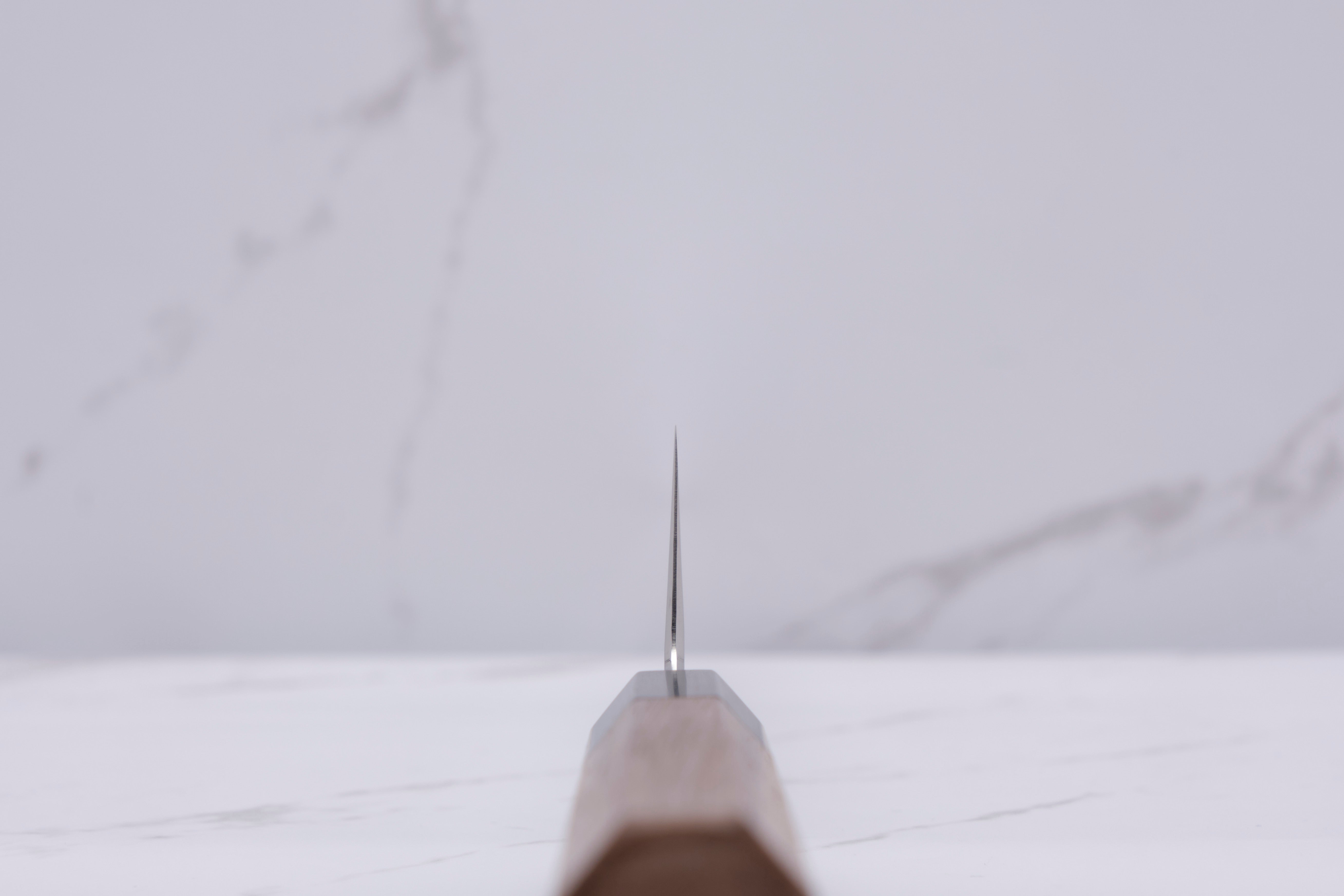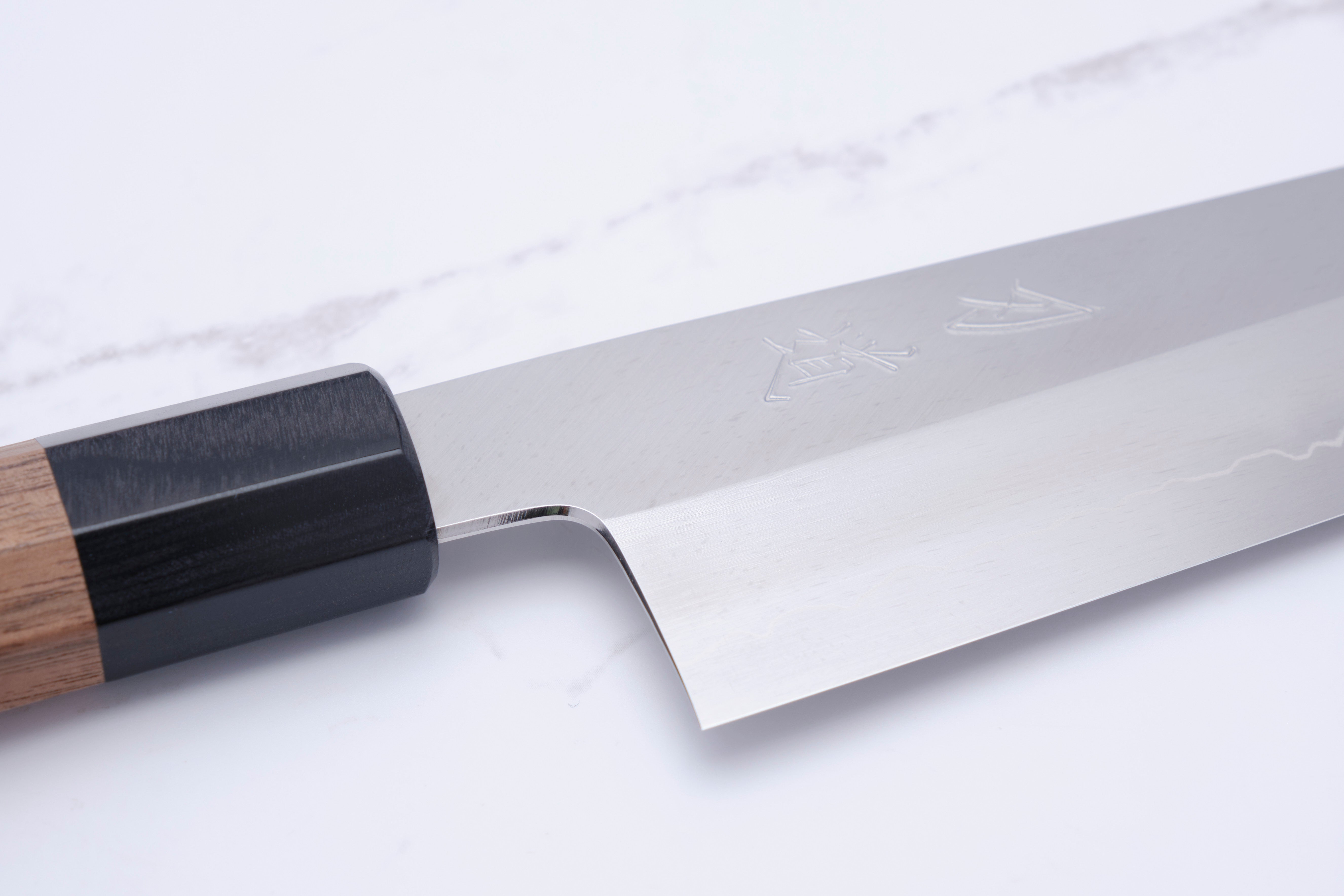 These knives are forged Shogou Yamatsuka and sharpened by Tadataka Maruyuma. Yamatsuka-san forges the knives in 3 layers, Ginsan in the core surrounded by stainless outer layers. The Ginsan steel was created to cut like carbon steel, without all the maintenance. They therefore take quite a bit of time and are easy to grind up, but they do not rust.