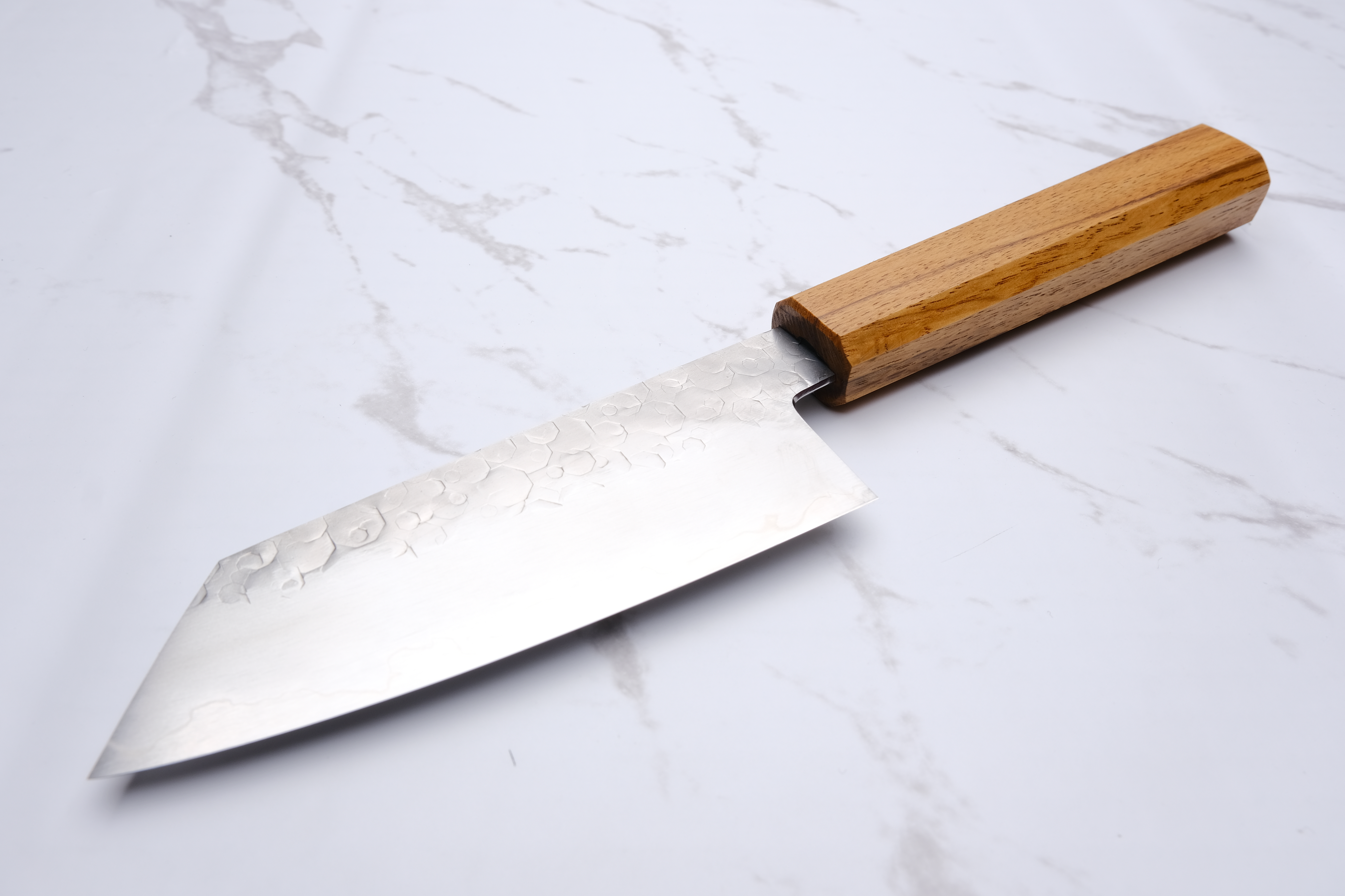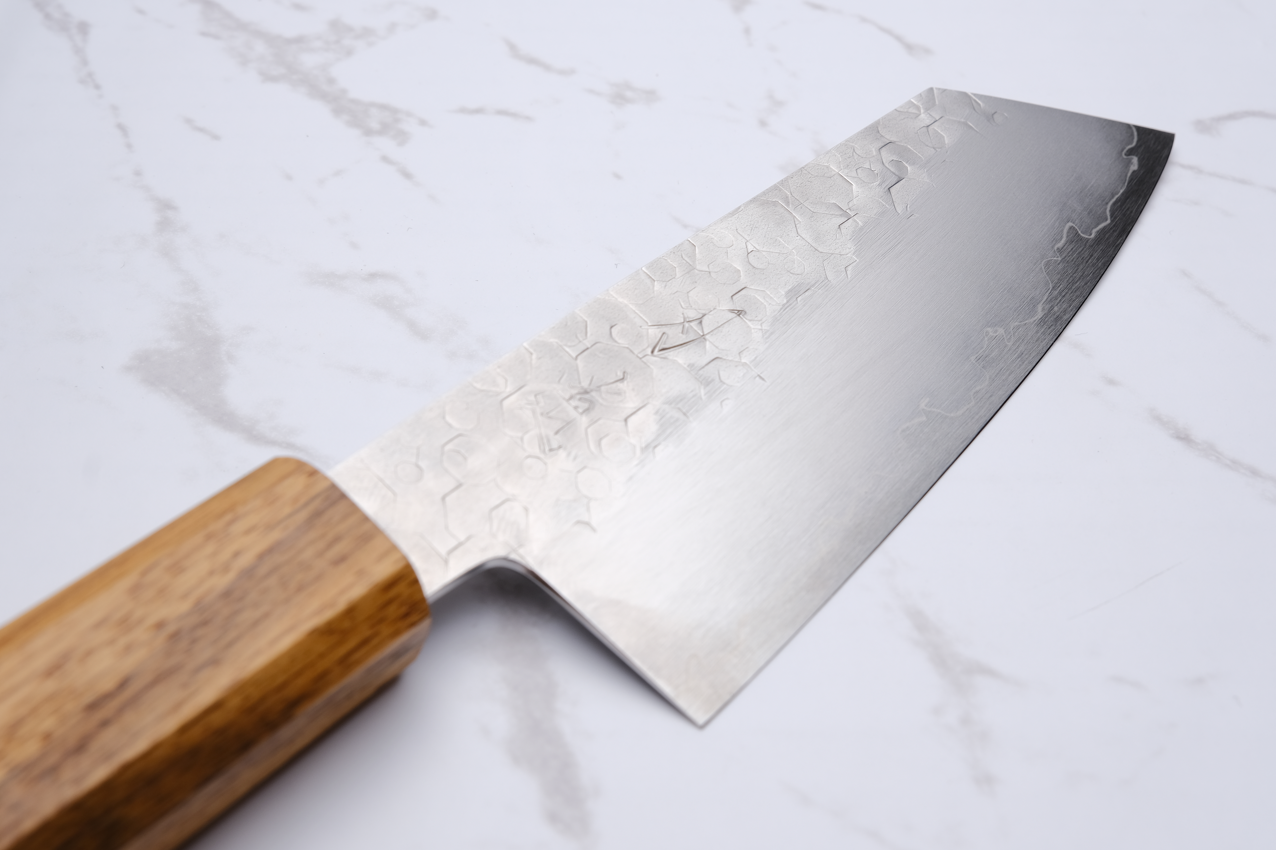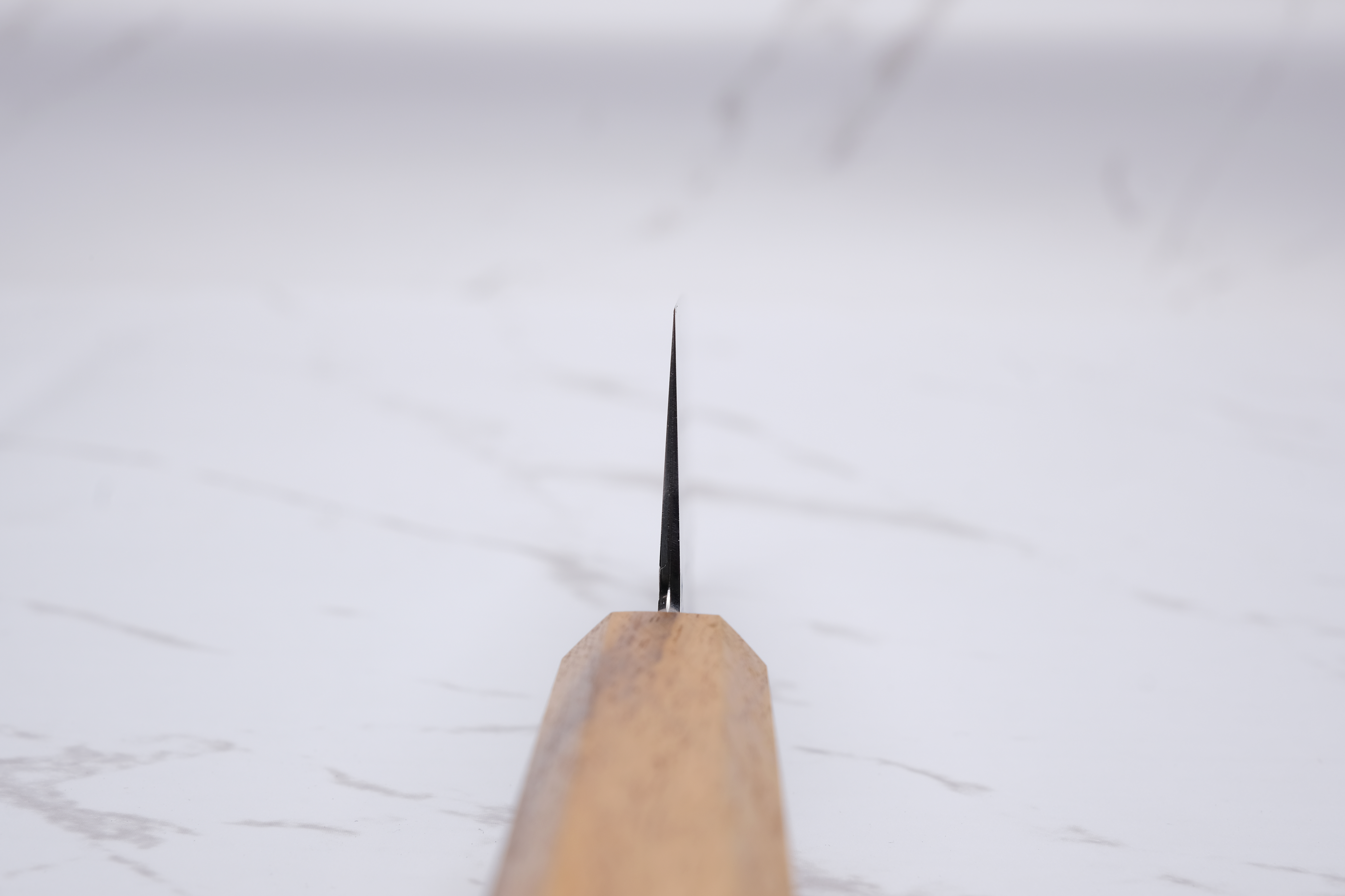 This knife is made with stainless powder steel, SG2 in the core & a stainless cladding. They get the 'raw' blade from Takefu Knife Village, and then it is ground, polished, and finished at Hado's workshop in Sakai.