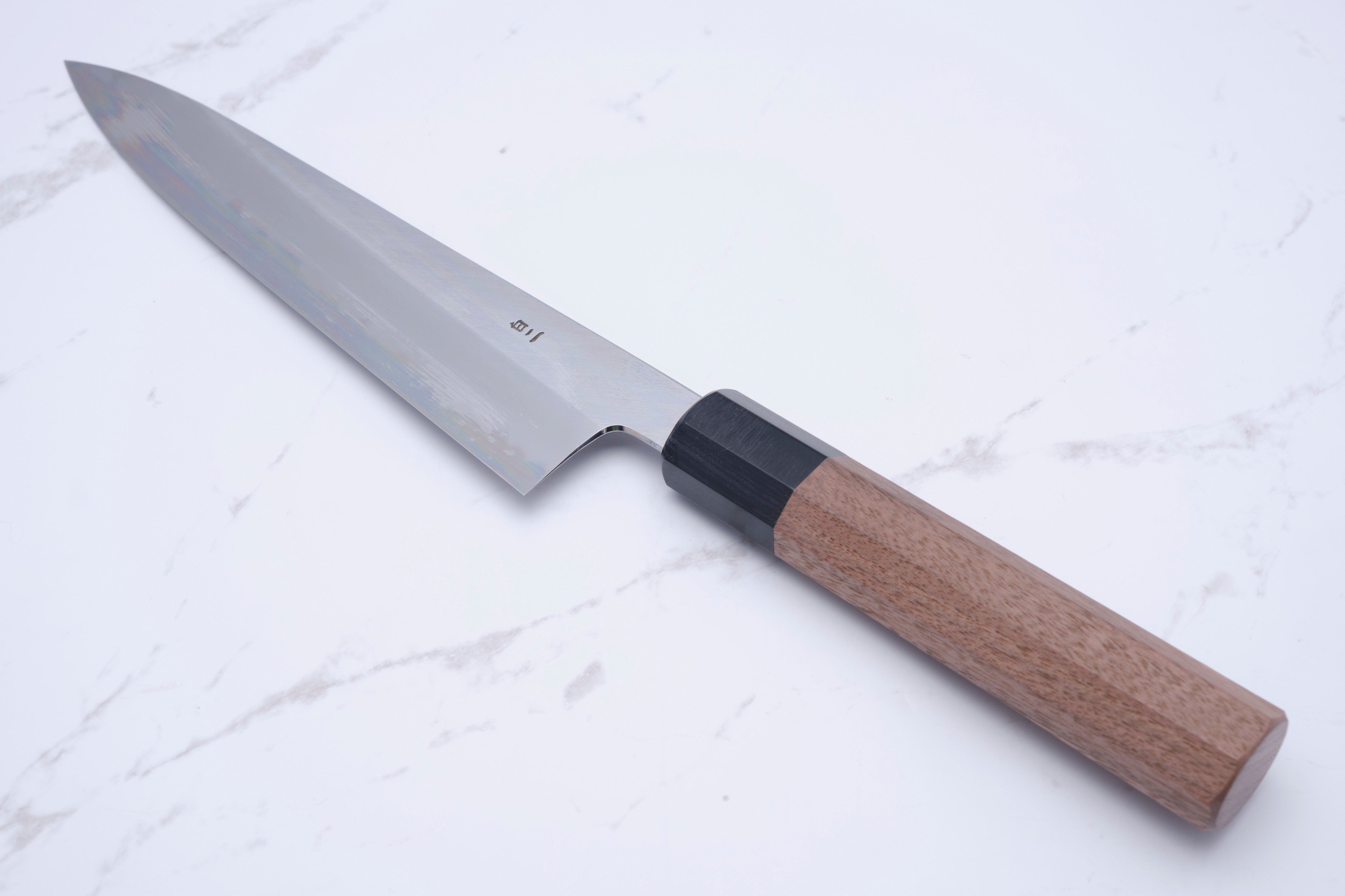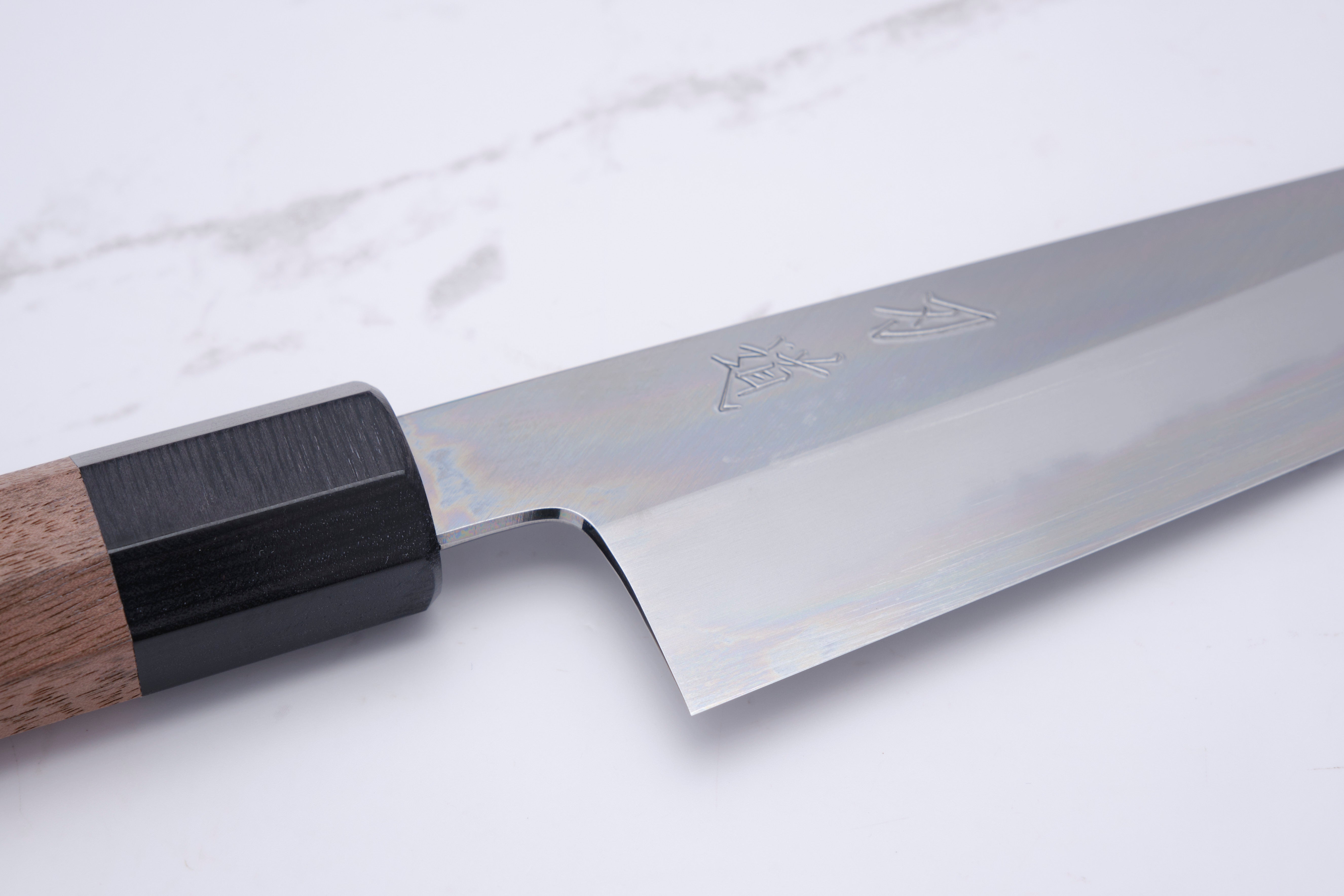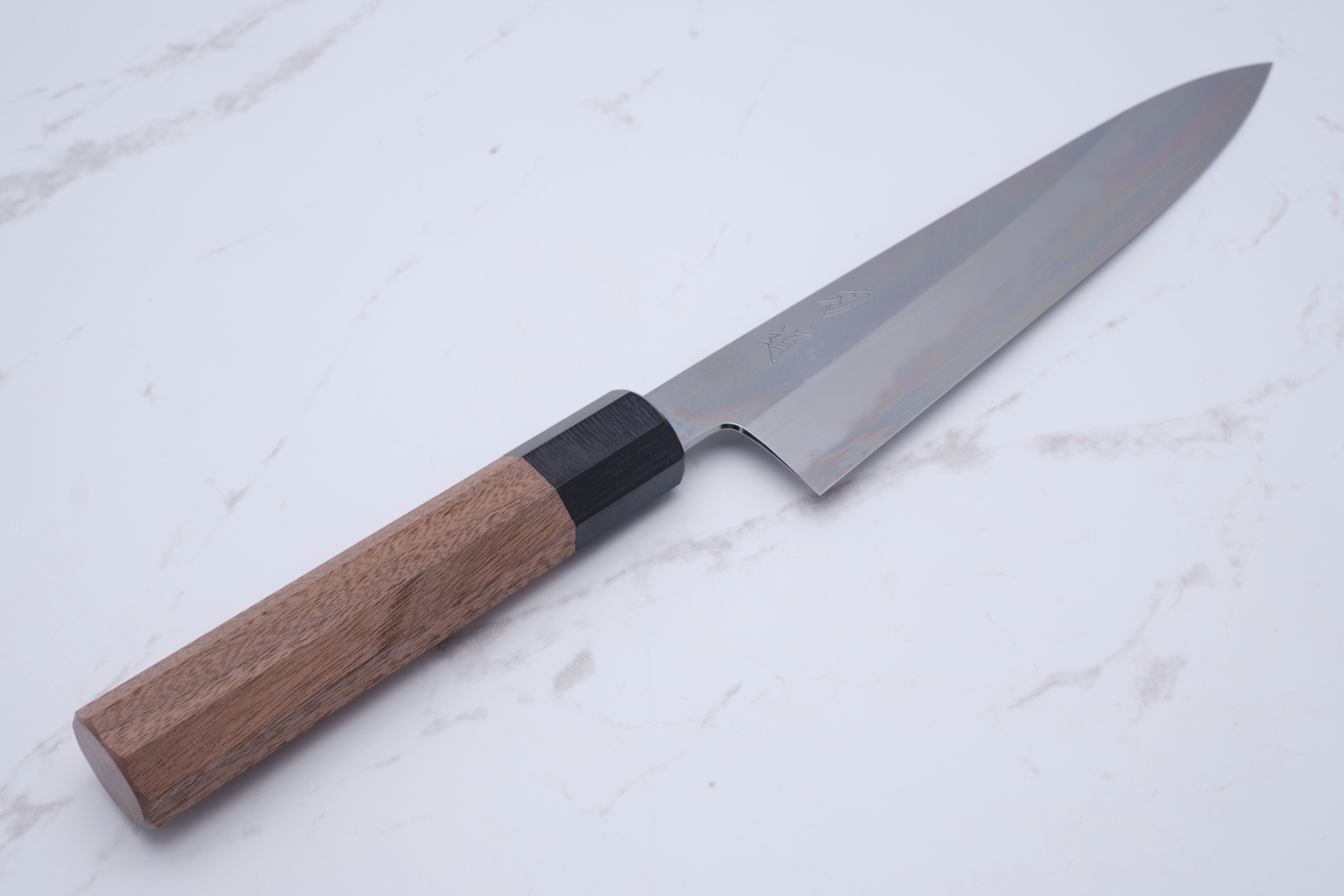 These knives are made by exactly the 2 aforementioned gentlemen. Tanaka-san has built the knife in 3 layers with Shirogami #2 in the core and surrounded by soft iron.